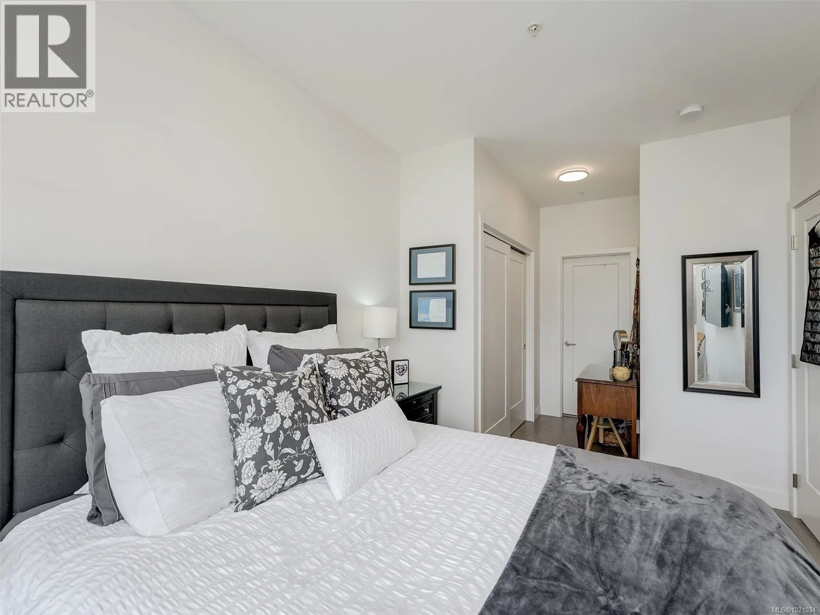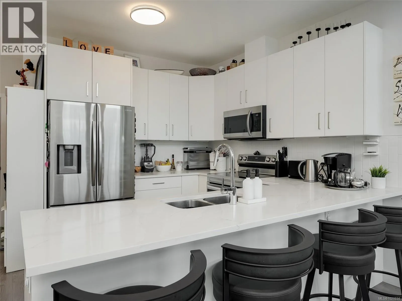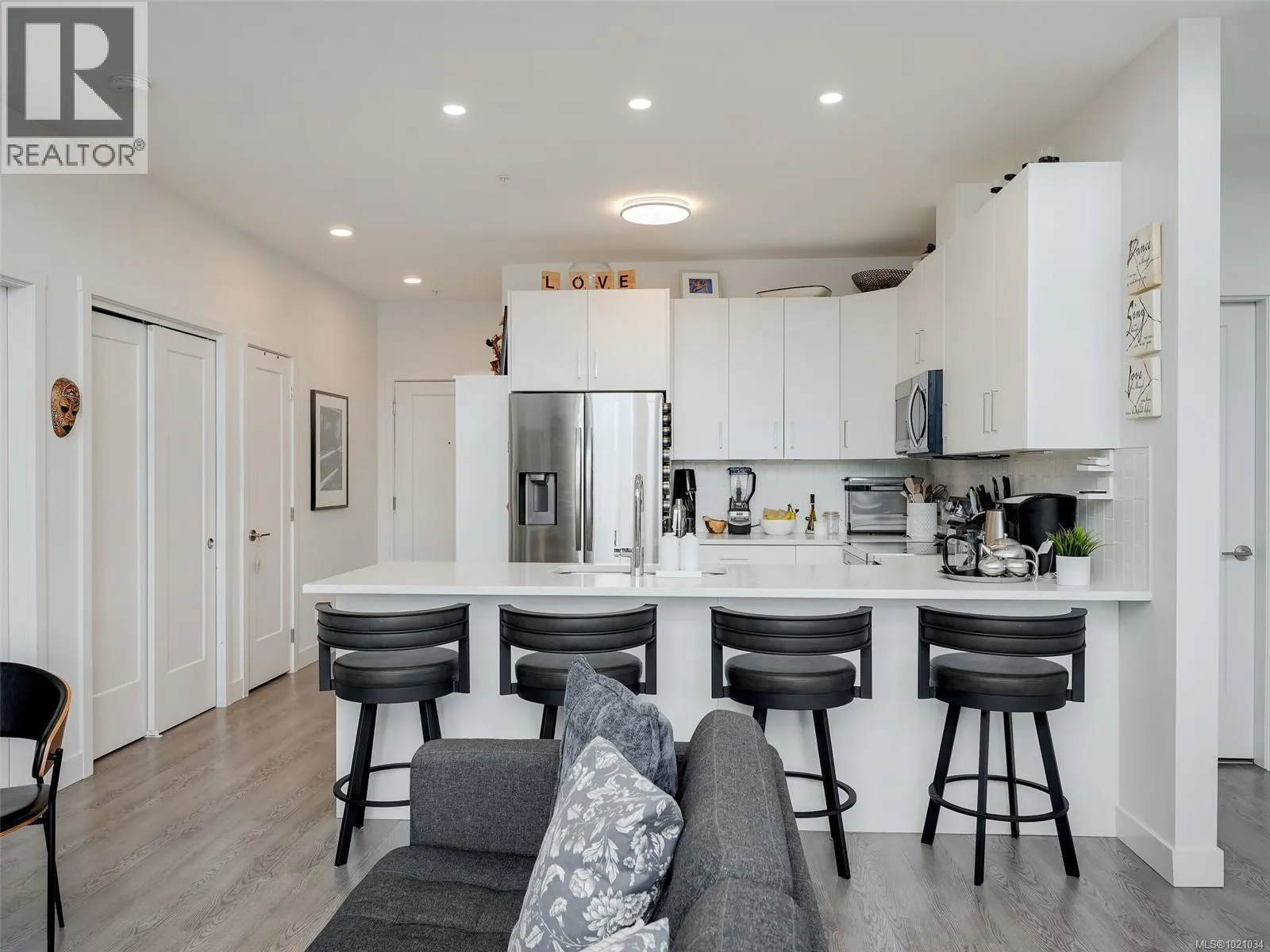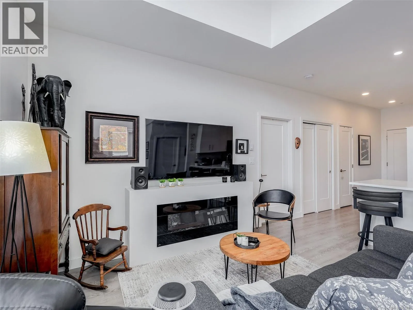 Welcome to 707 Treanor Ave: a contemporary boutique 2 bed/2 bath home situated in the heart of Millstream Village. Here you have the advantage of easy access to premium outlet shopping, big box stores, high-end grocery stores and nearby culinary delights. This quality 2021 built condominium features pet-friendly accommodations and entertainment at your doorstep. The design is by award winning Spaciz Design Company which showcases neutral cream tones mixed with matte charcoal accents. The top floor interior features include impressive vaulted ceilings, quartz countertops, a porcelain backsplash, hard surface flooring, top-of-the-line appliances, and heated ensuite floors. The numerous owner updates comprise closet and cupboard organizers, additional smart lighting, and a gorgeous custom built electric fireplace with heating options for year-round comfort. Enjoy watching the sunsets from your oversized corner balcony with plenty of room for a grill. Donât delay in making this your dream home! All measurements are approximate and must be verified if relying upon. (id:27476)