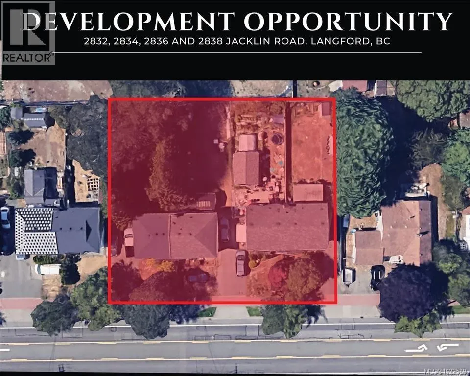 Prime Land Assembly Opportunity in Downtown Langford. An exceptional development opportunity awaits at 2832, 2834, 2836, & 2838 Jacklin Road, located in the heart of Langfordâs city centre. This high-density site, currently zoned R2, is part of the sought-after City Centre Pedestrian (CCP) Zone, allowing potential for a transformative mixed-use project high rise, with commercial space on the first floor. With city-approved projects already underway and successfully completed nearby, this location is primed for high-rise development, offering immense value to developers looking to make a mark in one of the region's highest-demand areas. Please reach out to the listing agent for detailed information on this exciting investment. All details are approximate and should be verified with the City of Langford if important. Potential for larger/more complete assembly of adjacent properties as well. Call listing agent for additional details. (id:27476)