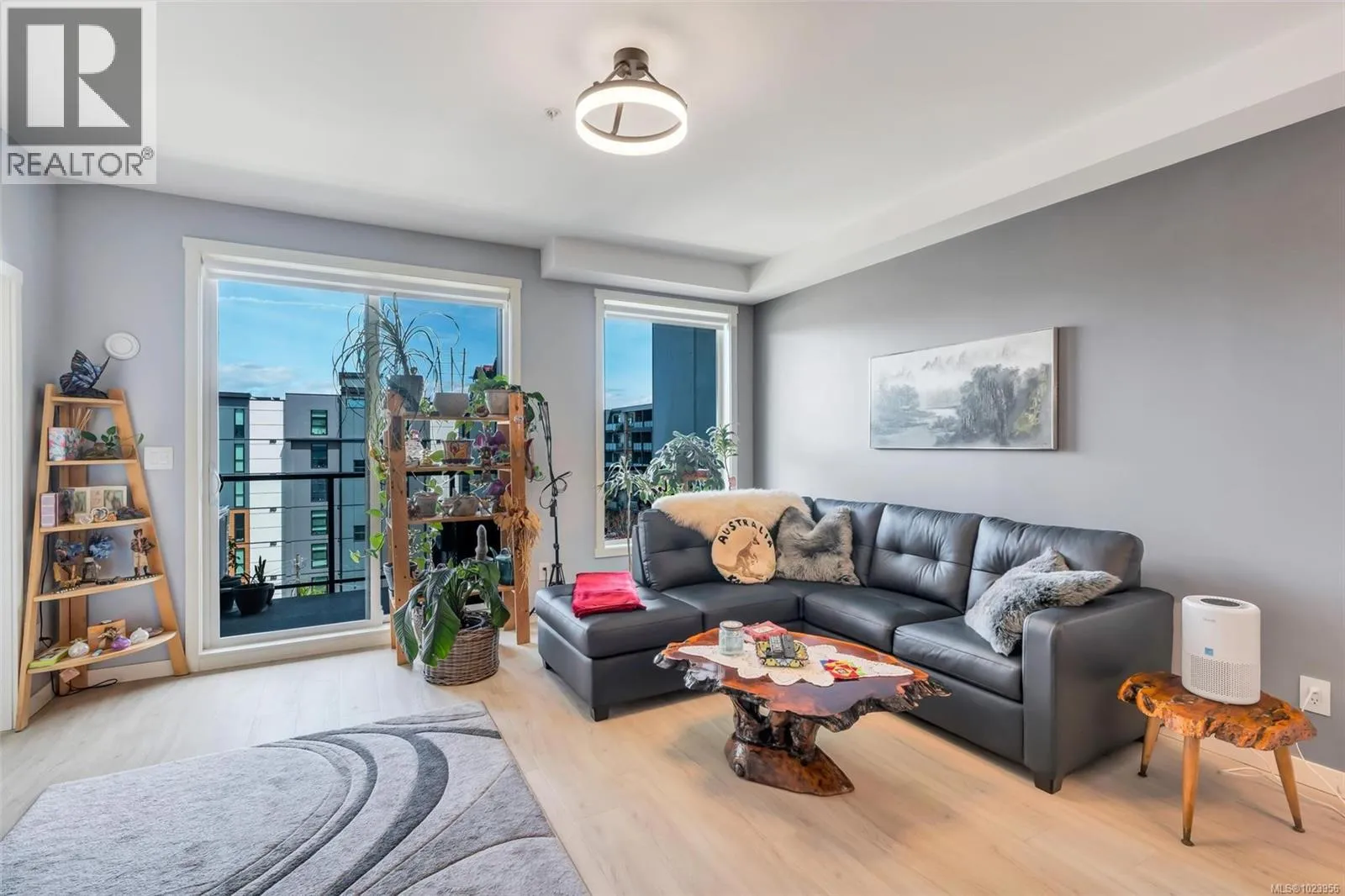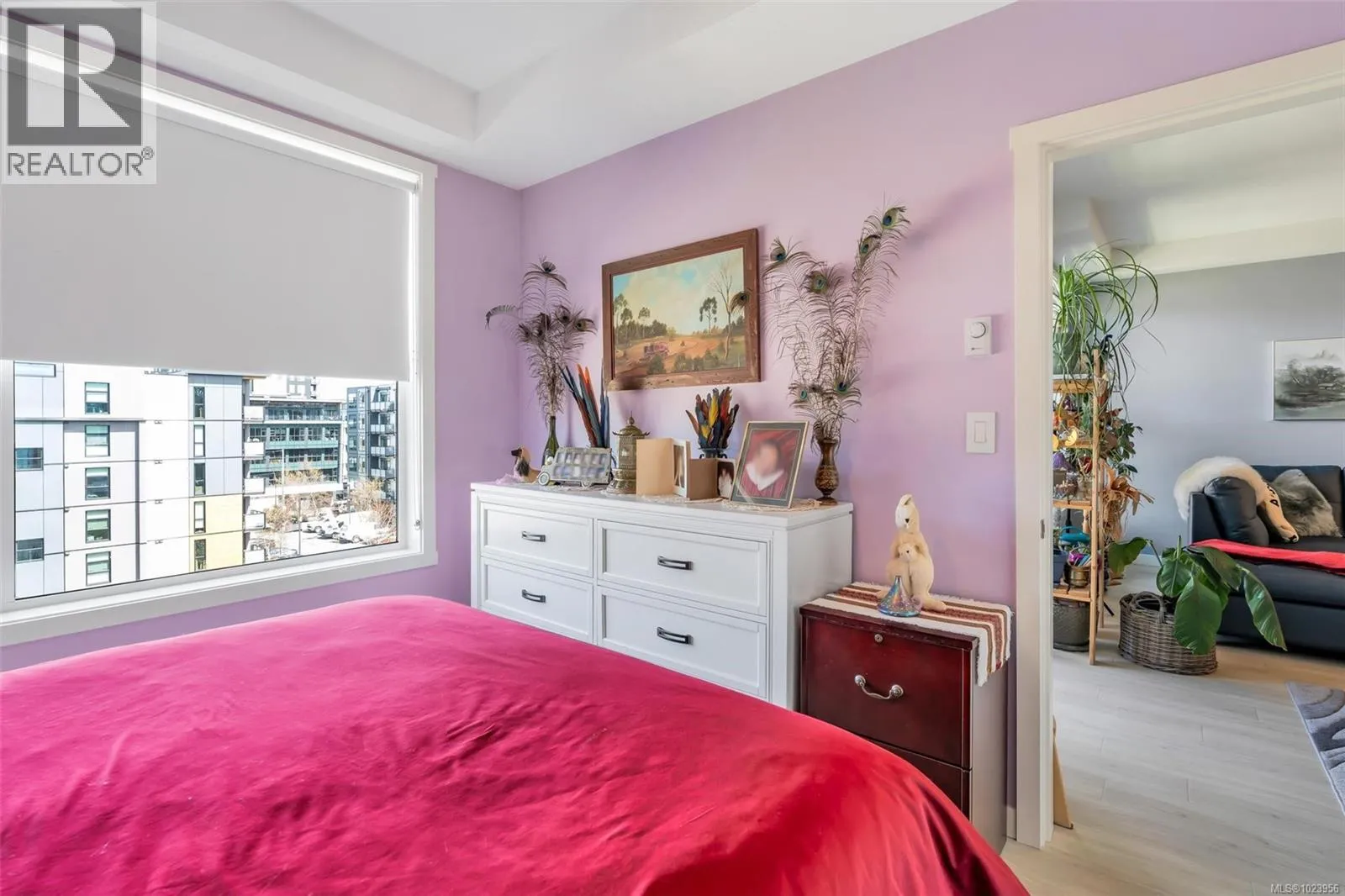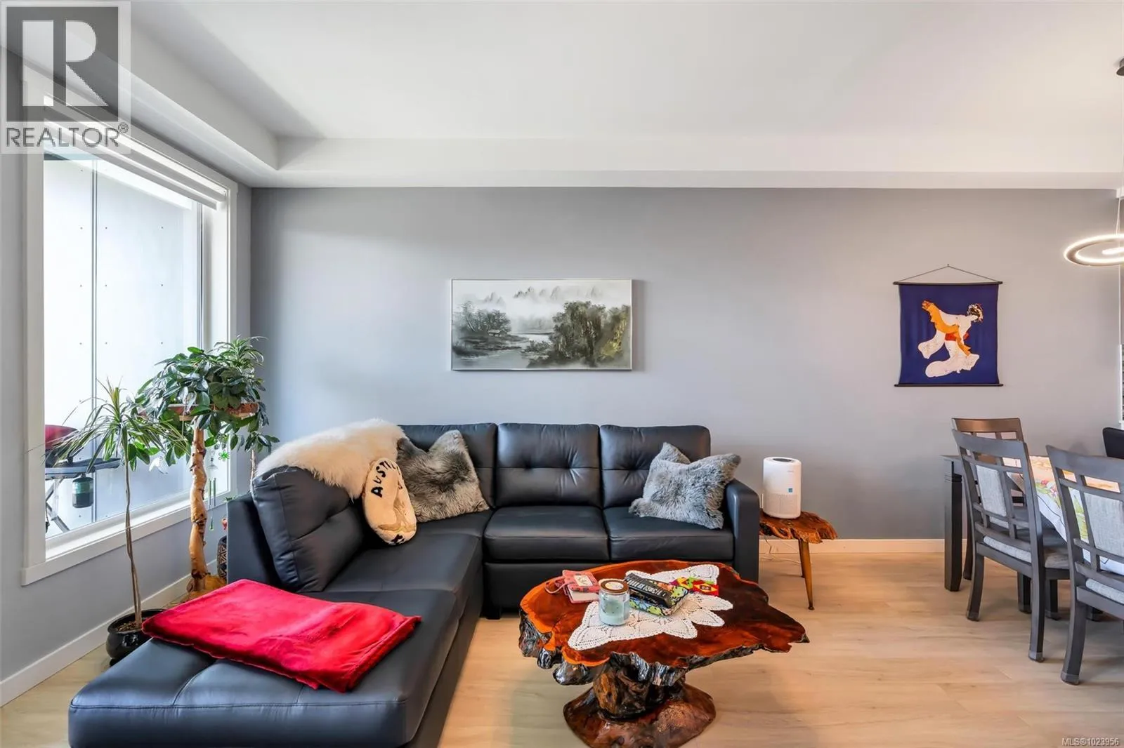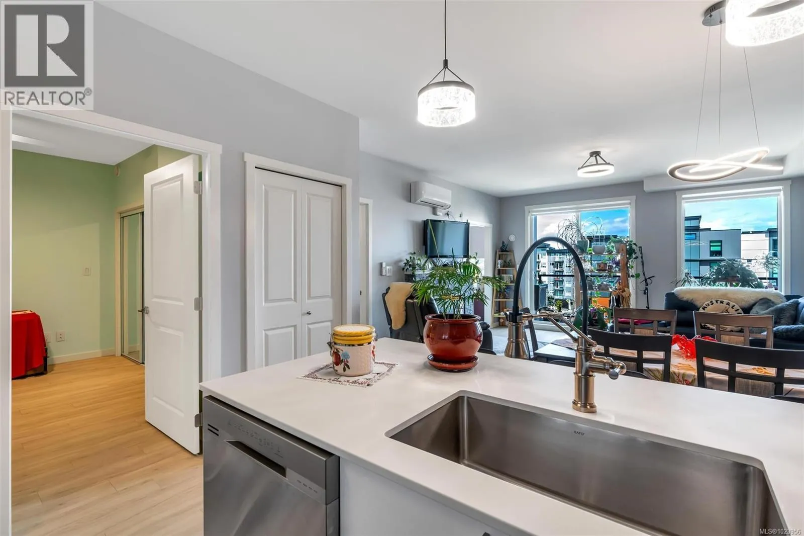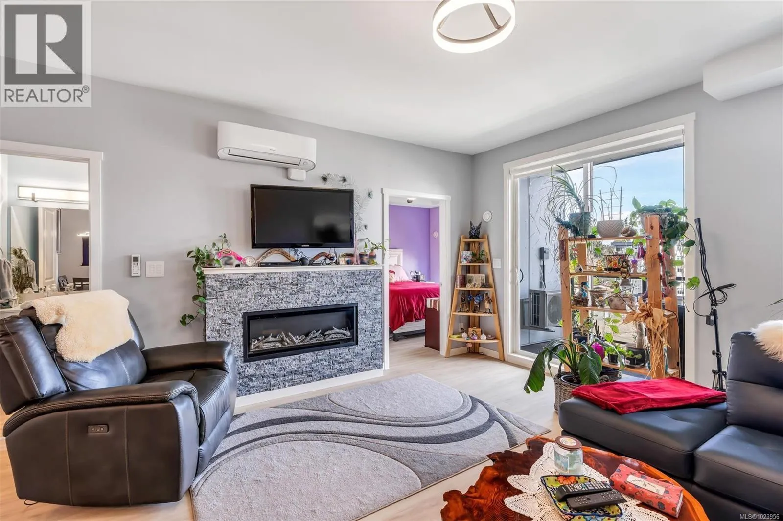Bright and beautiful 2 bed, 2 bath condo in Pacific Trilogy Twoâa modern 6-storey building in the heart of downtown Langford. This like new home features a functional open-concept layout with 9-ft ceilings, a chefâs kitchen with quartz countertops and stainless appliances, and spacious living/dining areas with an electric fireplace and access to a sunny balconyâperfect for your morning coffee. The primary bedroom includes a 3-piece ensuite with built-in closet organizers. Comfort is ensured year-round with an efficient heat pump offering heating and air conditioning. Additional owner upgrades include heated tile floors in both bathrooms, custom Murphy bed, fresh paint, updated tile work, Lutron smart switches, and new LED lighting. Secure parking included with E/V rough in. This award-winning, pet-friendly building also offers a fitness centre, bike storage, and a 91 Walk Score -just minutes to shopping, restaurants, parks, and recreation. Vacant and available for immediate possession. (id:27476)