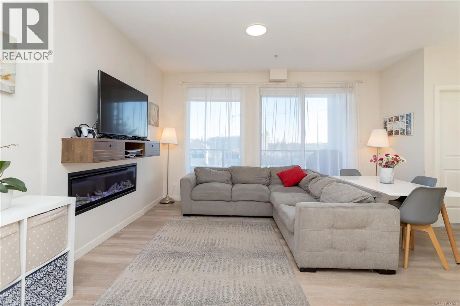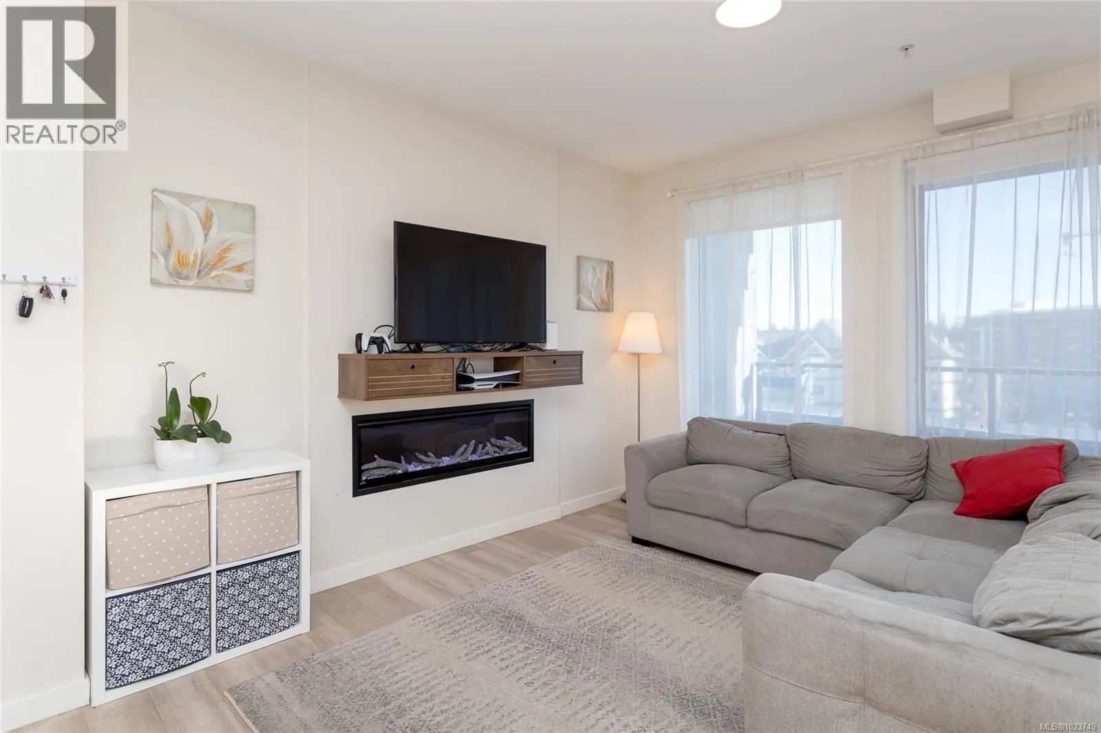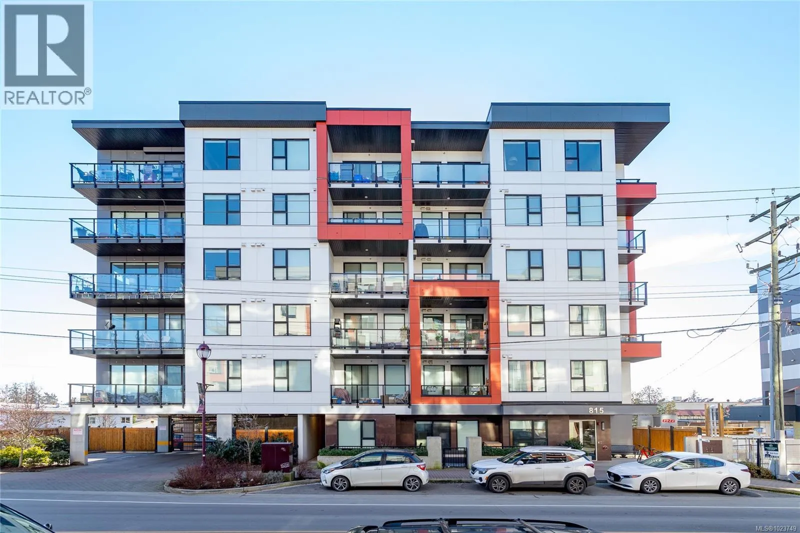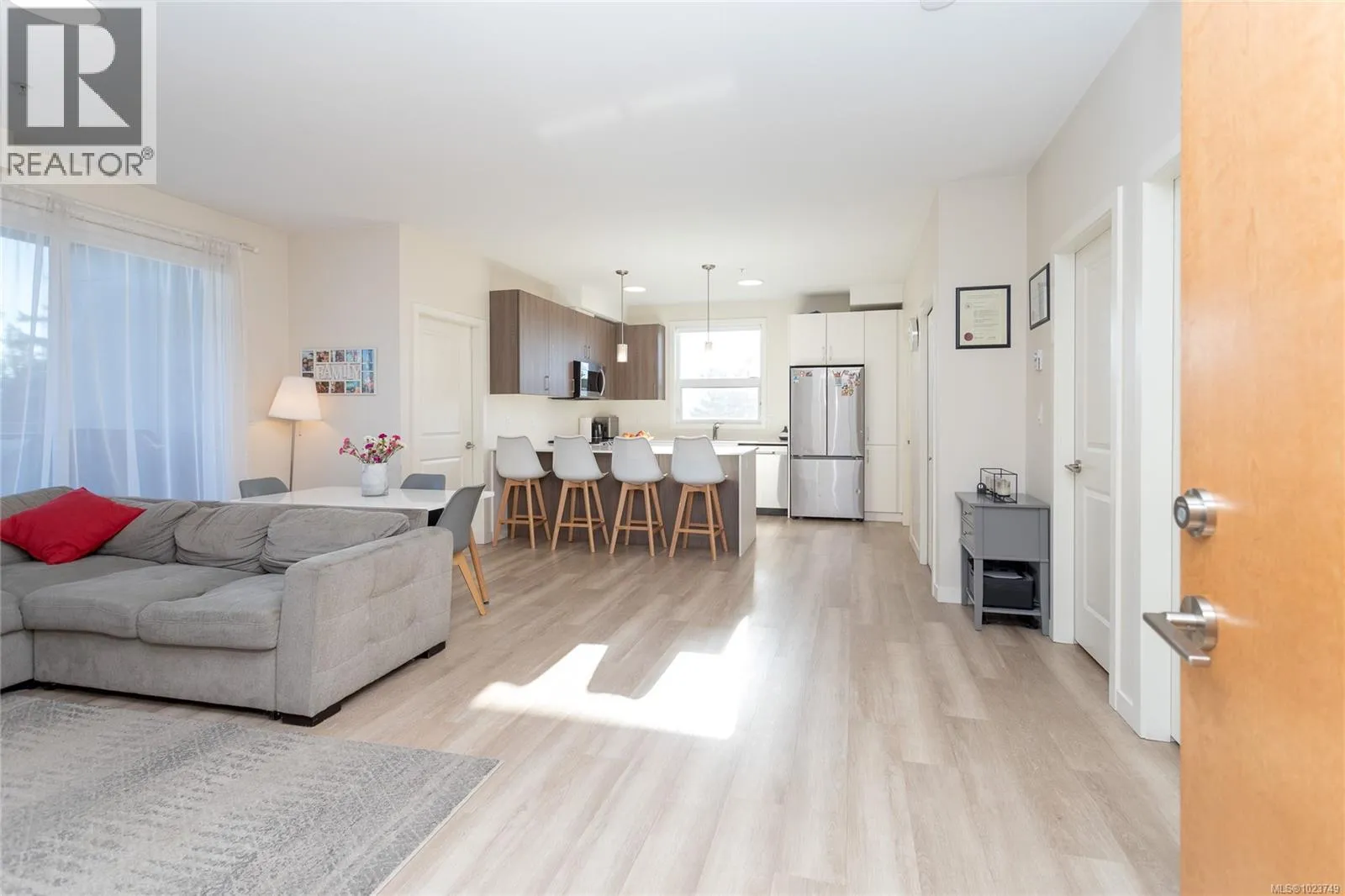 Welcome to Pacific Trilogy, a modern development in the heart of Langford. This private, bright southeast-facing corner unit offers 1028 sq/f of well-designed living space with 2 bedrooms plus a den and 2 full bathrooms with great separation. Enjoy 9-foot ceilings, large windows for abundant natural light, and a spacious private covered balcony. The contemporary kitchen features European-style two-tone cabinetry with soft-close hardware, quartz countertops, and a quality stainless steel appliance package. With southeast exposure, a bright and inviting interior, and a smart layout, this condo combines comfort, style, and privacy in one package. The pet-friendly building , offers secure bike storage, rentals allowed, and eco-friendly rooftop solar panels to help keep strata fees low. Ideally located just minutes from shopping centres, recreation facilities, trails, and entertainment. (id:27476)