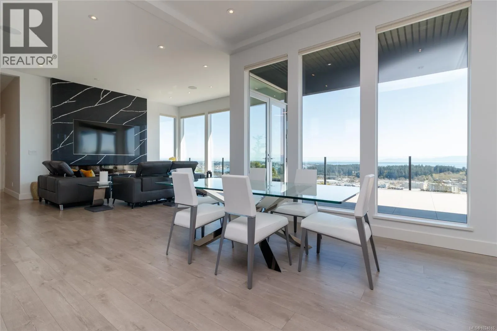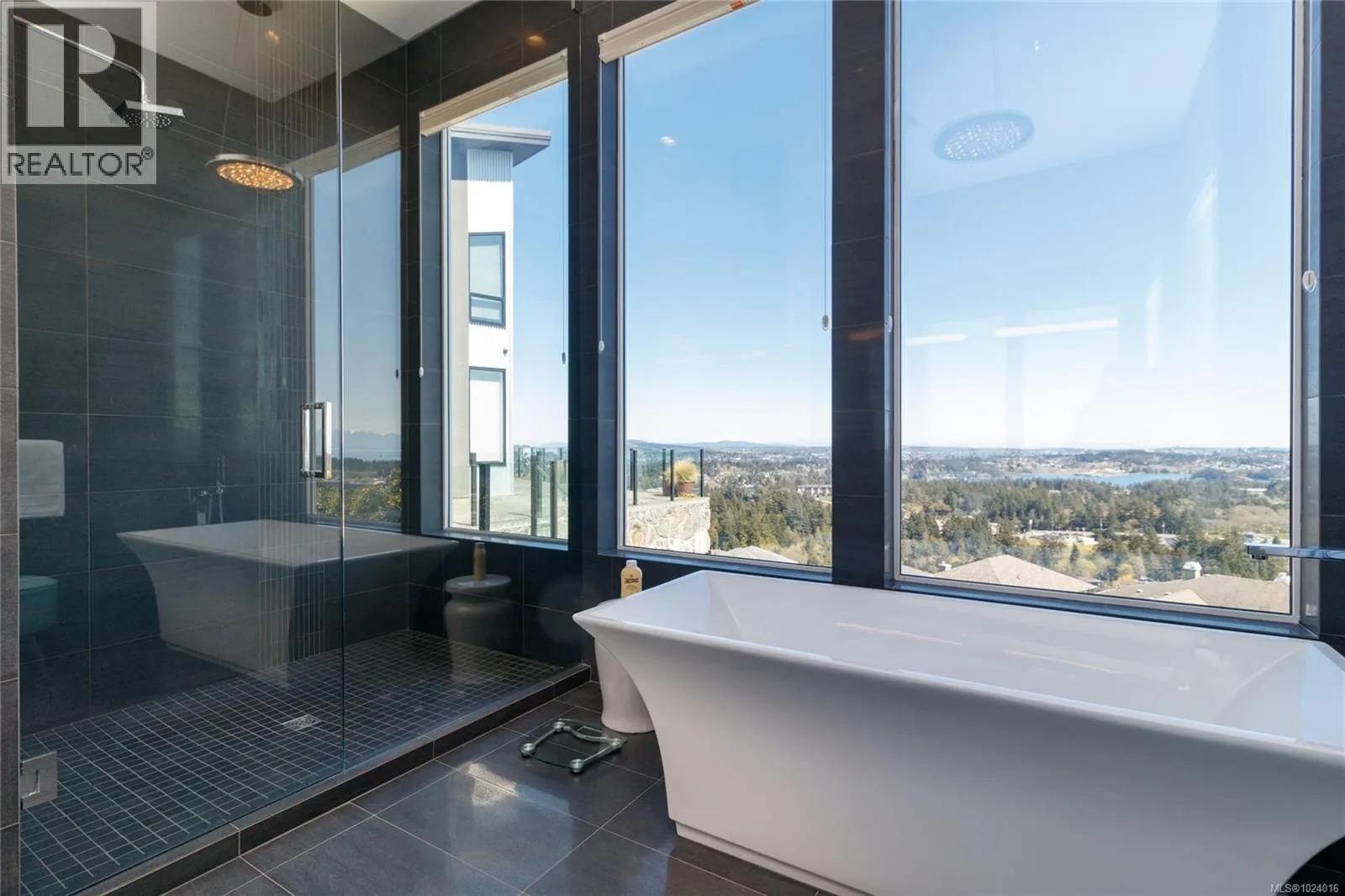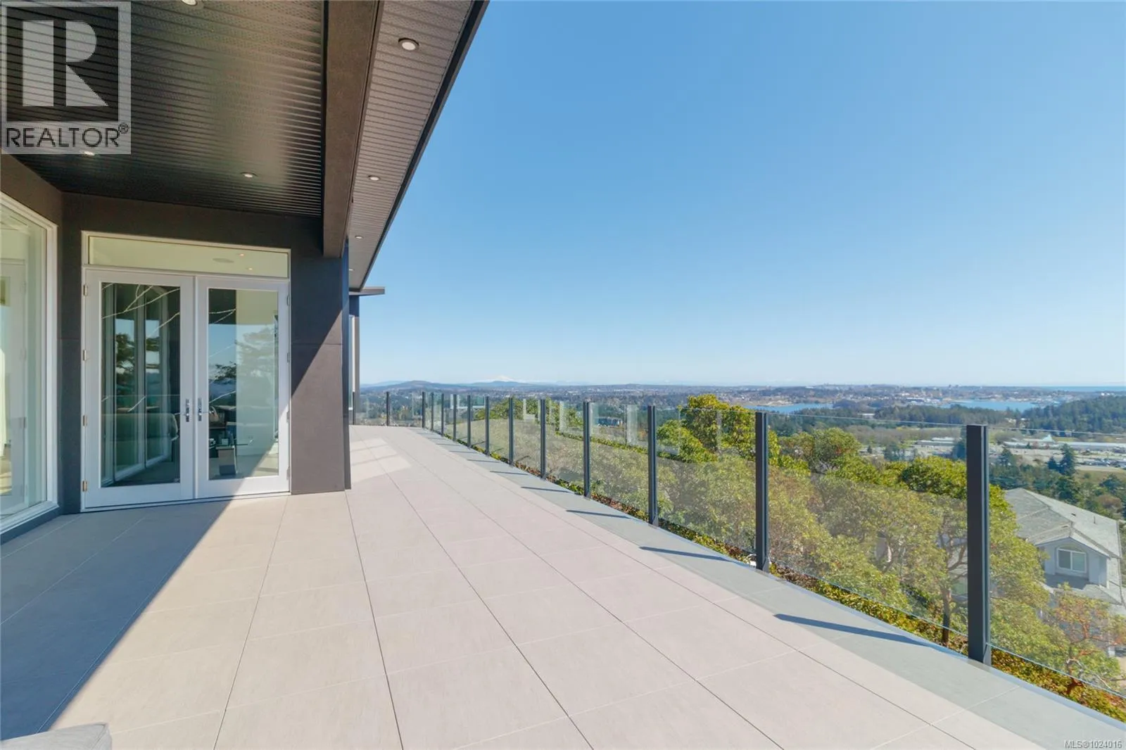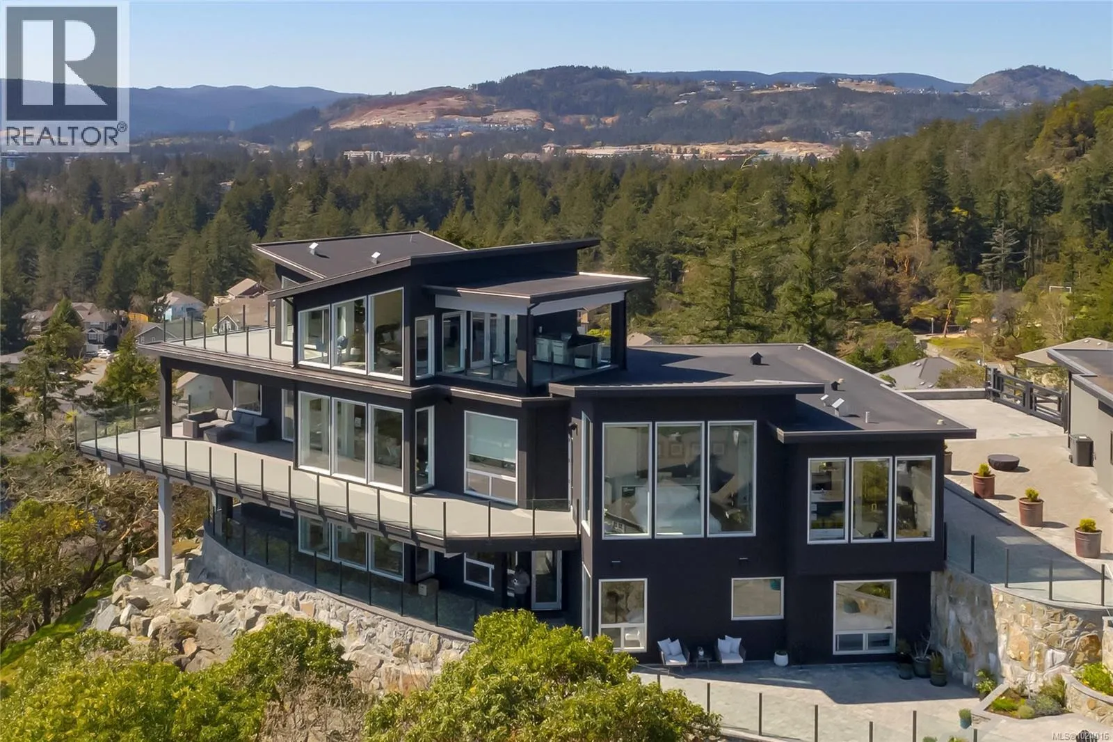 Custom-built architectural residence offering over 5,600 sq. ft. of luxury living on a rare and private 0.66-acre estate with breathtaking 360-degree views of the ocean, snow-capped Olympic Mountains, and the City of Victoria. This stunning home features soaring 12-foot ceilings, expansive floor-to-ceiling windows, and exceptional natural light throughout. The gourmet chefâs kitchen is designed for entertaining with quartz countertops, oversized breakfast bar, commercial-style refrigerator, built-in appliances, dual under-counter wine fridges, and a large walk-in pantry. The open-concept living and dining areas are highlighted by a built-in 80-inch HD TV and uninterrupted views. The primary bedroom is located on the main floor and offers a peaceful retreat with automated blinds, city-light views, and a spa-inspired ensuite featuring a deep soaker tub, oversized tiled shower, and walk-in closet. A striking glass and wood staircase leads to the upper-level sky bar and entertainment lounge with wrap-around windows showcasing panoramic views across southern Vancouver Island. Enjoy a private, theatre-style media room designed to replicate the ultimate cinematic experience. Outdoor living is equally impressive with over 700 sq. ft. of decks, a covered stainless-steel BBQ centre, and a secluded hot tub with cover and privacy screens, creating a spa-like setting under the stars. Additional features include four bedrooms, five bathrooms, office, meditation or yoga space, Sonos sound system, Hunter Douglas automated blinds, heat pump, gated entry, easy-care landscaping with micro-spray irrigation, and professionally installed brick-lock patios. Quietly positioned at the end of a private driveâjust minutes from Victoria. Open House Saturday February 7th from 1:00-3:00! (id:27476)