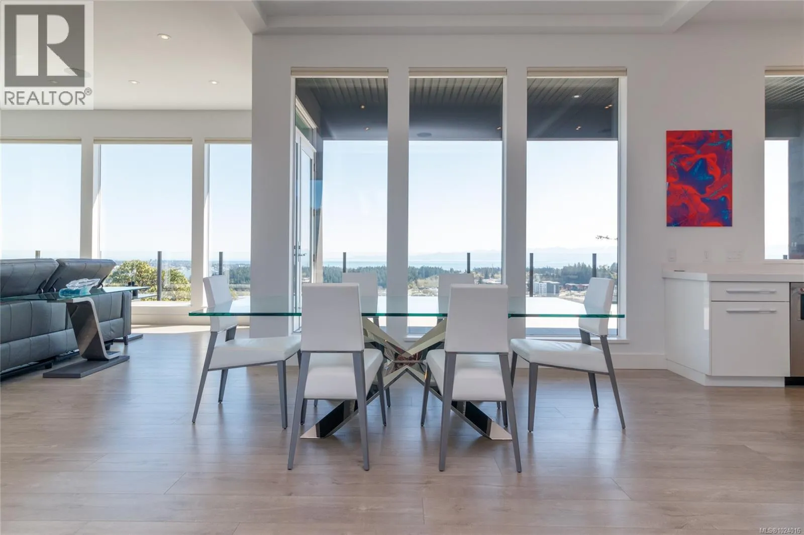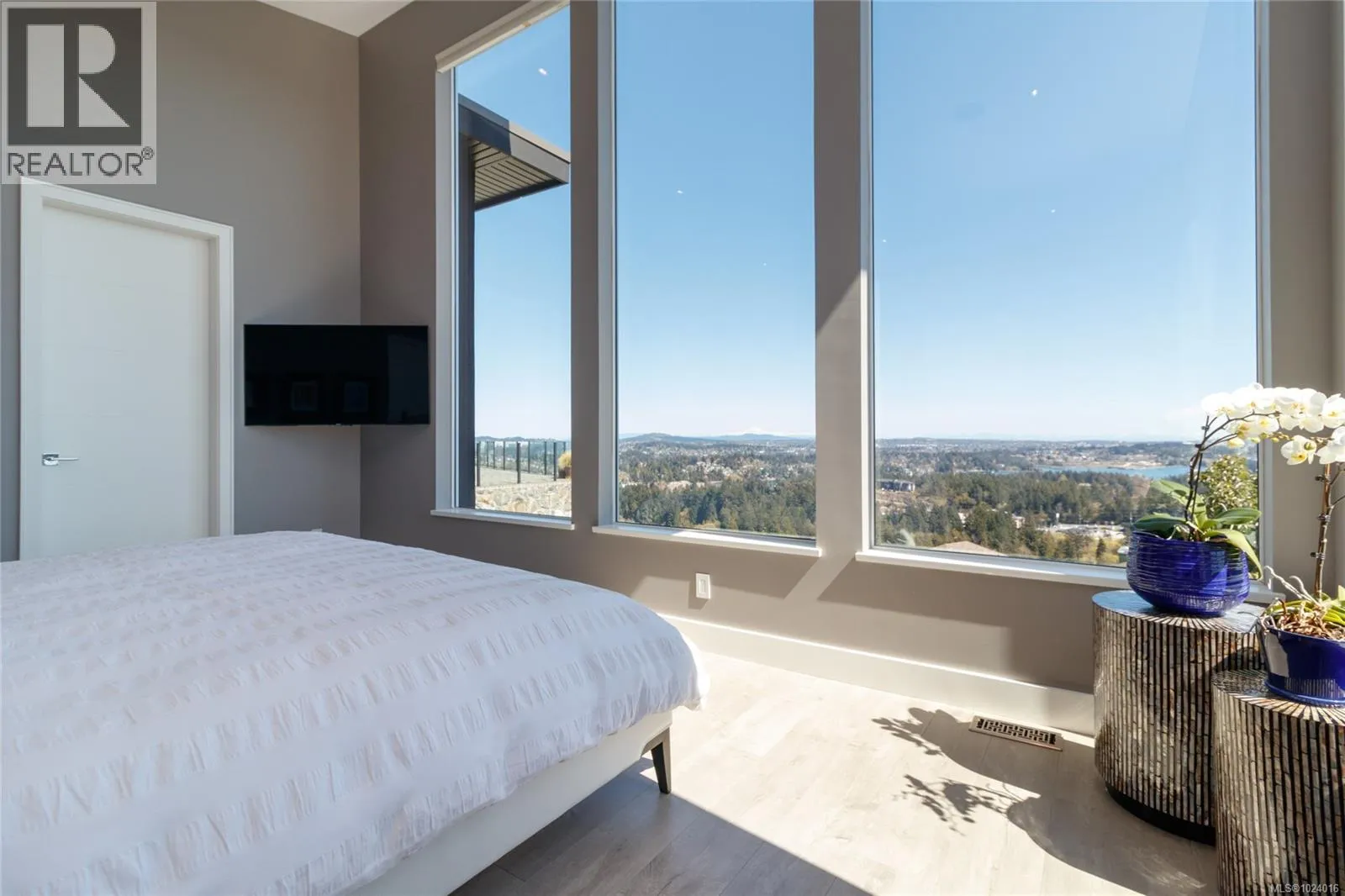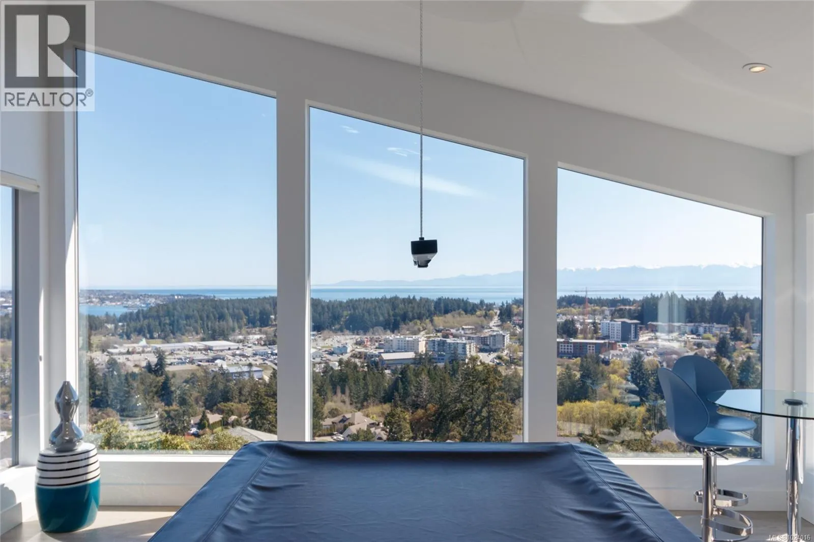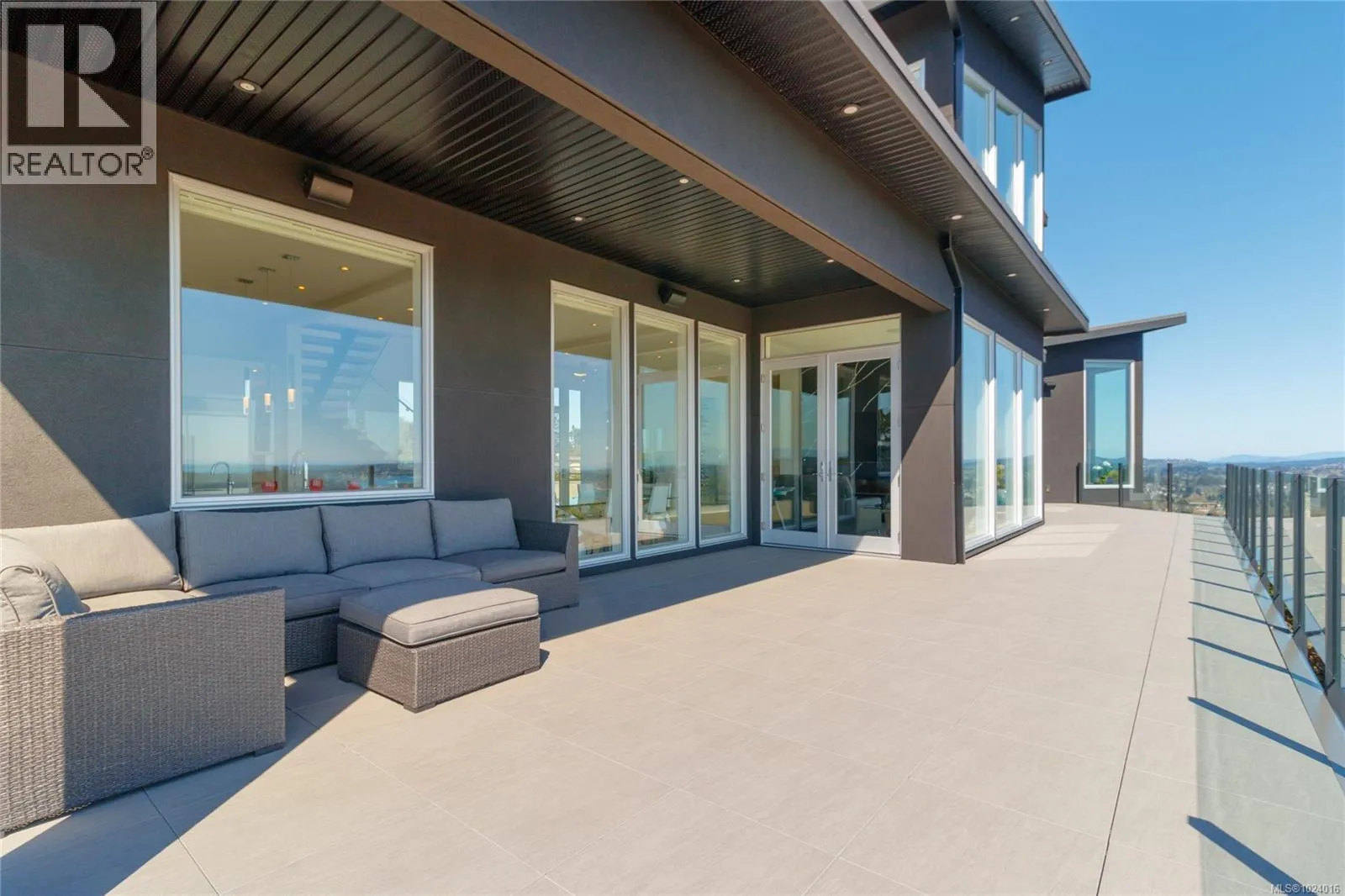 Custom-built architectural residence offering over 5,600 sq. ft. of luxury living on a rare and private 0.66-acre estate with breathtaking 360-degree views of the ocean, snow-capped Olympic Mountains, and the City of Victoria. This stunning home features soaring 12-foot ceilings, expansive floor-to-ceiling windows, and exceptional natural light throughout. The gourmet chefâs kitchen is designed for entertaining with quartz countertops, oversized breakfast bar, commercial-style refrigerator, built-in appliances, dual under-counter wine fridges, and a large walk-in pantry. The open-concept living and dining areas are highlighted by a built-in 80-inch HD TV and uninterrupted views. The primary bedroom is located on the main floor and offers a peaceful retreat with automated blinds, city-light views, and a spa-inspired ensuite featuring a deep soaker tub, oversized tiled shower, and walk-in closet. A striking glass and wood staircase leads to the upper-level sky bar and entertainment lounge with wrap-around windows showcasing panoramic views across southern Vancouver Island. Enjoy a private, theatre-style media room designed to replicate the ultimate cinematic experience. Outdoor living is equally impressive with over 700 sq. ft. of decks, a covered stainless-steel BBQ centre, and a secluded hot tub with cover and privacy screens, creating a spa-like setting under the stars. Additional features include four bedrooms, five bathrooms, office, meditation or yoga space, Sonos sound system, Hunter Douglas automated blinds, heat pump, gated entry, easy-care landscaping with micro-spray irrigation, and professionally installed brick-lock patios. Quietly positioned at the end of a private driveâjust minutes from Victoria. Open House Saturday February 7th from 1:00-3:00! (id:27476)