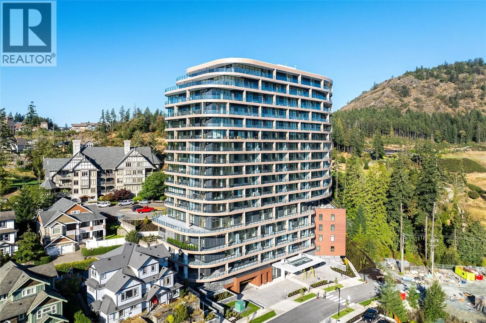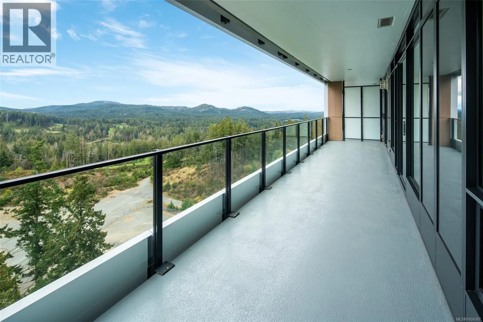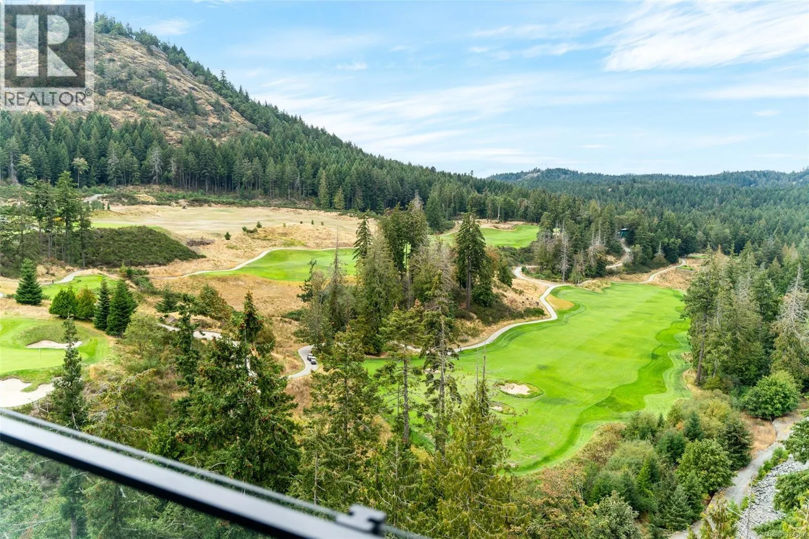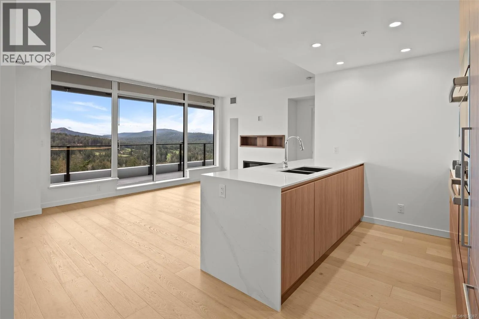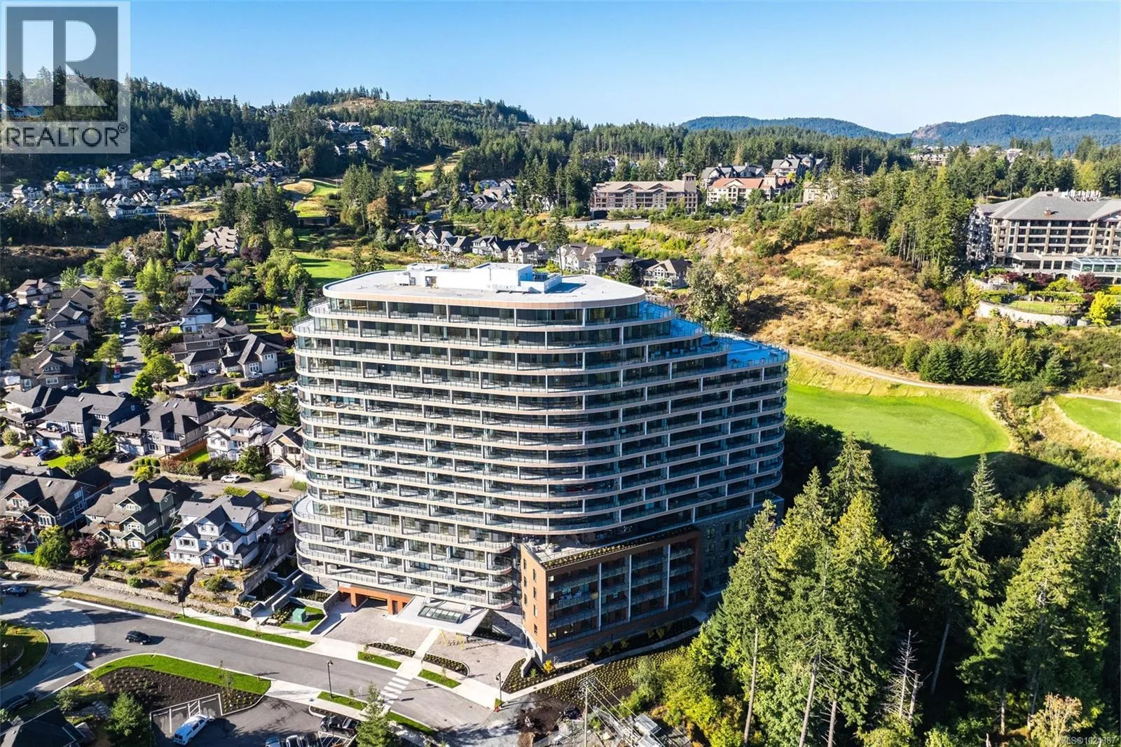 Elevated above it all on the 13th floor of the elegant One Bear Mountain, this beautifully curated two-bedroom and den residence offers a rare blend of refined interiors, expansive outdoor living, and sweeping views across the 18th fairway. Approximately 1,150 sq ft of thoughtfully designed living space is framed by floor-to-ceiling windows that draw in natural light and ever-changing views. Wide-plank hardwood floors and clean architectural lines anchor the open-concept layout, while an impressive 8' x 40' deck spans the length of the homeâideal for morning coffee, evening entertaining, or simply taking in the serene surroundings. The kitchen is both elegant and functional, featuring Italian cabinetry, quartz countertops, and a seamless integrated Bosch appliance package with gas cooktop and wall oven. The primary suite offers a custom walk-in closet, spa-inspired ensuite, and direct deck access, creating a private retreat with a strong connection to the outdoors. A well-proportioned second bedroom and versatile den provide flexibility for guests, work-from-home living, or creative space. Residents of One Bear Mountain enjoy an exceptional collection of resort-inspired amenities, including a 15th-floor outdoor infinity pool with panoramic views, a state-of-the-art fitness centre, yoga studio, business centre, and private dining spaces. Set within one of Greater Victoriaâs most sought-after lifestyle communities, Bear Mountain offers world-class golf, hiking and biking trails, and easy access to Langfordâs growing urban core and downtown Victoria. This is elevated living! (id:27476)