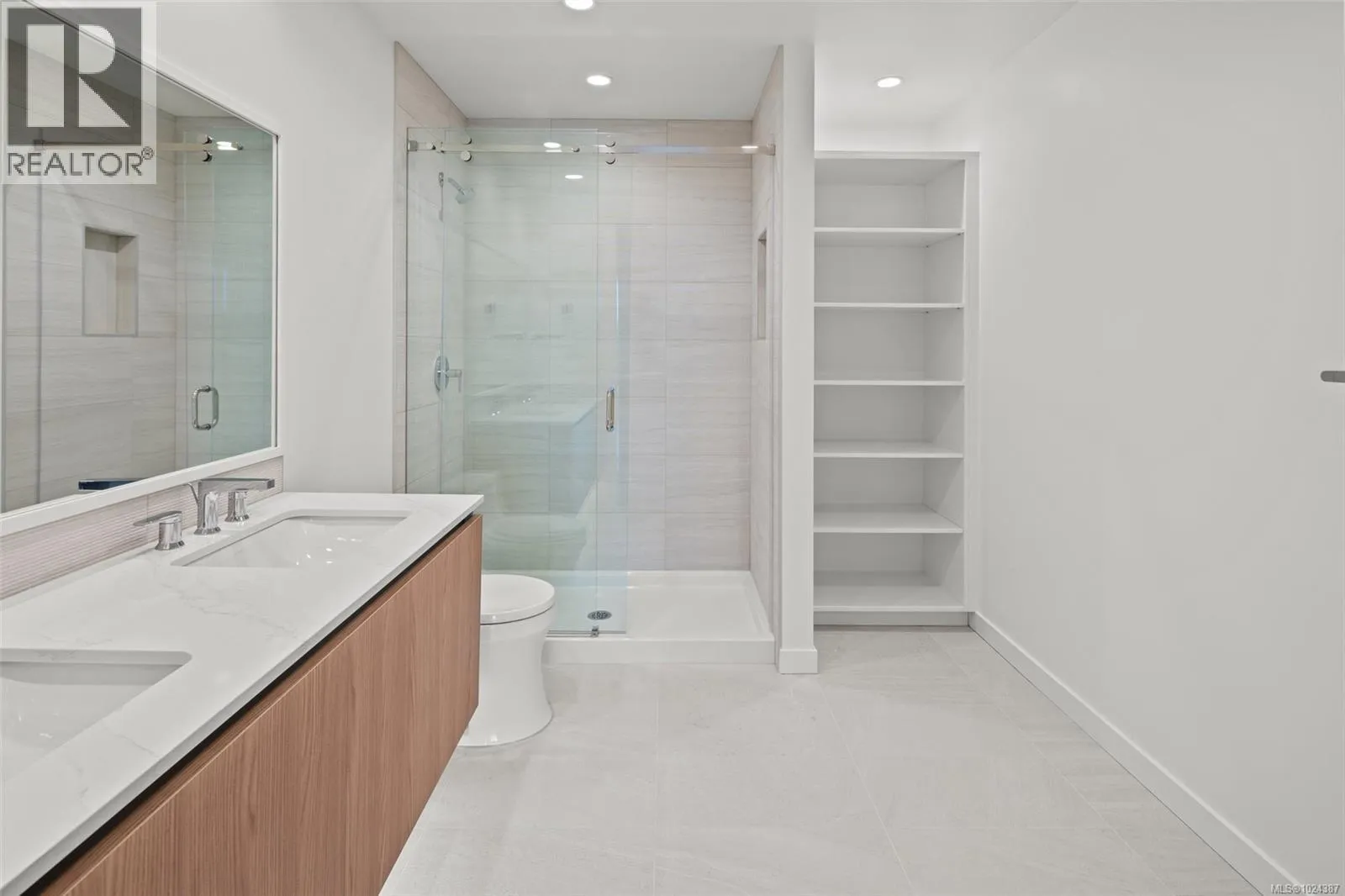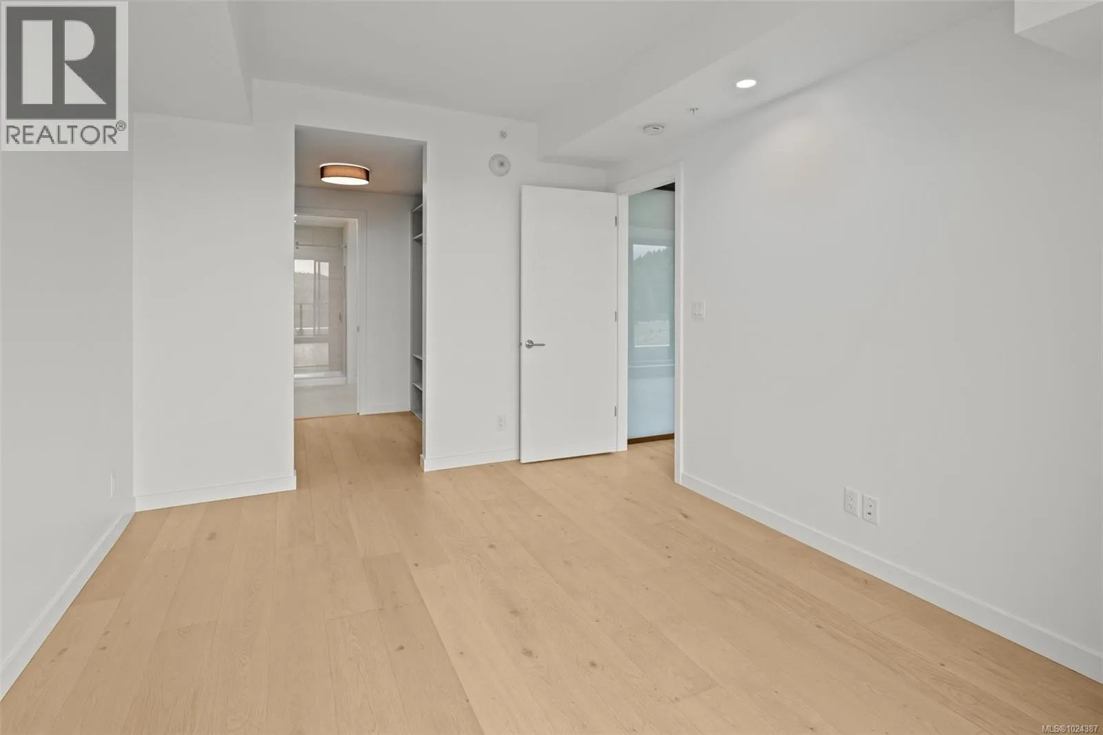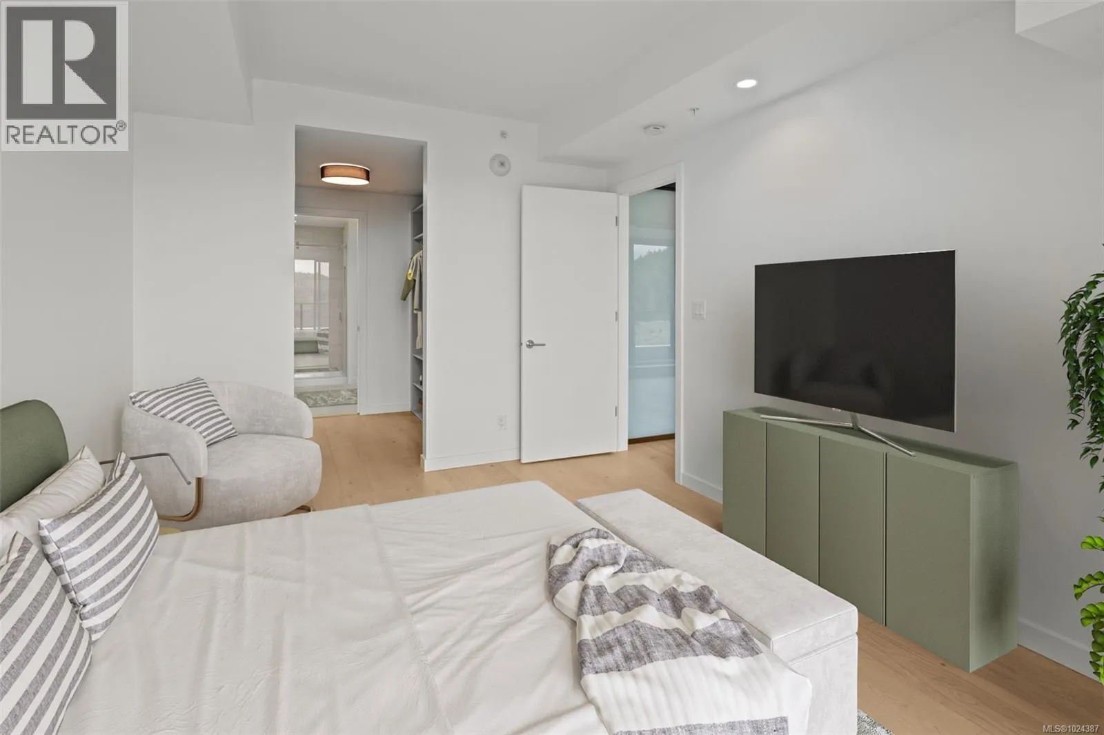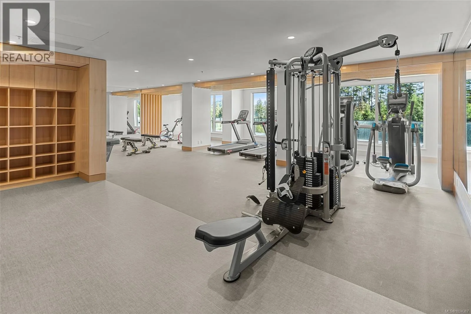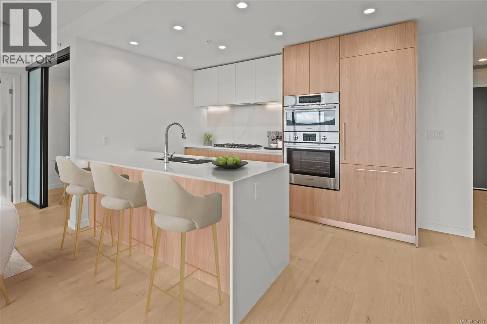 Elevated above it all on the 13th floor of the elegant One Bear Mountain, this beautifully curated two-bedroom and den residence offers a rare blend of refined interiors, expansive outdoor living, and sweeping views across the 18th fairway. Approximately 1,150 sq ft of thoughtfully designed living space is framed by floor-to-ceiling windows that draw in natural light and ever-changing views. Wide-plank hardwood floors and clean architectural lines anchor the open-concept layout, while an impressive 8' x 40' deck spans the length of the homeâideal for morning coffee, evening entertaining, or simply taking in the serene surroundings. The kitchen is both elegant and functional, featuring Italian cabinetry, quartz countertops, and a seamless integrated Bosch appliance package with gas cooktop and wall oven. The primary suite offers a custom walk-in closet, spa-inspired ensuite, and direct deck access, creating a private retreat with a strong connection to the outdoors. A well-proportioned second bedroom and versatile den provide flexibility for guests, work-from-home living, or creative space. Residents of One Bear Mountain enjoy an exceptional collection of resort-inspired amenities, including a 15th-floor outdoor infinity pool with panoramic views, a state-of-the-art fitness centre, yoga studio, business centre, and private dining spaces. Set within one of Greater Victoriaâs most sought-after lifestyle communities, Bear Mountain offers world-class golf, hiking and biking trails, and easy access to Langfordâs growing urban core and downtown Victoria. This is elevated living! (id:27476)