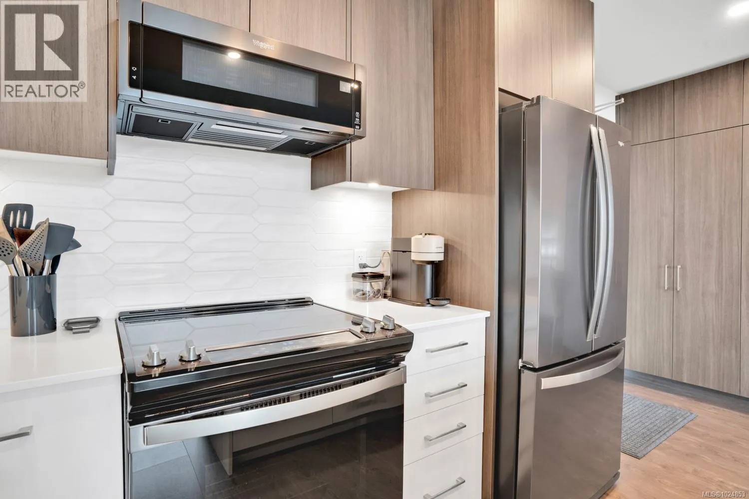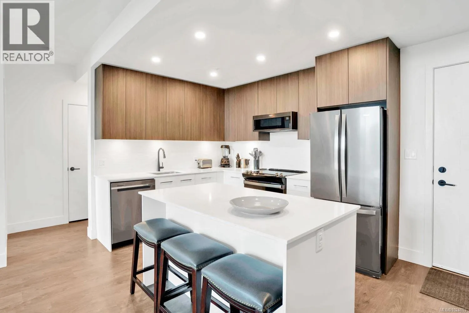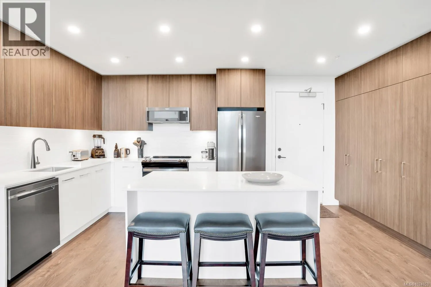 Welcome to 531â920 Reunion Avenue, a bright and modern top-floor condo in Langfordâs award-winning Belmont community. This 2-bedroom, 2-bathroom home offers nearly 1,000 square feet of thoughtfully designed living space with elevated ceilings and large windows that fill the unit with natural light. The layout is ideal, with bedrooms on opposite sides for privacy, a dedicated office nook, and an open-concept main living area that feels spacious and inviting. The kitchen features full-height cabinetry, stainless Whirlpool appliances, quartz countertops, and a large island perfect for entertaining or casual meals. The primary suite includes a walk-through closet and a spa-inspired ensuite with double vanities and a frameless glass shower, while the second bedroom is bright and comfortable with its own full guest bath nearby. Step out onto your private covered balcony with treetop views and a gas BBQ hookupâperfect for evening relaxation. This pet- and rental-friendly unit includes full-sized in-suite laundry, a large pantry wall for storage, one secure underground parking stall, and a separate storage locker. Reunionâs amenities are among the best in the Westshore, including a stunning fireside lounge, a chefâs kitchen and social room, a fitness centre, an outdoor BBQ terrace and fire pit, a fenced dog run, and a modern dog wash station. Located across from Belmont Market and Westshore Town Centre, and just steps to the Galloping Goose Trail, youâre within walking distance to groceries, cafes, dining, fitness studios, and more. With lakes, parks, and Bear Mountain just minutes away, this is a prime opportunity to live in a stylish, connected, and community-driven setting. This is a must see. Book your viewing today. (id:27476)