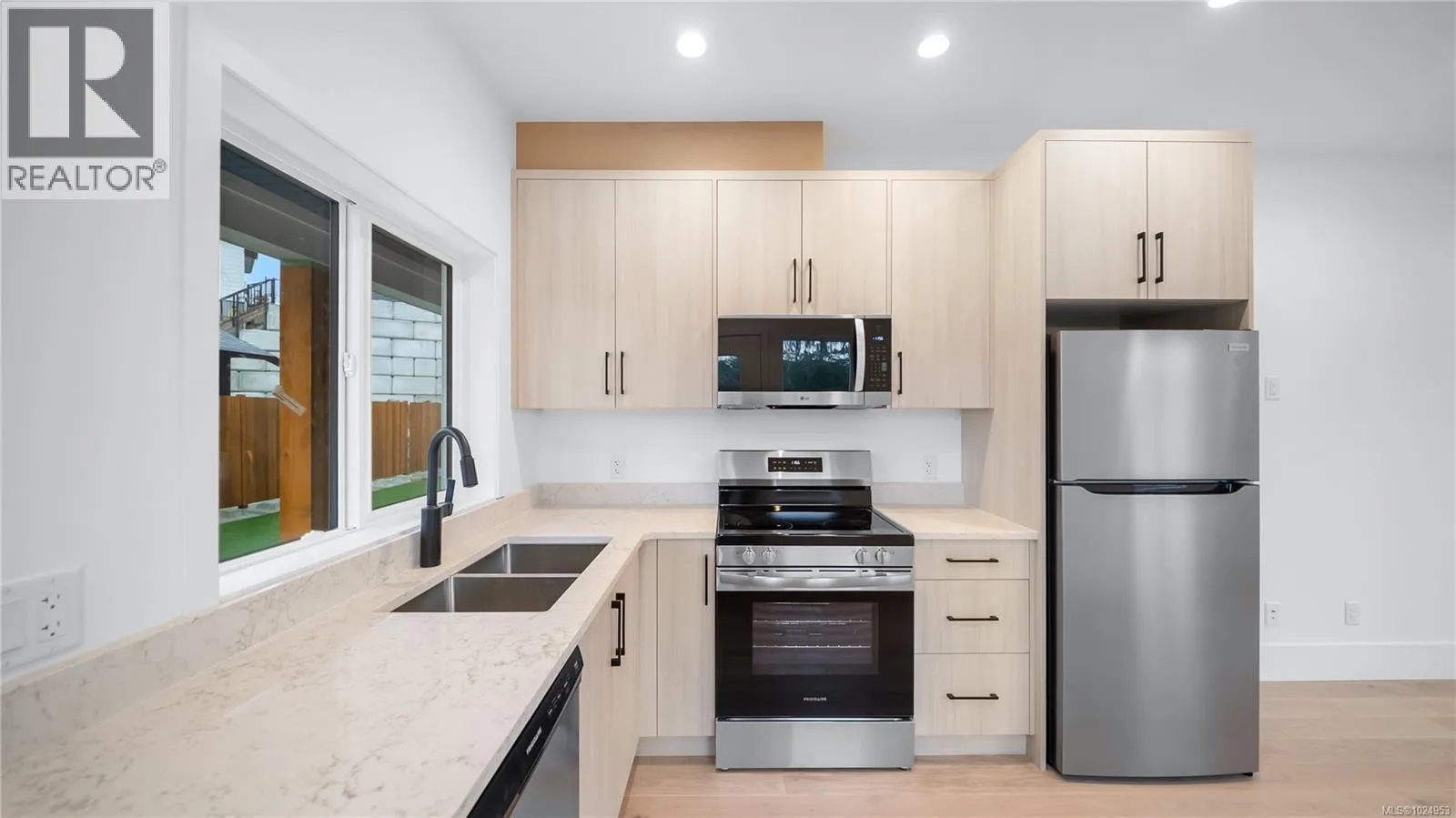NEW executive home on a quiet road in sought after Olympic View. The beautifully appointed kitchen is a chef's dream; large island w/ seating , quartz counters, gas range, premium appliances, and upscale fixtures. Living room gas fireplace, Primary suite on main level, 5 piece ensuite, floating vanities, undermount lighting, heated floors, large shower, walk-in closet plus large office. Lower level 2 additional bedrooms, games room, plus legal bright self-contained suite includes all appliances plus in-suite laundry. Ultra efficient heating-cooling system, on-demand gas hot water. Double garage w/ roughed in EV charger, even extra room for boat and RV parking! All on a private easy care lot landscaped with premium synthetic lawn. Near Olympic View Golf, Willing Park, walking trails and new schools. Quality by Ash Mountain Construction built to Step Code 4 & full 2-5-10 warranty. Explore the exceptional amenities & design elements that set these homes apart. (id:27476)