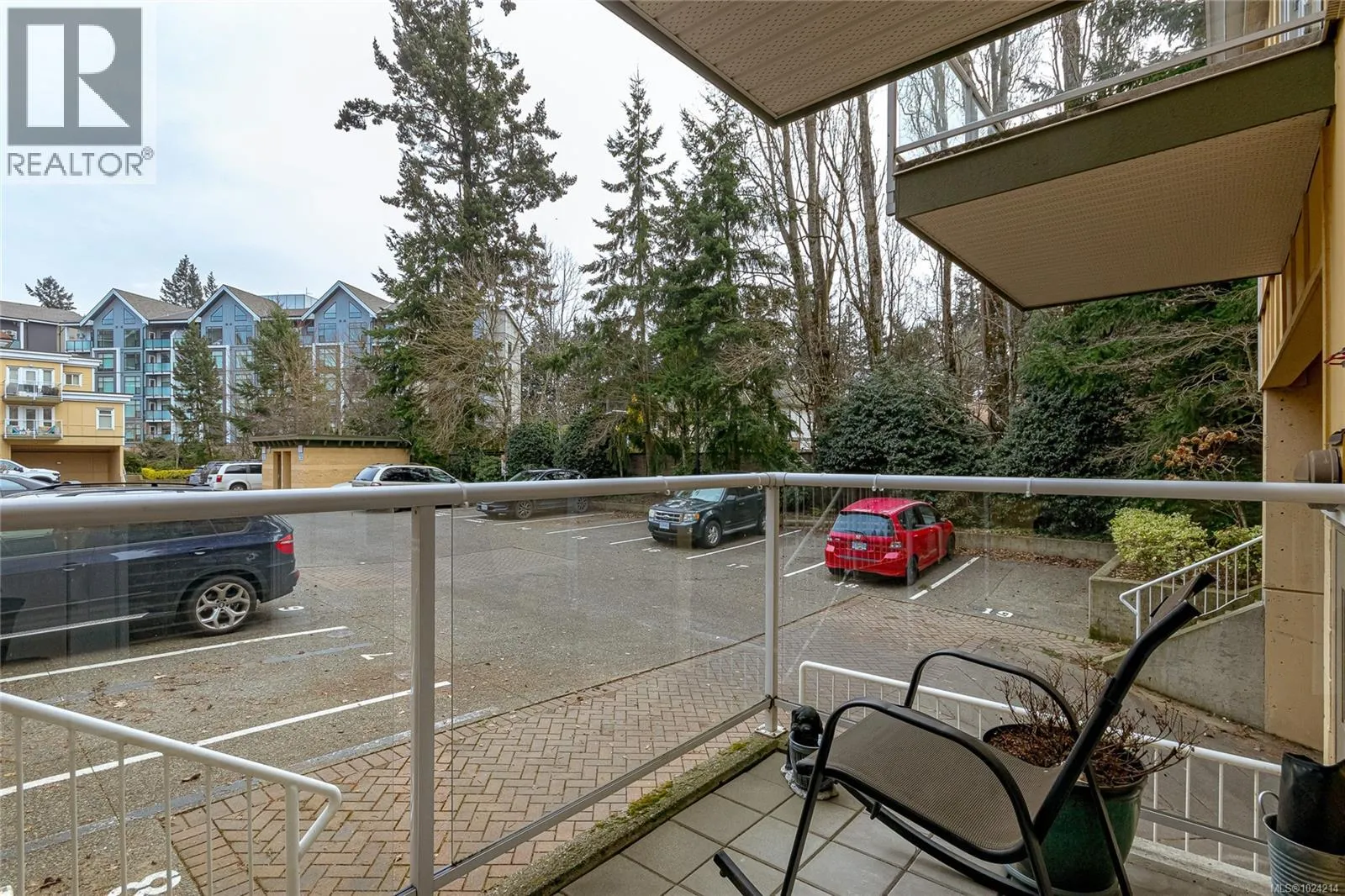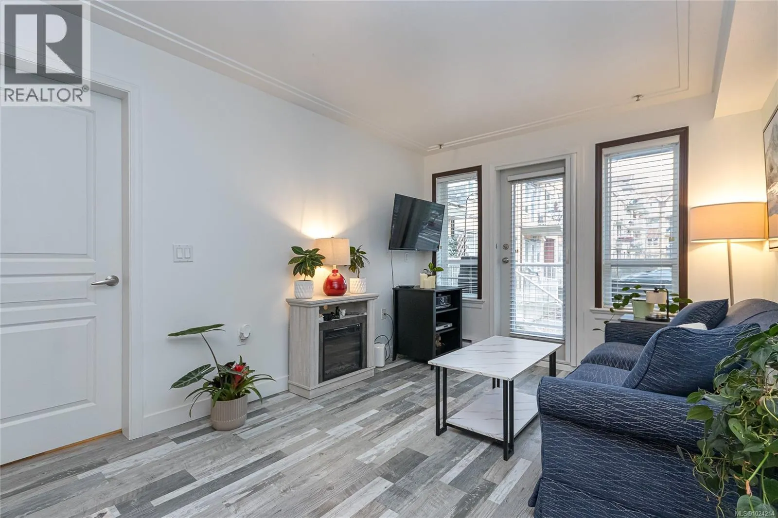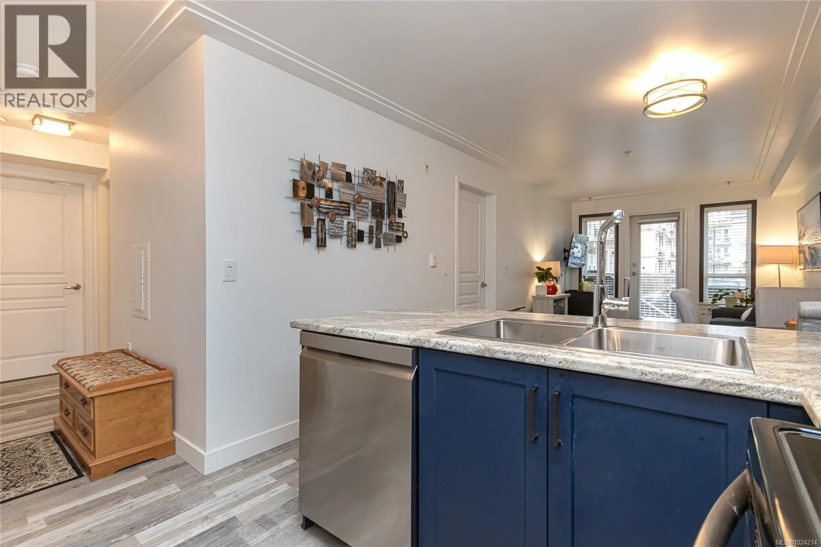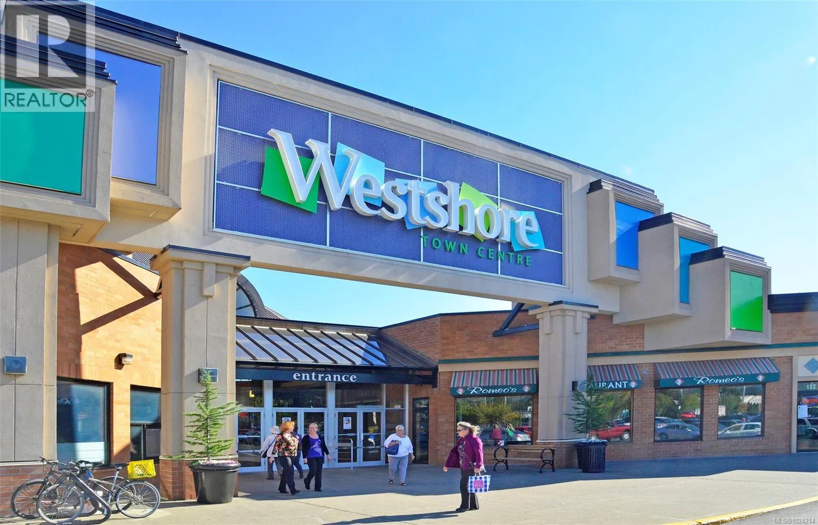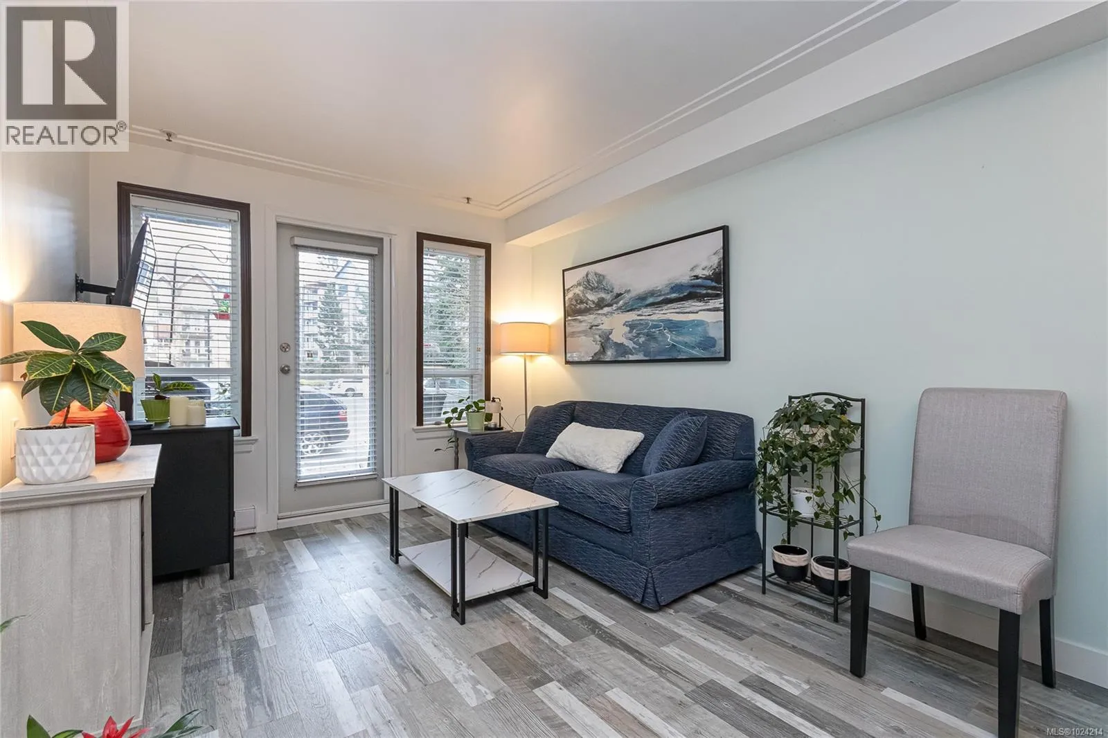 Location, Location, Location in Langford Town Core! This 1 Bedroom + Den is the perfect affordable condo option! This unit faces away from the street in a quiet building, located next to the park. A stylish open concept design with a spacious kitchen, eating bar & new bright cabinet facings. New flooring & a personal balcony adjacent to the living room. The large primary bedroom accesses the main bath which has been renovated to include a new shower, toilet and vanity door facings. The versatile Den is perfect for a home office, guest room, or creative studio. In-suite laundry too! Building amenities include Bike Storage, Fitness Center, Underground Parking, Roof Top Balcony, Outdoor Gathering Space and a Meeting Room. A well cared for building with so much to offer. Close to transit, shops, dining & medical services! This condo is ideal for professionals, first-time buyers, or downsizers looking for convenience without compromise. 2 small dogs & rentals permited. (id:27476)