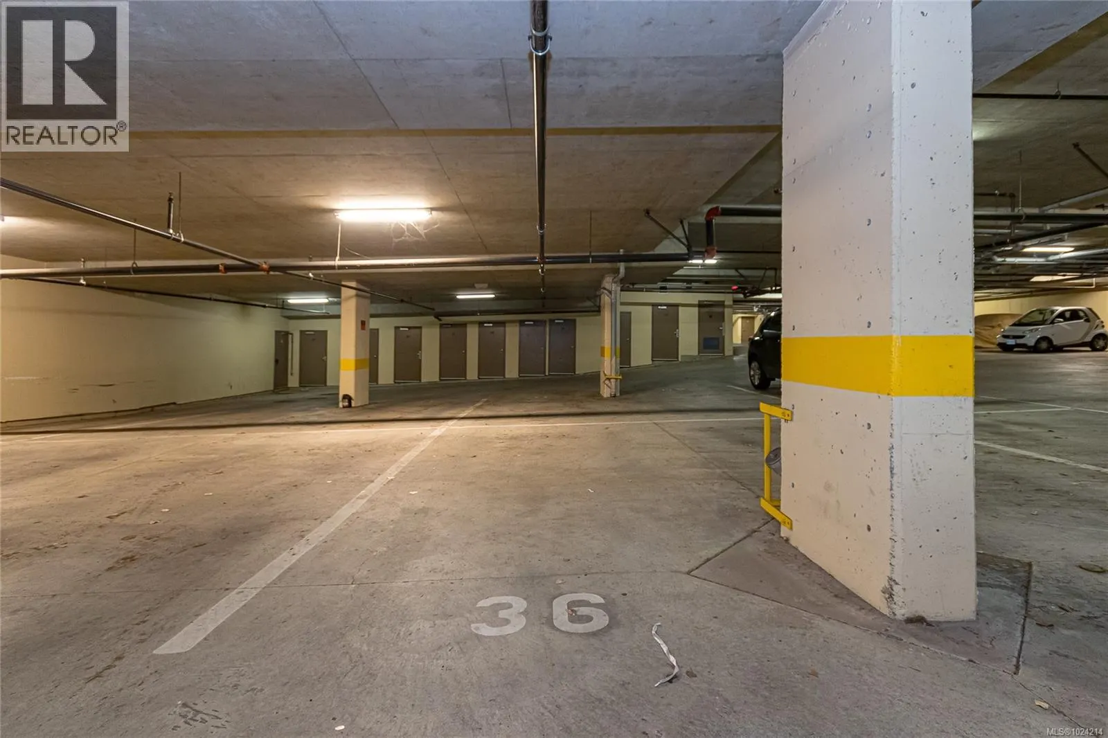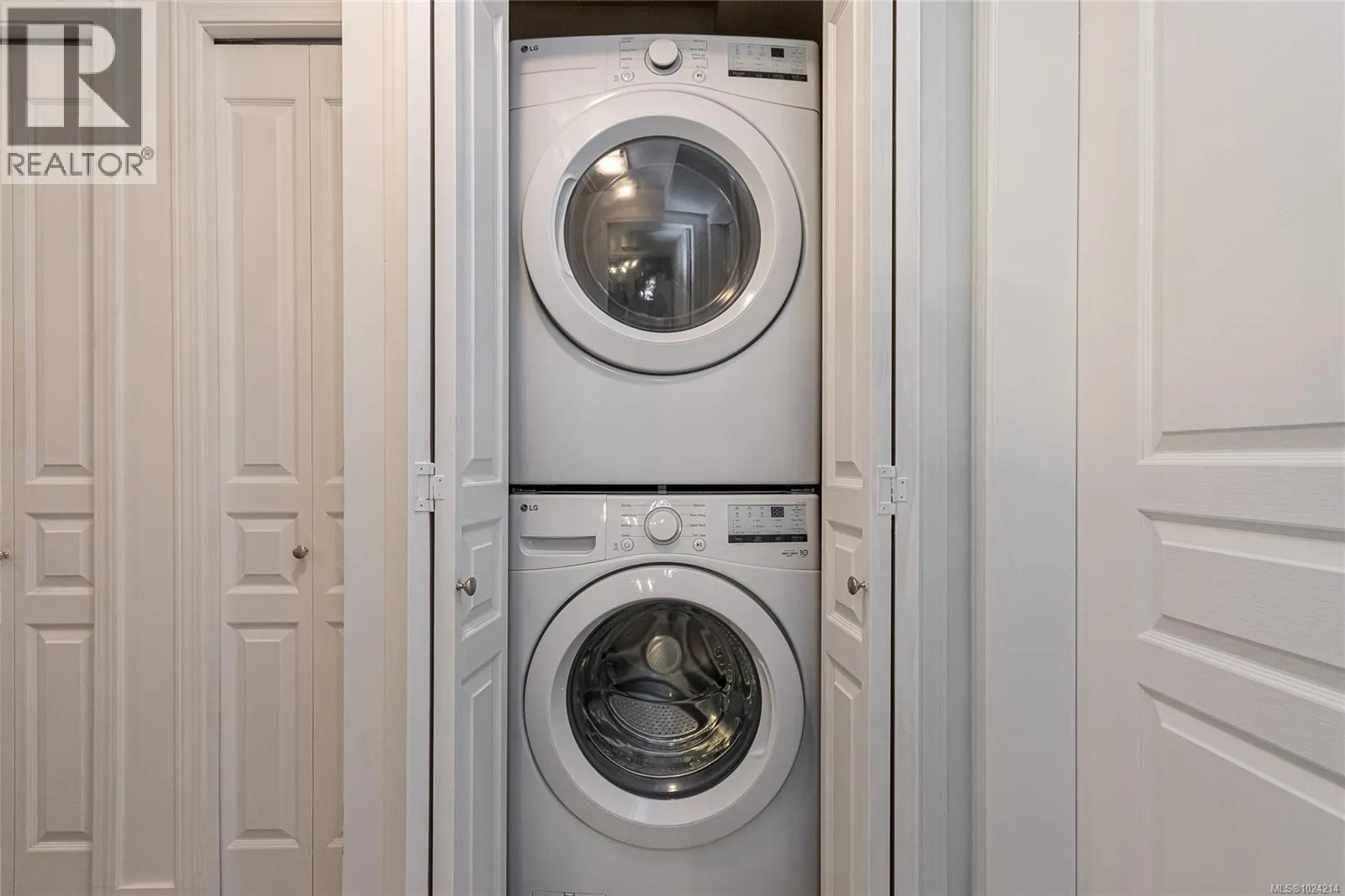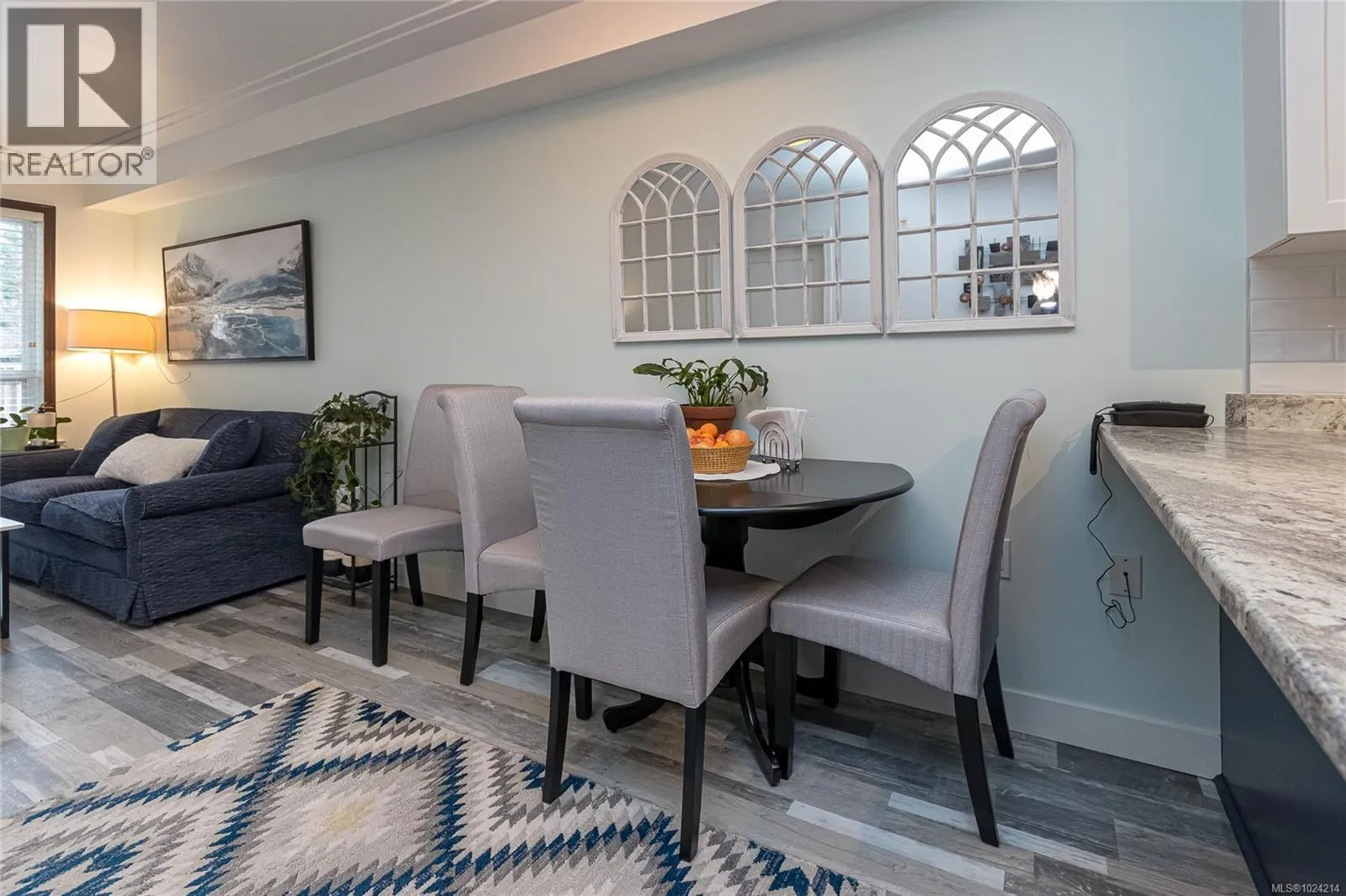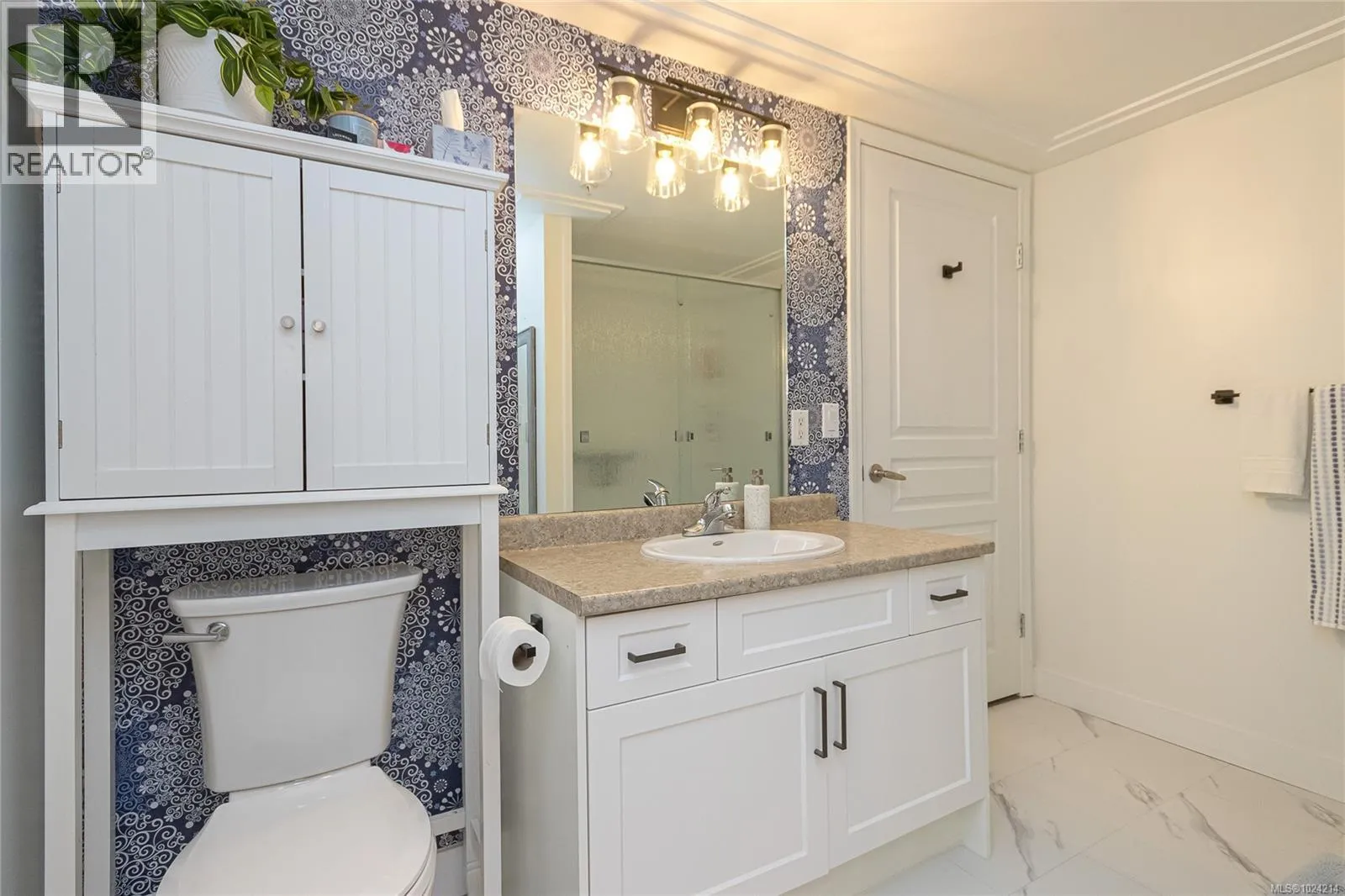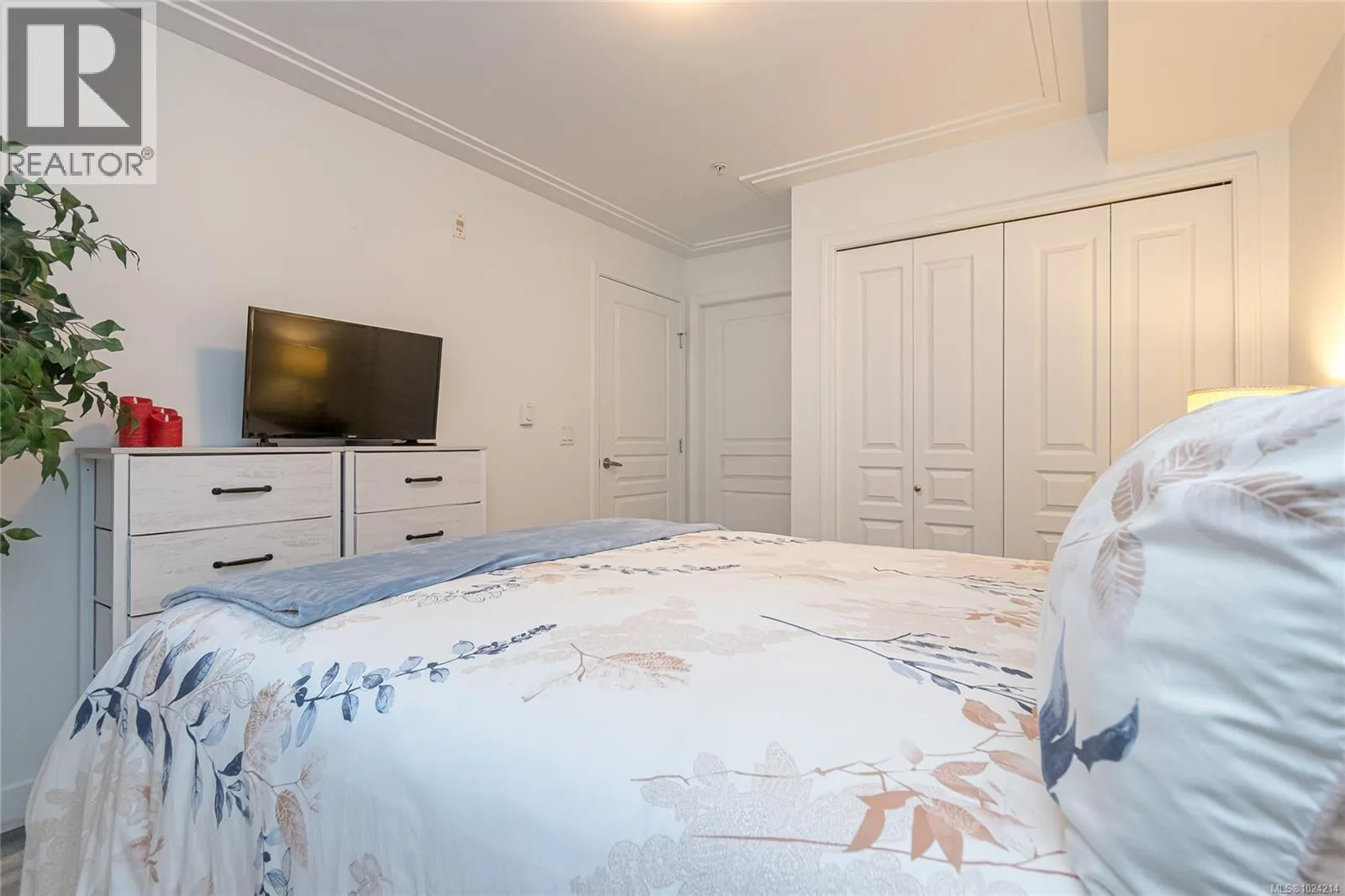 Location, Location, Location in Langford Town Core! This 1 Bedroom + Den is the perfect affordable condo option! This unit faces away from the street in a quiet building, located next to the park. A stylish open concept design with a spacious kitchen, eating bar & new bright cabinet facings. New flooring & a personal balcony adjacent to the living room. The large primary bedroom accesses the main bath which has been renovated to include a new shower, toilet and vanity door facings. The versatile Den is perfect for a home office, guest room, or creative studio. In-suite laundry too! Building amenities include Bike Storage, Fitness Center, Underground Parking, Roof Top Balcony, Outdoor Gathering Space and a Meeting Room. A well cared for building with so much to offer. Close to transit, shops, dining & medical services! This condo is ideal for professionals, first-time buyers, or downsizers looking for convenience without compromise. 2 small dogs & rentals permited. (id:27476)