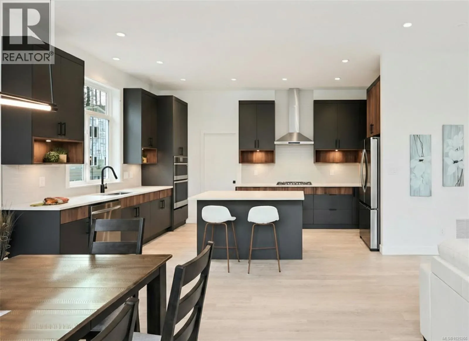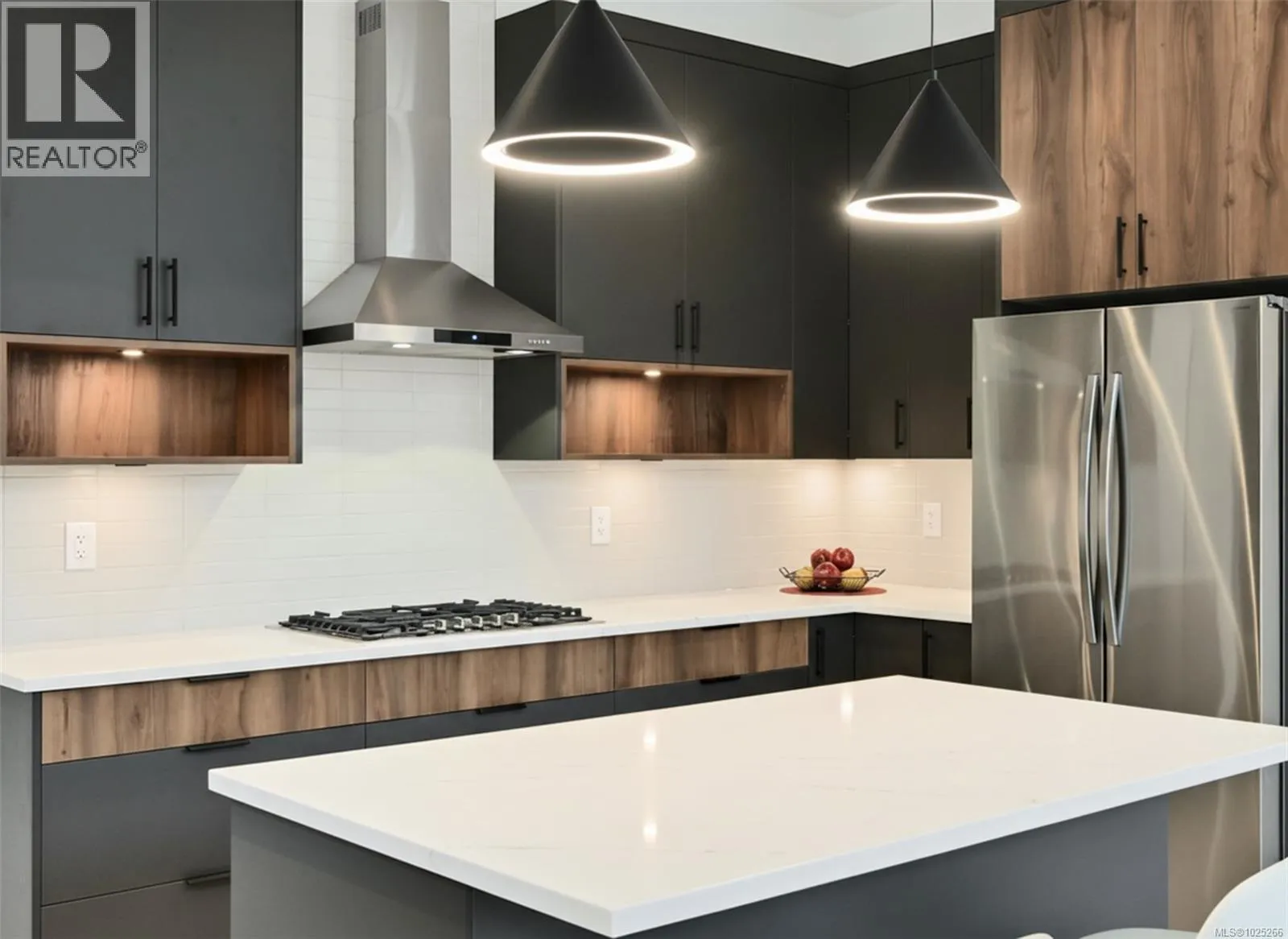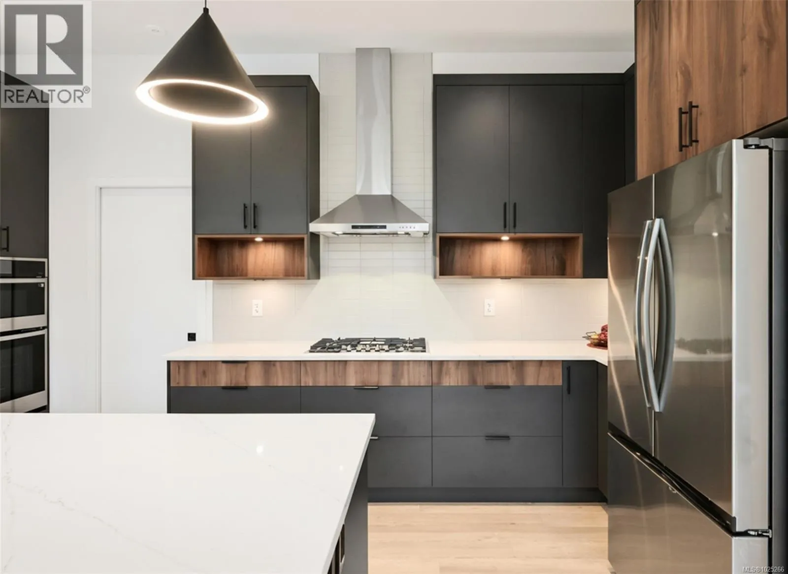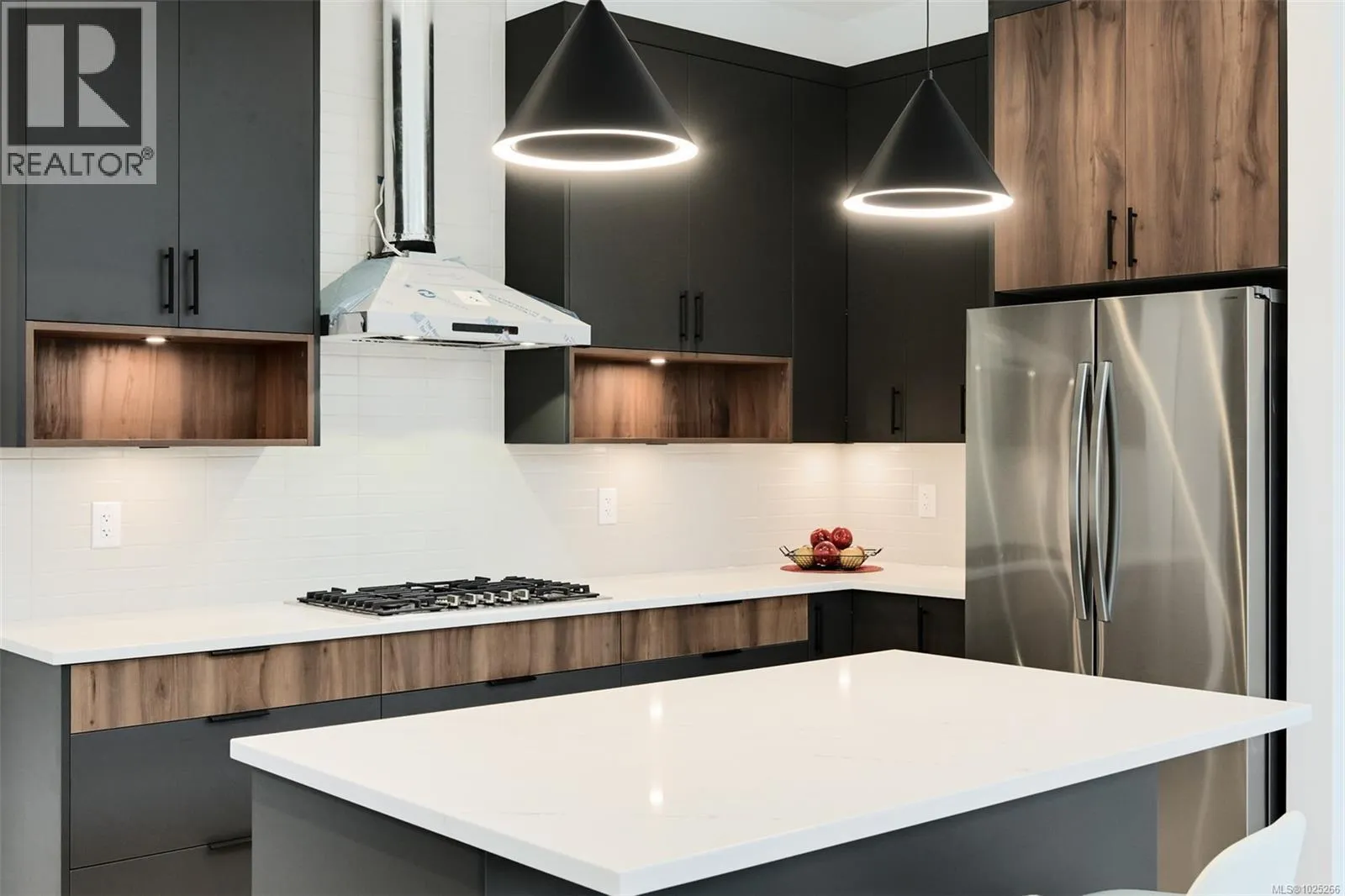 Welcome to The Heights, a boutique, controlled subdivision in Langfordâs desirable Olympic View area. Move-in ready, this newly completed 2,294 sq ft Hudson floor plan offers a reverse living layout intended for a modern, low-maintenance lifestyle. The upper level is designed for entertaining, featuring a modern kitchen, open living and dining areas filled with natural light, and elevated views toward Triangle Mountain. The lower level offers three bedrooms and a family or media room with walk-out access to a private, fenced, low-maintenance backyard, well suited for families. The primary bedroom also enjoys direct access to a covered patio, creating a quiet space to relax. Additional highlights include a double-car garage with dedicated EV charger, modern lighting, durable vinyl flooring throughout, and an energy-efficient heating and cooling system with HRV, built to meet STEP 4 BC Energy Code requirements. The Heights offers distinctive floor plans, including suite options, within a controlled boutique community close to golf, trails, beaches, shopping, and a new elementary school just across the street (opened September 2025). Plus GST. New Home Warranty. (id:27476)
