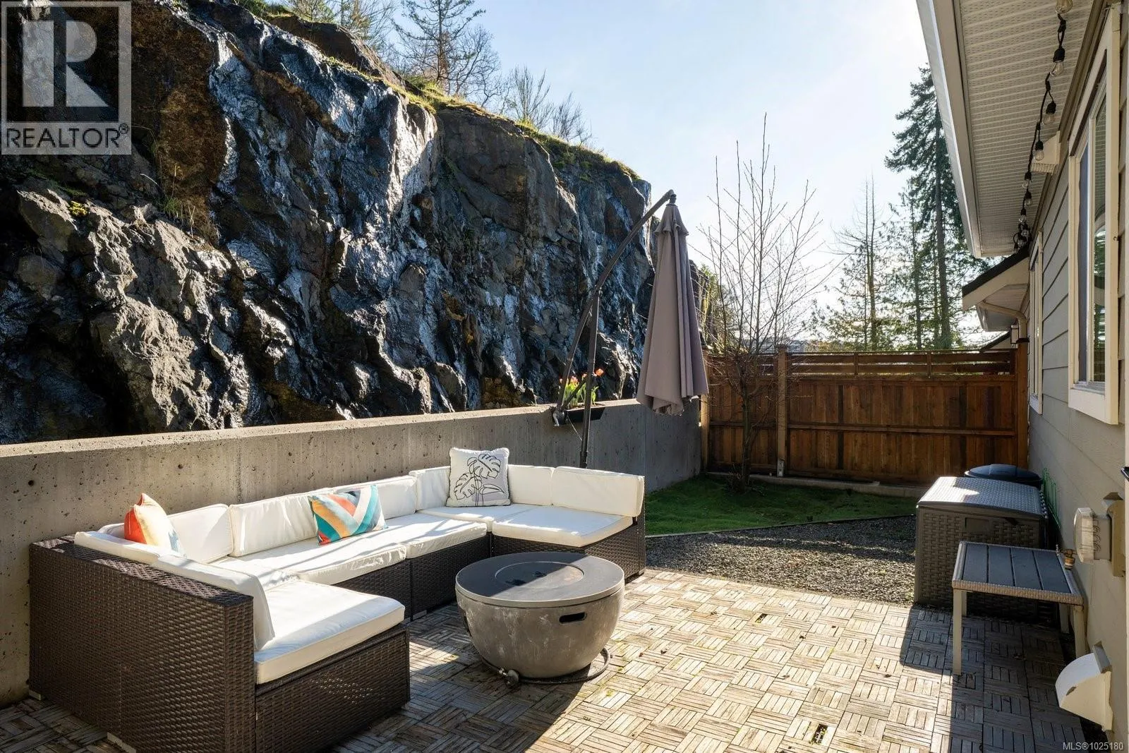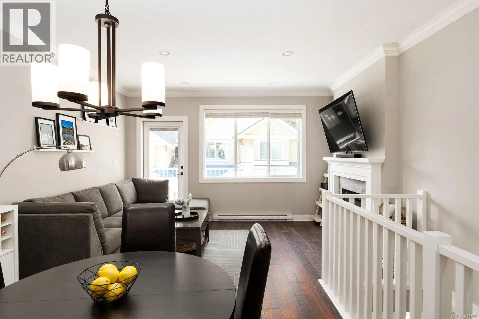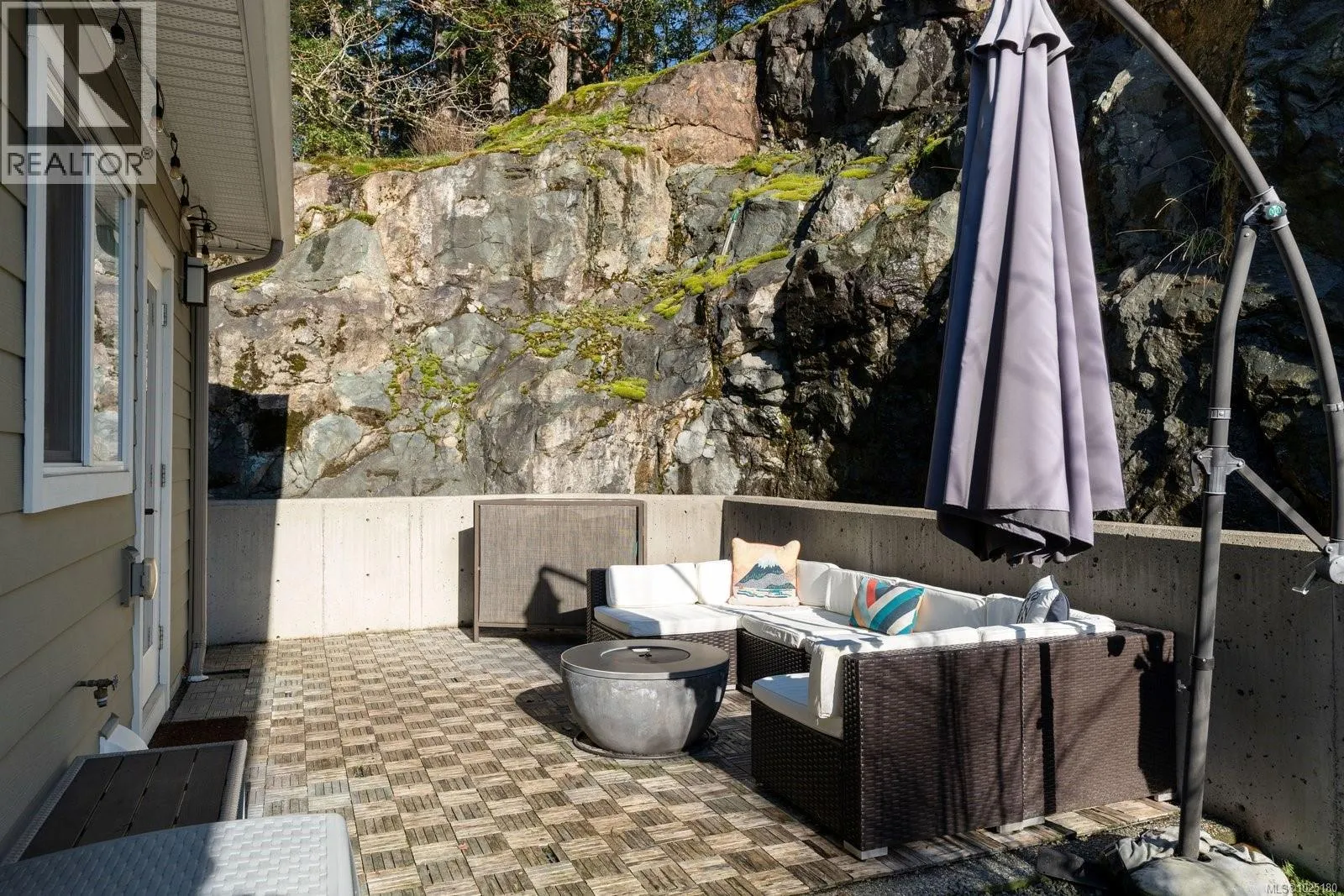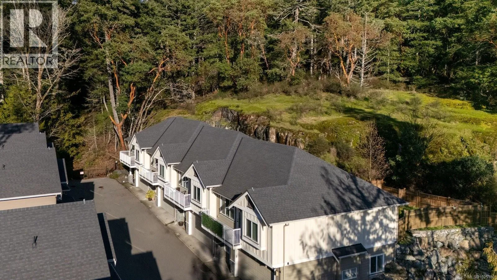 Bright end-unit townhome in family-friendly Happy Valley community. Beautifully maintained and move-in ready. Soaring ceilings and abundant natural light enhance the open-concept main floor, featuring a gourmet kitchen with granite counters, premium appliances (including an oversized fridge), bar seating, and a stylish fireplace in the living room. A spacious primary bedroom, second bedroom, and 4-piece bath complete the main floor. The flexible floor plan is ideal for guests or working from home, with a walk-out lower level offering a den plus office/gym, full bath, laundry, ample storage (including under-stairs space), and a double garage. Enjoy your sun-soaked deck and patio overlooking a private yard with views of Arbutus trees and a striking natural rock wall backdrop â a truly serene setting. Well-managed, friendly strata in a welcoming community close to Westshore Town Centre, Langford Lake, Royal Colwood Golf Club, and the Galloping Goose Regional Trail. (id:27476)
