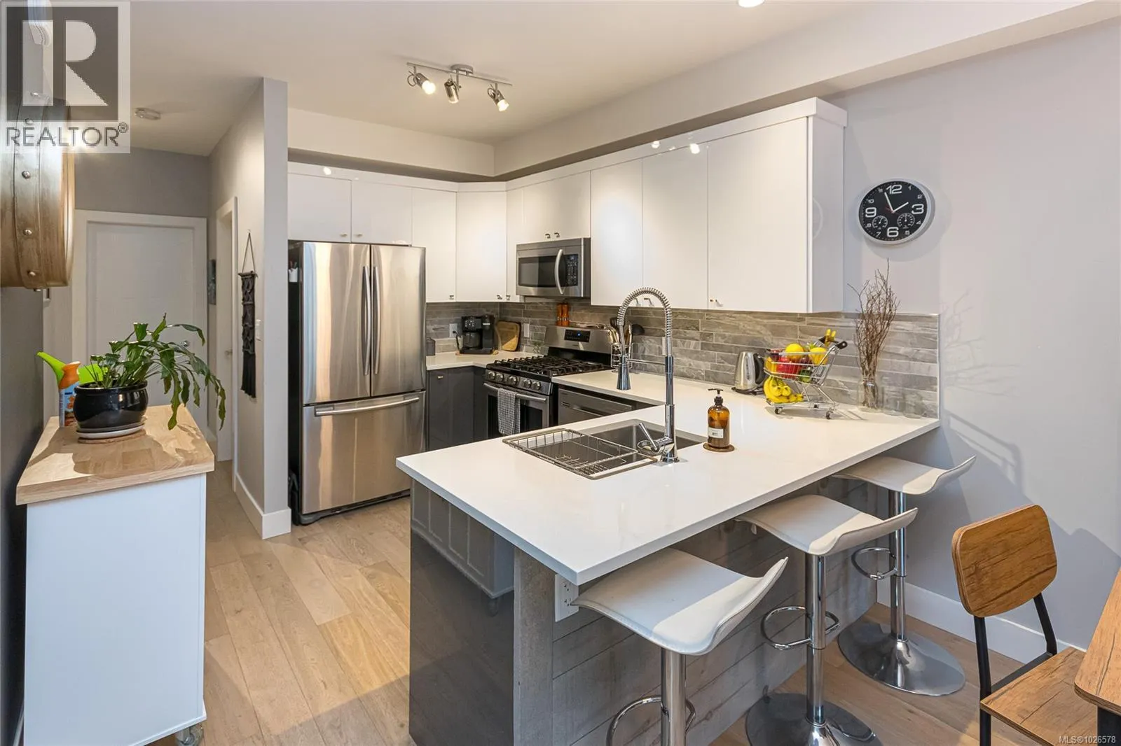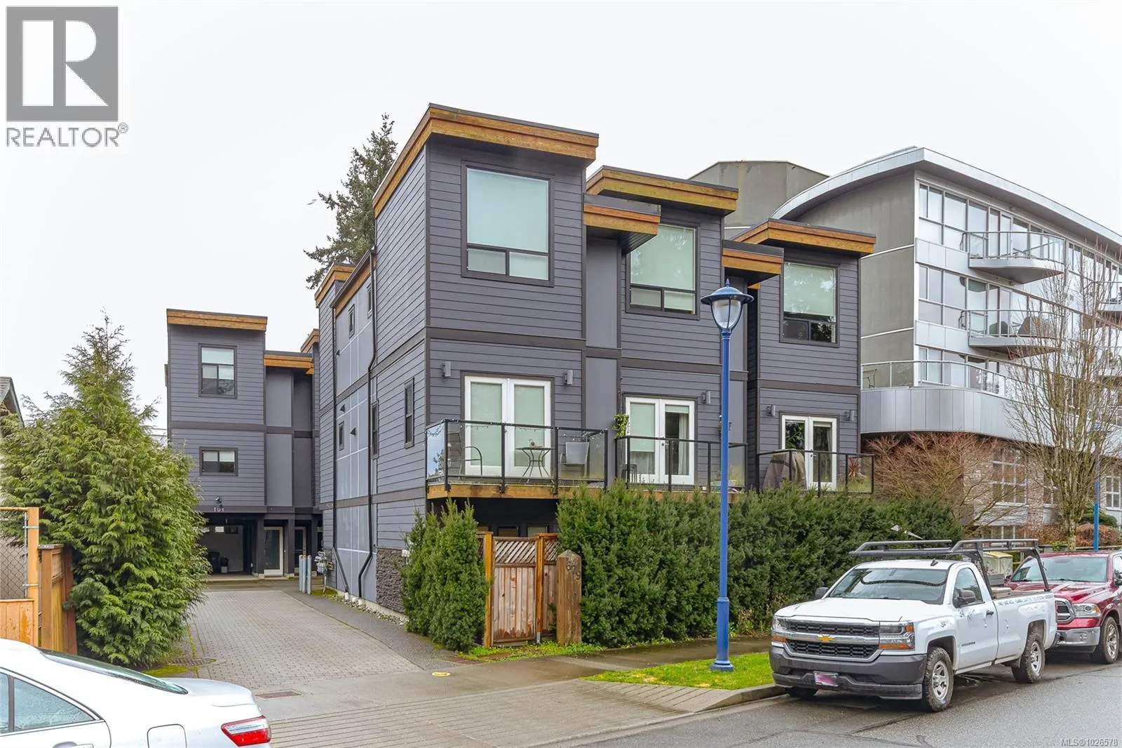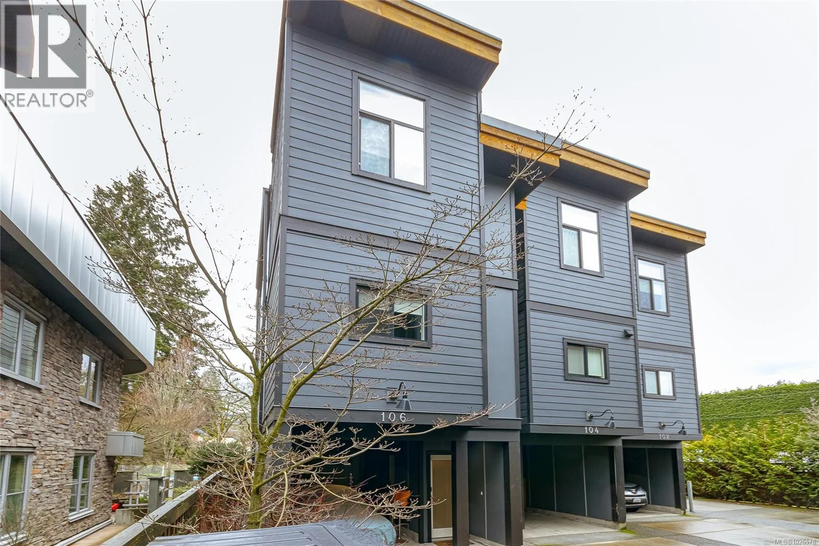 Modern 7-unit townhome complex offering refined West Coast living. Tucked away on a quiet street, just steps from the heart of Goldstream Village, this spacious end-unit spans three thoughtfully designed levels and offers excellent separation. Energy-efficient and low-maintenance, the home features 3 generous bedrooms and 3 bathrooms, plus an oversized heated garage/den conversion ideal as a man cave/studio, along with a covered attached carport. Inside, enjoy high-quality finishes, including a 9-foot ceiling, a heat pump with air conditioning, an HRV system, LED lighting, elegant laminate flooring, quartz countertops, an undermount sink, a built-in vacuum system, and a built-in microwave. The primary bedroom boasts a soaring 12-ft ceiling, a spa-inspired ensuite with a barn door, in-floor heat, and a walk-in shower. Balcony features a Gas BBQ hookup. This well-maintained, self-managed complex offers low fees and no rental restrictions. Exceptional opportunity in a sought-after location. (id:27476)