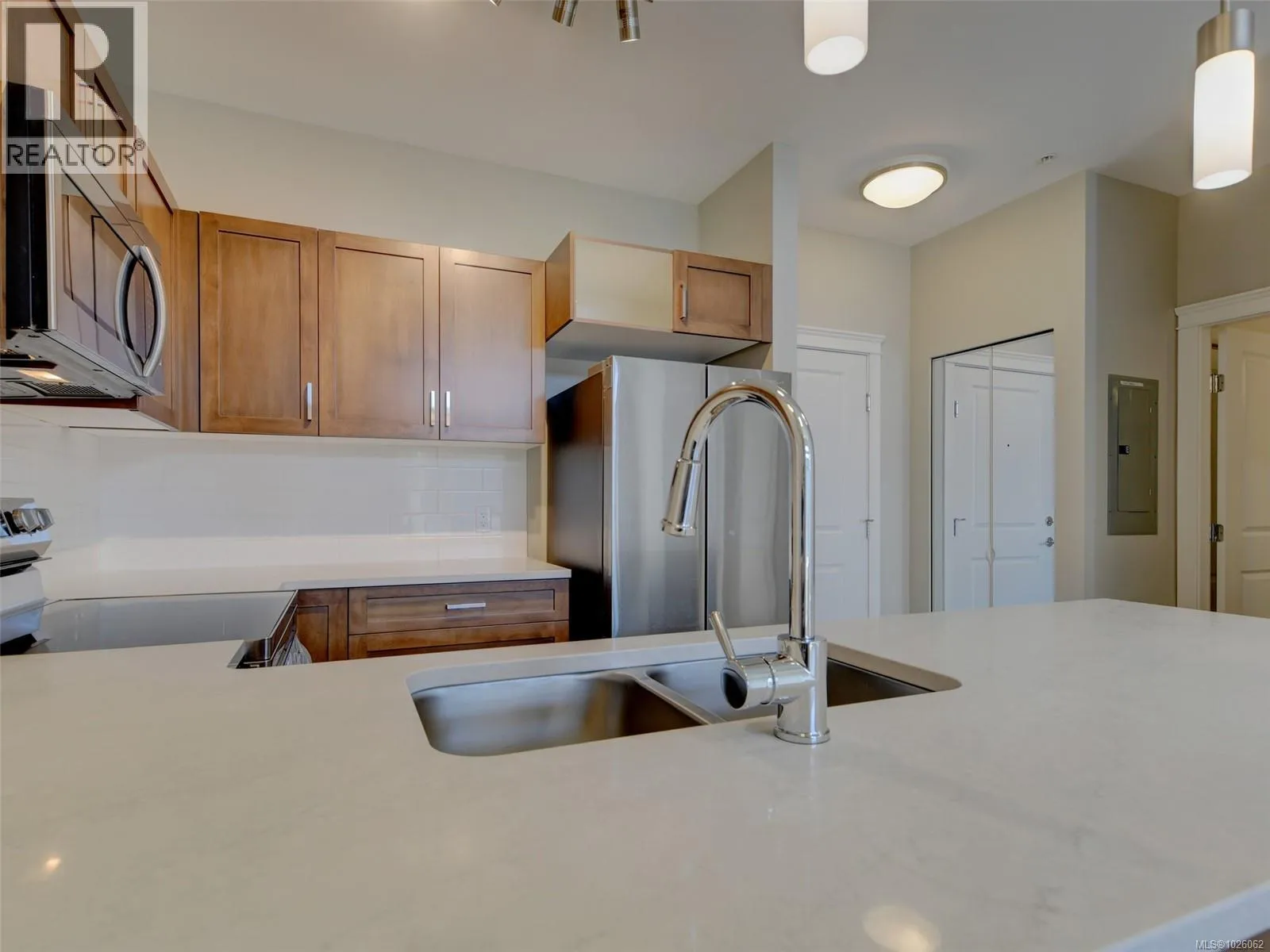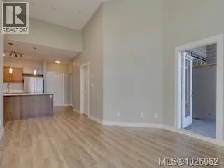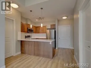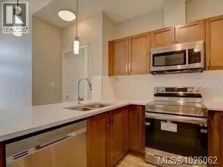 Itâs all about lifestyle and convenience in this beautifully updated TOP FLOOR modern condo in the heart of Langford! The moment you enter, you will understand why this unit is special and appreciate the soaring 12 foot high vaulted ceilings. Large windows ensure abundant natural light while overlooking a peaceful green space. Stylish open plan kitchen with quartz countertops, high end appliances and an array of upgrades. Sleek new flooring. Generous sized master bedroom with walk-through closets and luxurious ensuite. Second bedroom and full bathroom. Excellent entertainment-sized balcony. Secure, covered parking stall and bike storage. Leave the car at home! This complex is ideally situated with a great walk score of 90, just steps away from the best dining, shopping, and entertainment Langford has to offer. Whether youâre a busy professional or simply seeking a vibrant urban lifestyle, this home delivers modern luxury and unmatched convenience. (id:27476)