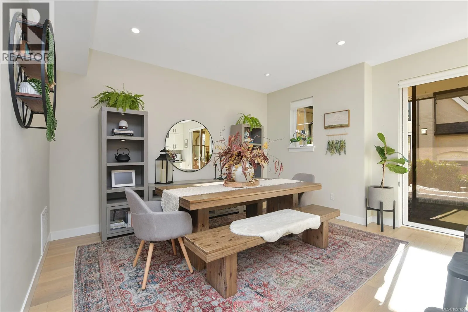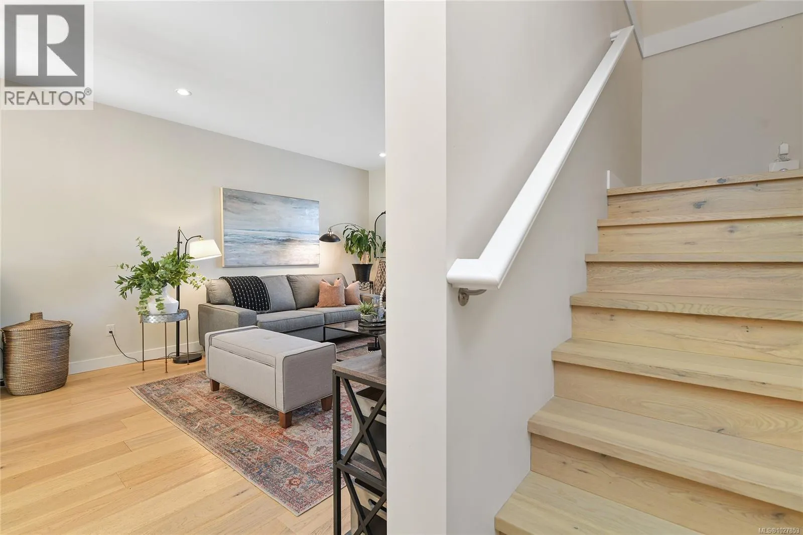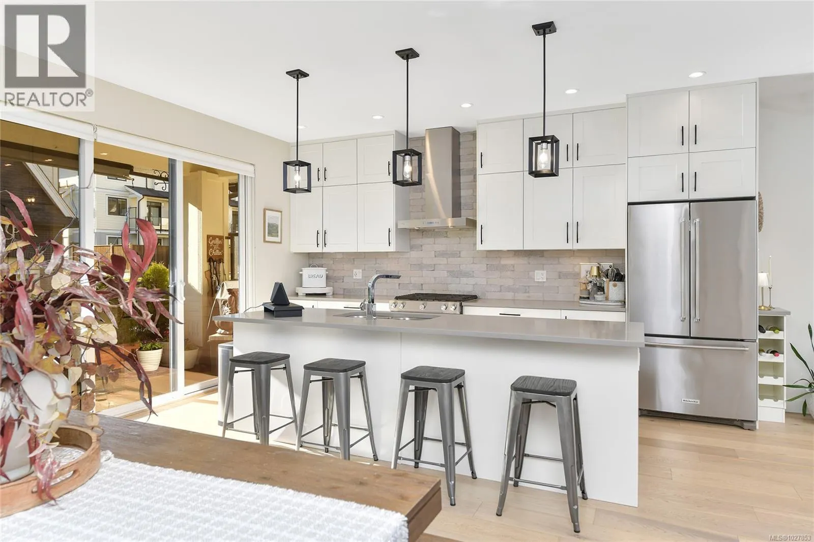 Beautifully appointed 4 bed, 3 bath townhome in The Brownstones at Langford Lake in sought-after Kettle Creek! The main floor features a bright open-concept layout with a spacious dining area, chef-inspired kitchen with quartz counters, shaker cabinetry, stainless appliances, gas range, and large island, and a comfortable living room anchored by a cozy gas fireplace. Step out to the spacious South facing balcony with a gas connection ready for family barbecues. Upstairs offers 3 bedrooms and 2 bathrooms, including a spacious primary retreat with a 12.5-ft vaulted ceiling, custom walk-through closet, and double-sink ensuite with a large walk-in shower. Two additional generous bedrooms and a full bathroom complete the upper level. Downstairs features a versatile bedroom or home office/family room. Enjoy your morning coffee on the East facing patio with views toward Skirt Mountain. Oversized 1-car garage with a workshop area and plenty of storage with room for a second vehicle in the driveway. Custom blinds and shutters, built-in vacuum, heat pump with A/C for year around comfort. Located in a vibrant Langford neighbourhood close to parks, trails, schools, shopping, and everyday amenities. (id:27476)