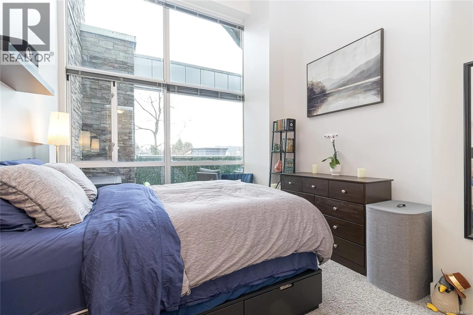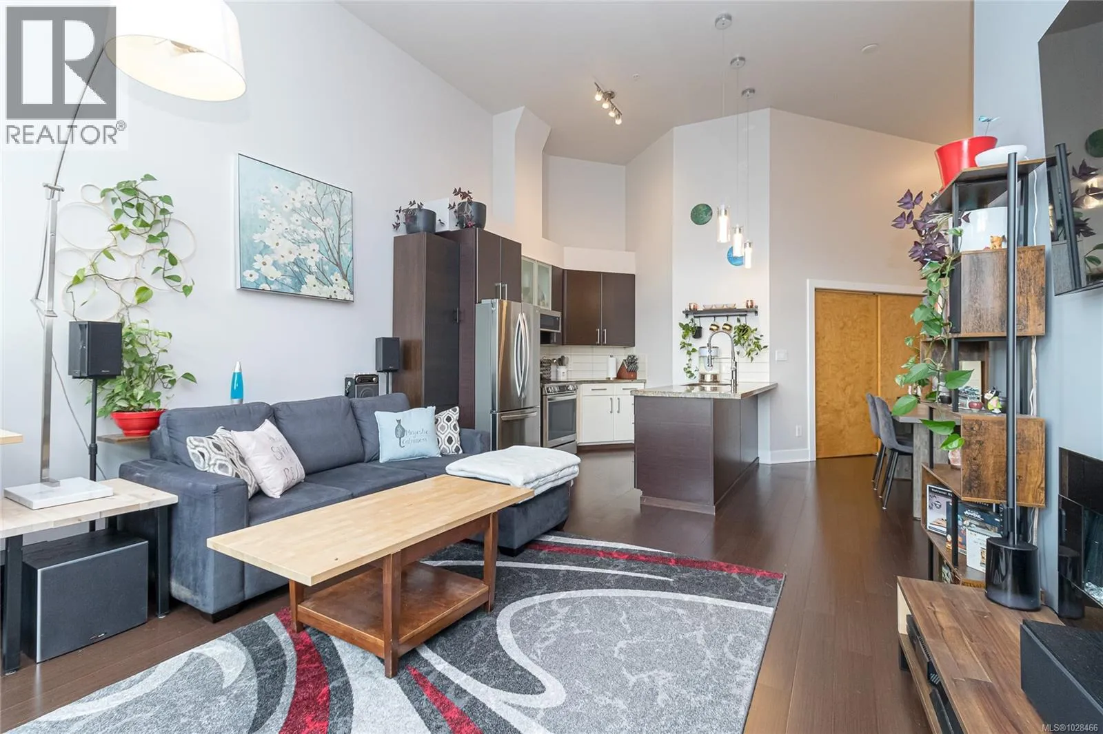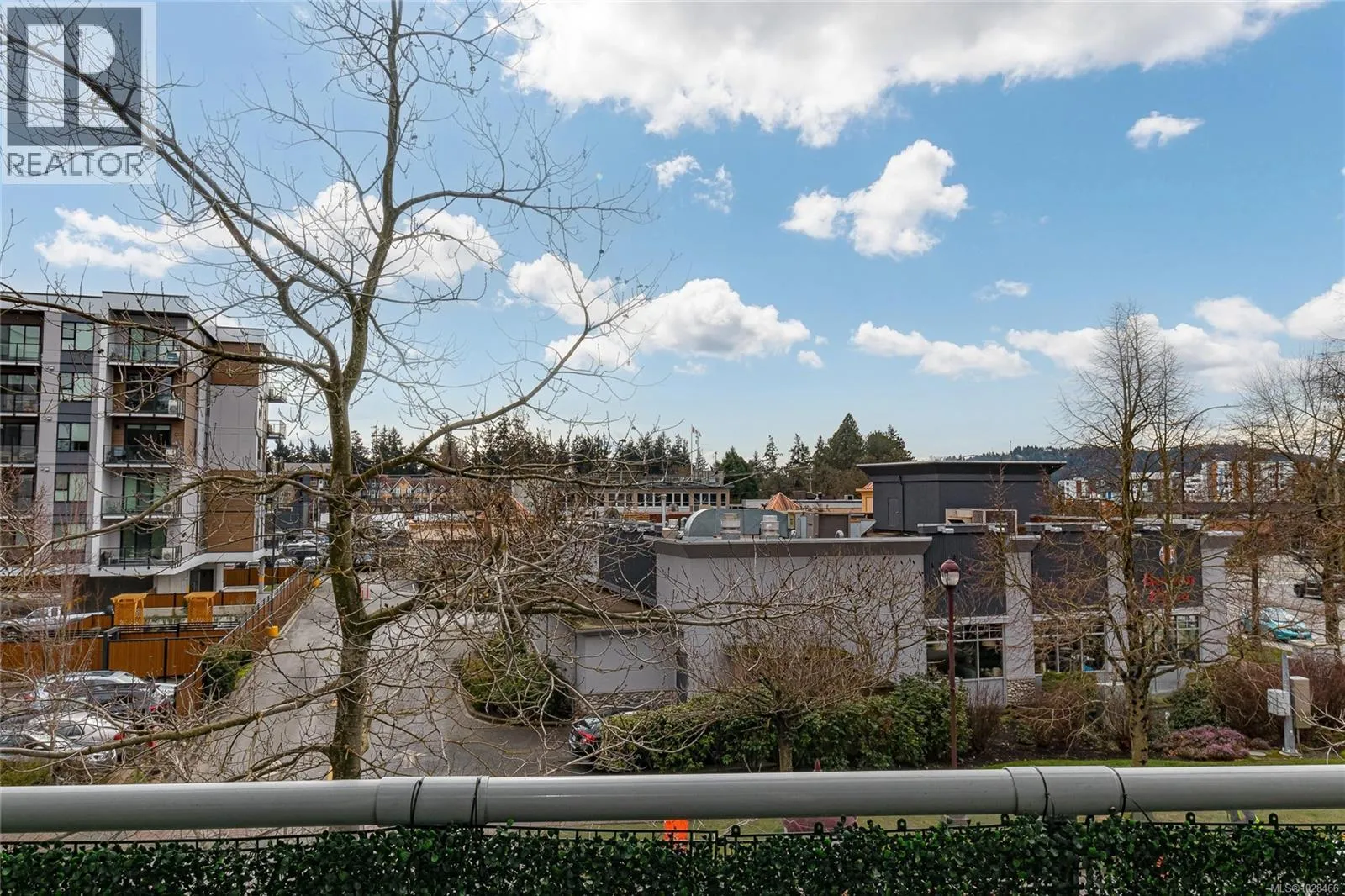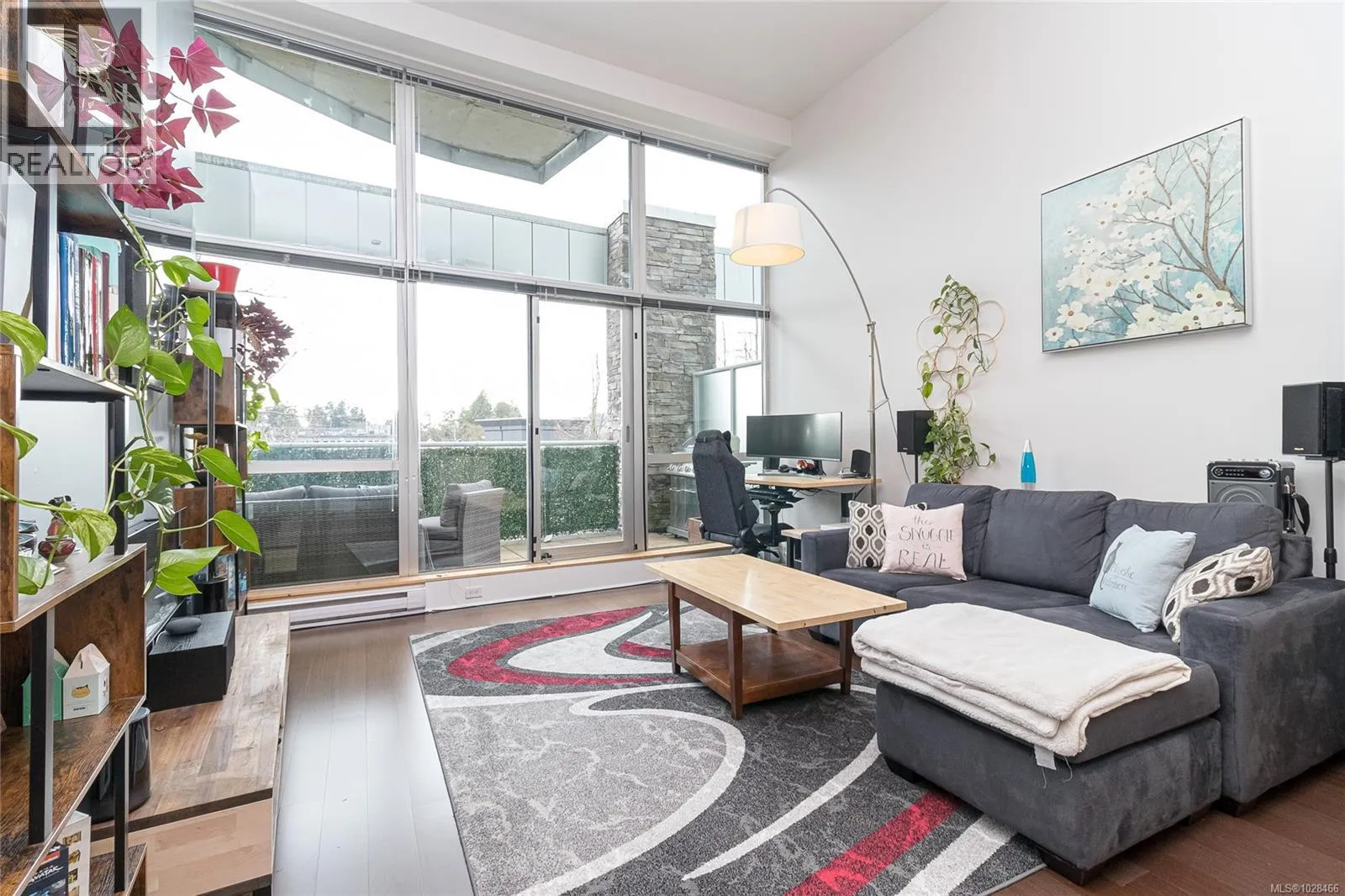 *Open House Sunday 22nd 1-3pm* Located in the sought-after Reflections building, this modern and spacious condo offers stylish living in the heart of Langford. From the moment you walk through the door, youâll be awed by the soaring 13'5'' ceilings and floor-to-ceiling windows that fill the home with natural light. The bright, open-concept layout features gleaming hardwood floors and a contemporary design. The kitchen is finished with granite countertops, tiled backsplash, stainless steel appliances, and sleek cabinetry, flowing seamlessly into the living area. Enjoy the large south-facing deck, perfect for entertaining, container gardening, or relaxing while taking in the sunset. The primary bedroom offers high ceilings, a walk-through closet, & ensuite. The second bedroom/den is ideal for a home office or guest room. Reflections is known for its striking curved architecture and amenities including a rooftop running track & outdoor pool. Just steps to Goldstream Village shops, cafes & restaurants. Come see it today! (id:27476)