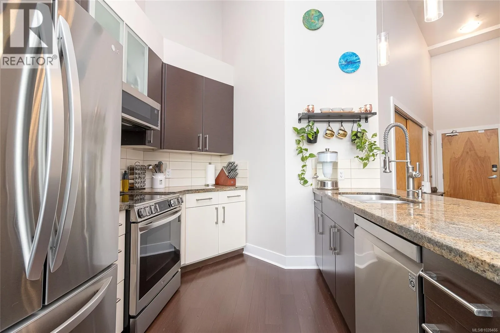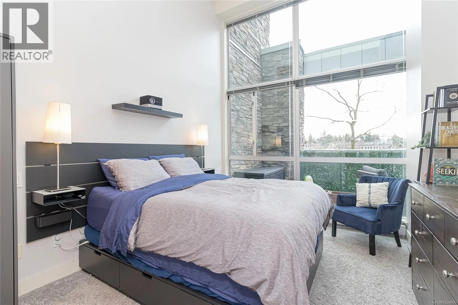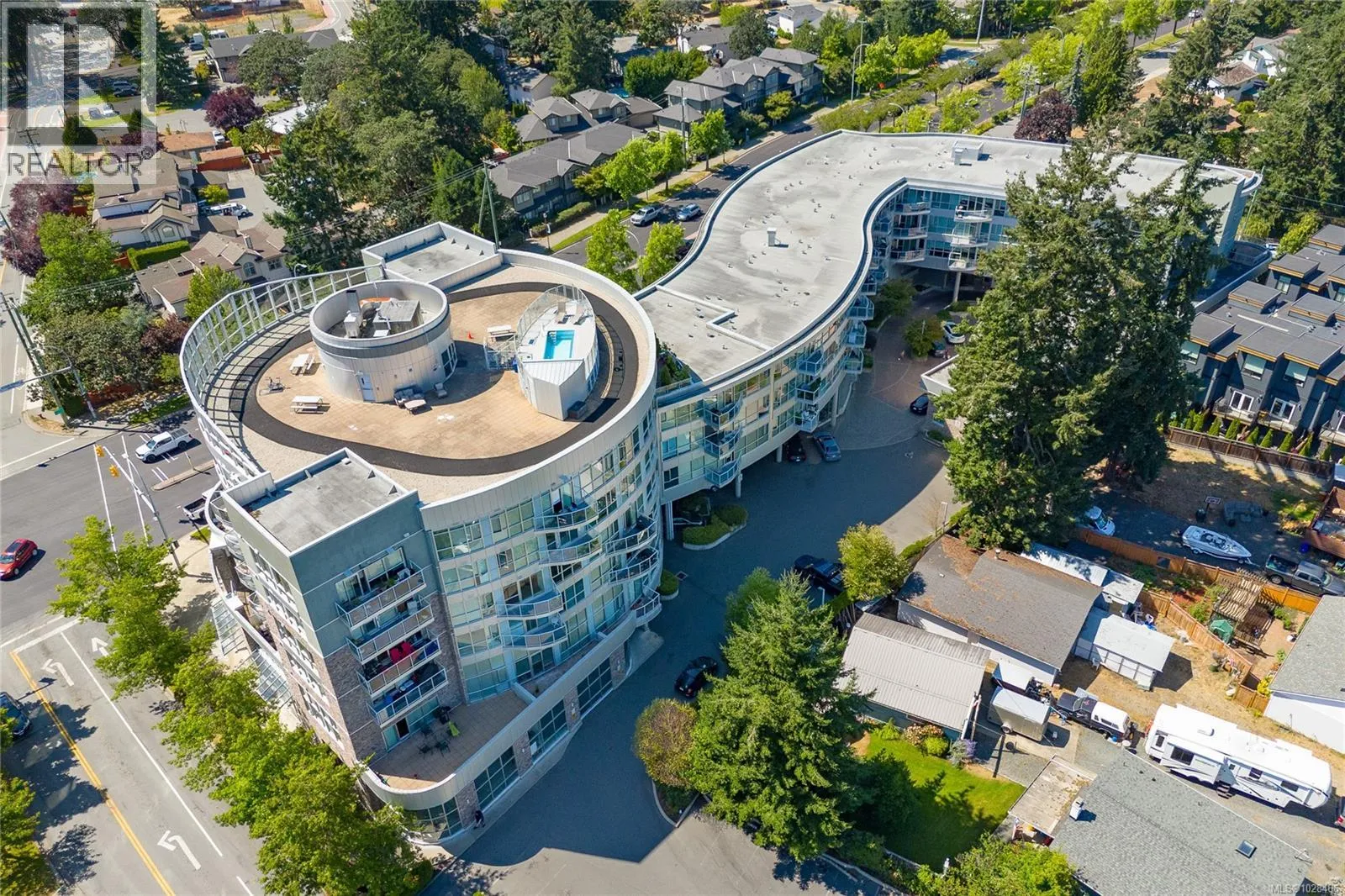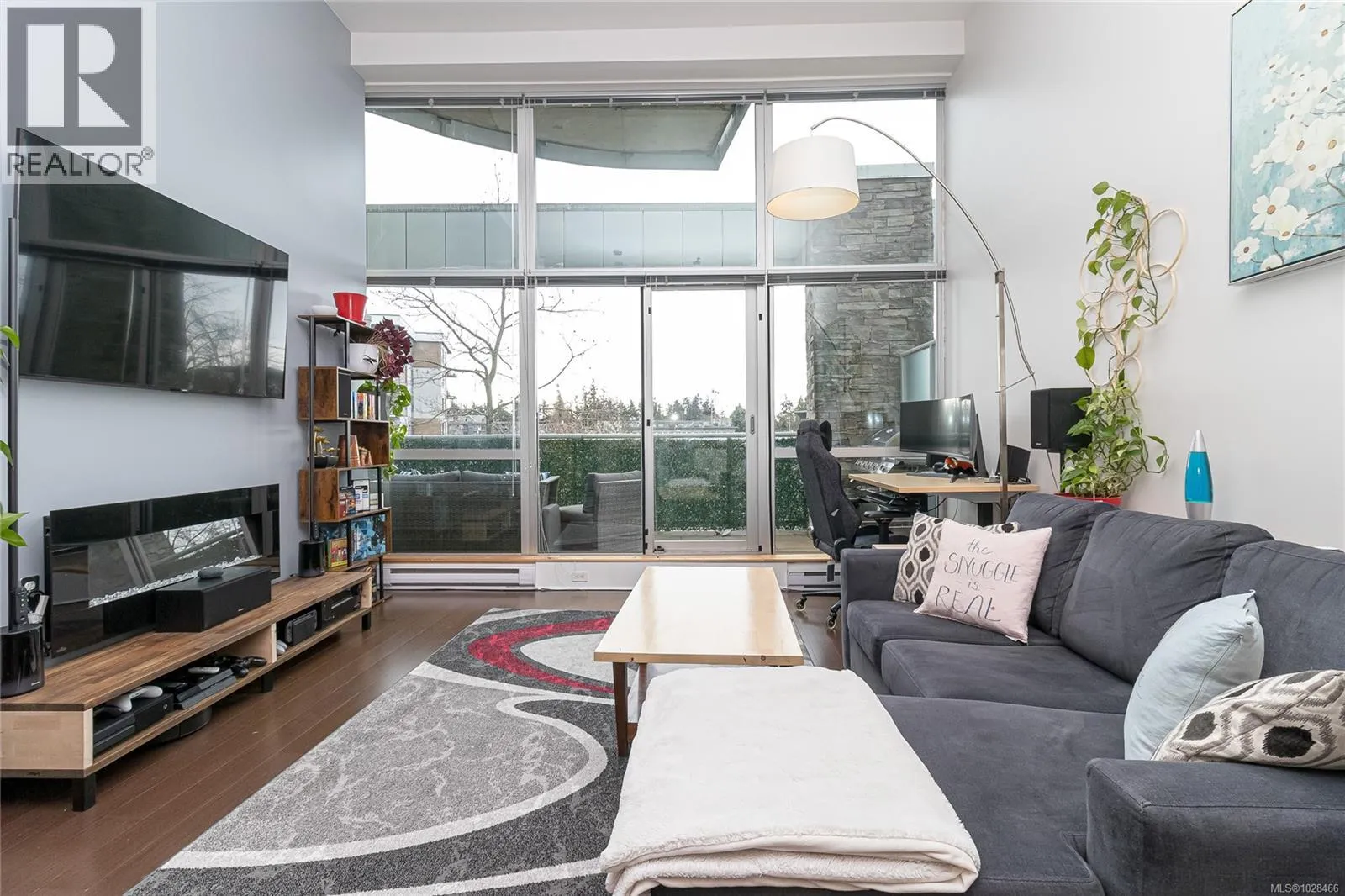 *Open House Sunday 22nd 1-3pm* Located in the sought-after Reflections building, this modern and spacious condo offers stylish living in the heart of Langford. From the moment you walk through the door, youâll be awed by the soaring 13'5'' ceilings and floor-to-ceiling windows that fill the home with natural light. The bright, open-concept layout features gleaming hardwood floors and a contemporary design. The kitchen is finished with granite countertops, tiled backsplash, stainless steel appliances, and sleek cabinetry, flowing seamlessly into the living area. Enjoy the large south-facing deck, perfect for entertaining, container gardening, or relaxing while taking in the sunset. The primary bedroom offers high ceilings, a walk-through closet, & ensuite. The second bedroom/den is ideal for a home office or guest room. Reflections is known for its striking curved architecture and amenities including a rooftop running track & outdoor pool. Just steps to Goldstream Village shops, cafes & restaurants. Come see it today! (id:27476)