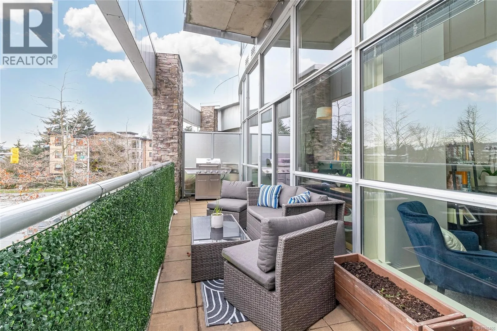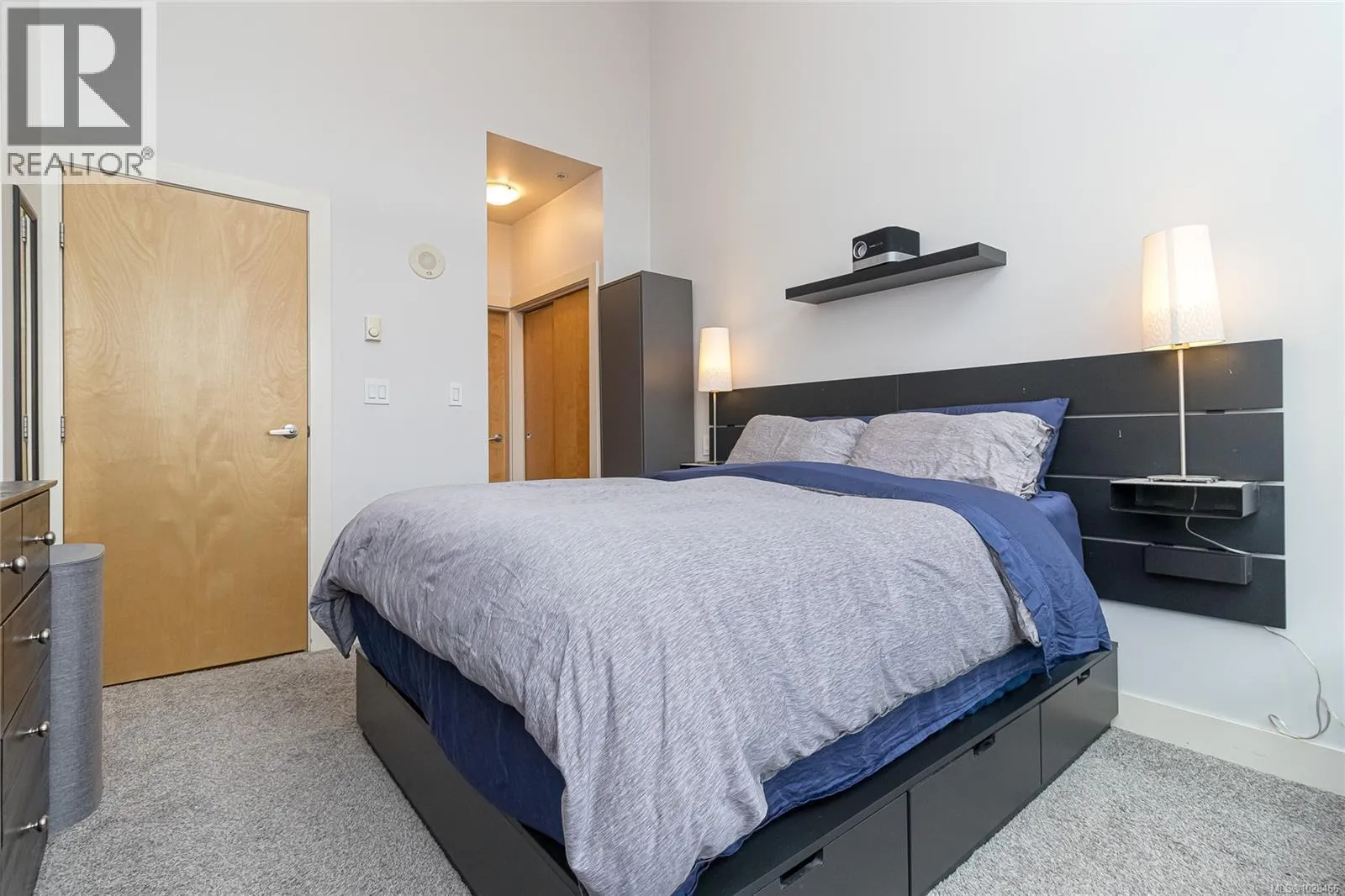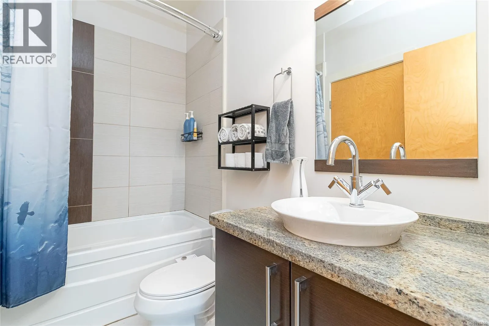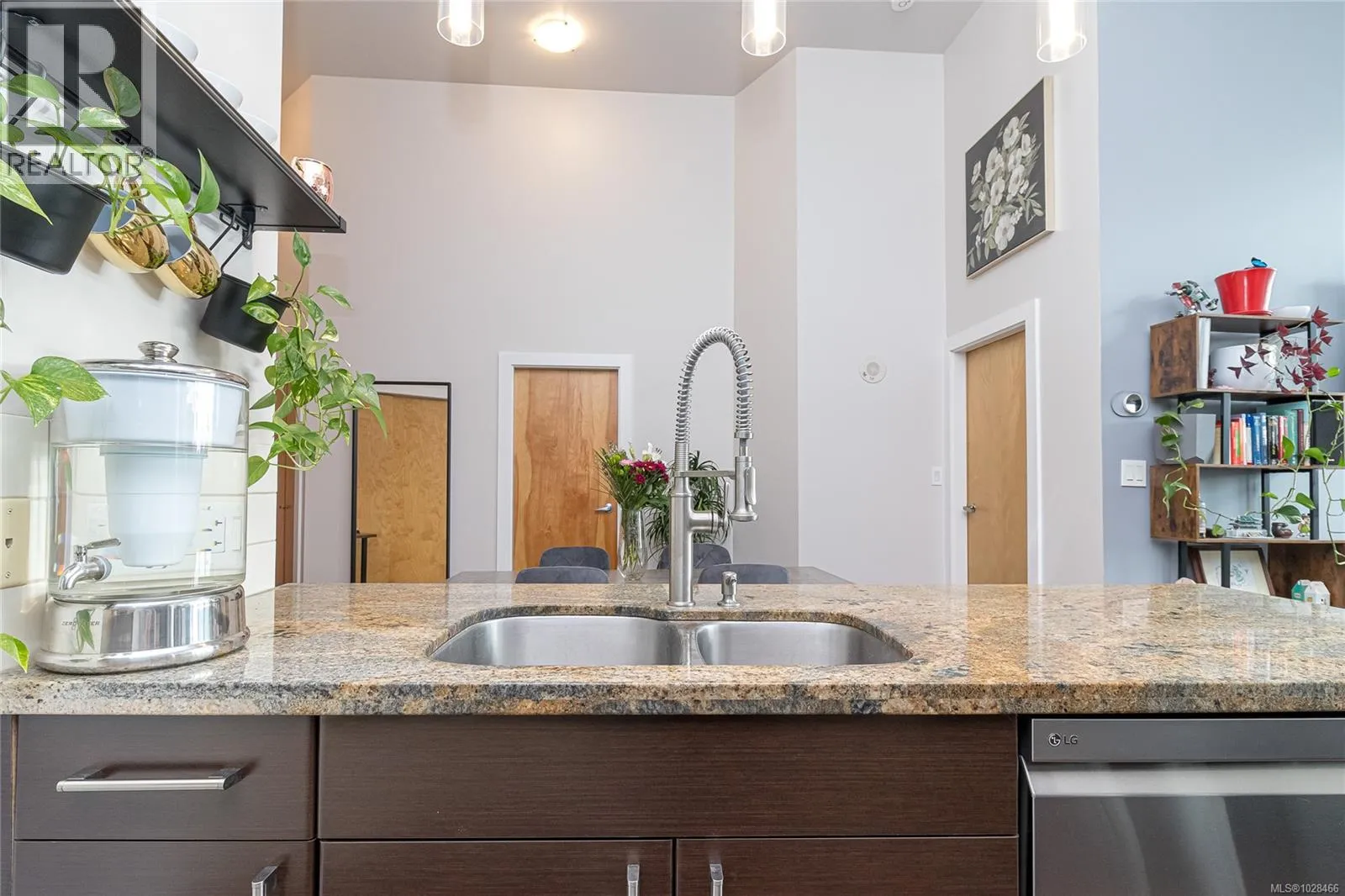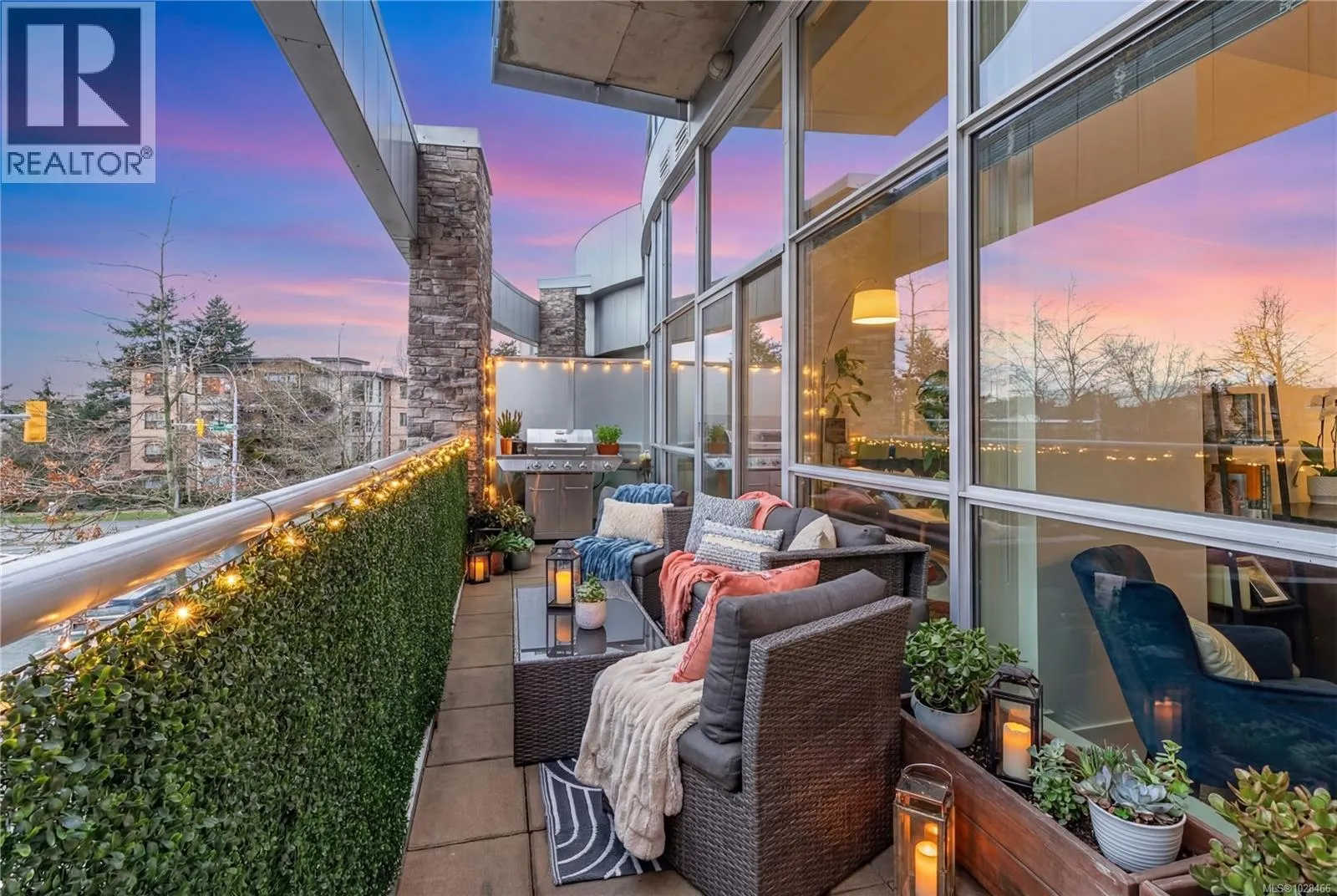 *Open House Sunday 22nd 1-3pm* Located in the sought-after Reflections building, this modern and spacious condo offers stylish living in the heart of Langford. From the moment you walk through the door, youâll be awed by the soaring 13'5'' ceilings and floor-to-ceiling windows that fill the home with natural light. The bright, open-concept layout features gleaming hardwood floors and a contemporary design. The kitchen is finished with granite countertops, tiled backsplash, stainless steel appliances, and sleek cabinetry, flowing seamlessly into the living area. Enjoy the large south-facing deck, perfect for entertaining, container gardening, or relaxing while taking in the sunset. The primary bedroom offers high ceilings, a walk-through closet, & ensuite. The second bedroom/den is ideal for a home office or guest room. Reflections is known for its striking curved architecture and amenities including a rooftop running track & outdoor pool. Just steps to Goldstream Village shops, cafes & restaurants. Come see it today! (id:27476)
