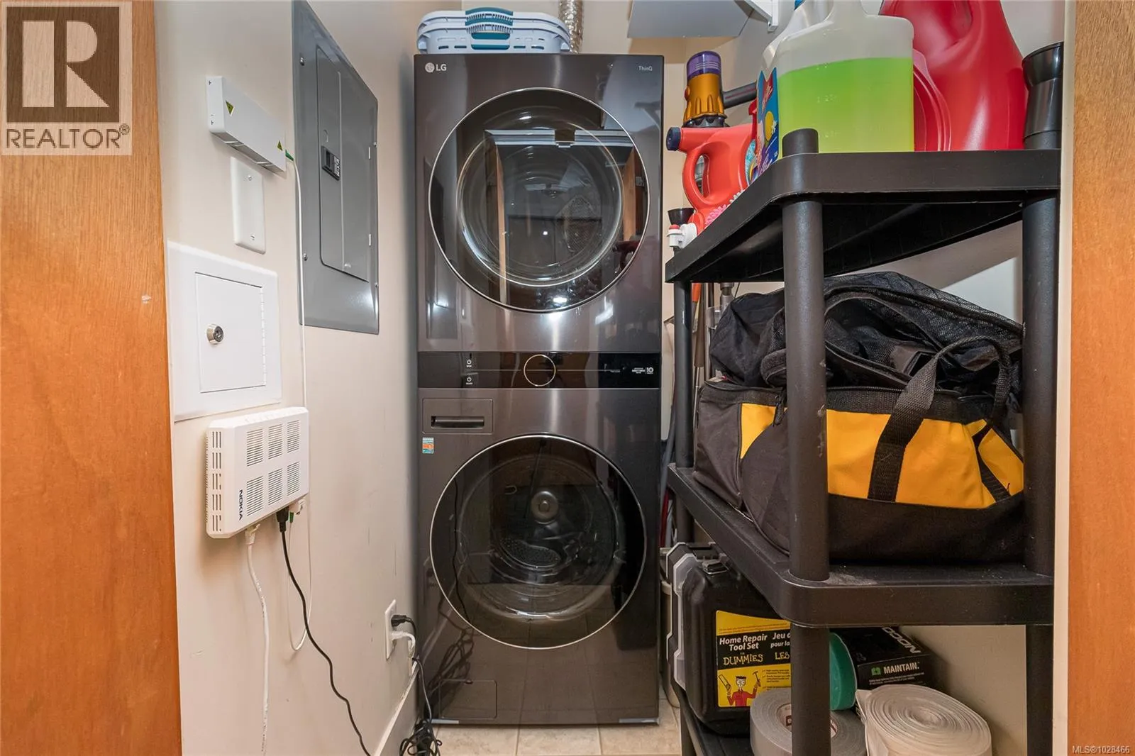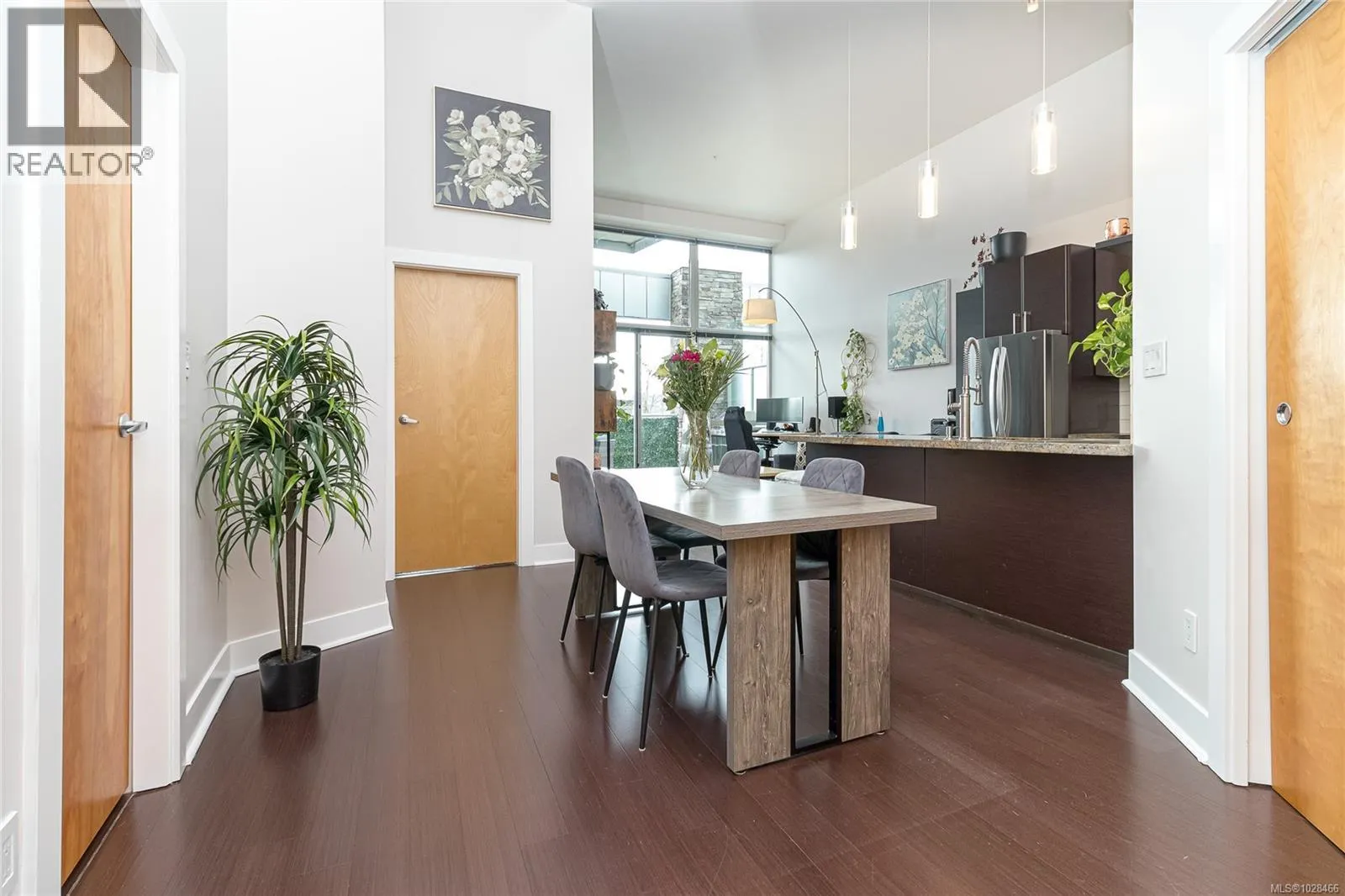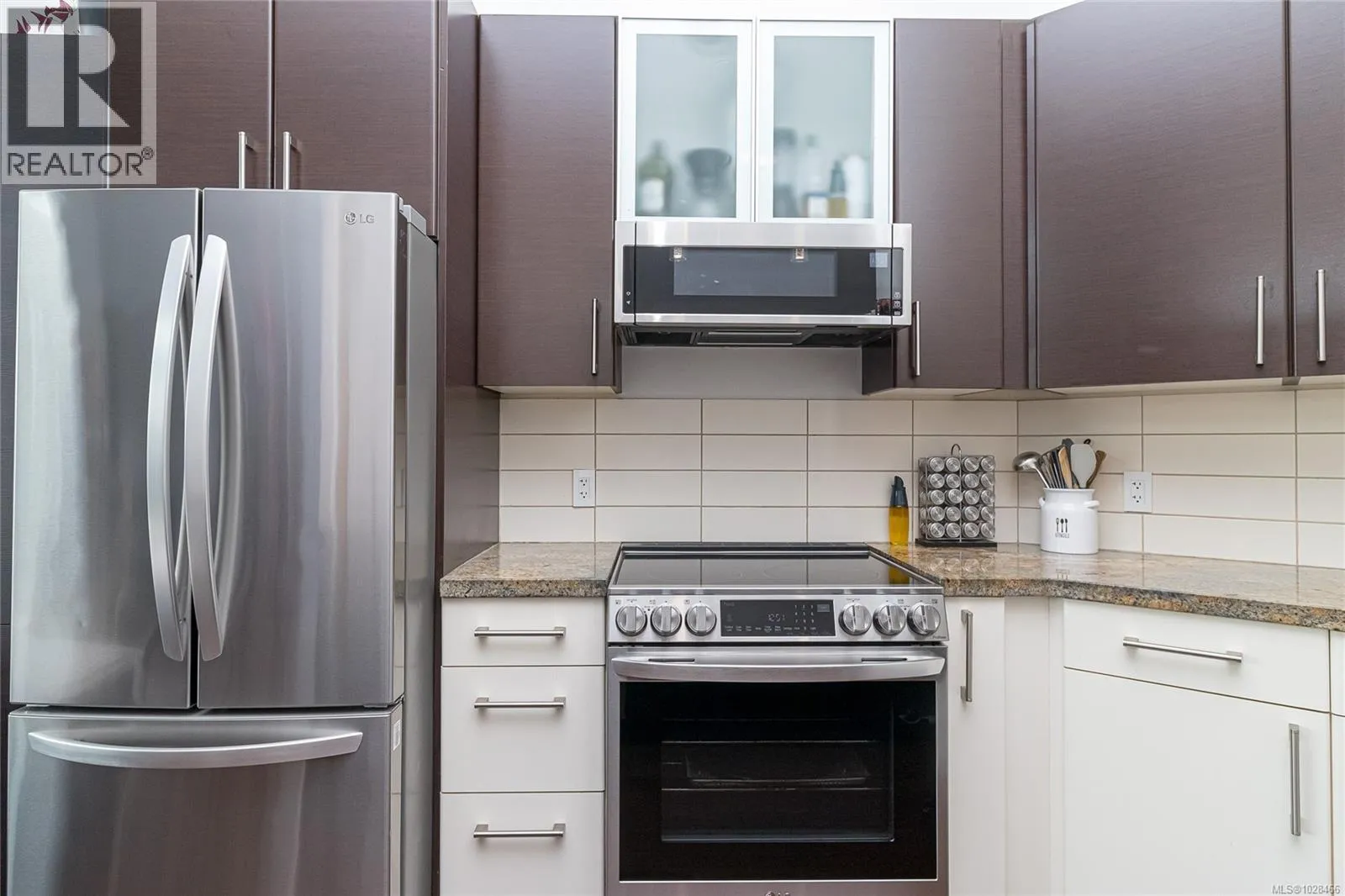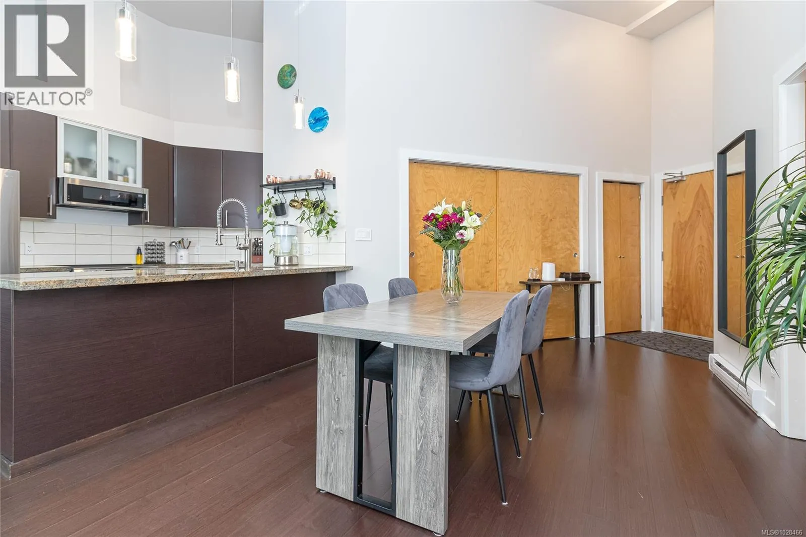 *Open House Sunday 22nd 1-3pm* Located in the sought-after Reflections building, this modern and spacious condo offers stylish living in the heart of Langford. From the moment you walk through the door, youâll be awed by the soaring 13'5'' ceilings and floor-to-ceiling windows that fill the home with natural light. The bright, open-concept layout features gleaming hardwood floors and a contemporary design. The kitchen is finished with granite countertops, tiled backsplash, stainless steel appliances, and sleek cabinetry, flowing seamlessly into the living area. Enjoy the large south-facing deck, perfect for entertaining, container gardening, or relaxing while taking in the sunset. The primary bedroom offers high ceilings, a walk-through closet, & ensuite. The second bedroom/den is ideal for a home office or guest room. Reflections is known for its striking curved architecture and amenities including a rooftop running track & outdoor pool. Just steps to Goldstream Village shops, cafes & restaurants. Come see it today! (id:27476)