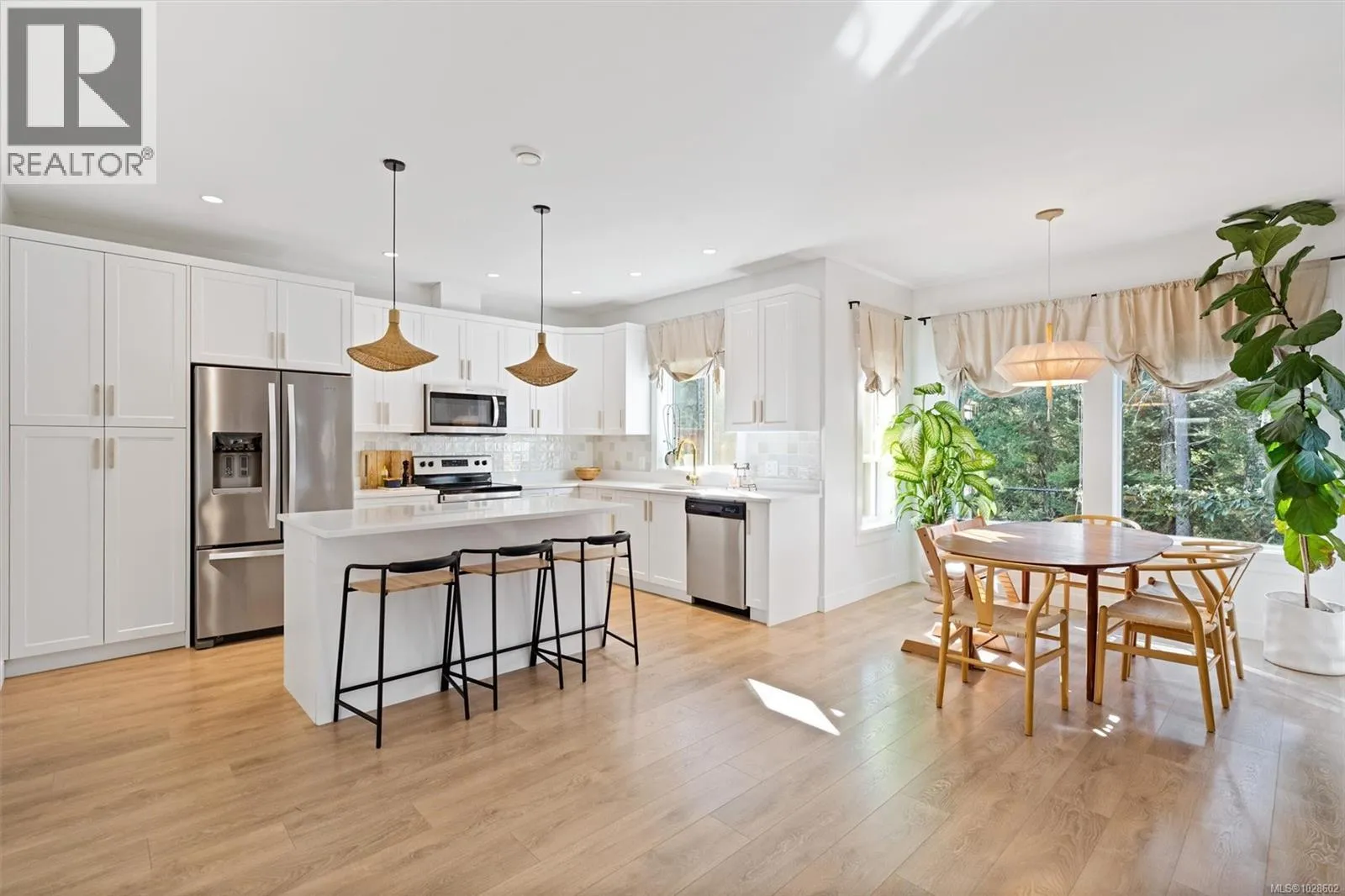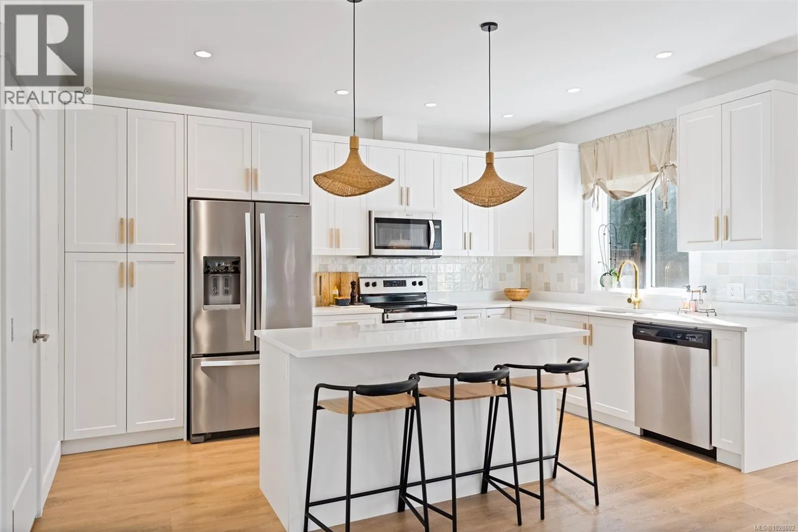 Tucked away on a quiet no-through cul-de-sac and backing onto serene forest, this stunning like-new home offers privacy and modern luxury. Thoughtfully updated, it features a ducted heat pump, professional full-home interior paint, seven designer lighting upgrades, and new matching laminate flooring upstairs. The chef-inspired kitchen boasts stainless steel appliances, quartz counters, a large island, walk-in pantry, soft-close cabinetry, and a solid brass faucet. The main home includes 4 bedrooms. Enjoy forest views from the dining area and relax in the living room with a gas fireplace and in-wall TV hookups. Step outside to a private yard with covered patio, gas BBQ hookup, and green space. Bonus legal 1-bedroom suite above the garage, with separate entrance and laundry. Hot water on demand, double garage, balance of 2-5-10 warranty, & NO GST. Just minutes to the golf course, beaches, walking trails & all Westshore amenities. (id:27476)