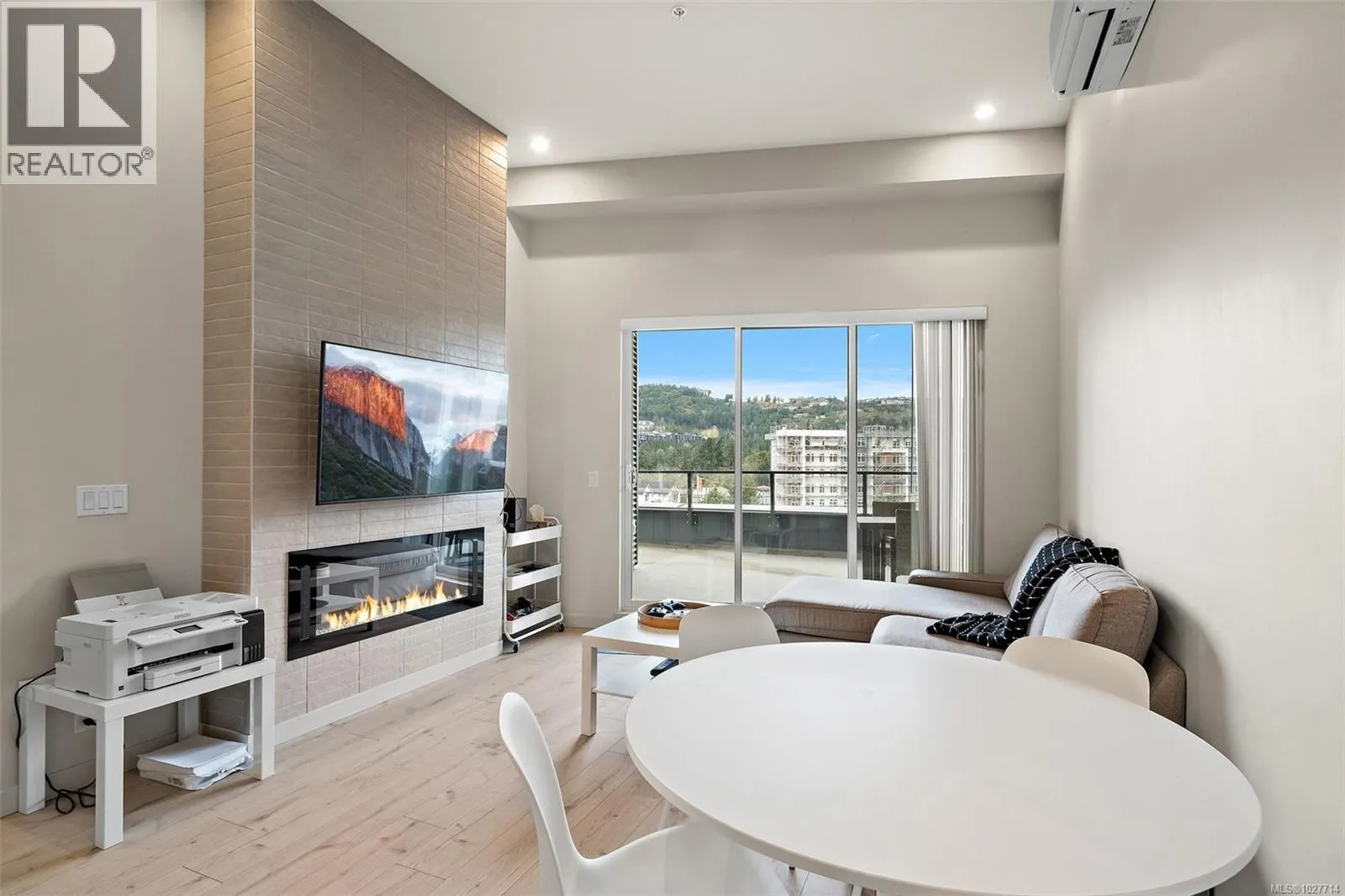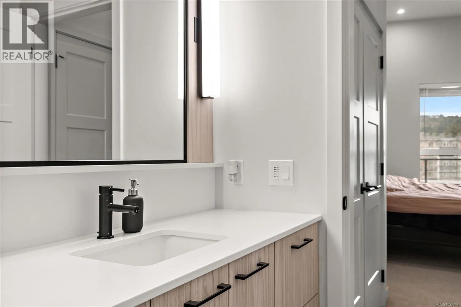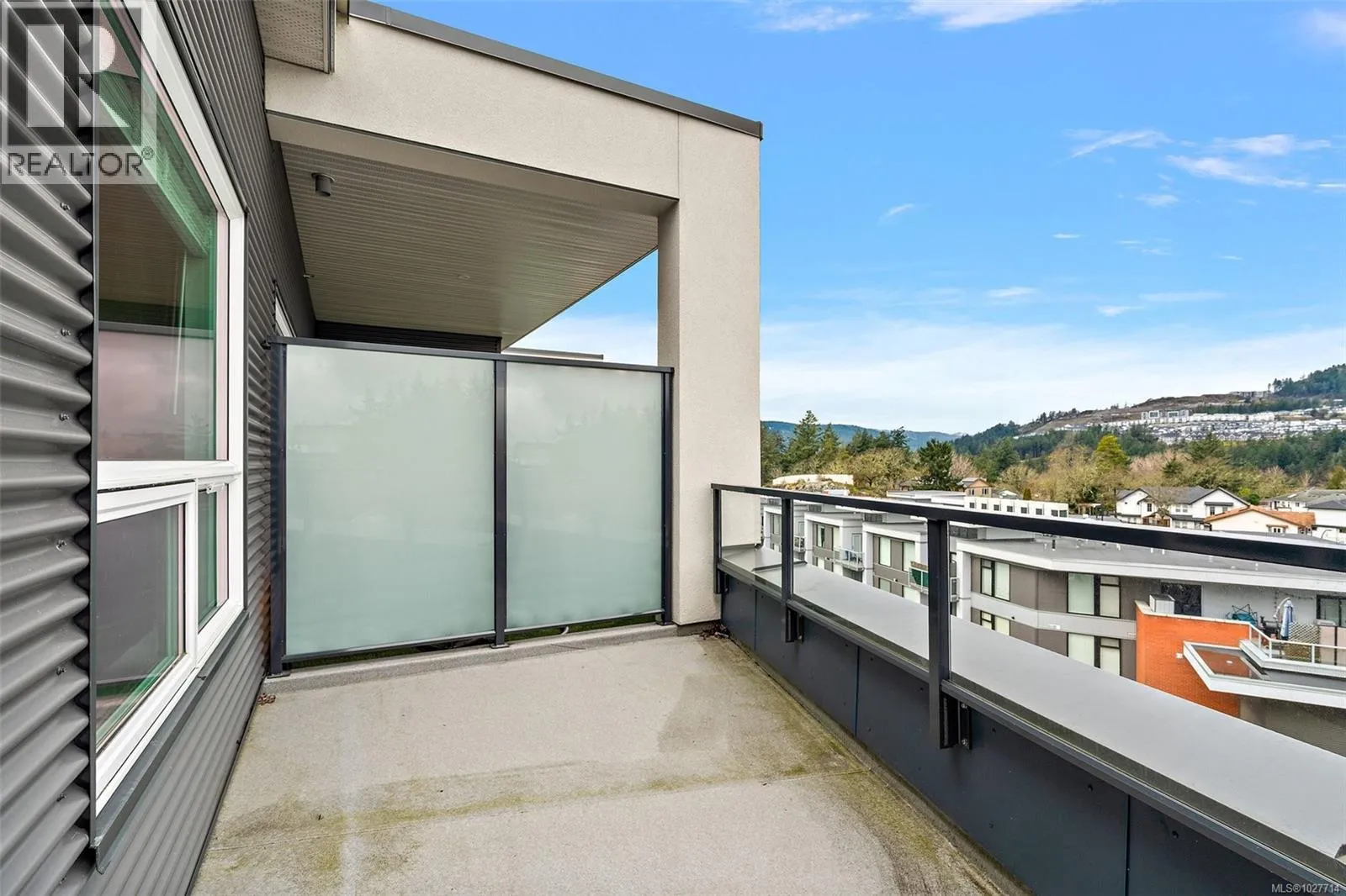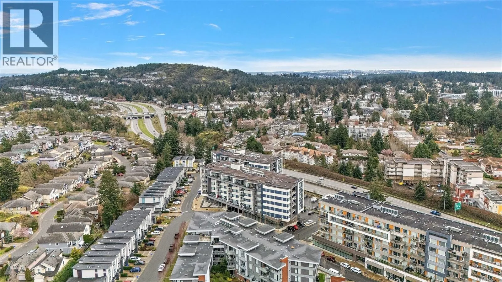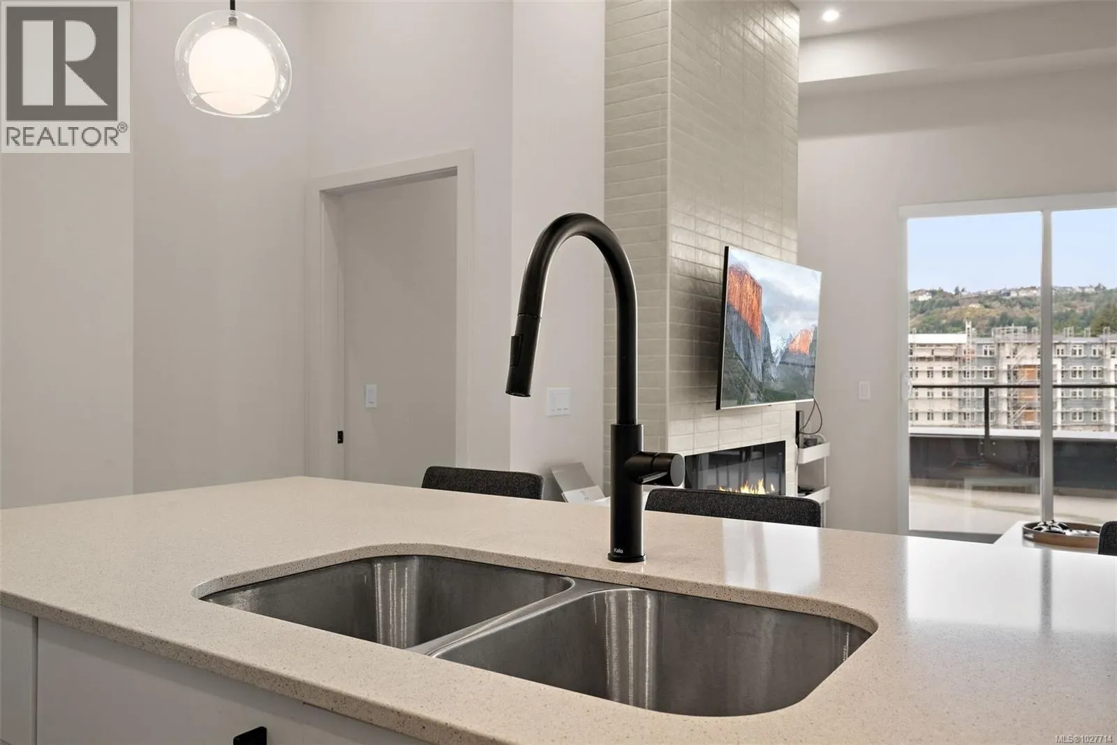 Top floor living with impressive views of Bear Mountain, this 2-bedroom, 2-bathroom condo in Triple Crown stands out for its space, finish and natural light. The open-concept layout features high ceilings, a modern kitchen with quartz counters, waterfall island and stainless appliances, and a spacious living area with a sleek fireplace. Large windows and sliding doors open to a massive covered balcony, offering true indoor-outdoor living and a rare amount of usable outdoor space. Bedrooms are thoughtfully separated, with the primary featuring a full ensuite. Heat pump for year-round comfort. Two parking stalls, storage locker, bike storage, gym and rooftop patio. Pet and rental friendly. A sharp, move-in ready condo with standout views and outdoor space. (id:27476)