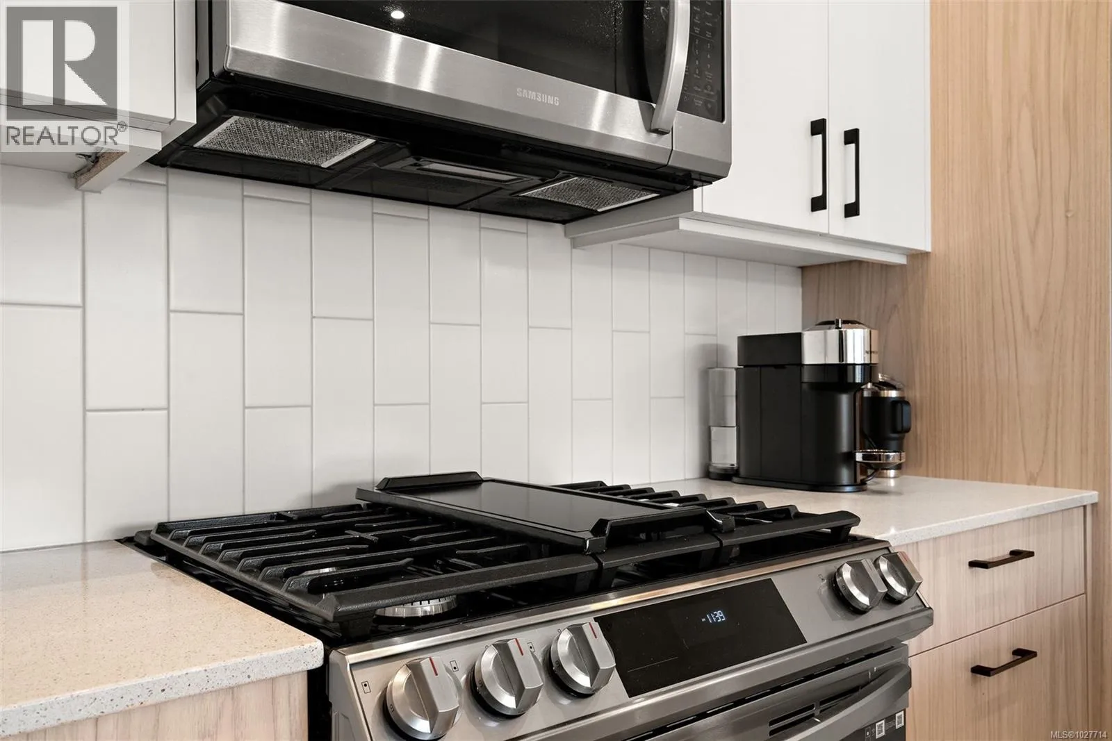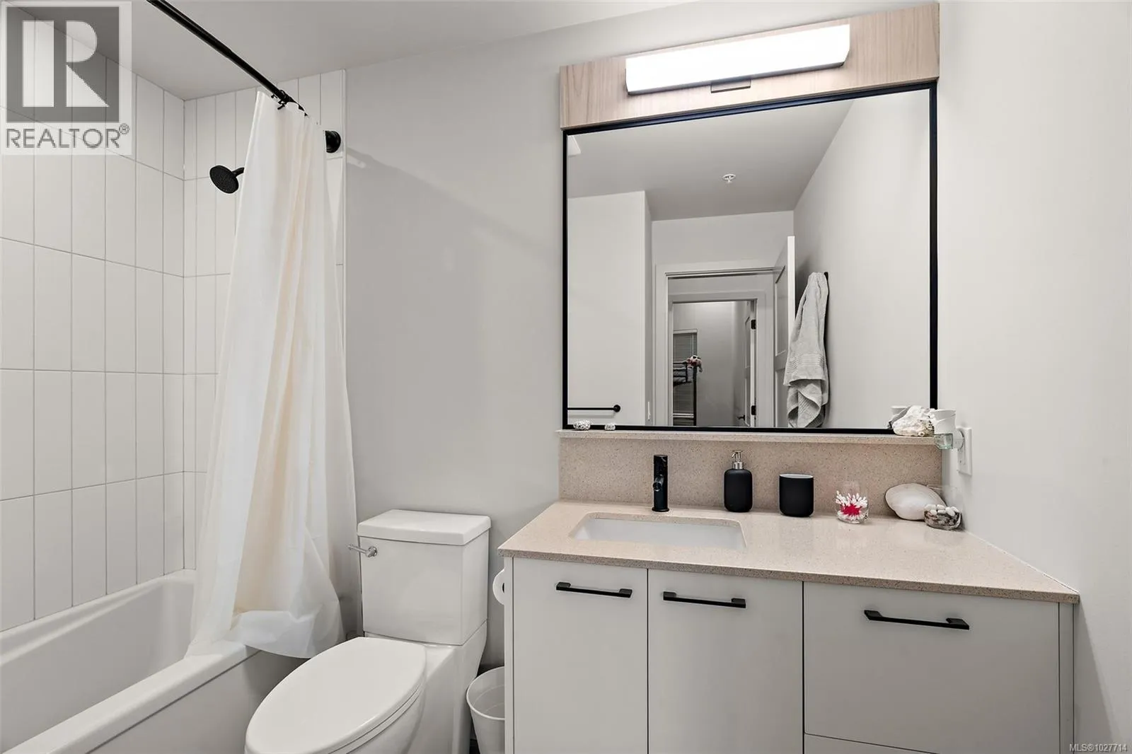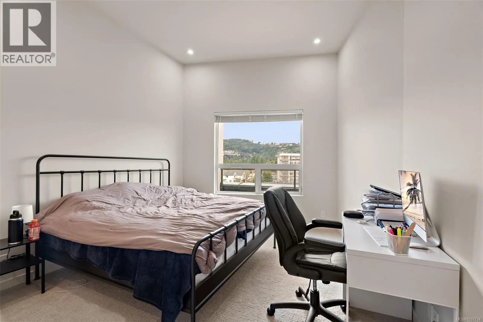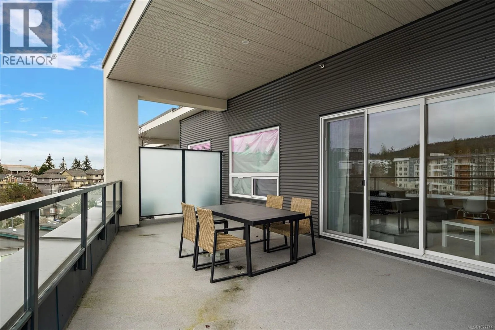 Top floor living with impressive views of Bear Mountain, this 2-bedroom, 2-bathroom condo in Triple Crown stands out for its space, finish and natural light. The open-concept layout features high ceilings, a modern kitchen with quartz counters, waterfall island and stainless appliances, and a spacious living area with a sleek fireplace. Large windows and sliding doors open to a massive covered balcony, offering true indoor-outdoor living and a rare amount of usable outdoor space. Bedrooms are thoughtfully separated, with the primary featuring a full ensuite. Heat pump for year-round comfort. Two parking stalls, storage locker, bike storage, gym and rooftop patio. Pet and rental friendly. A sharp, move-in ready condo with standout views and outdoor space. (id:27476)