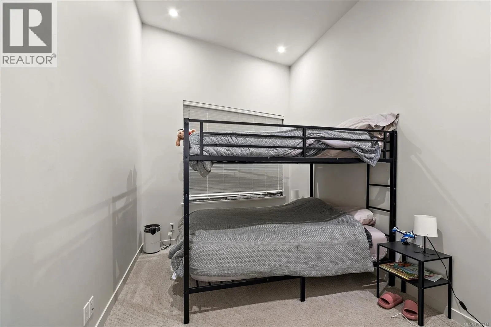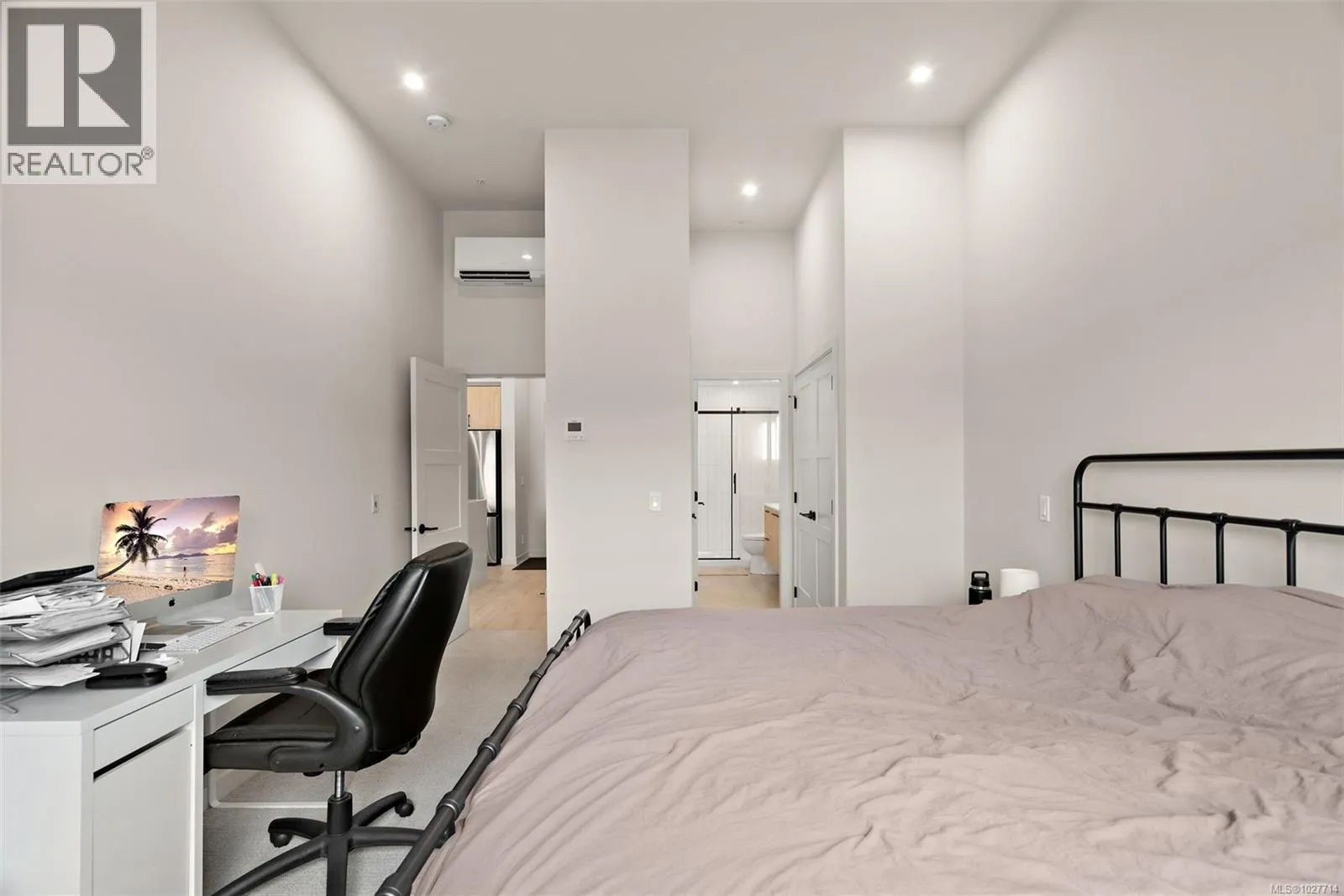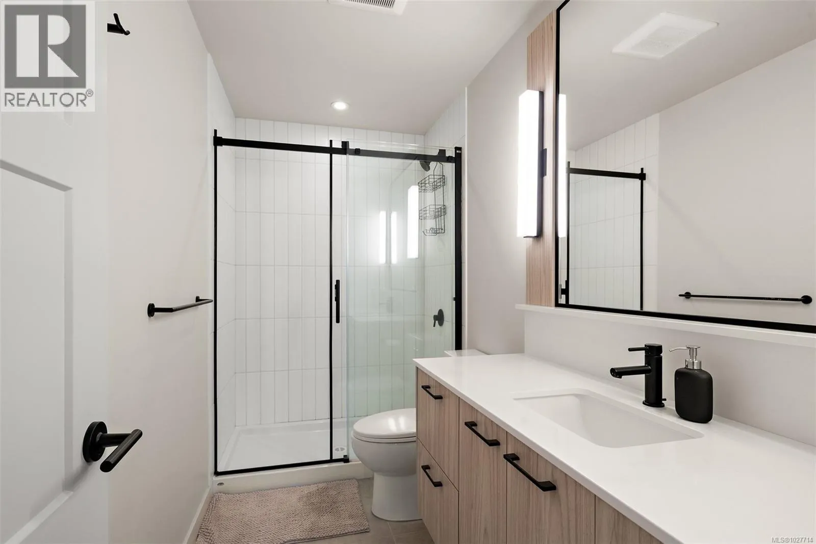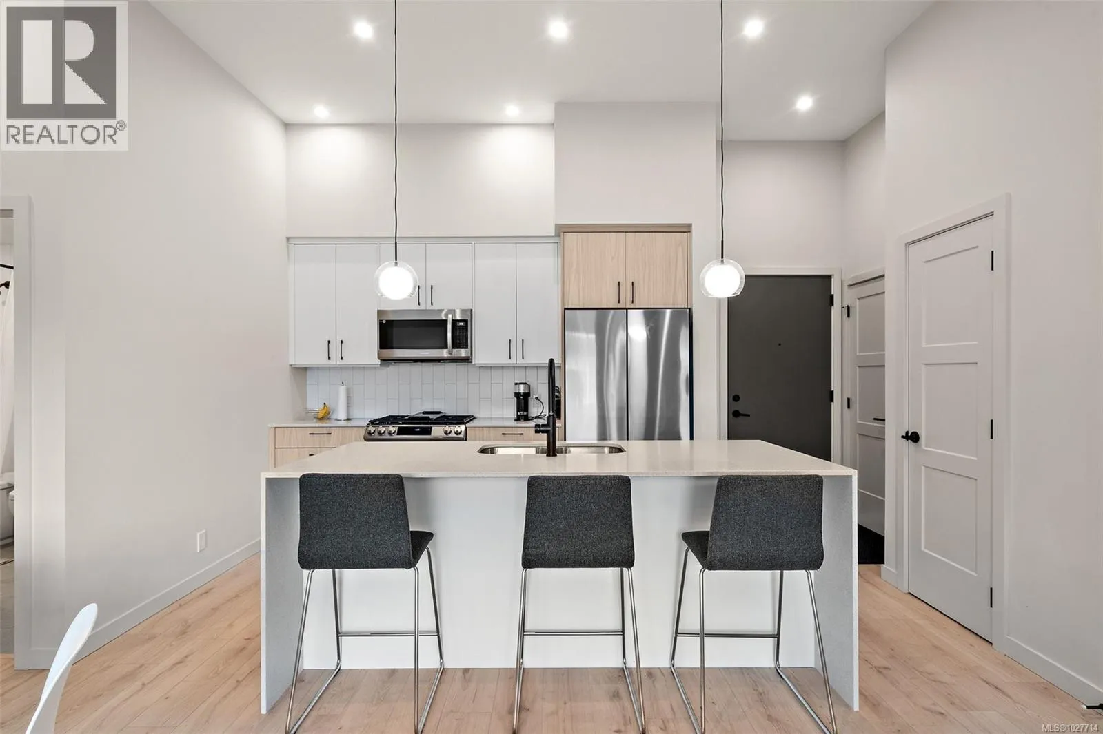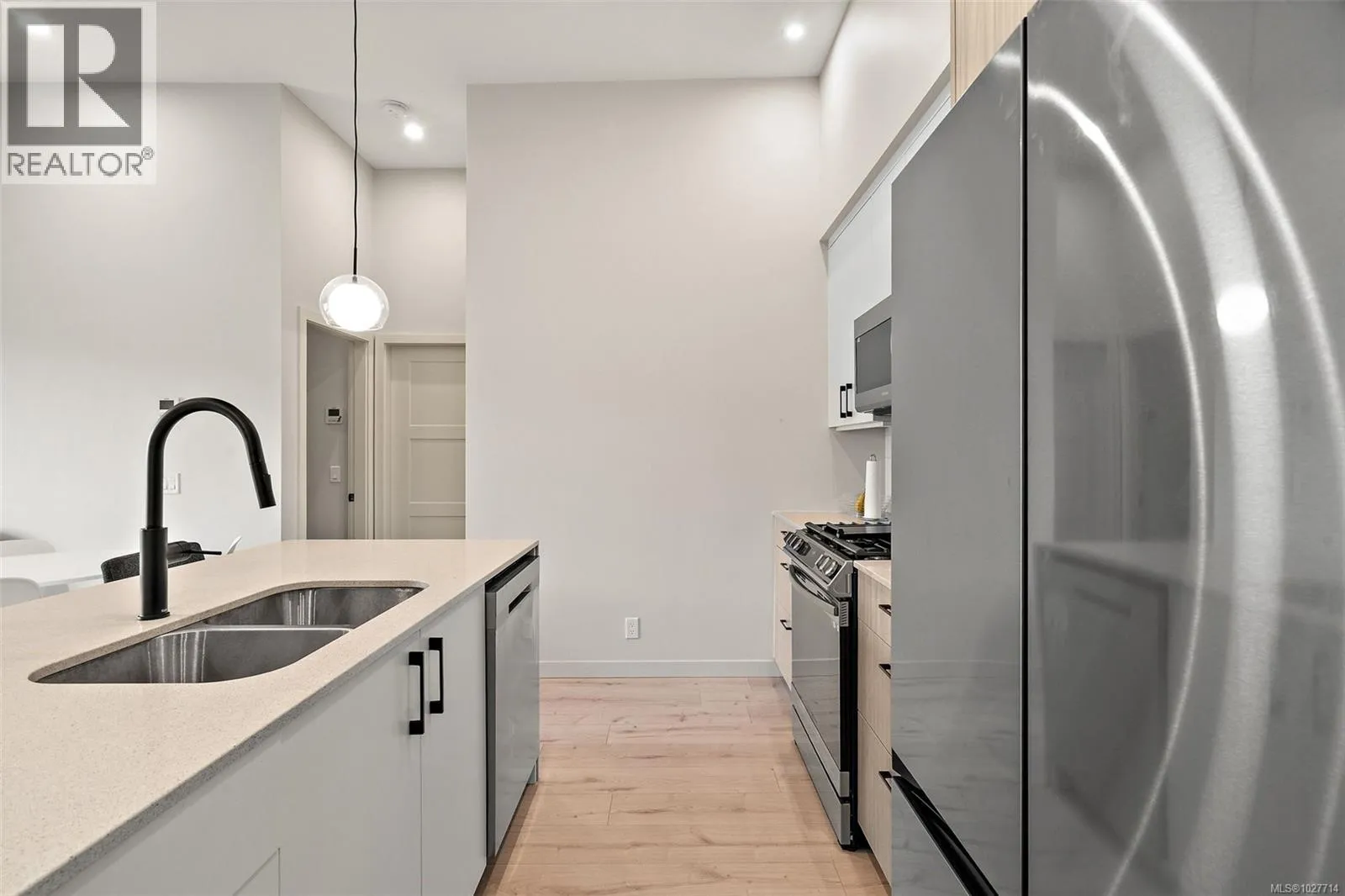 Top floor living with impressive views of Bear Mountain, this 2-bedroom, 2-bathroom condo in Triple Crown stands out for its space, finish and natural light. The open-concept layout features high ceilings, a modern kitchen with quartz counters, waterfall island and stainless appliances, and a spacious living area with a sleek fireplace. Large windows and sliding doors open to a massive covered balcony, offering true indoor-outdoor living and a rare amount of usable outdoor space. Bedrooms are thoughtfully separated, with the primary featuring a full ensuite. Heat pump for year-round comfort. Two parking stalls, storage locker, bike storage, gym and rooftop patio. Pet and rental friendly. A sharp, move-in ready condo with standout views and outdoor space. (id:27476)