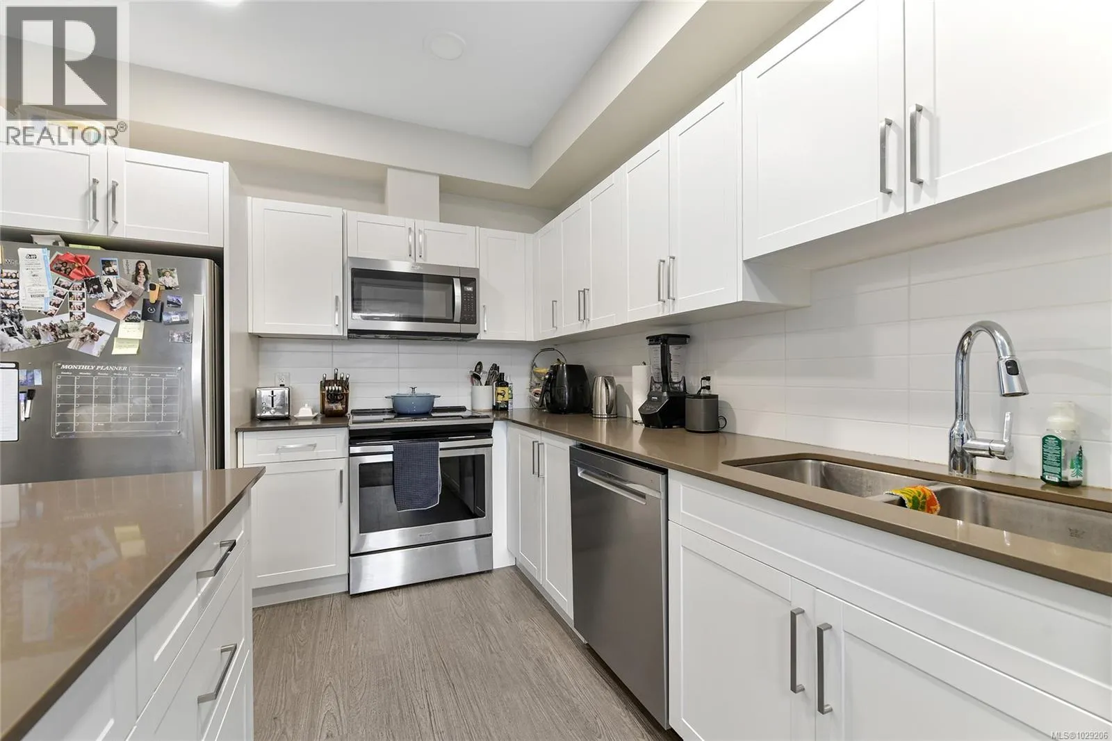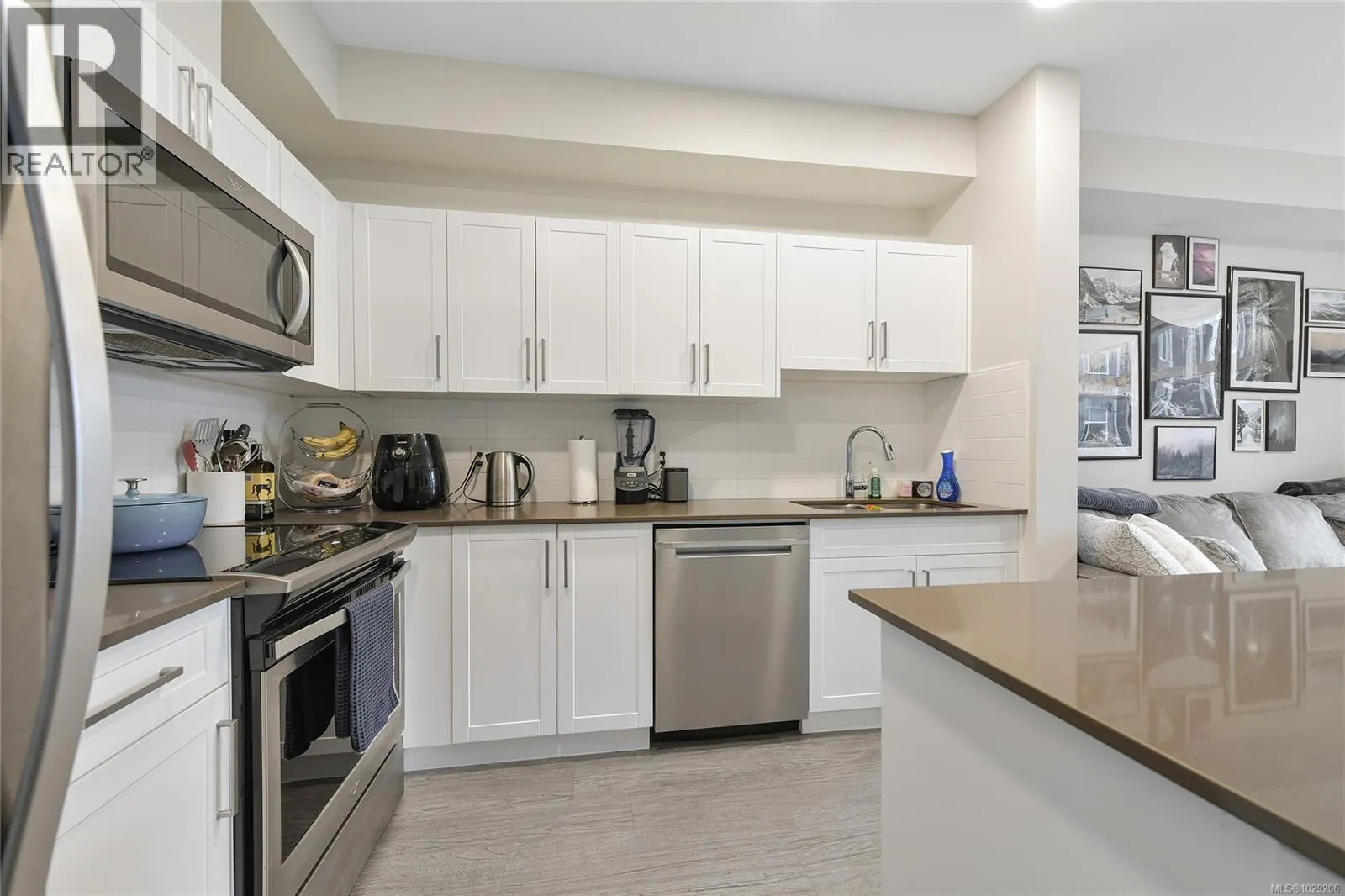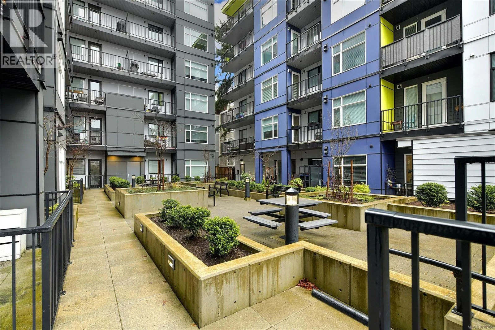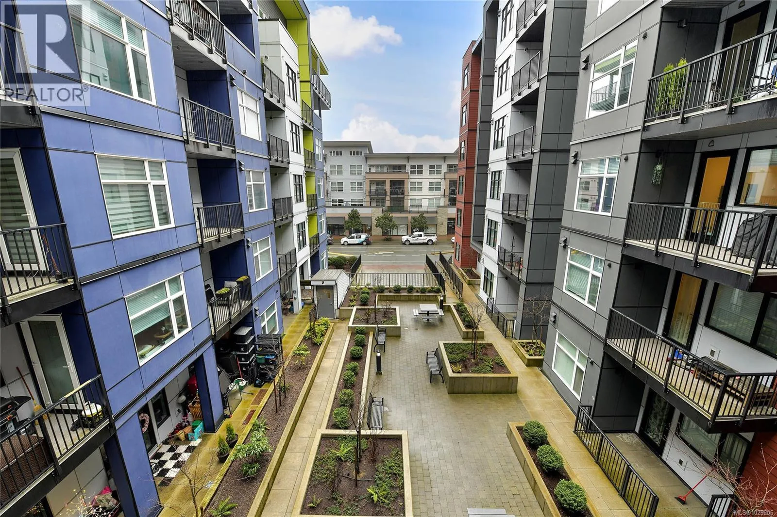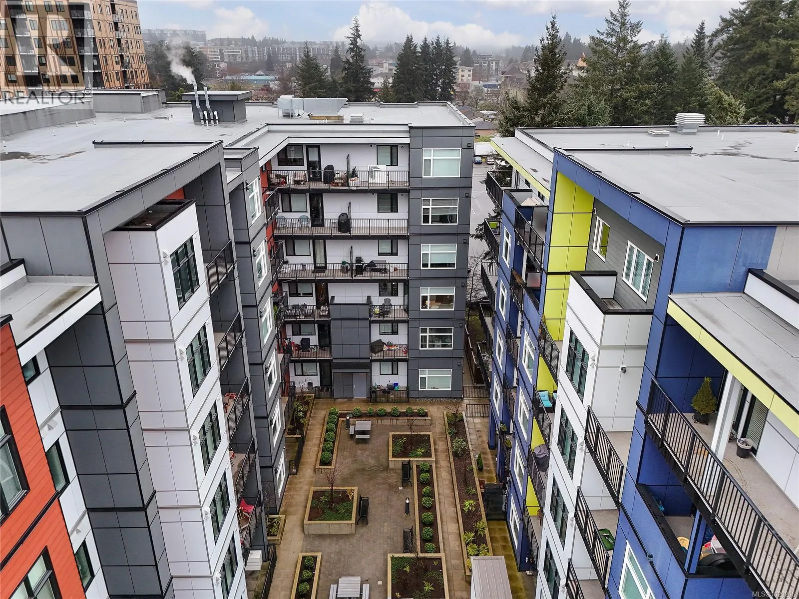 CORNER UNIT OVERLOOKING THE COURTYARD! Welcome to this tastefully designed condo with a functional floor plan. This bright unit features sleek stainless steel appliances, large kitchen island with built-in storage plus plenty of counter space for convenience when cooking, hosting, and everyday use, while the open-concept layout flows seamlessly into the living area for easy entertaining or relaxing at home. The unit is equipped with a 4-piece bathroom including a tub-shower combination and in-suite washer and dryer. Step outside to your spacious covered deck, perfect for year-round enjoyment. The Langford Tower building is conveniently located in the City of Langford close to everything the Westshore lifestyle has to offer including shops, dining, the Galloping Goose Trail, transit, hikes, activities and all major amenities! Book your appointment now! (id:27476)