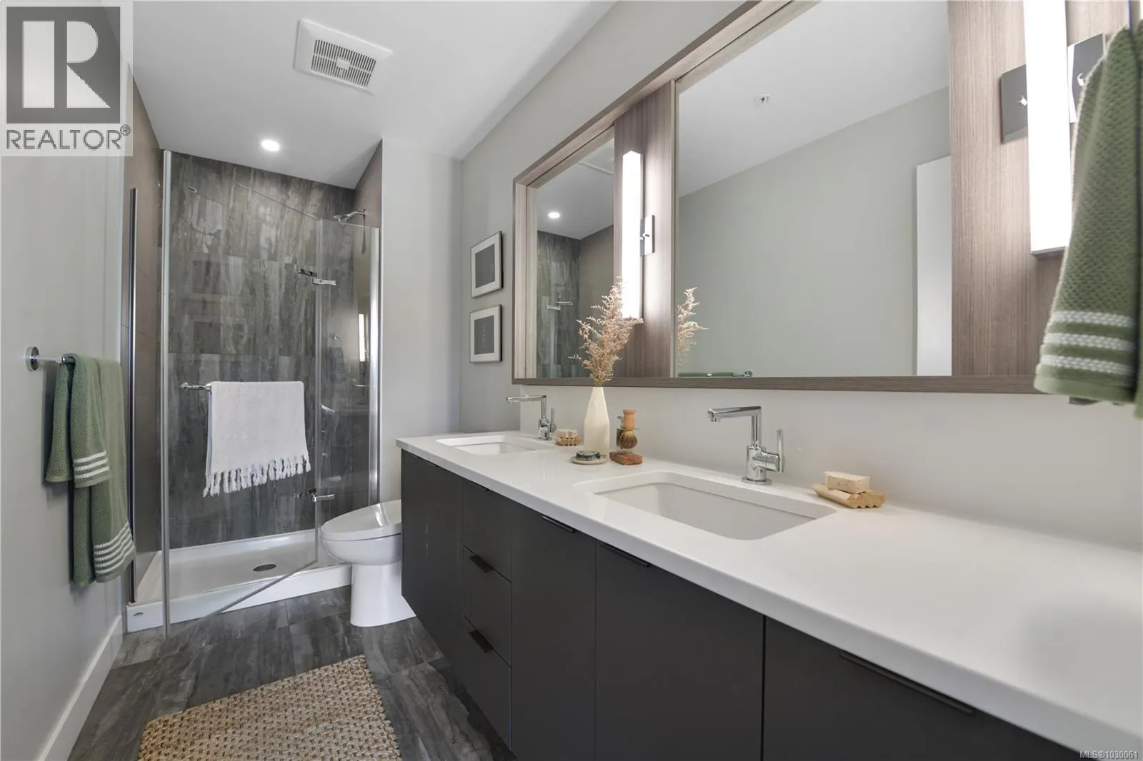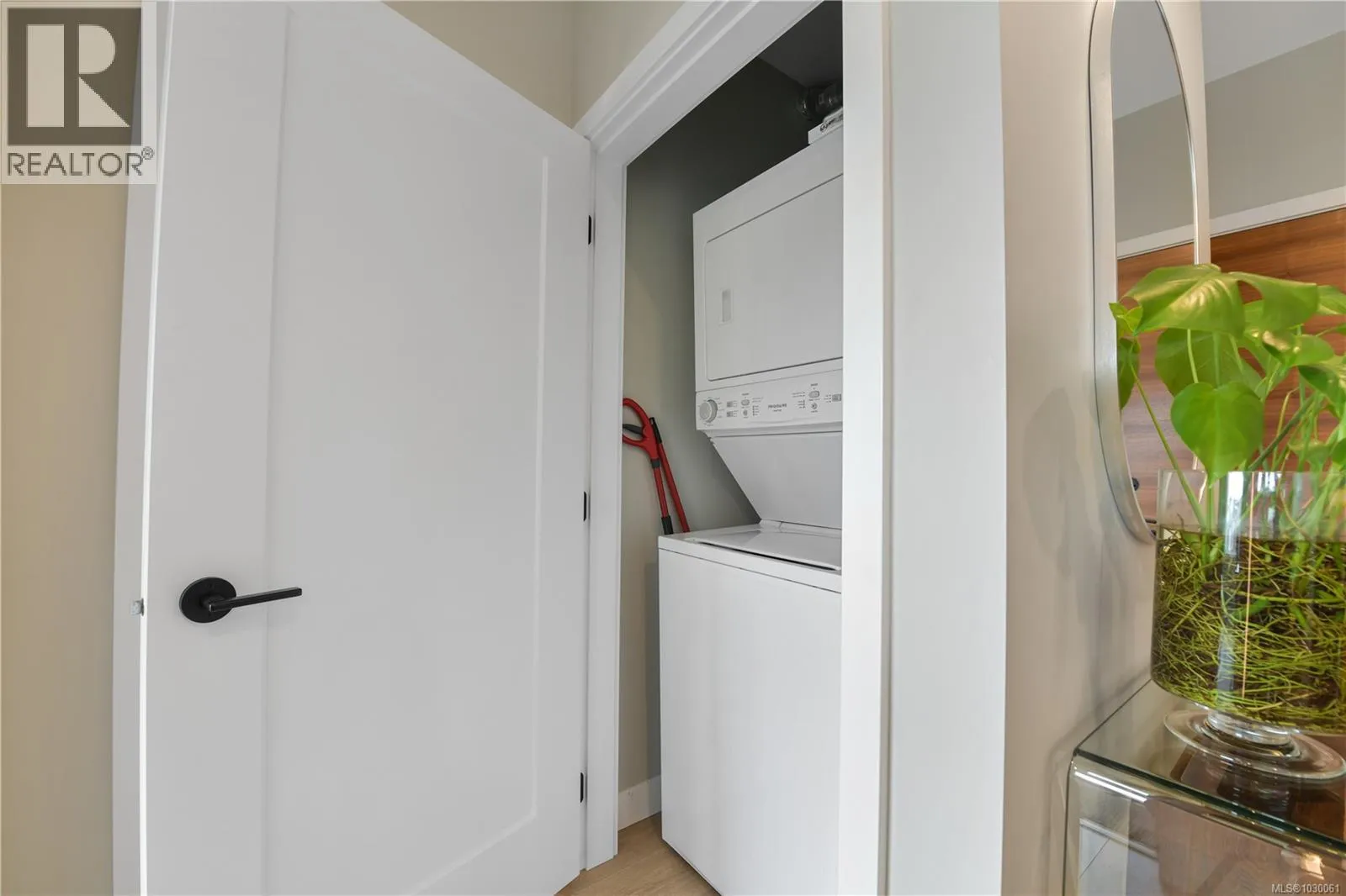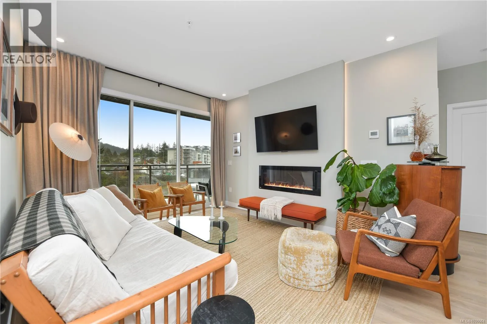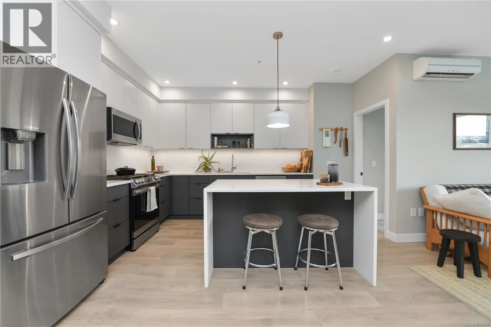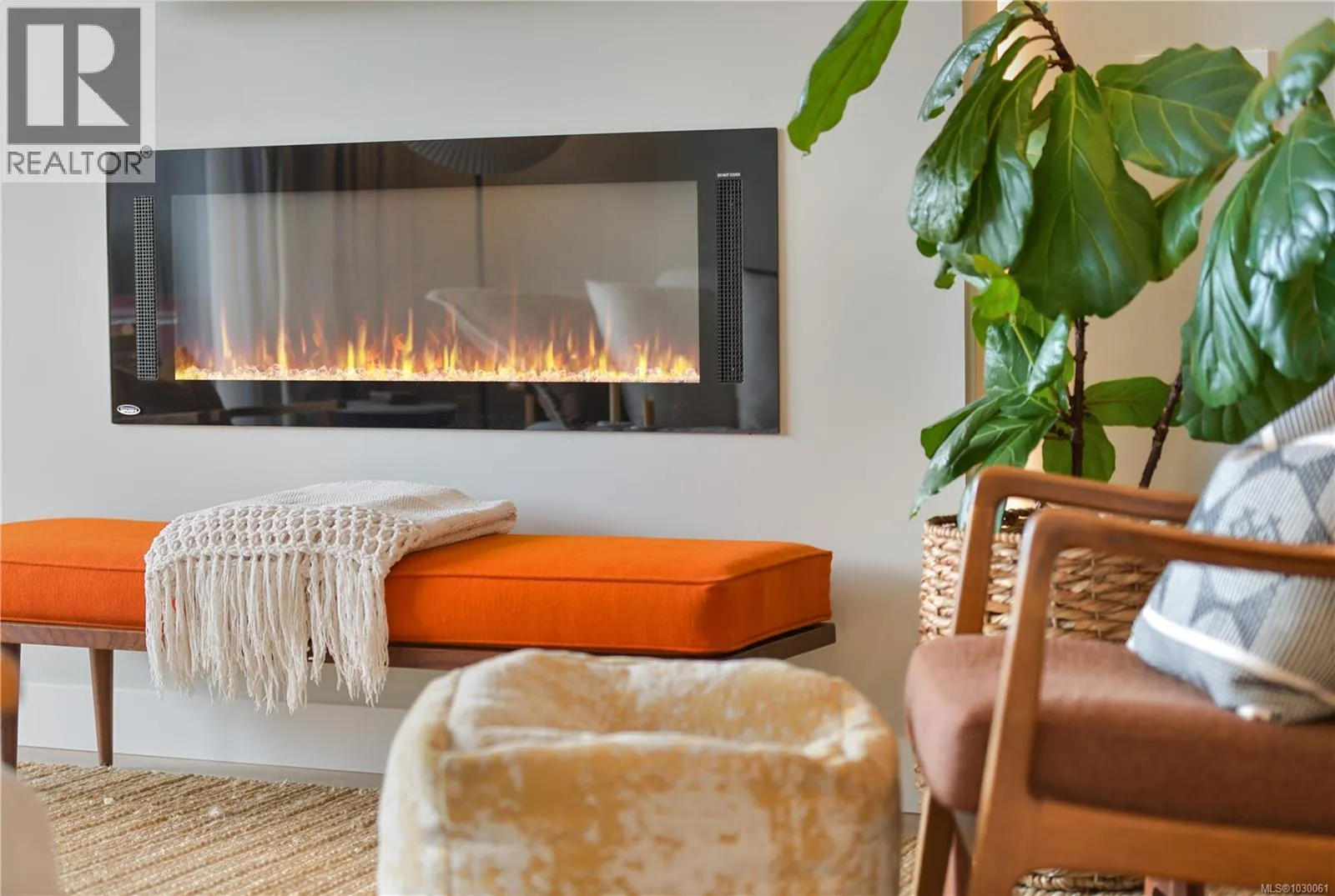 Welcome to this bright and beautifully appointed 2-bedroom, 2-bathroom condo on the quiet side of the building in the vibrant Florence Lake neighbourhood of Langford. This modern home offers an open-concept layout filled with natural light and lovely views. The chef-inspired kitchen features quartz countertops, stylish 2-toned cabinetry, and a premium appliance package including a gas range. A striking back-lit fireplace creates a warm focal point in the living area, while the large covered balcony offers excellent privacy with no direct units looking in. Enjoy year-round comfort with 3 ductless heat pumps, hot water on demand, laminate flooring, ceramic tile in the bathrooms, custom blinds, and in-suite laundry. This well-managed strata allows 2 pets and offers secure underground parking, a separate storage locker, bike storage, and a fitness center. Ideally located close to shopping, parks, trails, schools, and everyday amenities. (id:27476)