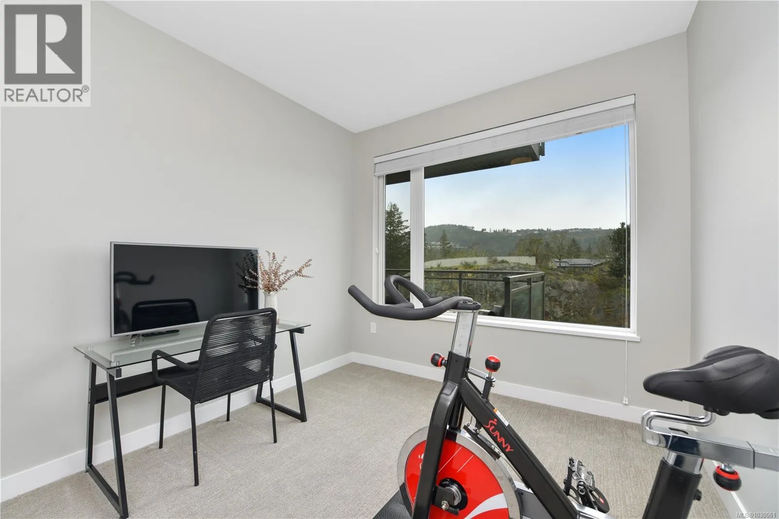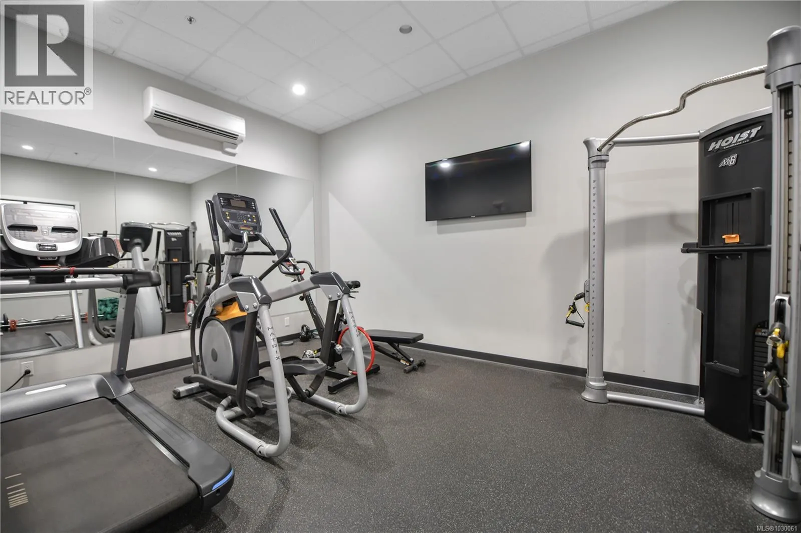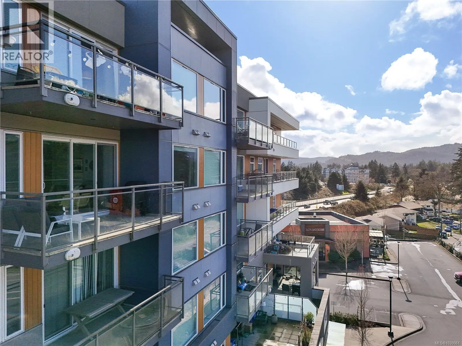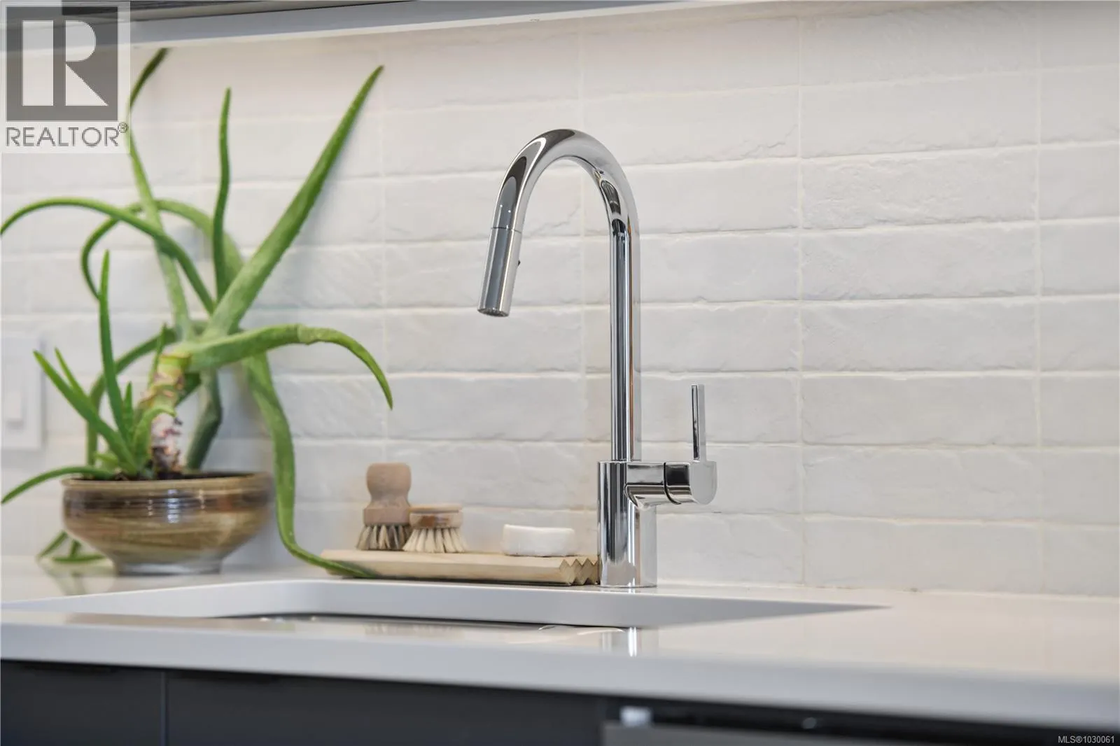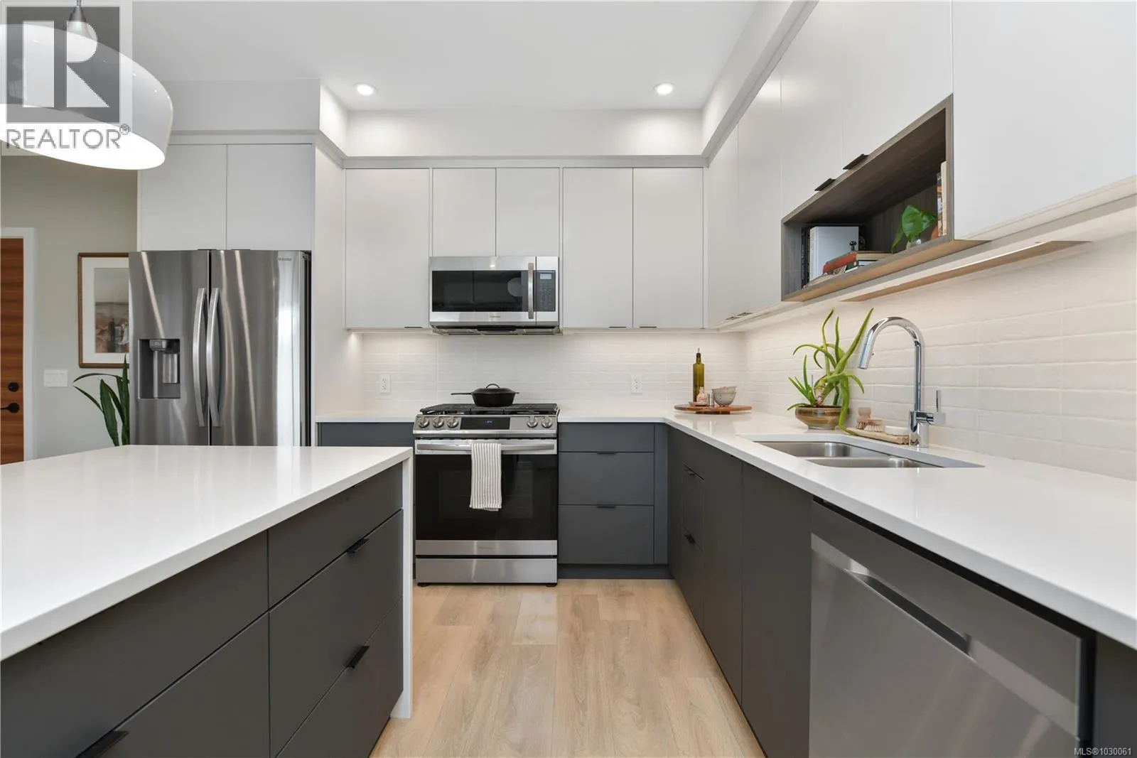 Welcome to this bright and beautifully appointed 2-bedroom, 2-bathroom condo on the quiet side of the building in the vibrant Florence Lake neighbourhood of Langford. This modern home offers an open-concept layout filled with natural light and lovely views. The chef-inspired kitchen features quartz countertops, stylish 2-toned cabinetry, and a premium appliance package including a gas range. A striking back-lit fireplace creates a warm focal point in the living area, while the large covered balcony offers excellent privacy with no direct units looking in. Enjoy year-round comfort with 3 ductless heat pumps, hot water on demand, laminate flooring, ceramic tile in the bathrooms, custom blinds, and in-suite laundry. This well-managed strata allows 2 pets and offers secure underground parking, a separate storage locker, bike storage, and a fitness center. Ideally located close to shopping, parks, trails, schools, and everyday amenities. (id:27476)