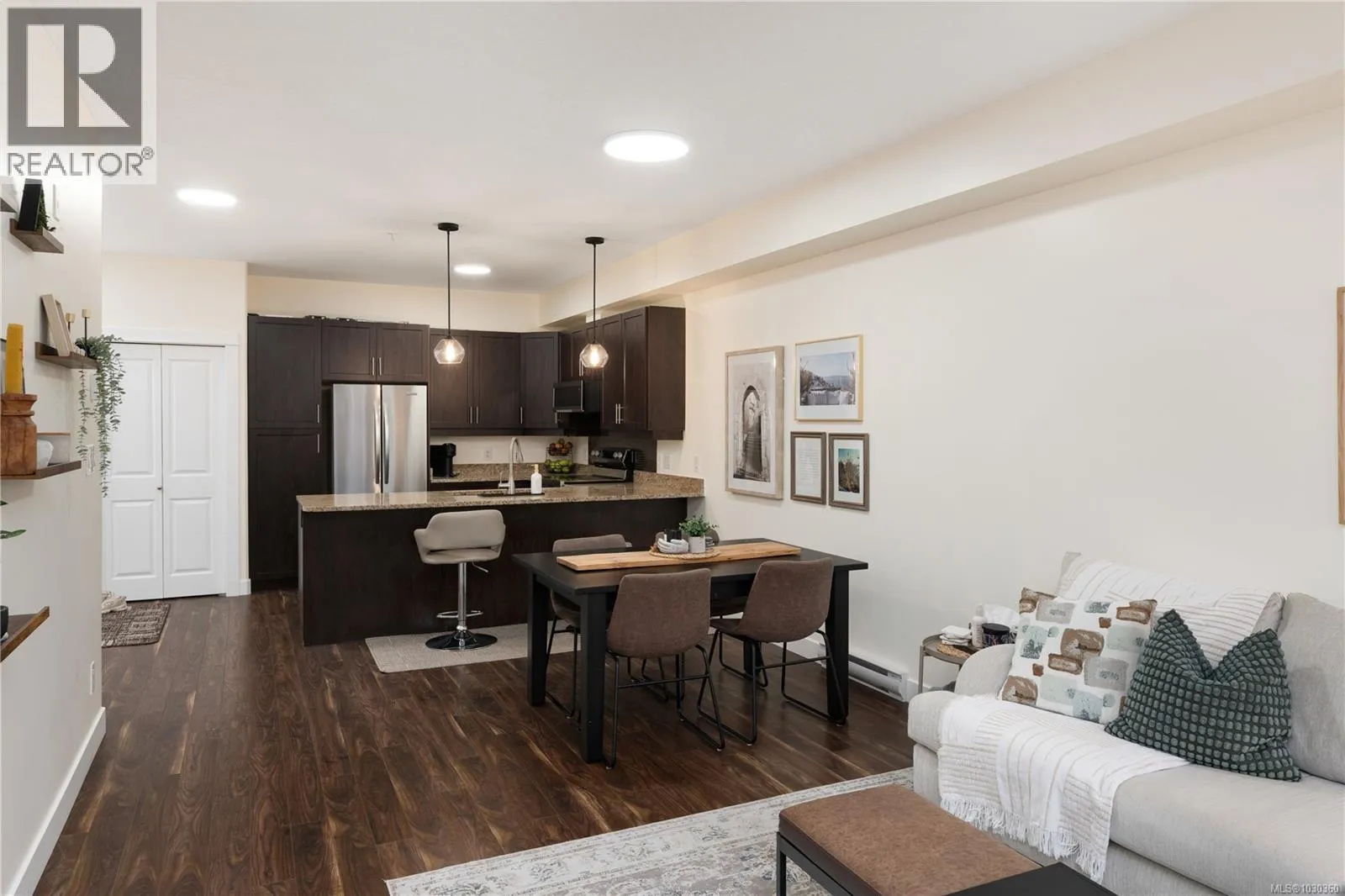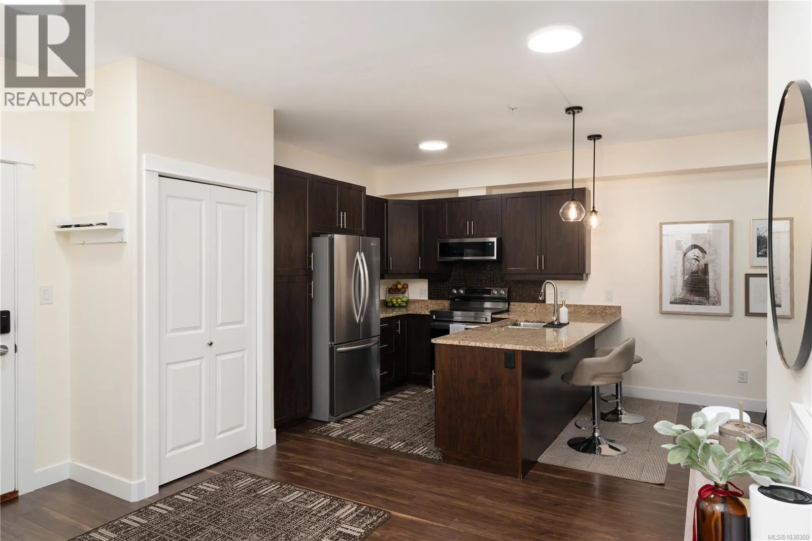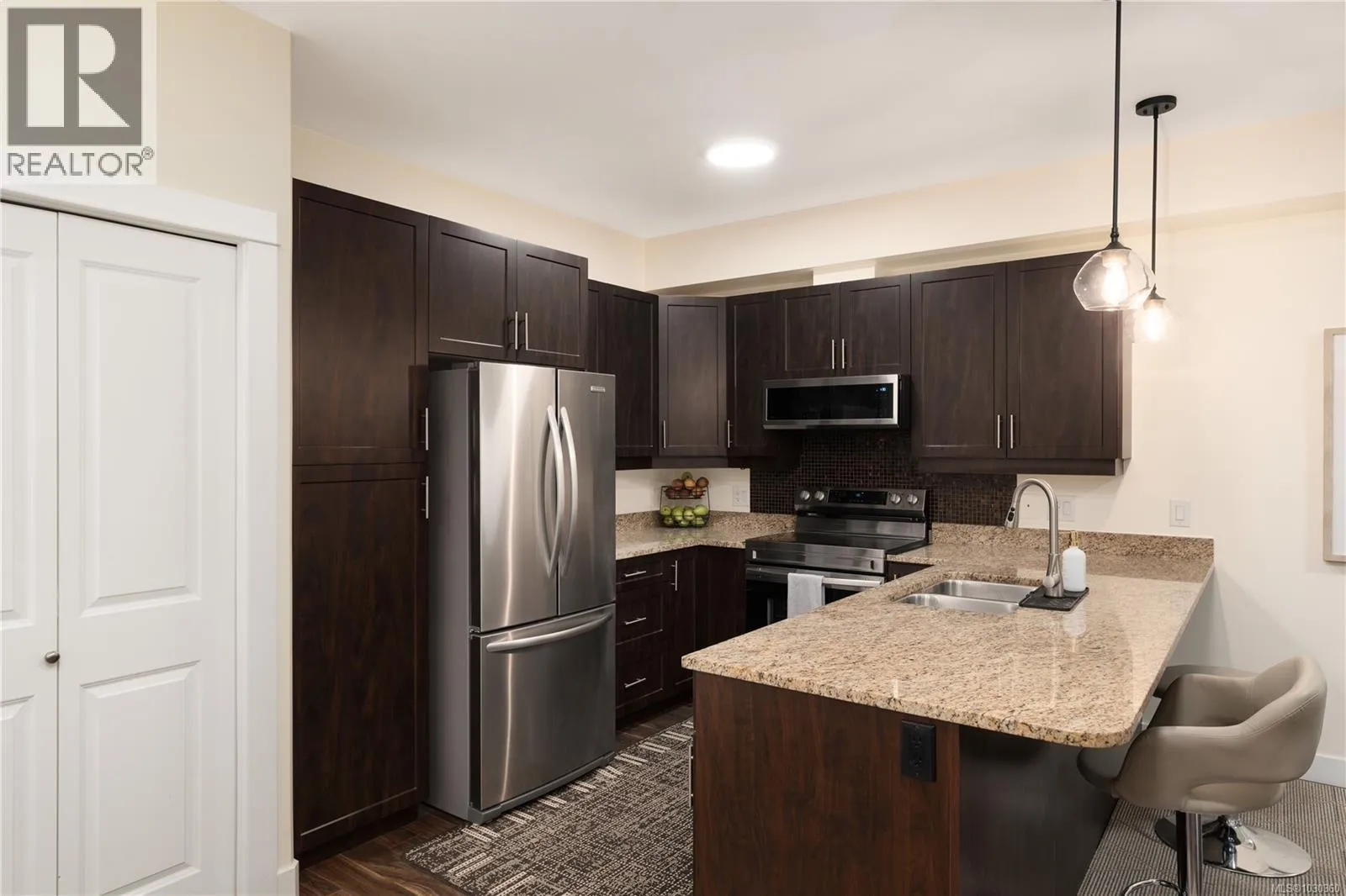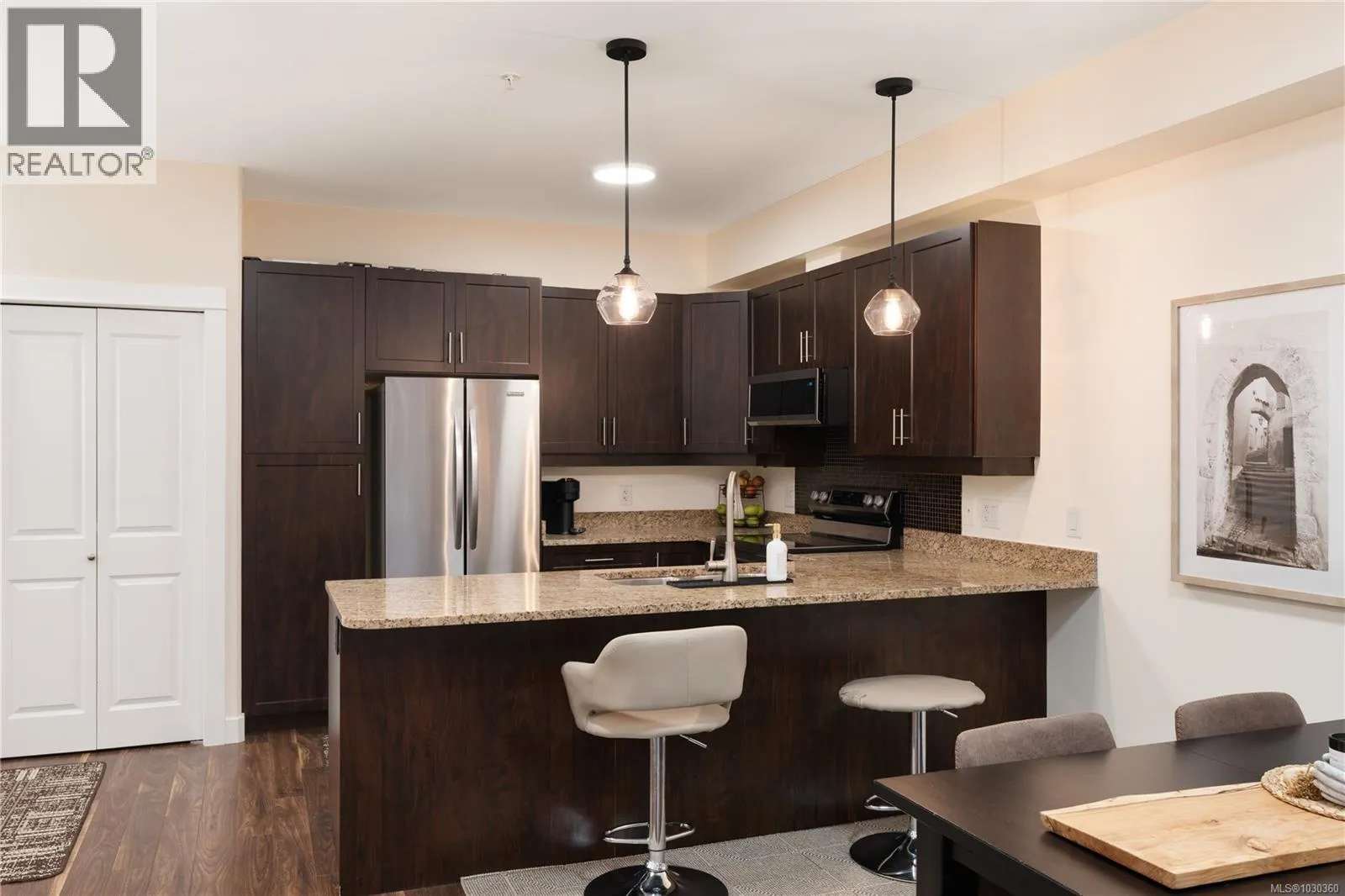 Offering over 1,000sf, 2 bedrooms, 2 full bathrooms, 2 secure underground parking stalls, allows big dogs, and incredible natural light throughout, itâs one of the most desirable floor plans in the building and sits on the quiet, private side. The moment you walk in, the spacious layout is immediately apparent. The open-concept living and kitchen combo is warm, inviting & perfect for both cozy nights in or entertaining friends and family. Enjoy a beautiful interior featuring fresh paint, stone countertops, stunning floors, updated appliances, and a covered patio for year-round outdoor living. The generous primary bedroom includes a walk-through closet and a full 4-piece ensuite with a tub. A separate storage locker adds even more convenience to this already complete package. Located just moments from Langford and Glen Lake, Belmont Shopping Centre, the YMCA, bowling, ice rinks, soccer fields, trails & so much more â this is a standout unit that checks every single box! (id:27476)
