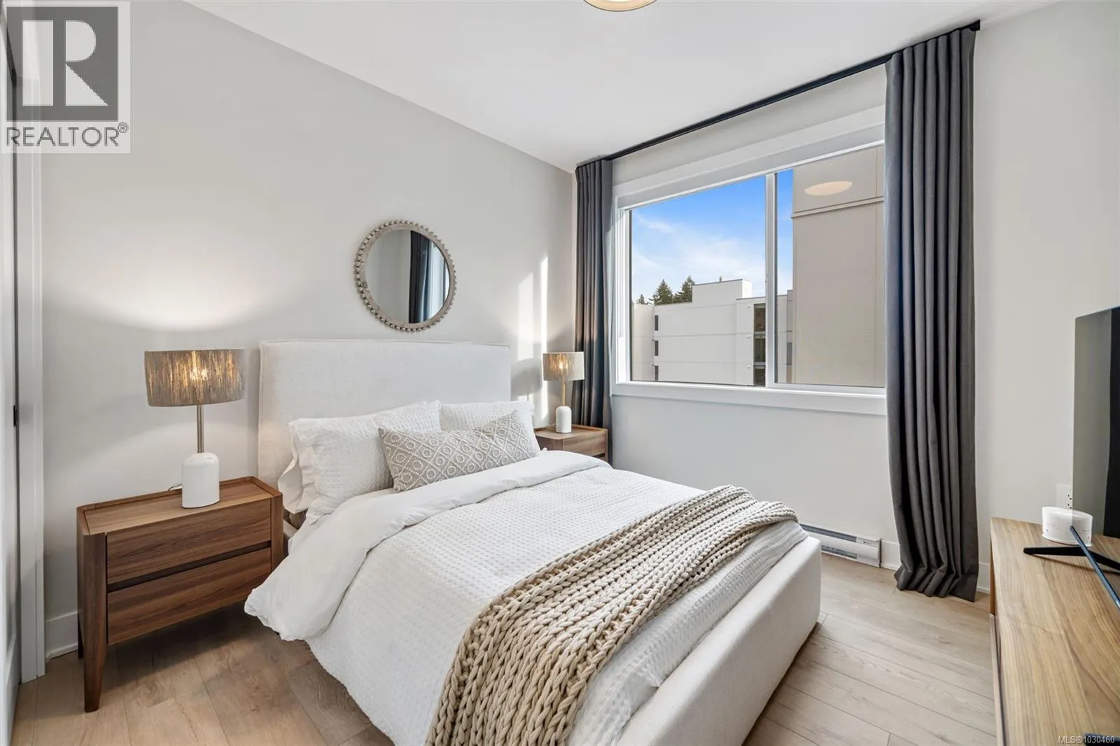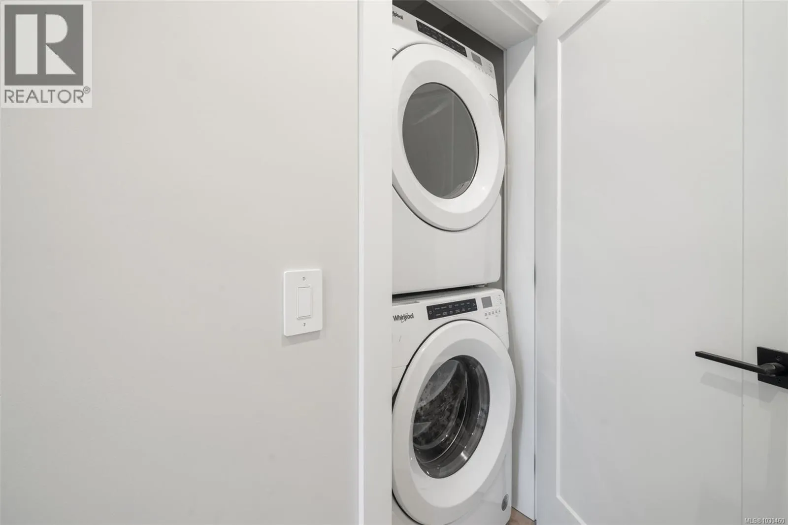 Top floor corner unit! Enjoy the convenience of corner unit ground level living, with storage on your floor, and an elevated deck for privacy. Tranquil nature outlooks from this spacious 2 bed and 2 bath floor plan laid out for privacy, and move in right away to enjoy new construction with air conditioning. Poised on the shores of Langford Lake, all homes at Trailside at the Lake come equipped with all the amenities for modern living. Bright and airy, including large windows to showcase the views, 9 ft ceilings, laminate flooring, spacious kitchens with quartz counters and a Whirlpool appliance package, window blinds and screens, as well as one (EV ready) parking space. Building includes cardio space, weight room, yoga space, lounge, & work from home office space. Just steps to the Ed Nixon trail and Langford Lake for outdoor adventures. Just a short walk to YMCA, Eagle Ridge and City Center activity complex, as well as many amenities. (id:27476)