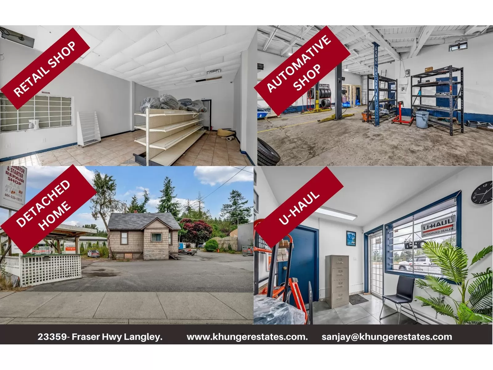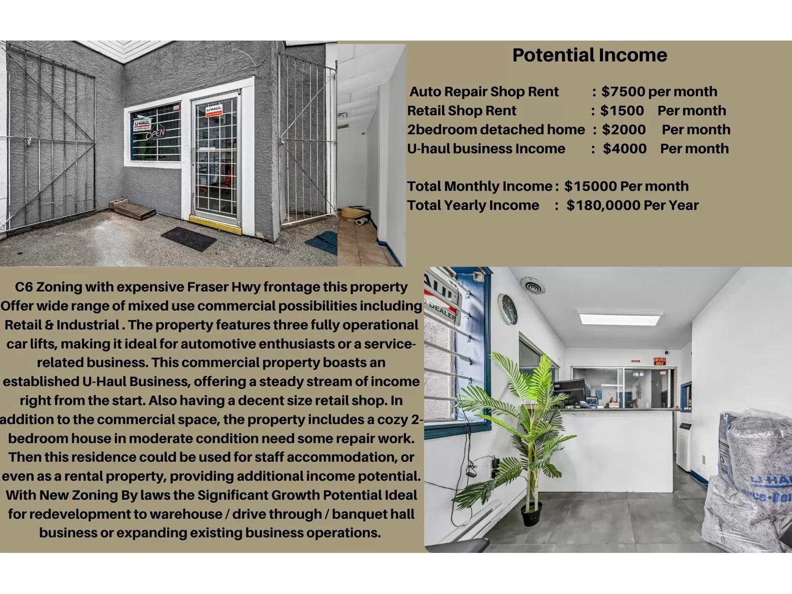 !!Opportunity ! Opportunity ! Opportunity ! Great opportunity to own a standalone building with a business on a 21,780 sqft lot, right on Fraser Highway that combines a thriving business with real estate options! This commercial property boasts an established U-Haul business, offering a steady stream of income right from the start. Situated on a generous lot, the property features three fully operational car lifts, making it ideal for automotive enthusiasts or a service-related business. Also having a decent size retail shop. In addition to the commercial space, the property includes a cozy 2-bedroom house in moderate condition need some repair work. Then this residence could be used for staff accommodation, or even as a rental property, providing additional income potential. (id:27476)