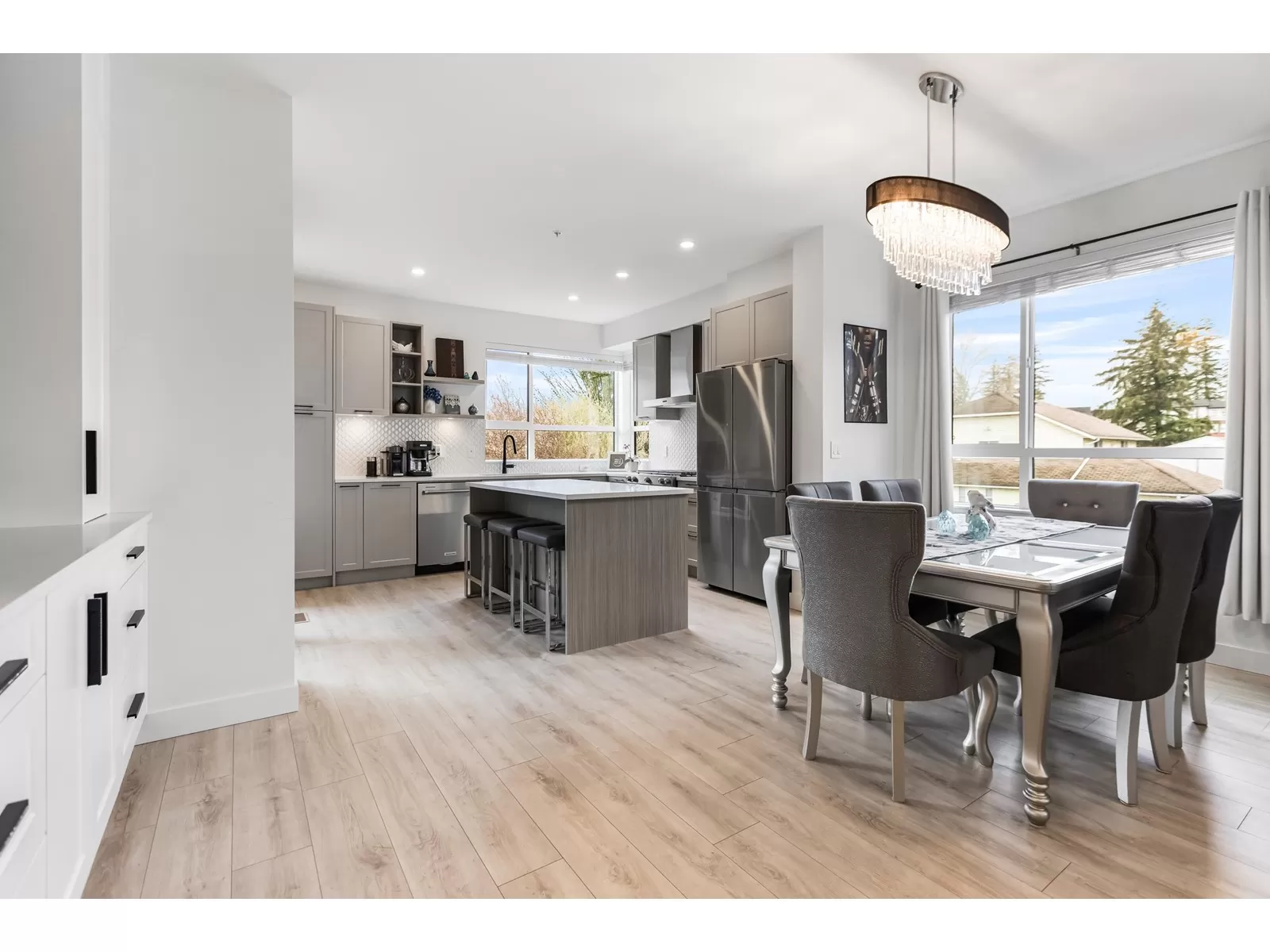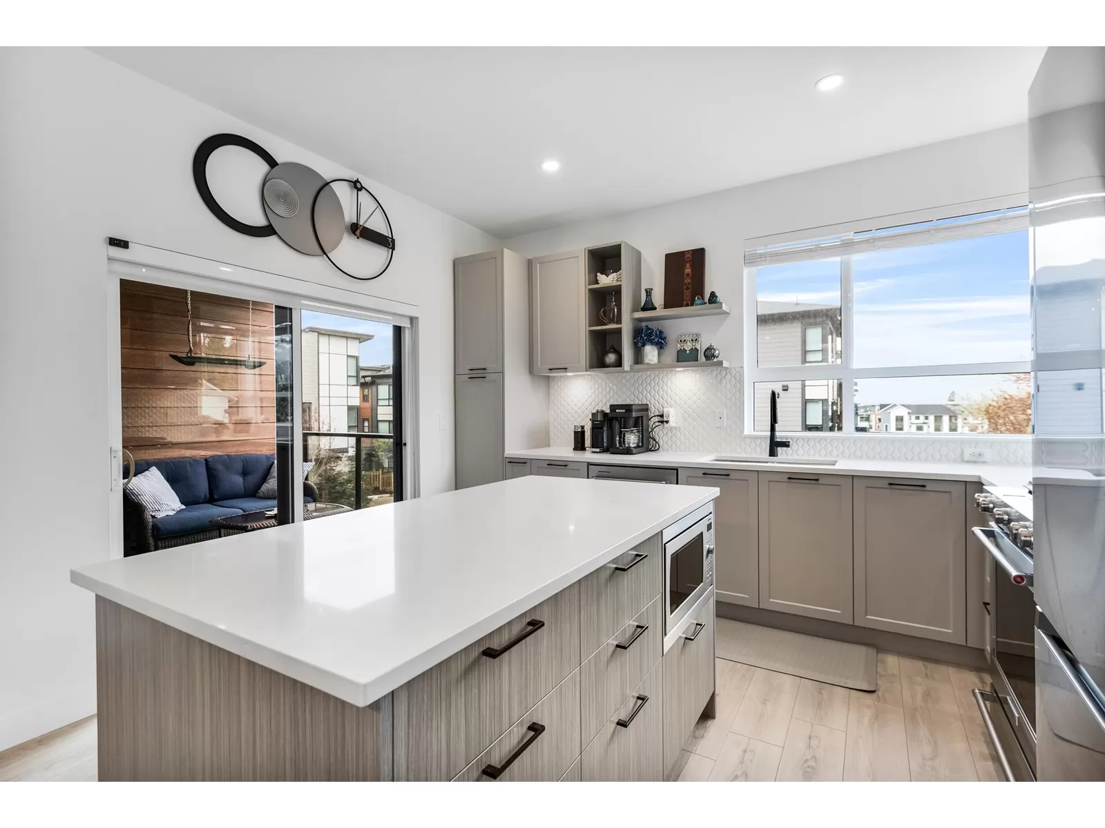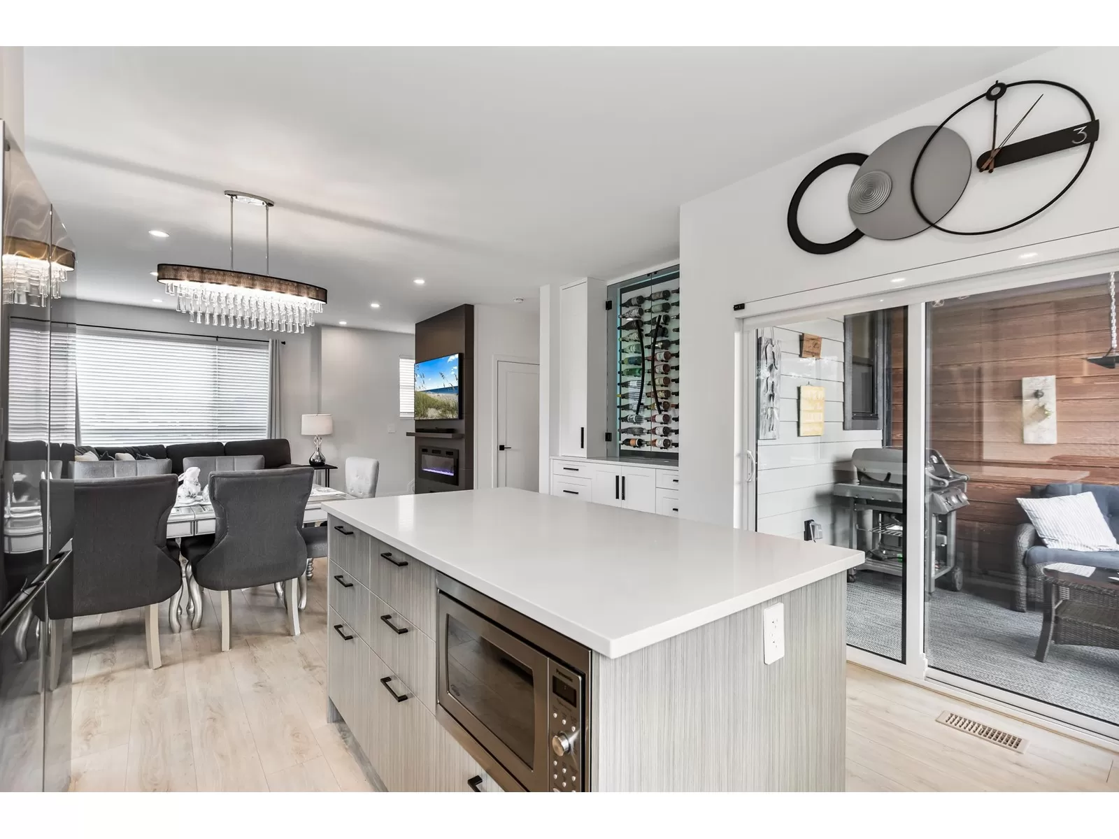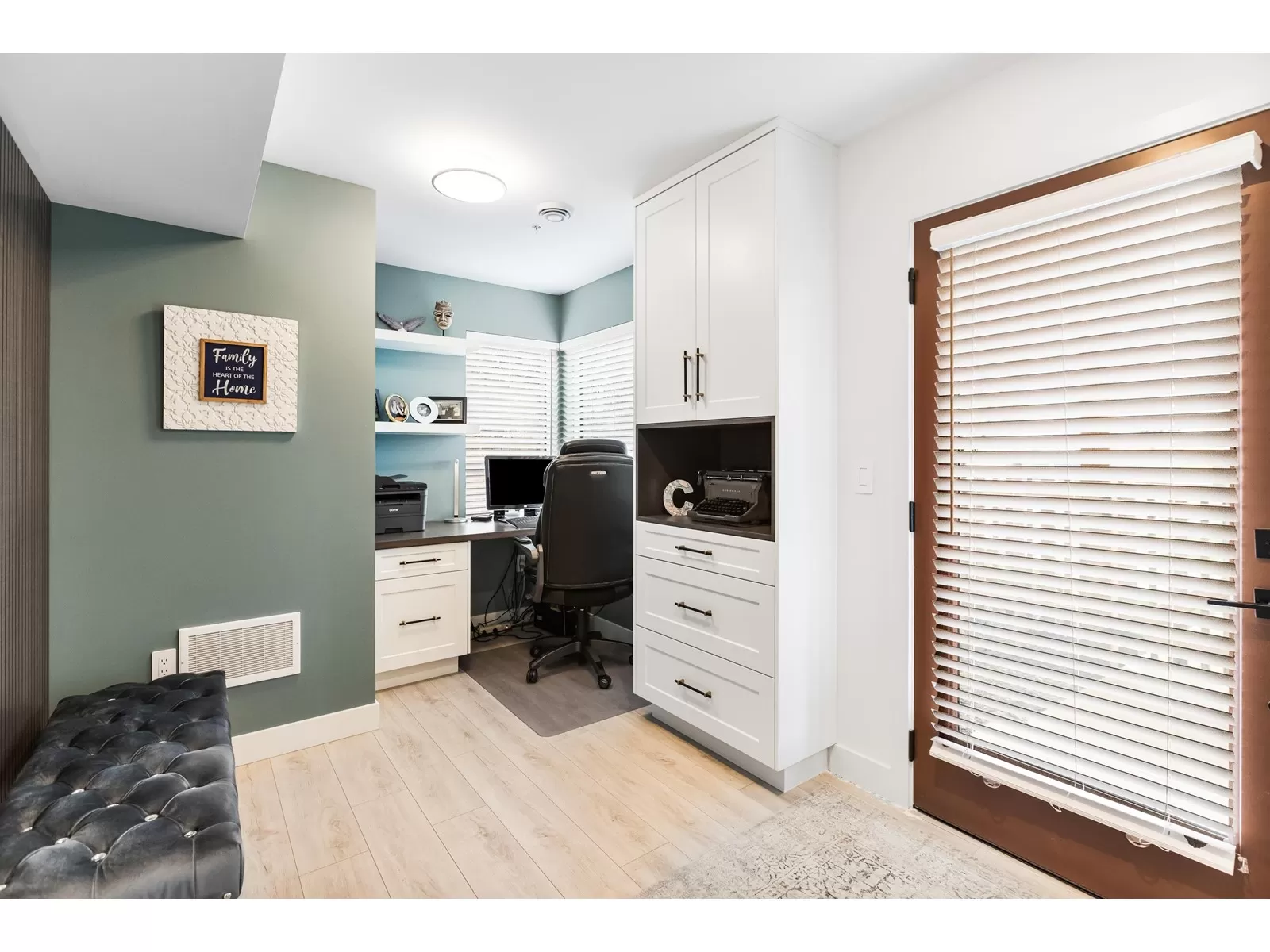 Welcome to Verge, a stunning end-unit townhouse built in 2023, offering show home quality finishes throughout. This 3-bedroom home features air conditioning and a lower-floor office complete with built-in desk and cabinetry. The open-concept main floor boasts a gourmet kitchen with a large island, built-in microwave, gas stove, stainless steel appliances, and abundant cabinetry & counter space. The dining area is enhanced with built-in cabinetry and a light-up wine display, while the living room showcases a feature wall and electric fireplace. Upstairs, the primary bedroom exudes elegance with a coffered ceiling, wall paneling, chandelier, electric fireplace, and a walk-in closet with full cabinetry. The luxurious 4-piece ensuite includes double sinks and a large stand-up shower. Two additional generous-sized bedrooms and a 4-piece bathroom with tub complete the upper level. The large double garage offers textured flooring, cabinetry, and shelving. Ideally located in Langley, close to all amenities (id:27476)