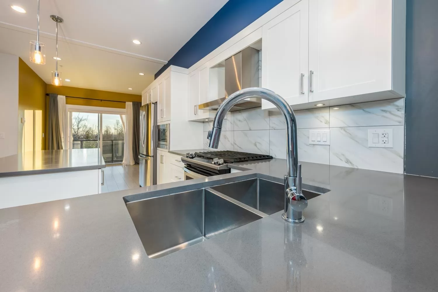 Fabulous big size 3-bedroom, 3-bathroom townhome in Willoughby. Open-concept living amplifies space, complementing the quartz countertops, expansive kitchen island, and soft-close cabinetry. Enjoy the spacious master bedroom with stand-up shower and dual vanity. Private backyard oasis, forest views, and a gas hookup on the kitchen-adjacent patio for seamless indoor / outdoor living. Rain-screened structure and a two-car garage with epoxy floors ensure convenience. This pet friendly nice complex also features multiple playgrounds for family fun. (id:27476)