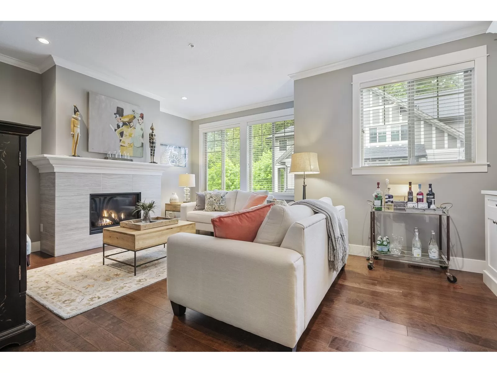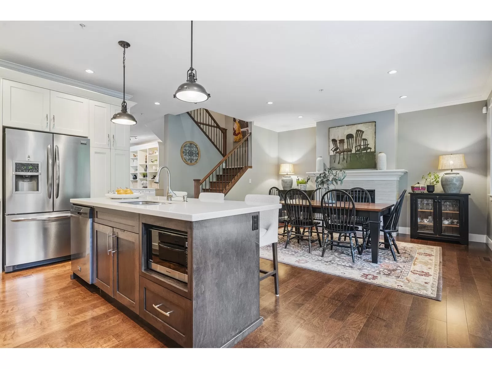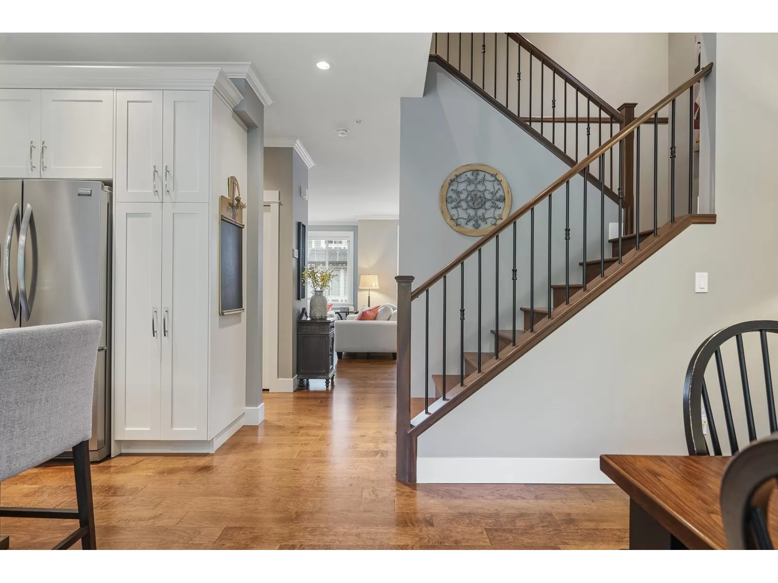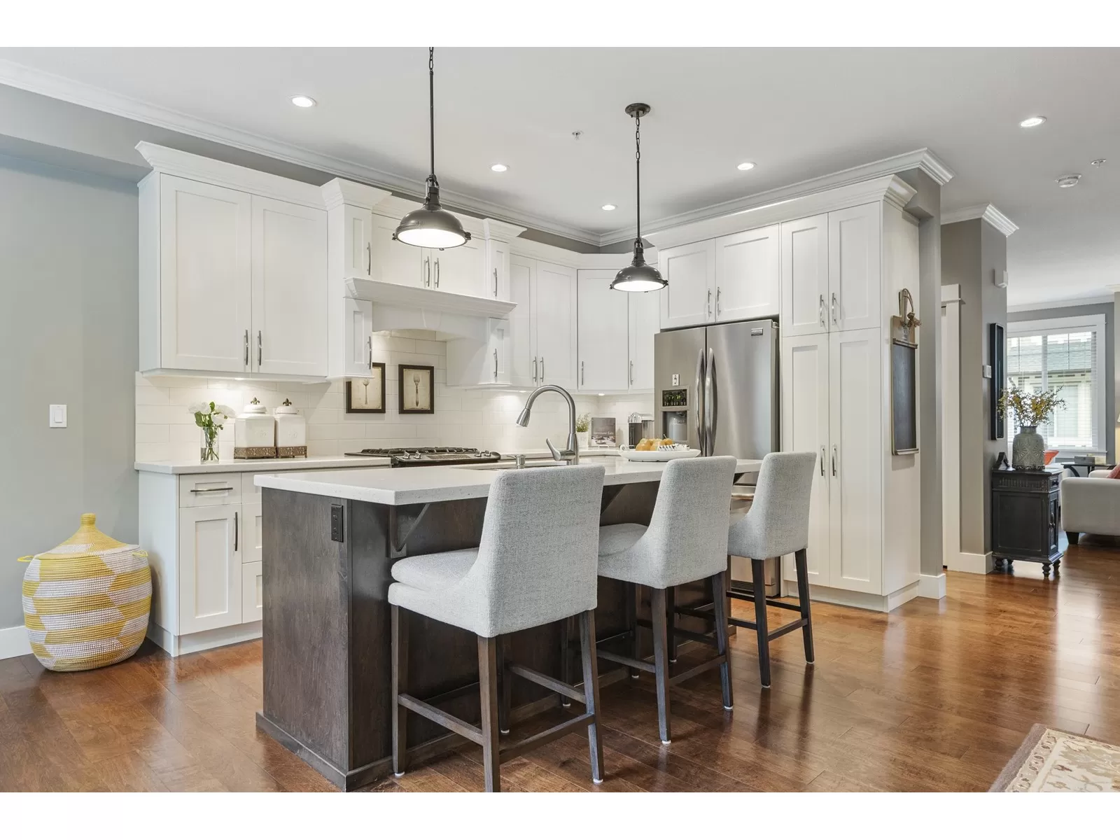 WELCOME HOME to this executive townhouse, 2300+ sq ft, located in Woodrow Lane, built by Lanstone Homes, lovingly maintained and meticulously updated with hi-end finishings. This 3-level, 3 bedroom, 4 bathroom home boasts stunning hardwood flooring, crown molding, built in units and stainless steel appliances, along with quartz counters. Enjoy the 2 cozy gas fireplaces and flexible space in the basement with the option to add a wall and create a 4th bedroom. Upstairs features a large primary bedroom with luxury en-suite and a spacious walk in closet; and a laundry room is located on the top floor for ease. Enjoy the deck off the main floor or the fully fenced backyard accessed from the basement family room. DOUBLE SIDE BY SIDE GARAGE + 2 spots on driveway. 5 mins to Fort Langley! (id:27476)
