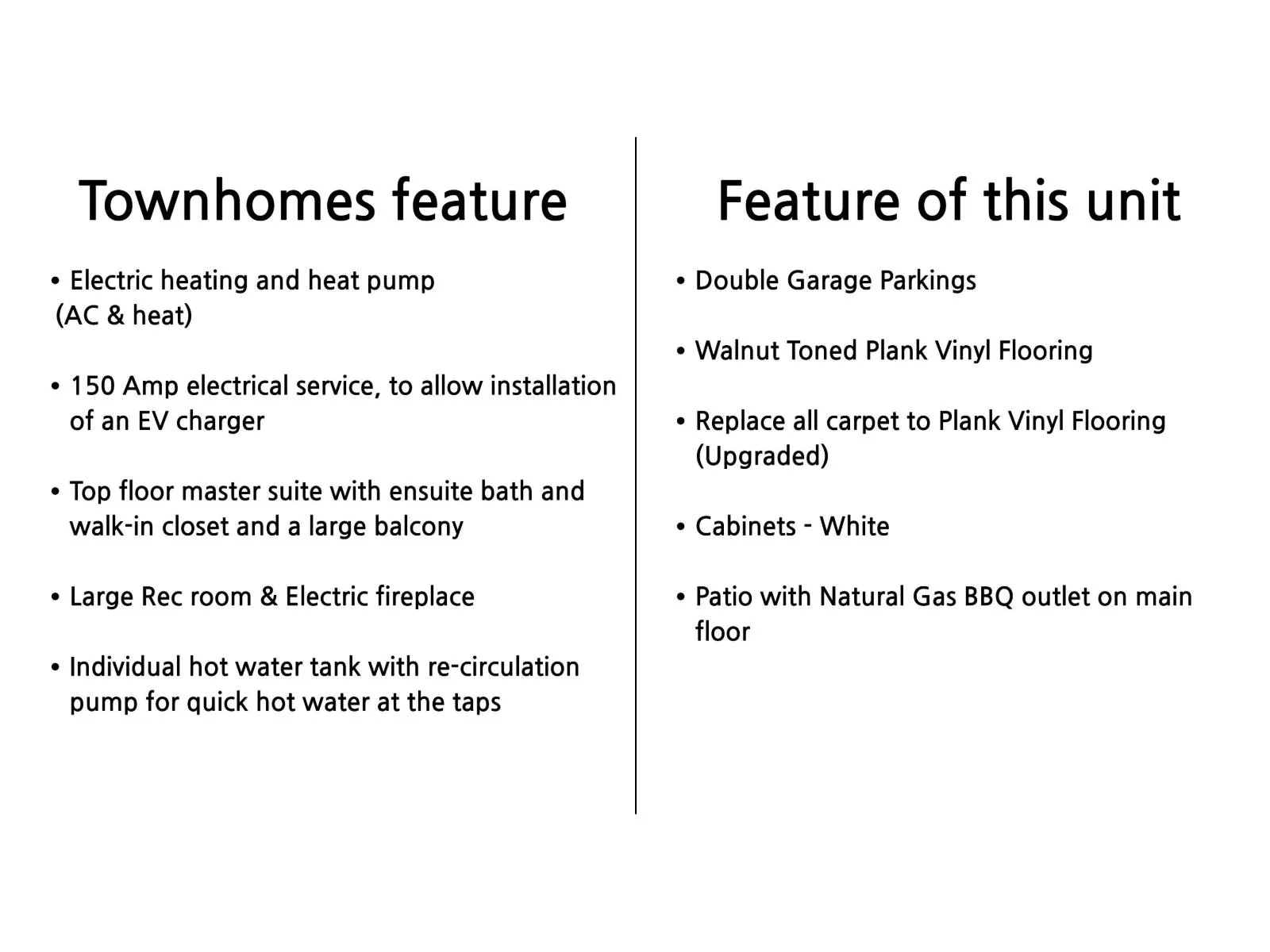 Welcome to Kensington Gate by Quadra - a rare 4-level townhouse in the center of Willoughby. This spacious home offers over 2,000 sq.ft with 3 bedrooms, 3 bathrooms, a big rec room, and a flex space that can be used as a 4th bedroom. Located quietly at the back of the complex, it gives you both privacy and convenience. Inside features include wide laminate floors, heated bathroom floors, A/C with heat pump, and an electric fireplace. The large rec room is great for a gym, office, or guest room. You also get a private EV-ready garage with side-by-side underground parking and your own garage door. Just a 1-minute walk to Lynn Fripps Elementary. Close to bus stops, schools, shops, Highway 1, and Carvolth Bus Exchange. Surrounded by quiet single-family homes. (id:27476)
