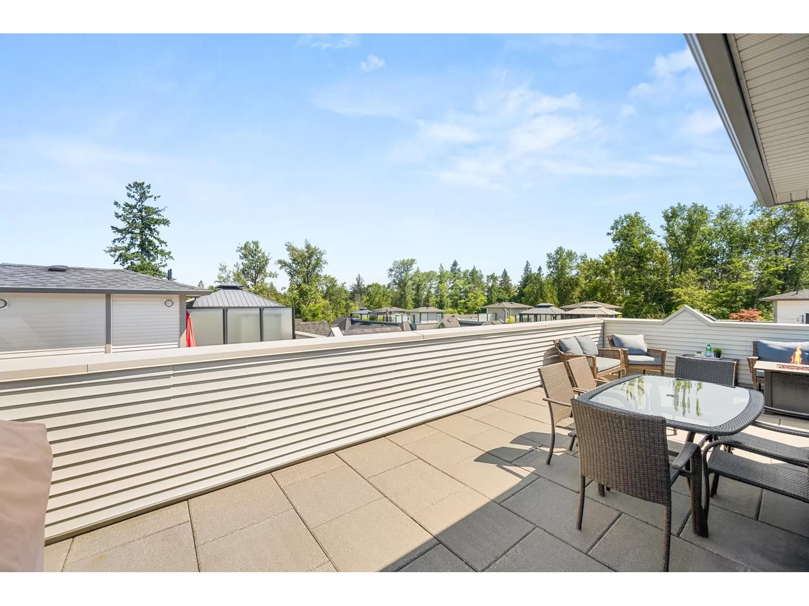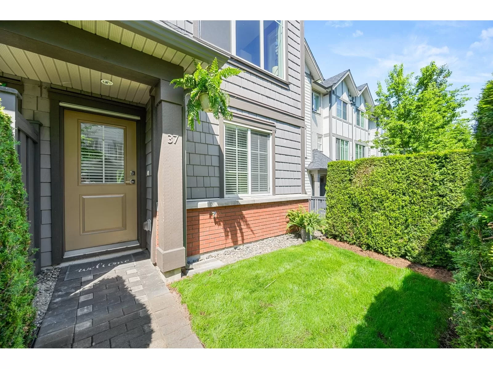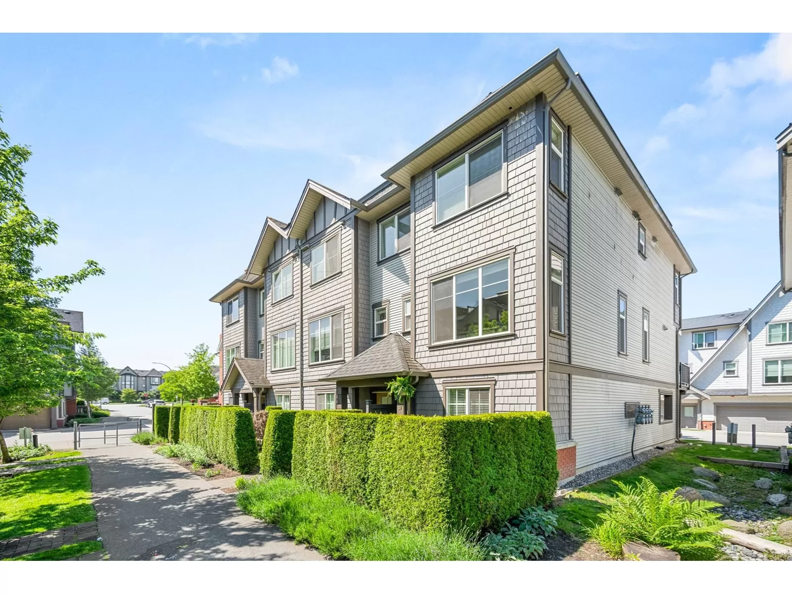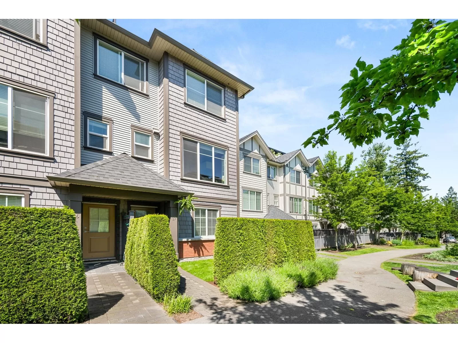EVERLY GREEN - The best unit in the complex! This bright, end-unit townhome boasts the highest rooftop with stunning mountain and forest views. One of only three units with 3 parking spots-garage, carport & driveway. The private rooftop patio is a true oasis: sunny all day and perfect for sunbathing, dining, BBQs (gas hookup), relaxing by the fire, or adding a canopy for year-round use. Enjoy a second patio off the kitchen and a sunny front yard with new grass. Surrounded on 3 sides by protected greenbelt, with a playground at your doorstep and Yorkson Park just steps away. Walk to schools, close to HWY 1 & Carvolth. Bonus den, epoxy garage floors, gas range-this one has it all! (id:27476)