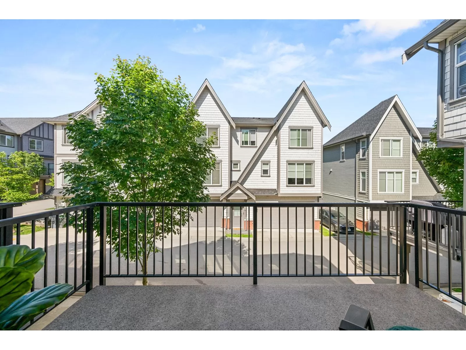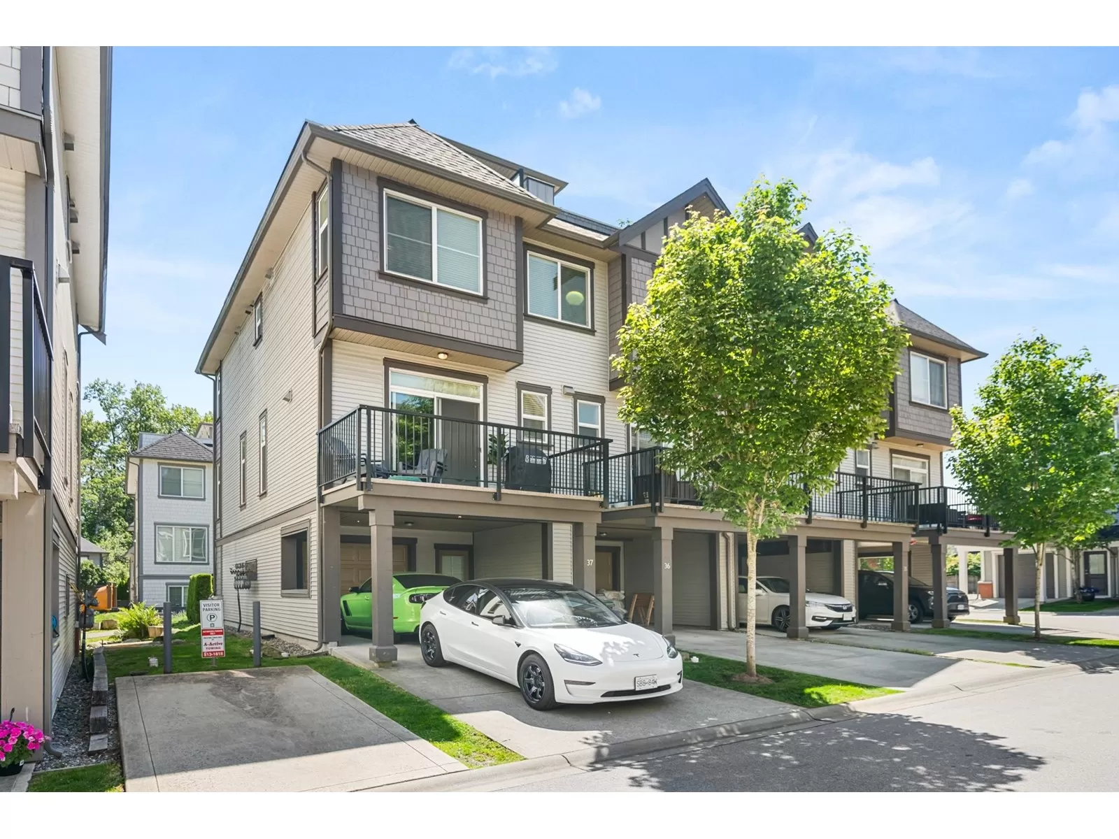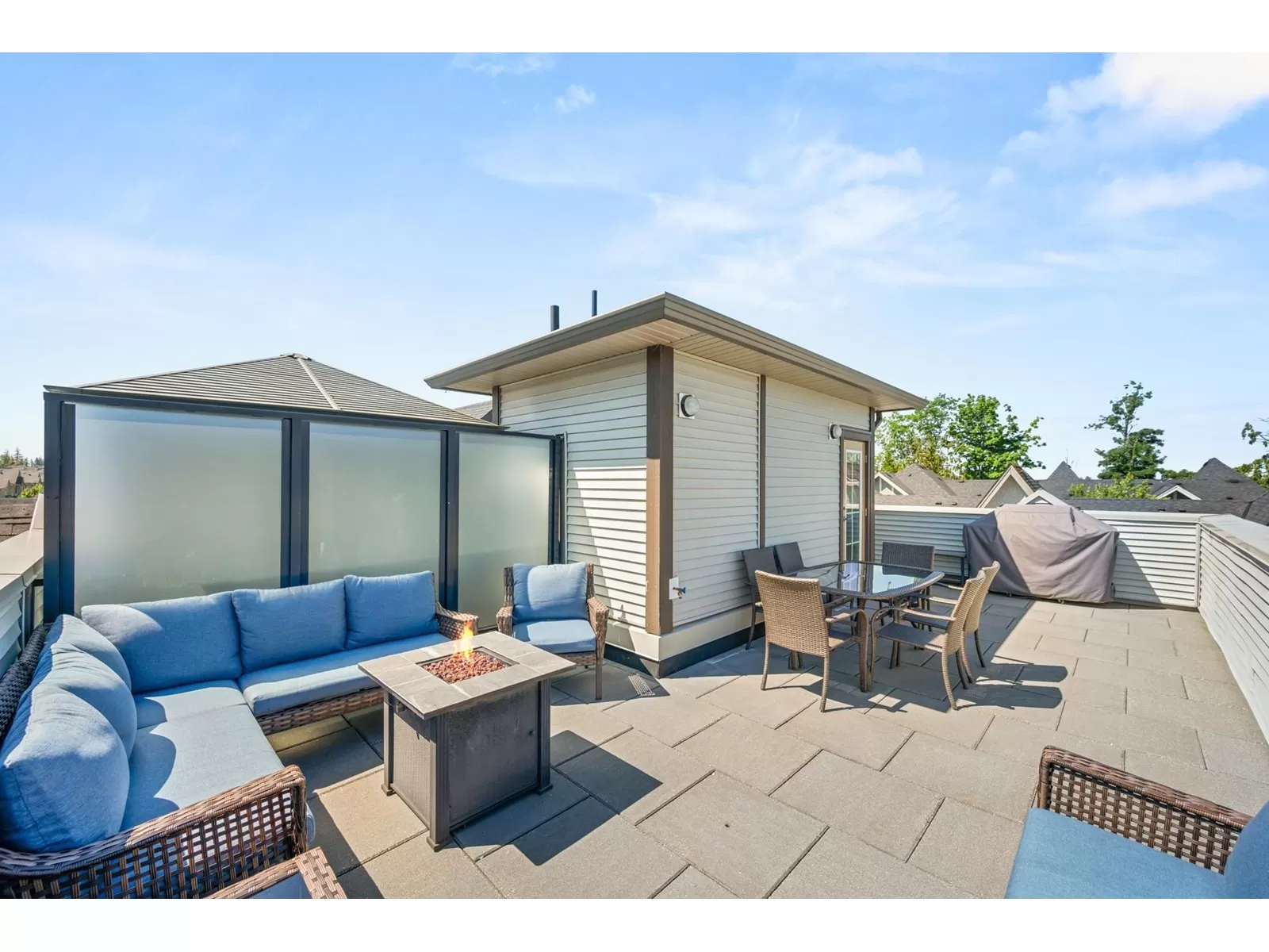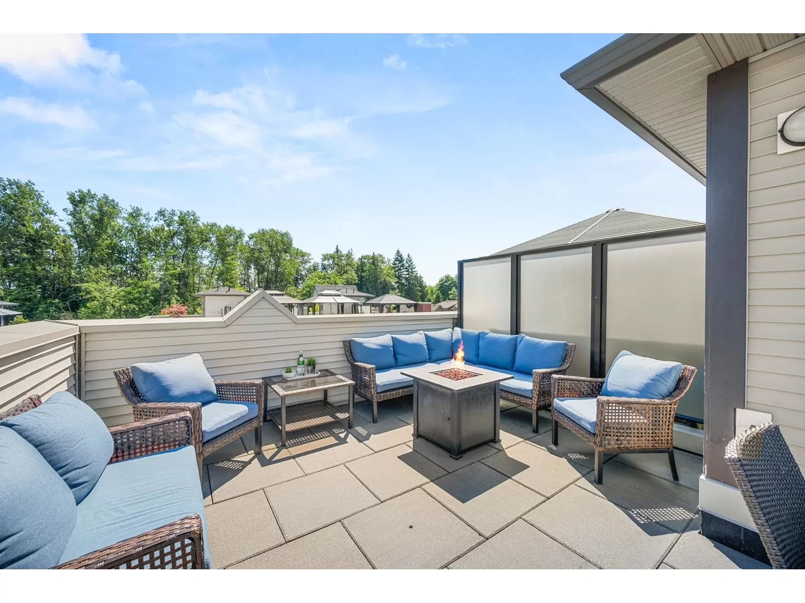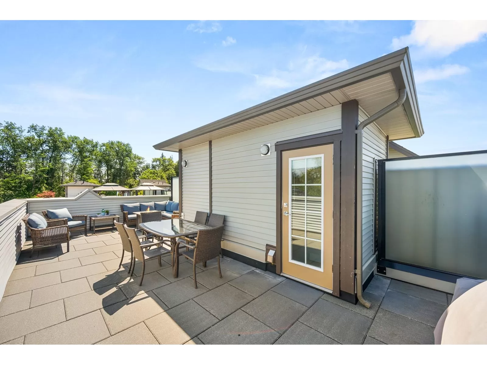 EVERLY GREEN - The best unit in the complex! This bright, end-unit townhome boasts the highest rooftop with stunning mountain and forest views. One of only three units with 3 parking spots-garage, carport & driveway. The private rooftop patio is a true oasis: sunny all day and perfect for sunbathing, dining, BBQs (gas hookup), relaxing by the fire, or adding a canopy for year-round use. Enjoy a second patio off the kitchen and a sunny front yard with new grass. Surrounded on 3 sides by protected greenbelt, with a playground at your doorstep and Yorkson Park just steps away. Walk to schools, close to HWY 1 & Carvolth. Bonus den, epoxy garage floors, gas range-this one has it all! (id:27476)