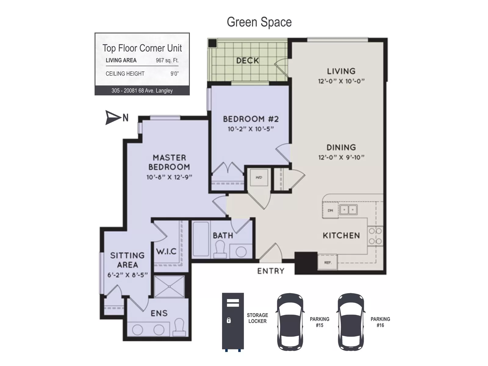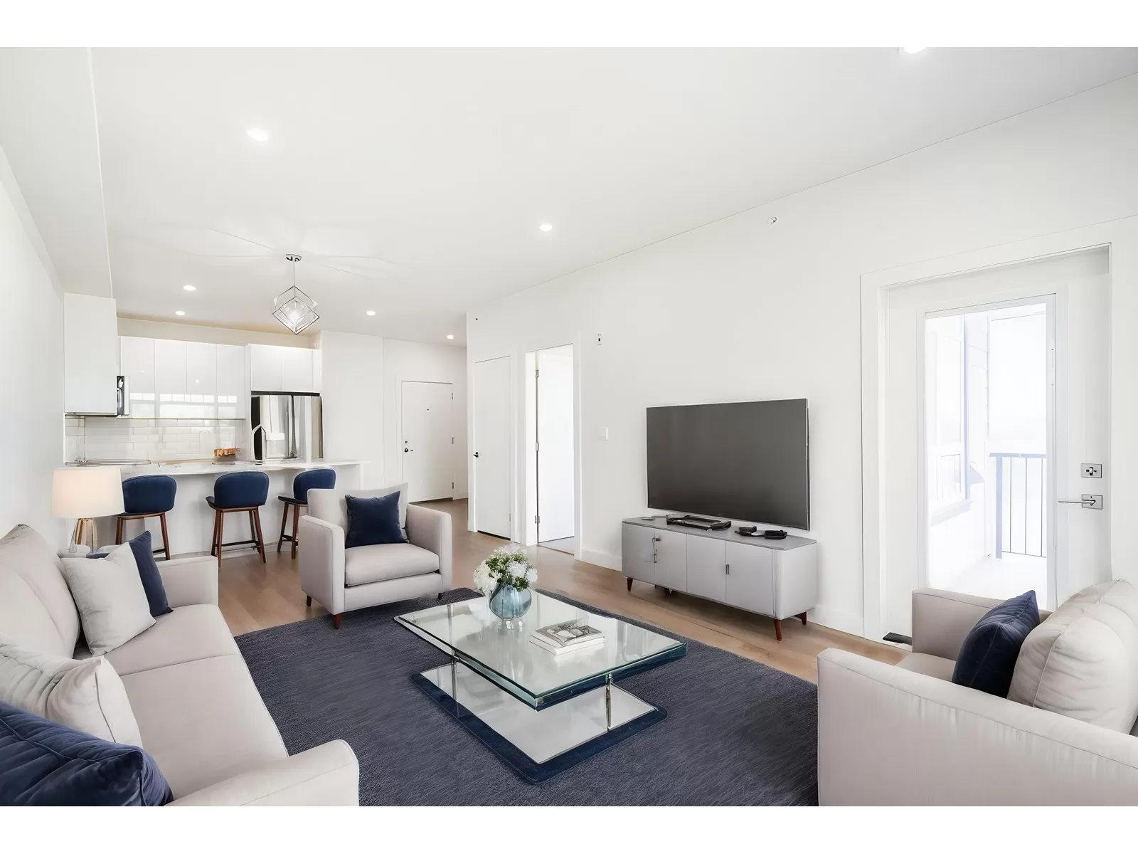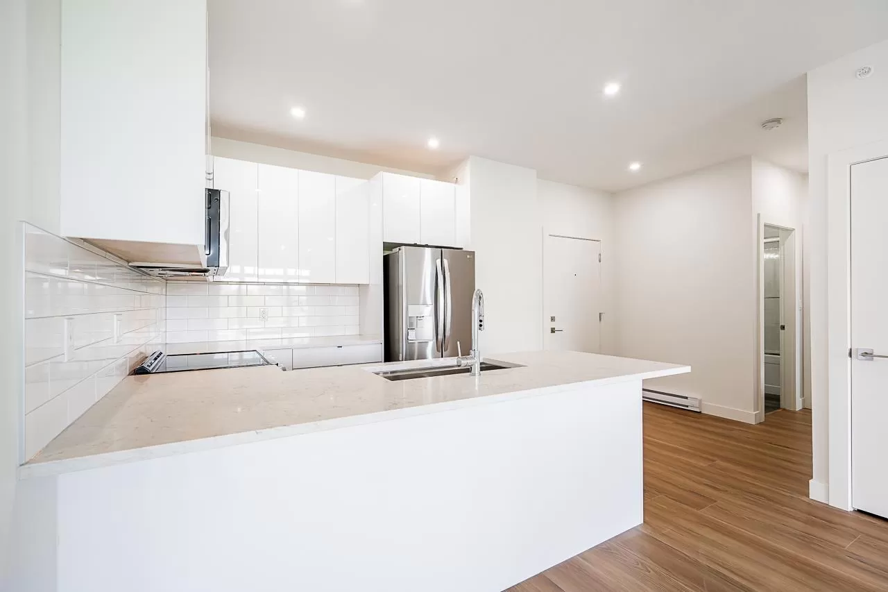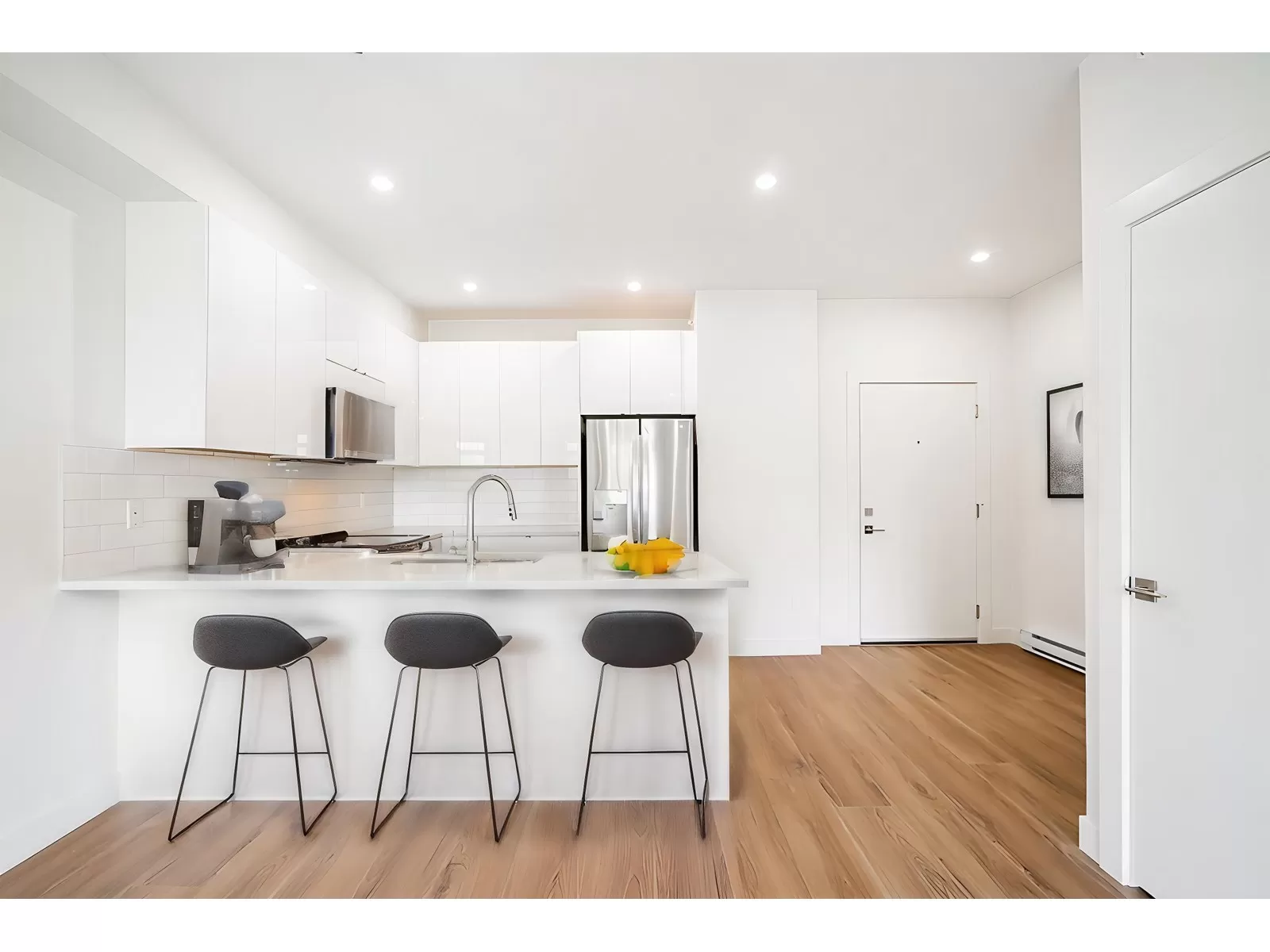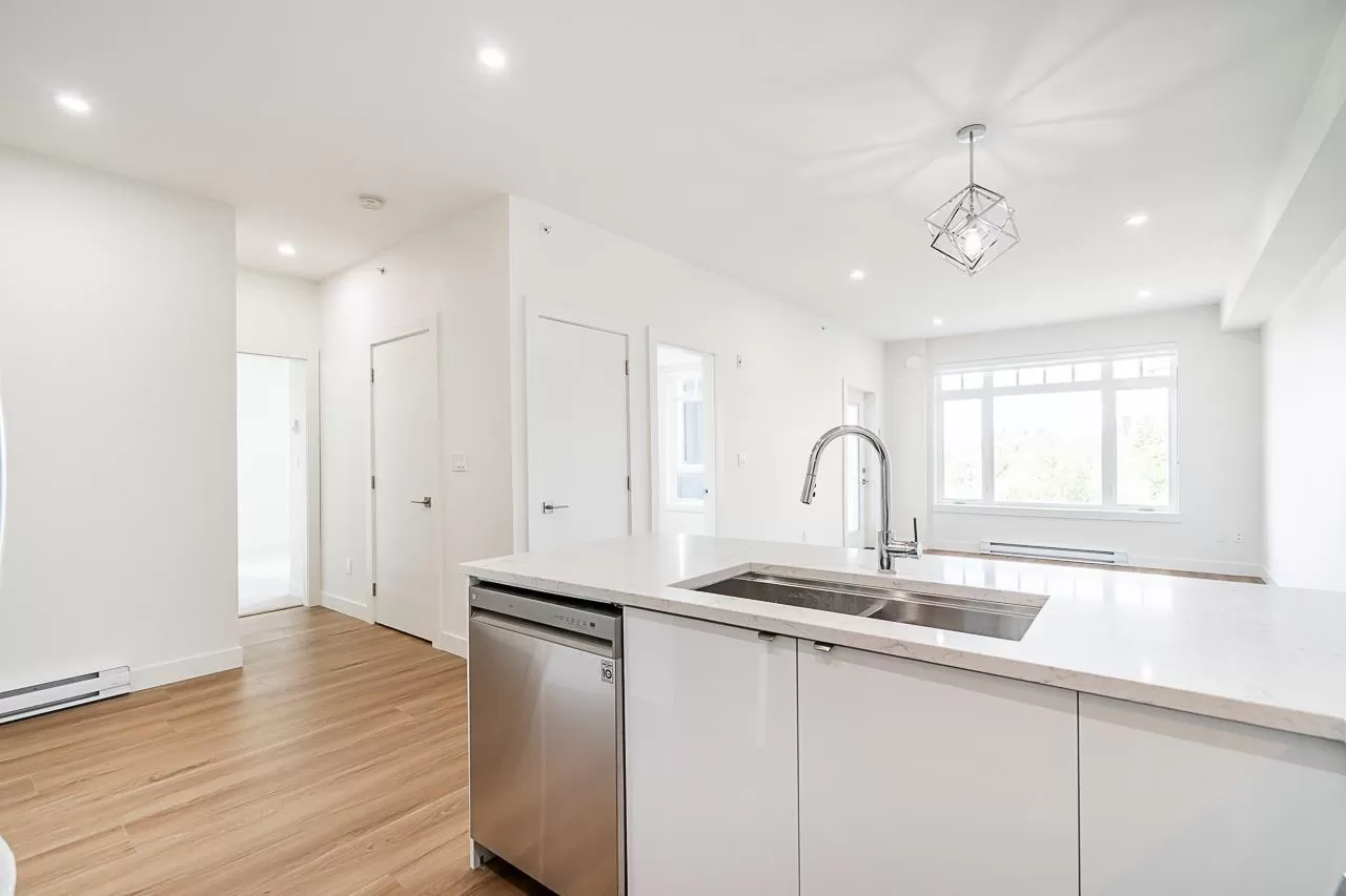 Welcome to Arora Court a collection of only 15 spacious boutique homes on the grennbelt! Beautiful TOP FLOOR LARGE 967sf corner South West 2bed/2bath home with a unique open concept floor plan. The thoughtfully designed interior offers high-quality finishes, 9ft ceilings, bright white kitchen with soft close cabinetry, quartz countertops, premium LG S/S appliances, zebra privacy roller blinds and a LARGE island for entertaining. Primary Bedroom features a LARGE walk in closet with closet organizers, spa like ensuite + BONUS vanity sitting area facing a massive window with a cathedral ceiling. Locker located on same floor as unit plus BONUS 2 parking stalls incl. Pets welcome no size restrictions! Book your private tour today! (id:27476)