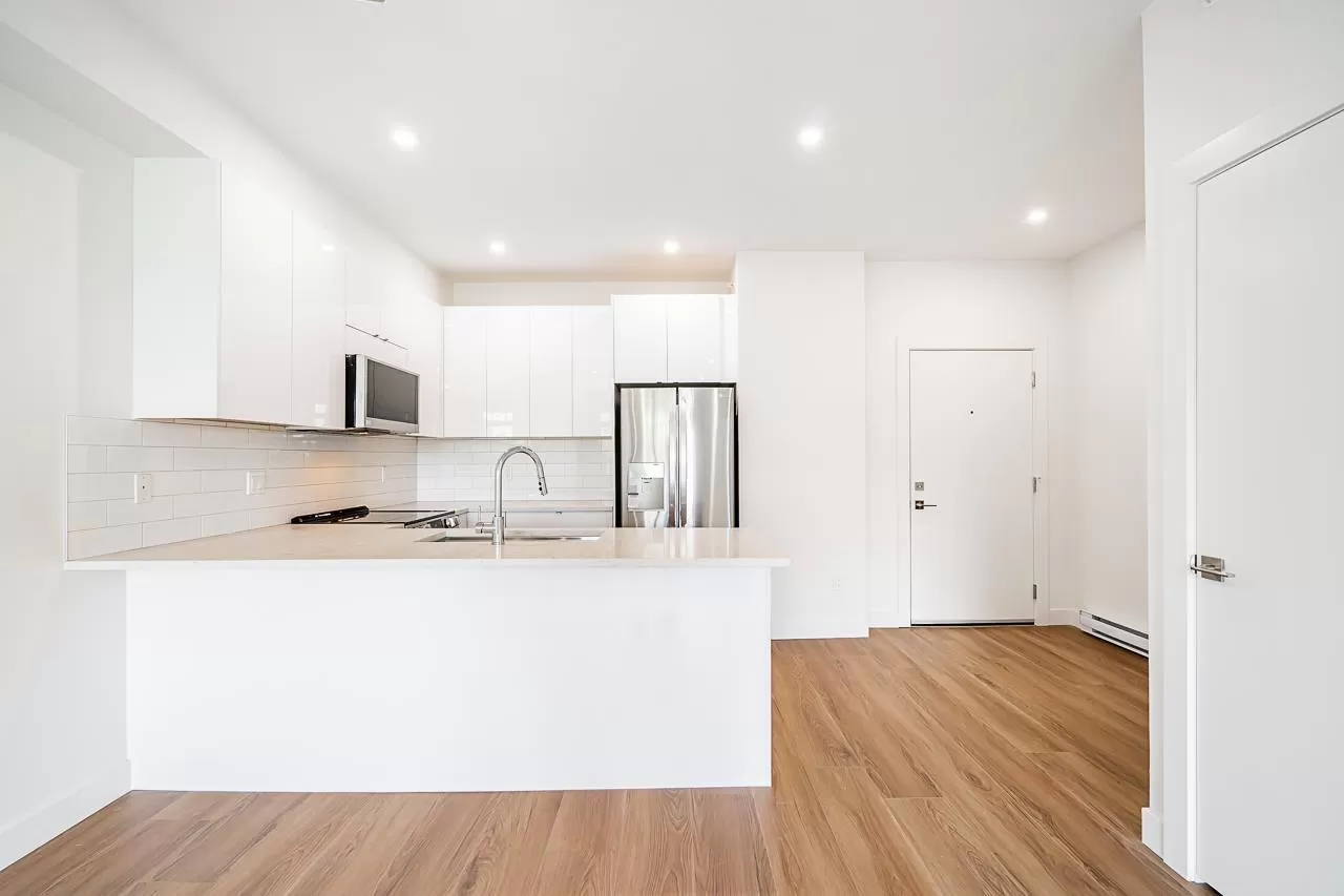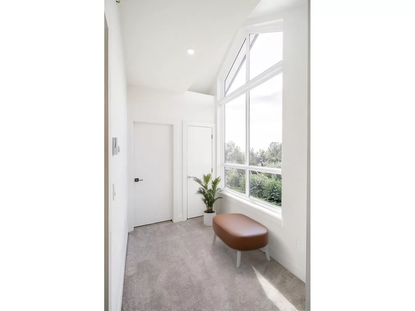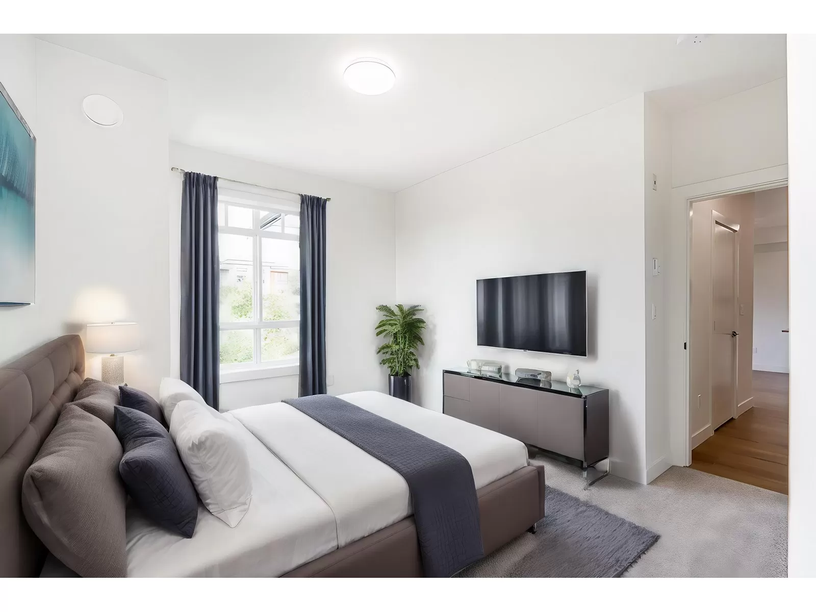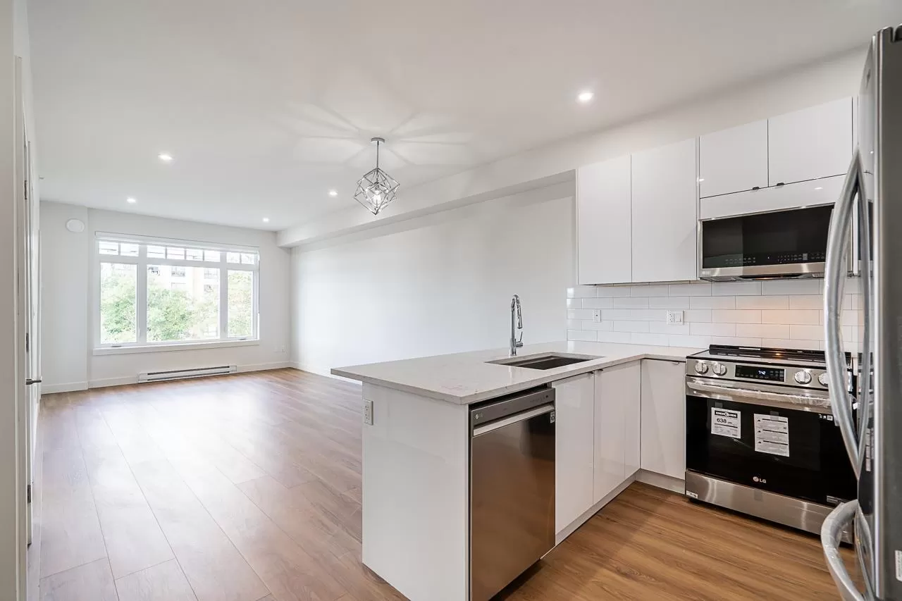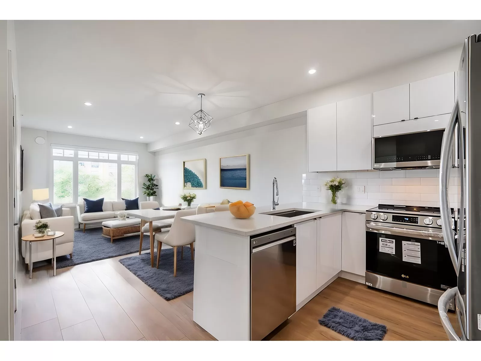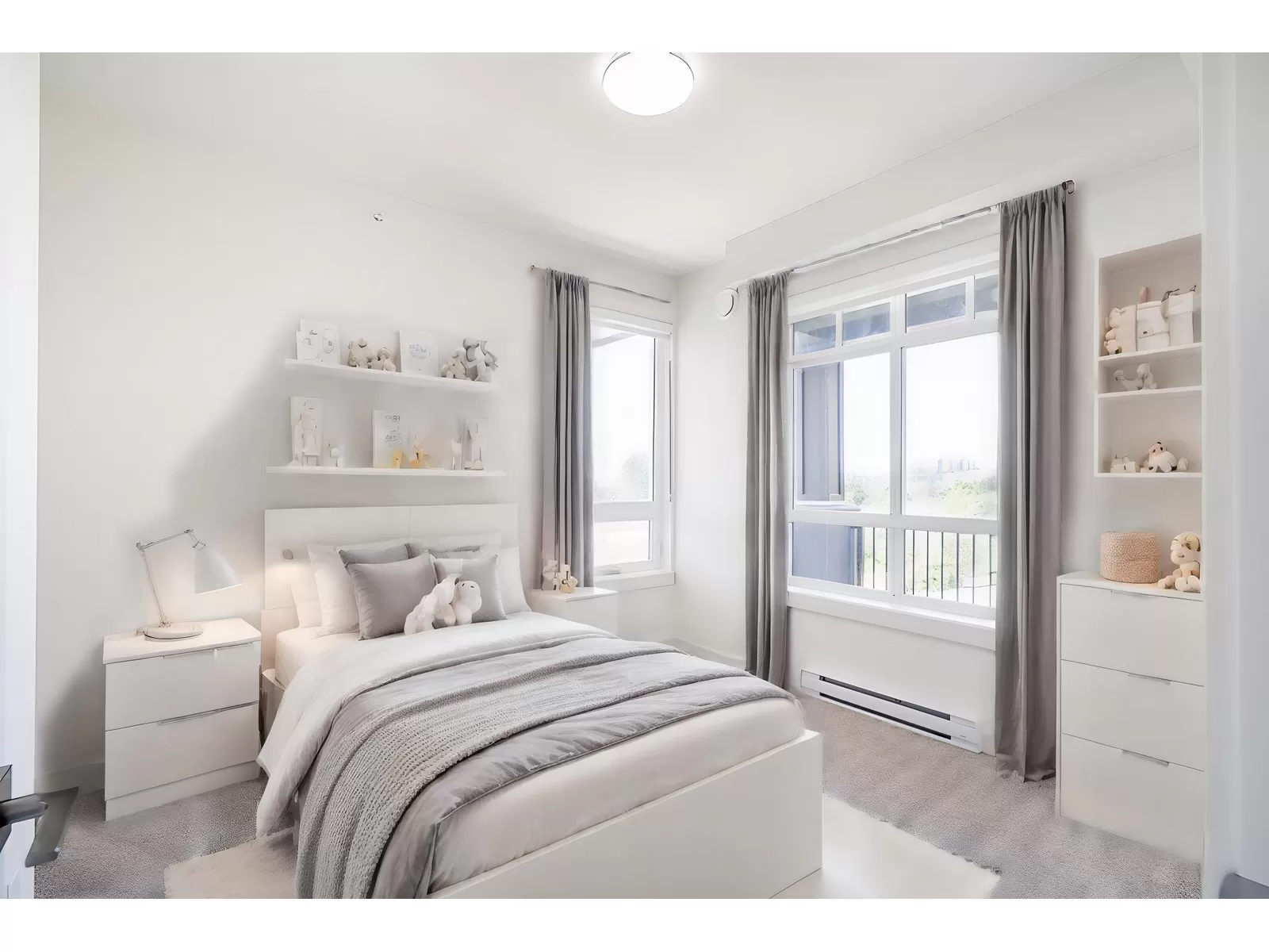 Welcome to Arora Court a collection of only 15 spacious boutique homes on the grennbelt! Beautiful TOP FLOOR LARGE 967sf corner South West 2bed/2bath home with a unique open concept floor plan. The thoughtfully designed interior offers high-quality finishes, 9ft ceilings, bright white kitchen with soft close cabinetry, quartz countertops, premium LG S/S appliances, zebra privacy roller blinds and a LARGE island for entertaining. Primary Bedroom features a LARGE walk in closet with closet organizers, spa like ensuite + BONUS vanity sitting area facing a massive window with a cathedral ceiling. Locker located on same floor as unit plus BONUS 2 parking stalls incl. Pets welcome no size restrictions! Book your private tour today! (id:27476)
