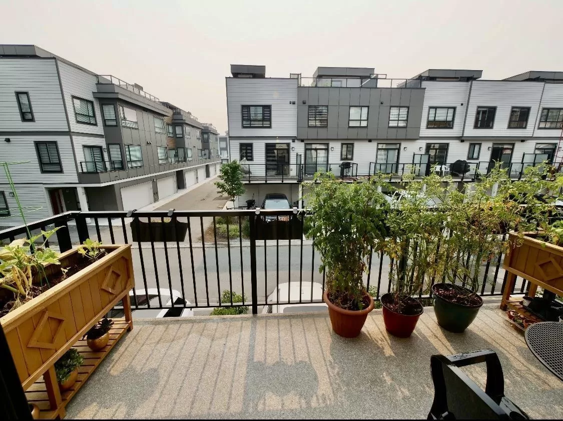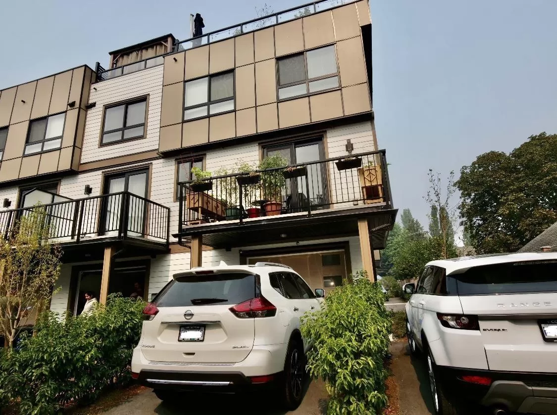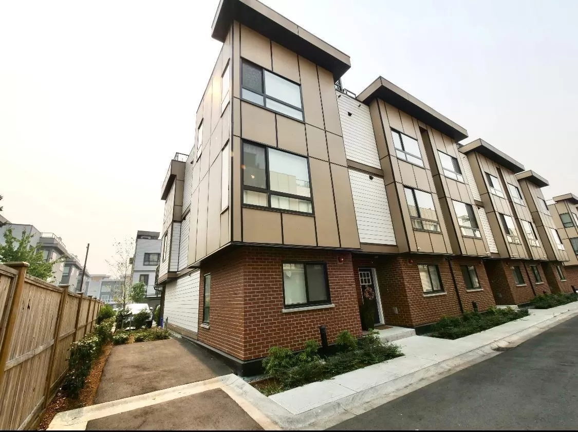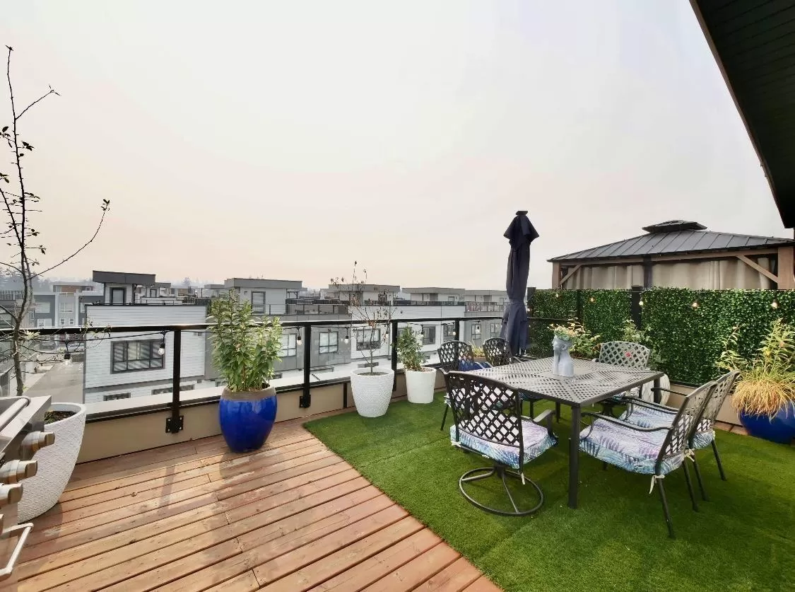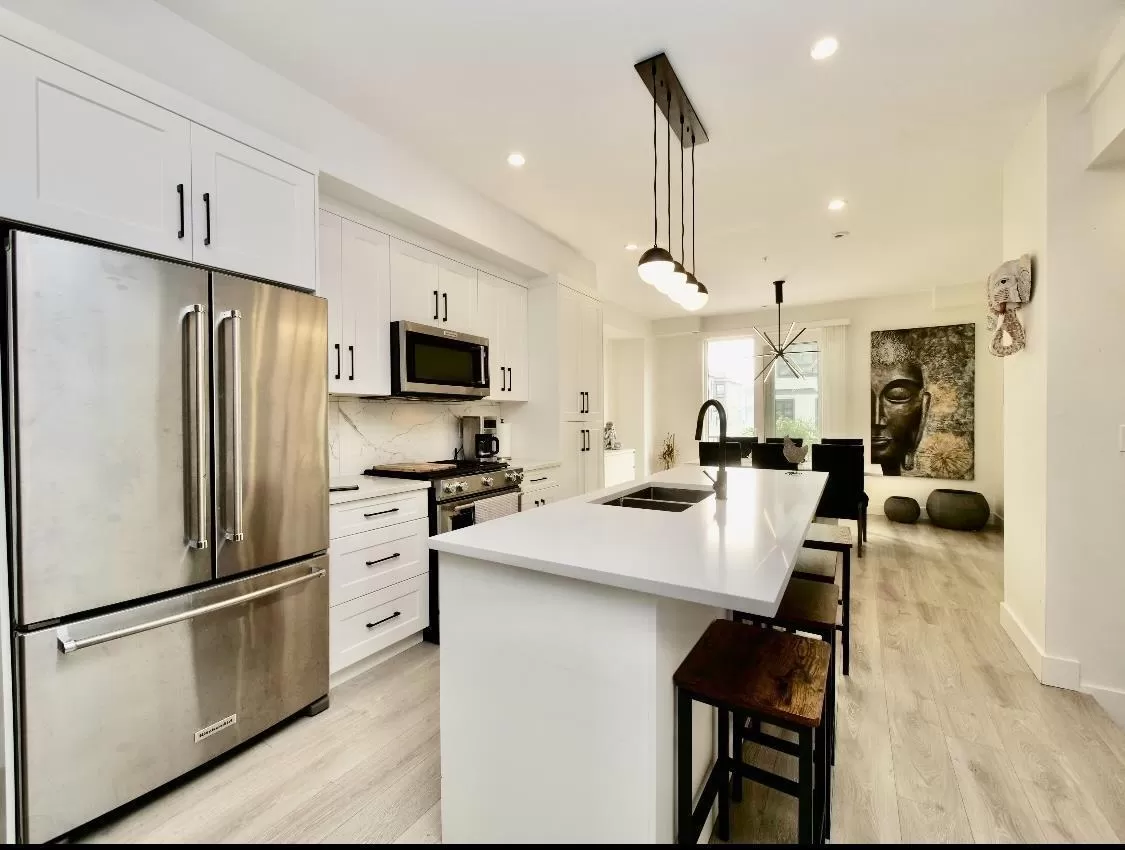 Welcome to Winston Terraces! This luxurious 4-bedroom, 3.5-bathroom corner townhouse offers 1,952 sq.ft. of bright, open-concept living space with nearly 9-foot ceilings on the main floor and air conditioning throughout. The gourmet kitchen is equipped with KitchenAid stainless steel appliances, custom soft-close cabinetry, marble countertops, and a Carrara marble-style porcelain backsplash. Wide-plank laminate flooring runs throughout the home, complemented by modern upgrades like USB charging outlets, a Nest thermostat, and energy-efficient lighting. The large single garage includes a brand-new EV charger, plus there's an additional parking spot right outside. Enjoy outdoor living on the impressive 611 sq.ft. rooftop deck with a natural gas hookup and structural support for a hot tub. (id:27476)