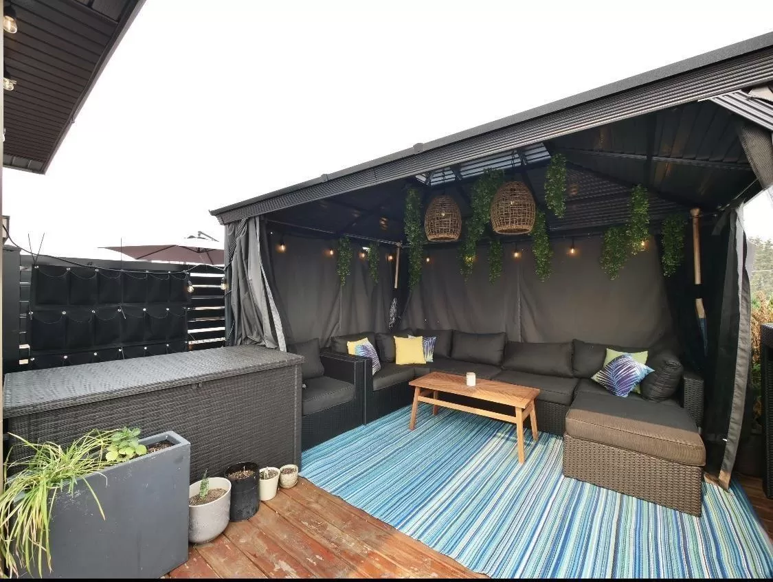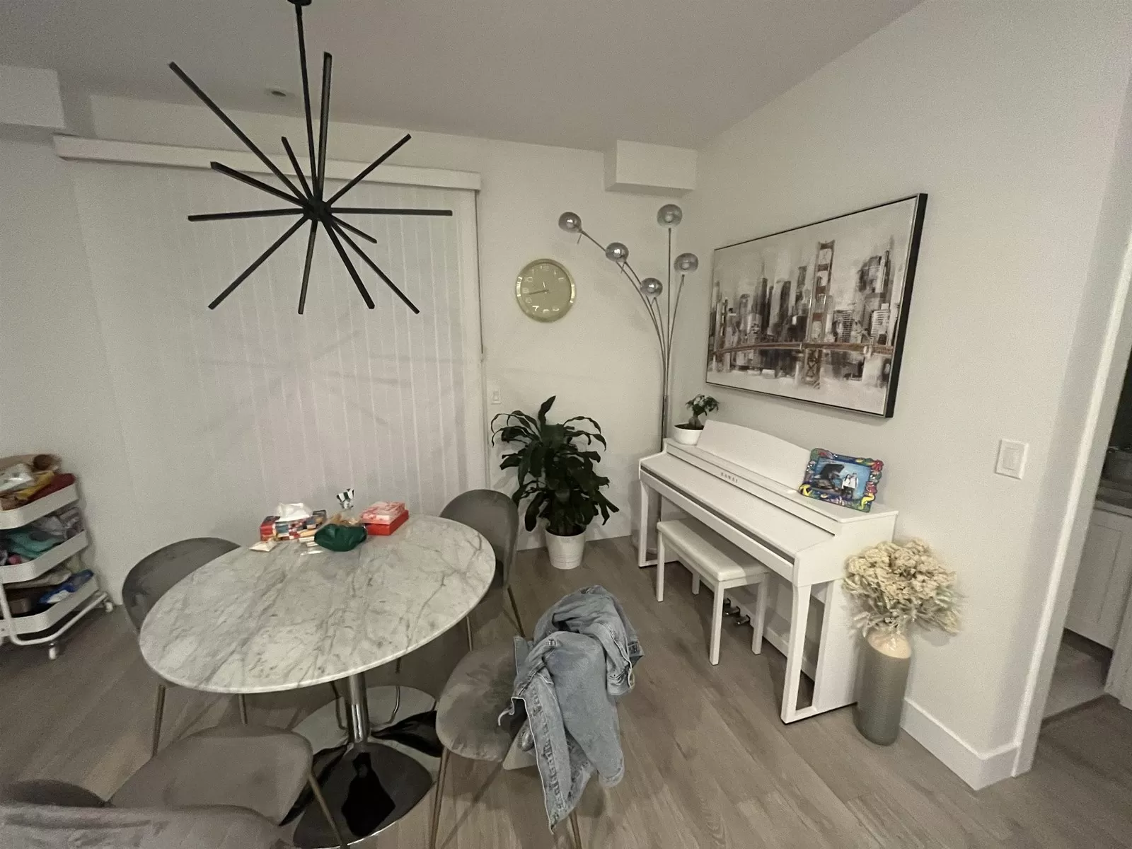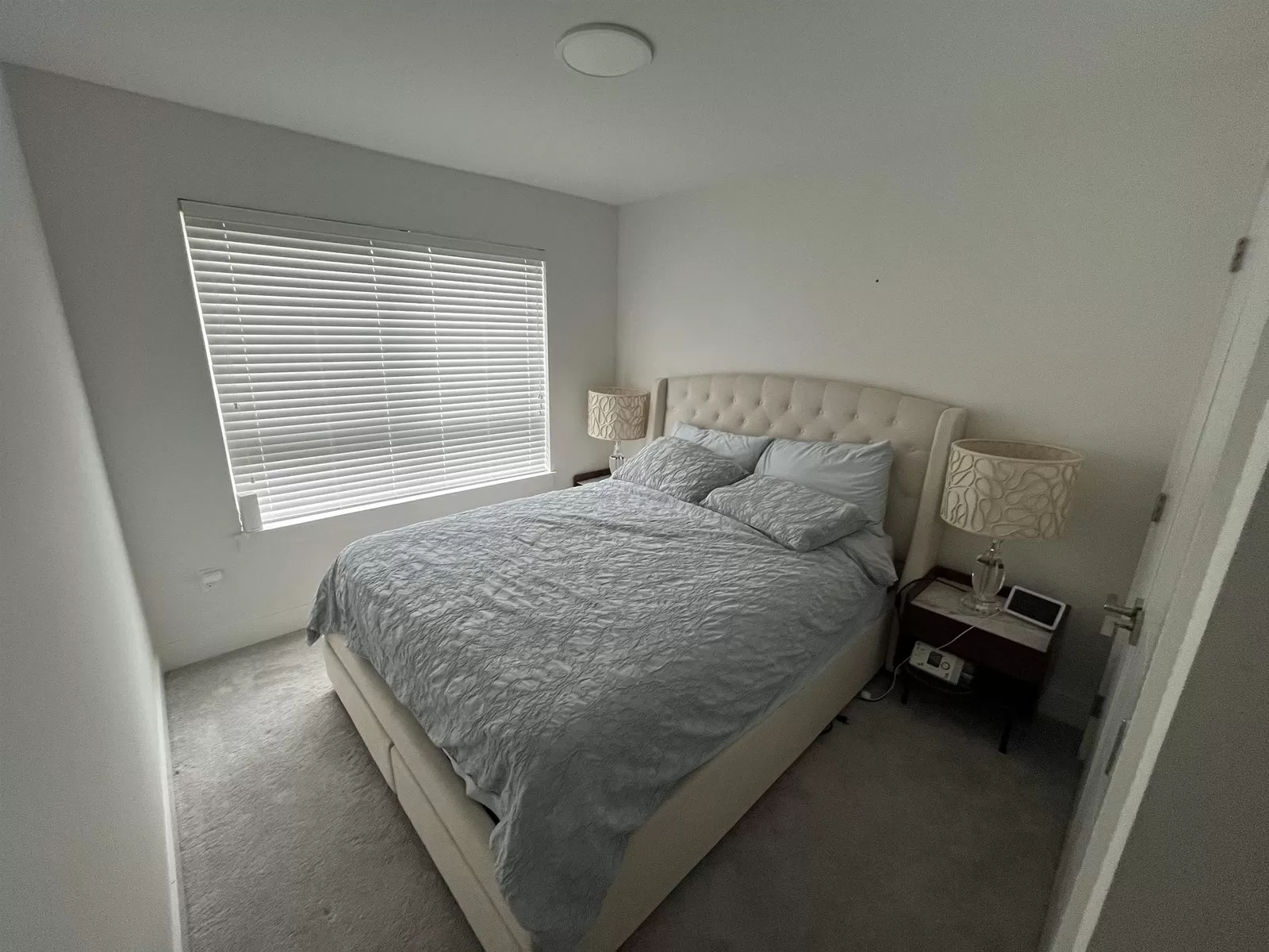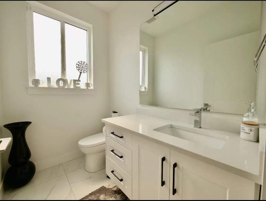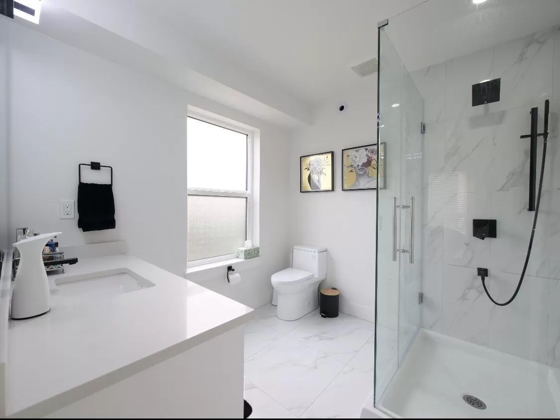 Welcome to Winston Terraces! This luxurious 4-bedroom, 3.5-bathroom corner townhouse offers 1,952 sq.ft. of bright, open-concept living space with nearly 9-foot ceilings on the main floor and air conditioning throughout. The gourmet kitchen is equipped with KitchenAid stainless steel appliances, custom soft-close cabinetry, marble countertops, and a Carrara marble-style porcelain backsplash. Wide-plank laminate flooring runs throughout the home, complemented by modern upgrades like USB charging outlets, a Nest thermostat, and energy-efficient lighting. The large single garage includes a brand-new EV charger, plus there's an additional parking spot right outside. Enjoy outdoor living on the impressive 611 sq.ft. rooftop deck with a natural gas hookup and structural support for a hot tub. (id:27476)