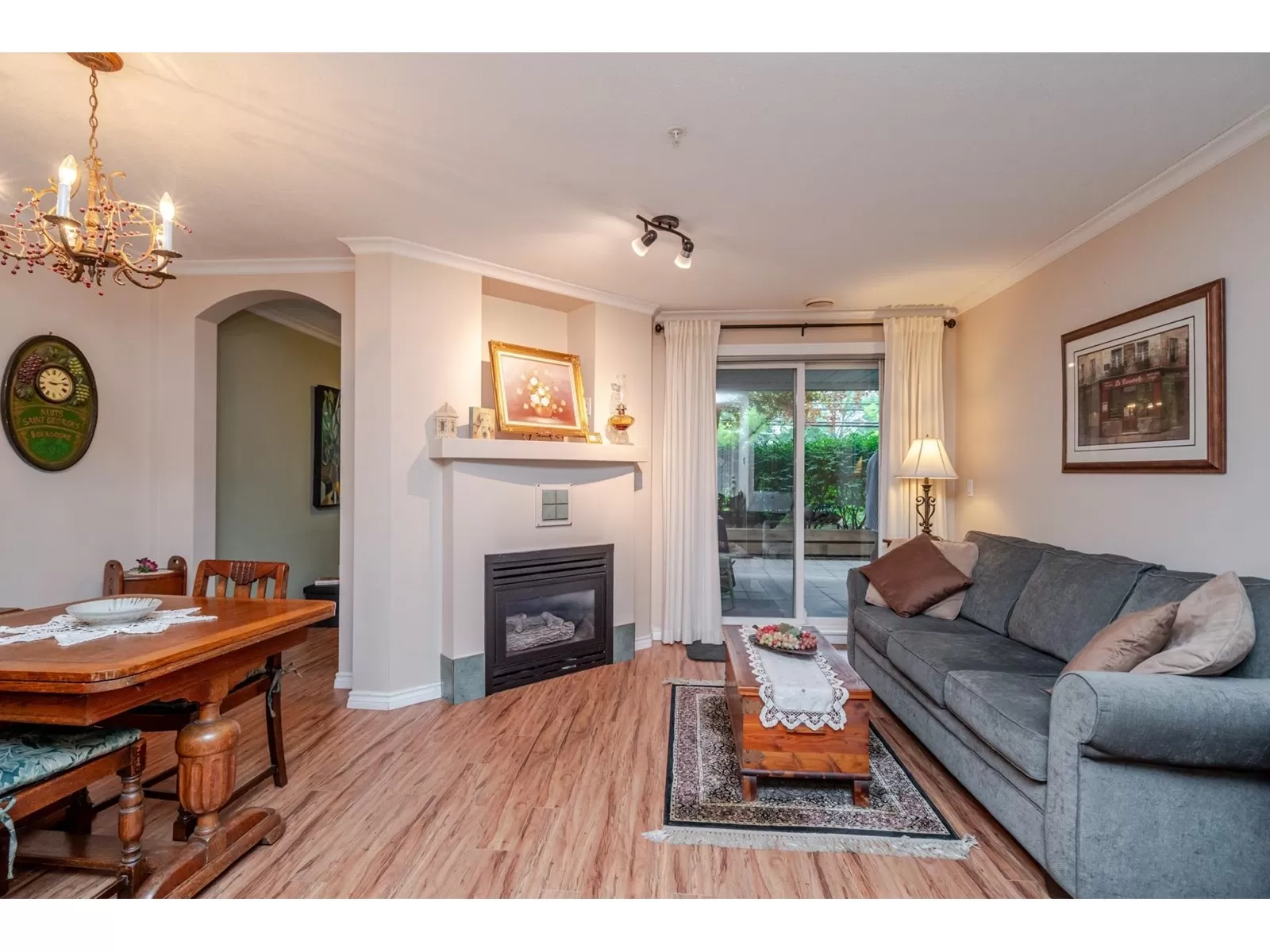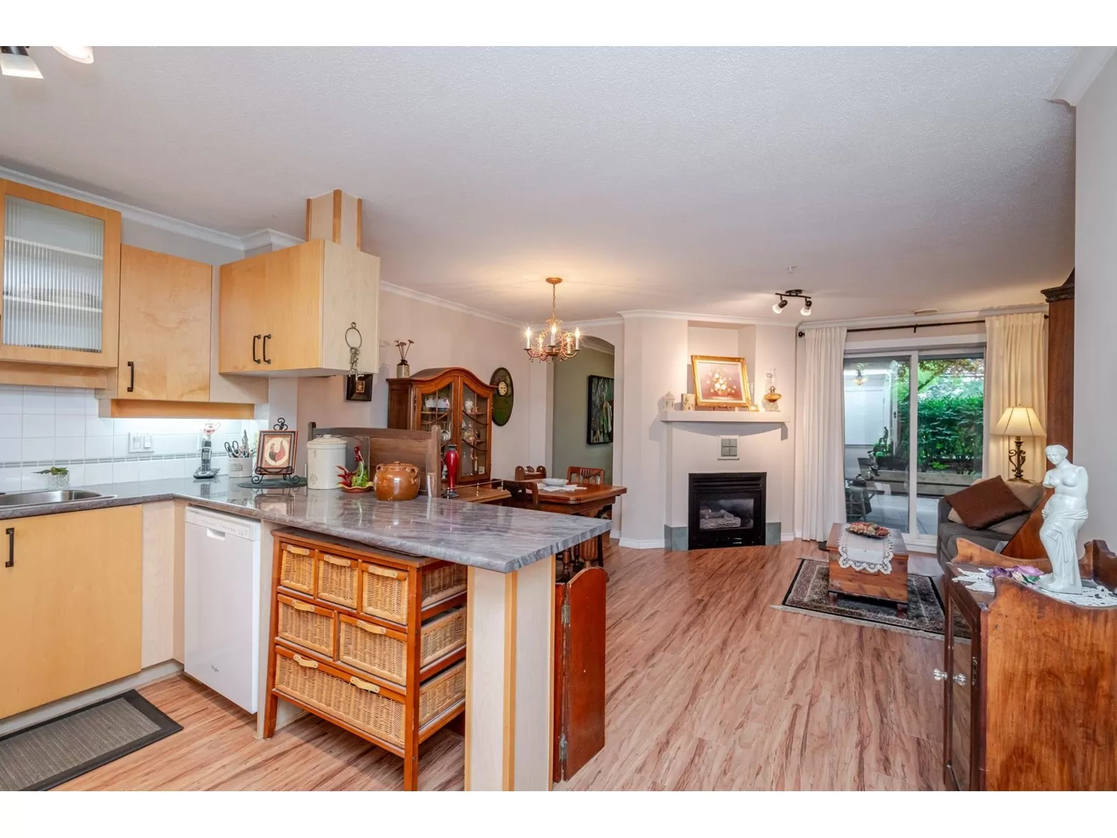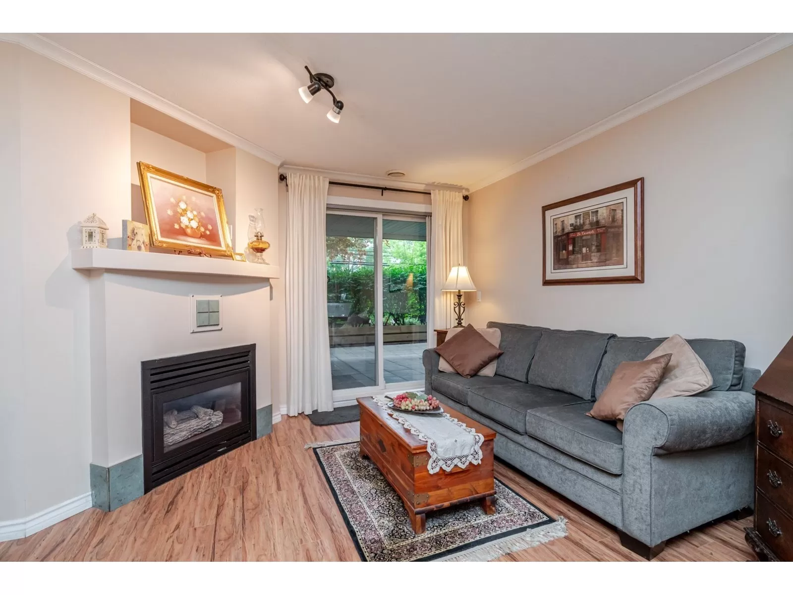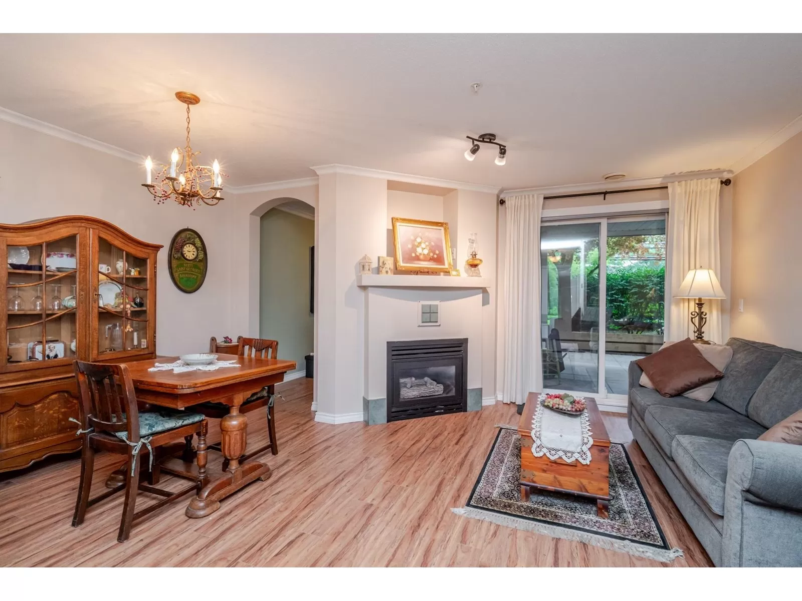 Welcome to The Davenport - a beautifully updated 1 bed + den home with secure ground-level parking! This suite features LED track lighting, crown moulding, laminate flooring with tile floor in the bathroom. Updated kitchen counters, wrought iron hardware, fridge, stove, d/w, washer/dryer, bthrm updates include sink, toilet, counters & faucets. Enjoy your cozy gas fireplace (yearly serviced), & in-suite laundry. Above ground unit with large private patio with green space with newly installed retaining wall. Walk to Mall, SkyTrain, transit, restaurants, & more! Gas & hot water included. Amenities: bike room, gym, storage, party room. 1 dog (max 14" shoulder) or 1 cat allowed (EXTRA BONUS is a fully fenced dog area off parking for Fido). New plumbing in building. Early possession possible! (id:27476)