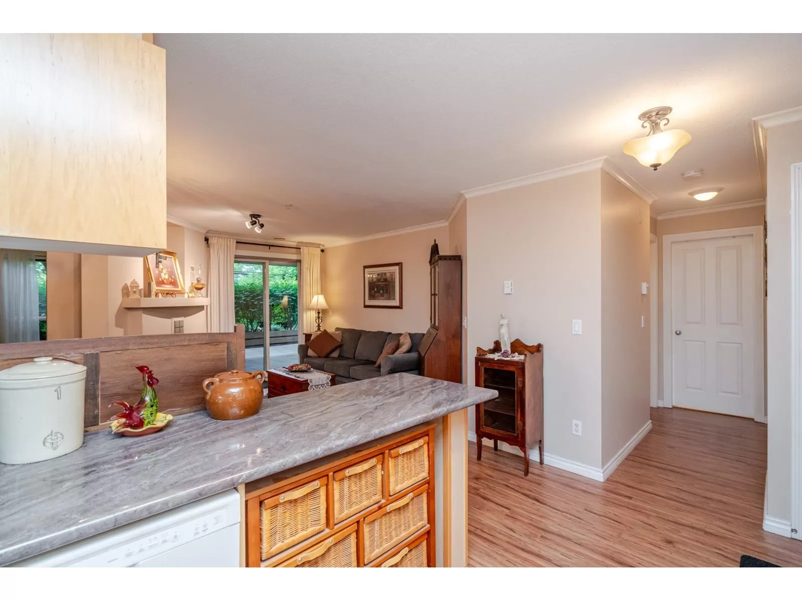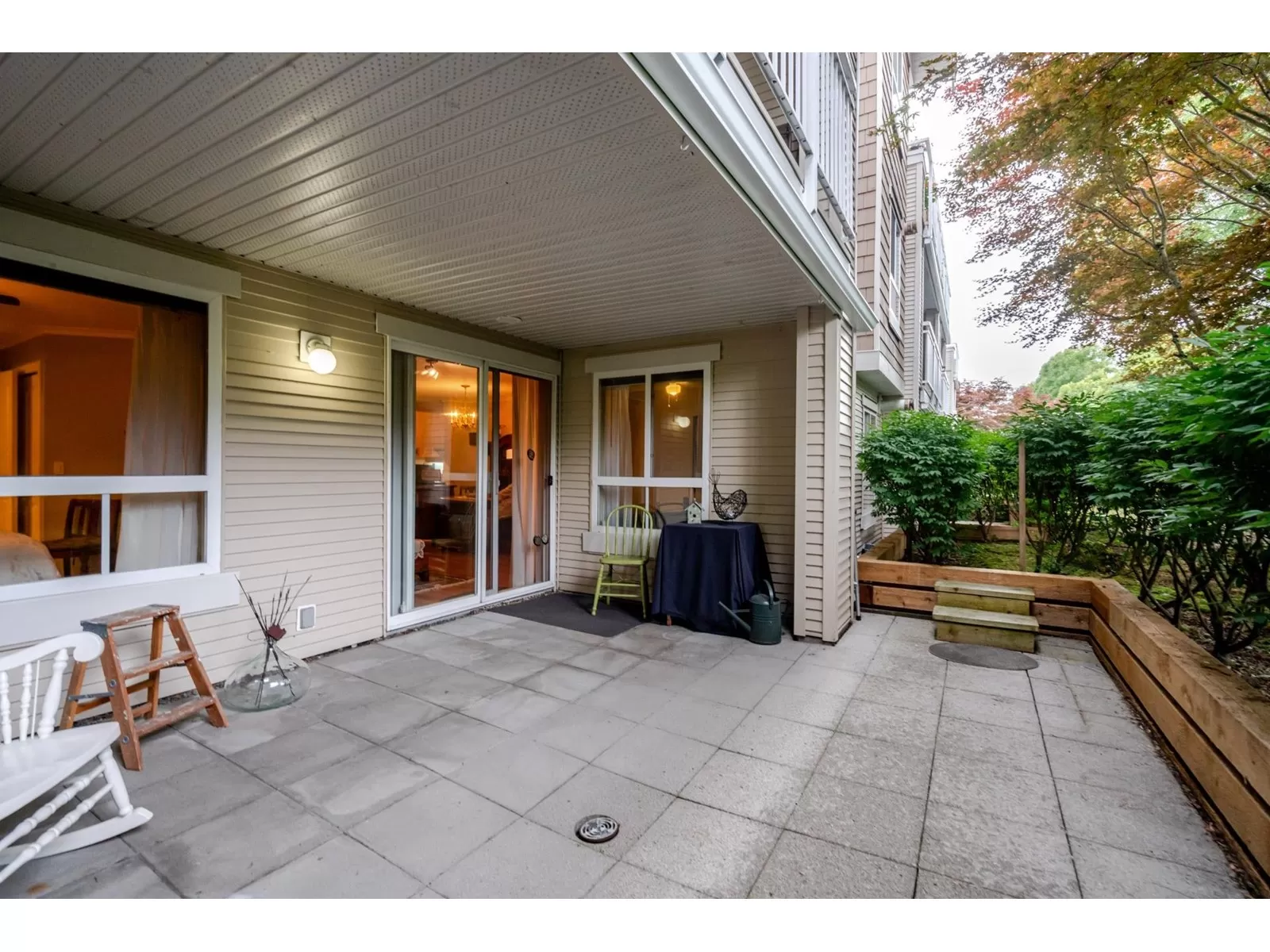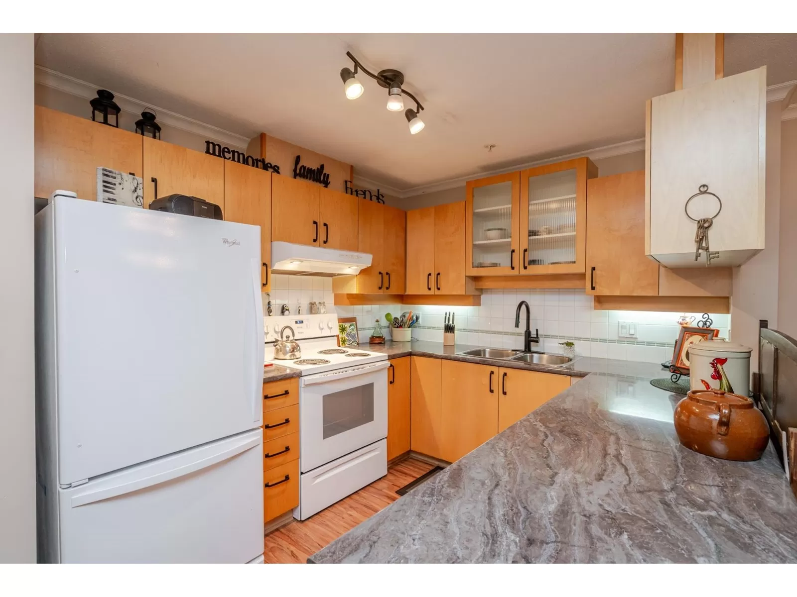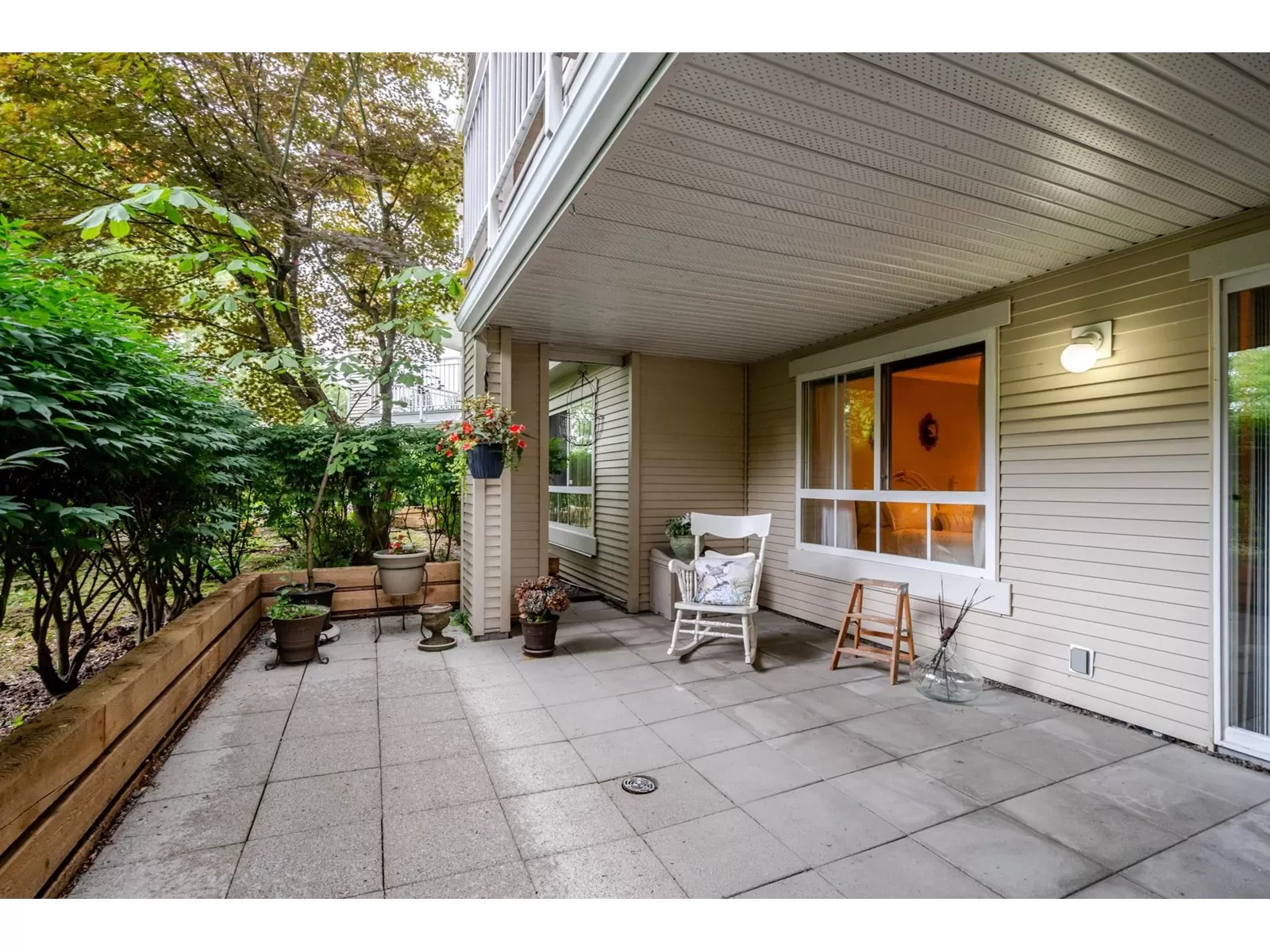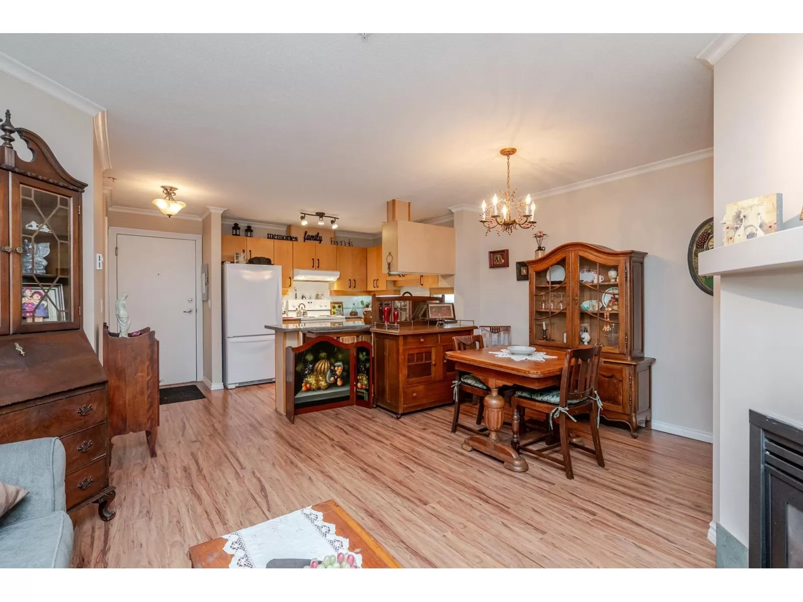 Welcome to The Davenport - a beautifully updated 1 bed + den home with secure ground-level parking! This suite features LED track lighting, crown moulding, laminate flooring with tile floor in the bathroom. Updated kitchen counters, wrought iron hardware, fridge, stove, d/w, washer/dryer, bthrm updates include sink, toilet, counters & faucets. Enjoy your cozy gas fireplace (yearly serviced), & in-suite laundry. Above ground unit with large private patio with green space with newly installed retaining wall. Walk to Mall, SkyTrain, transit, restaurants, & more! Gas & hot water included. Amenities: bike room, gym, storage, party room. 1 dog (max 14" shoulder) or 1 cat allowed (EXTRA BONUS is a fully fenced dog area off parking for Fido). New plumbing in building. Early possession possible! (id:27476)