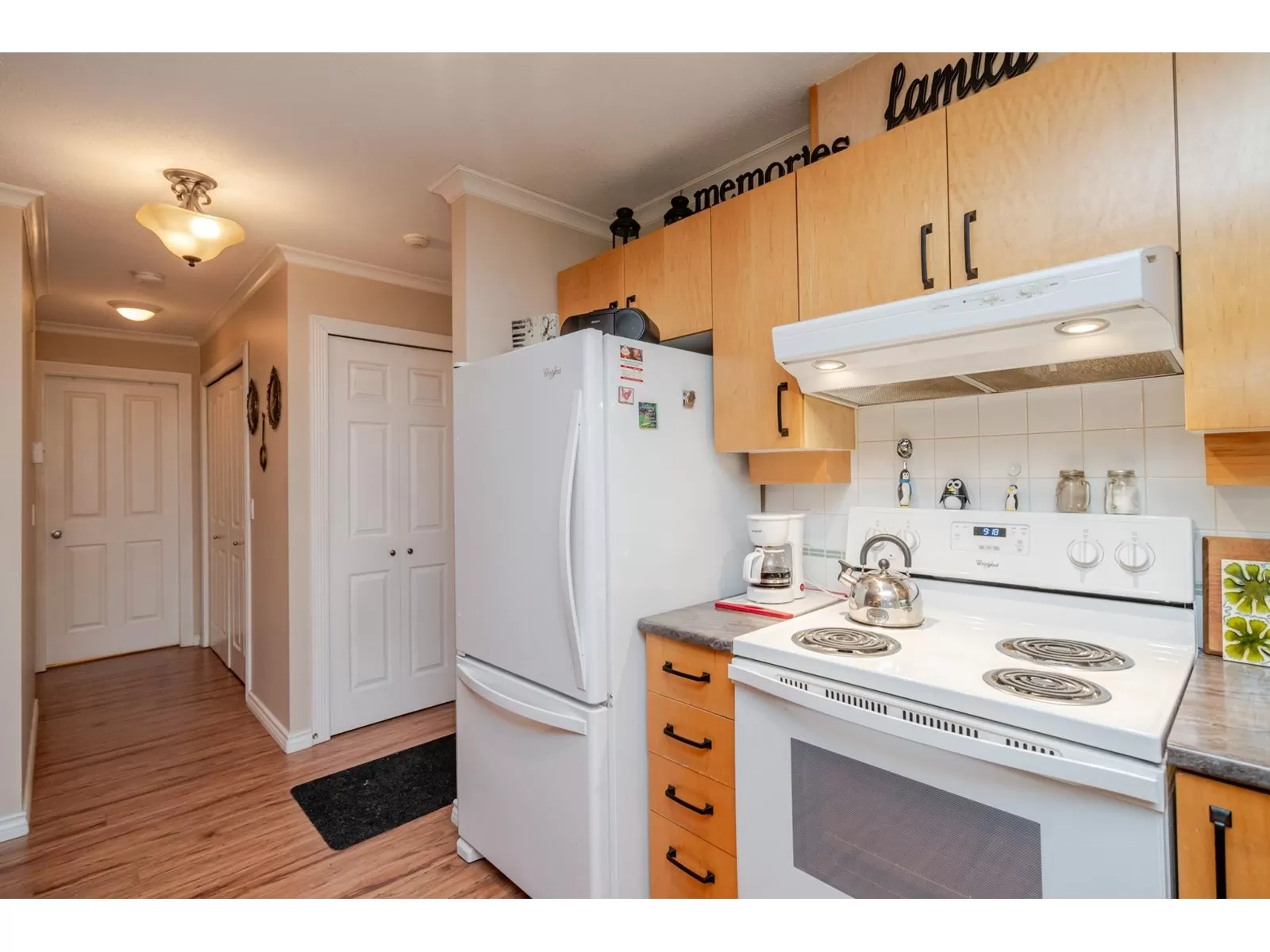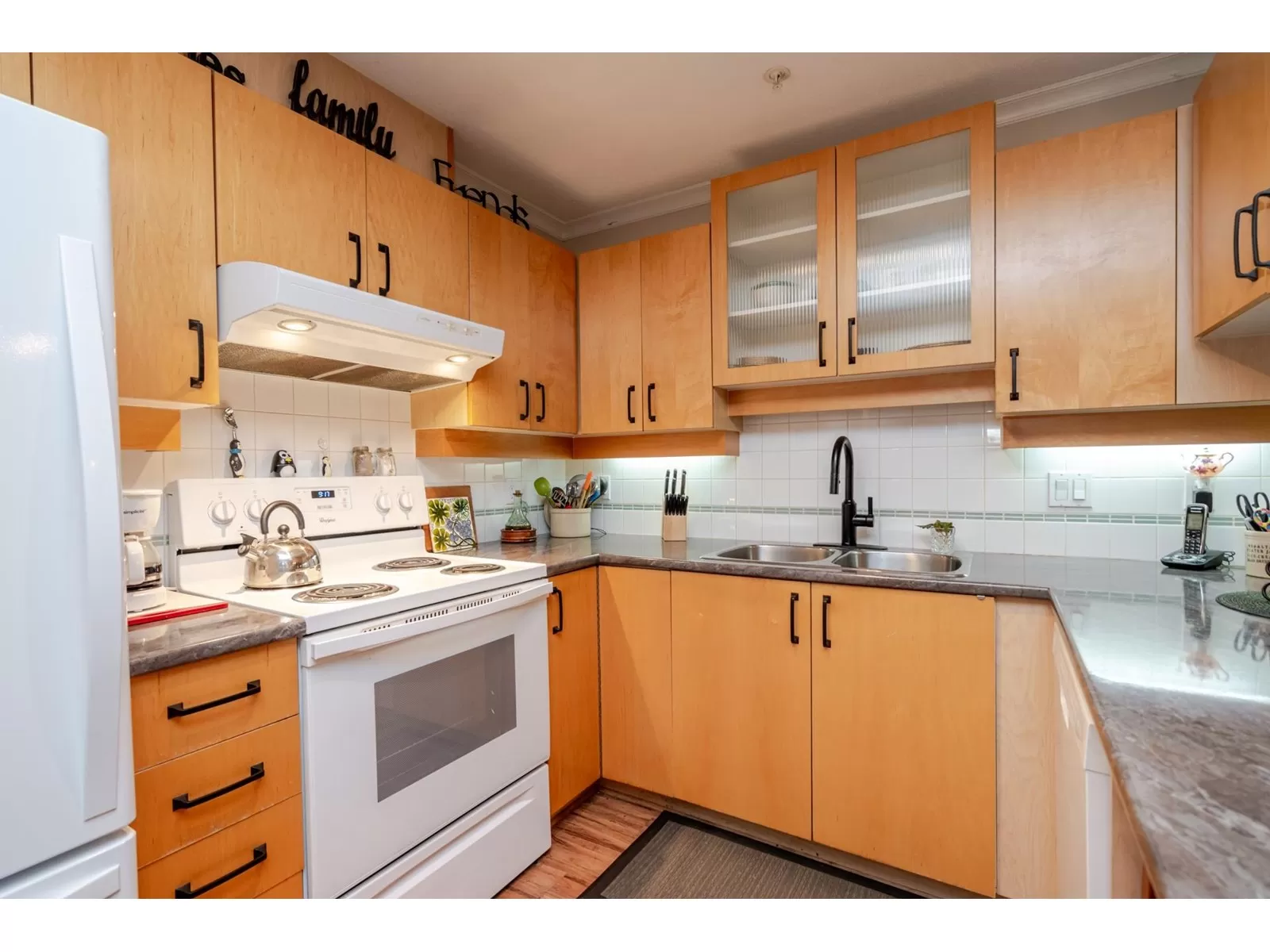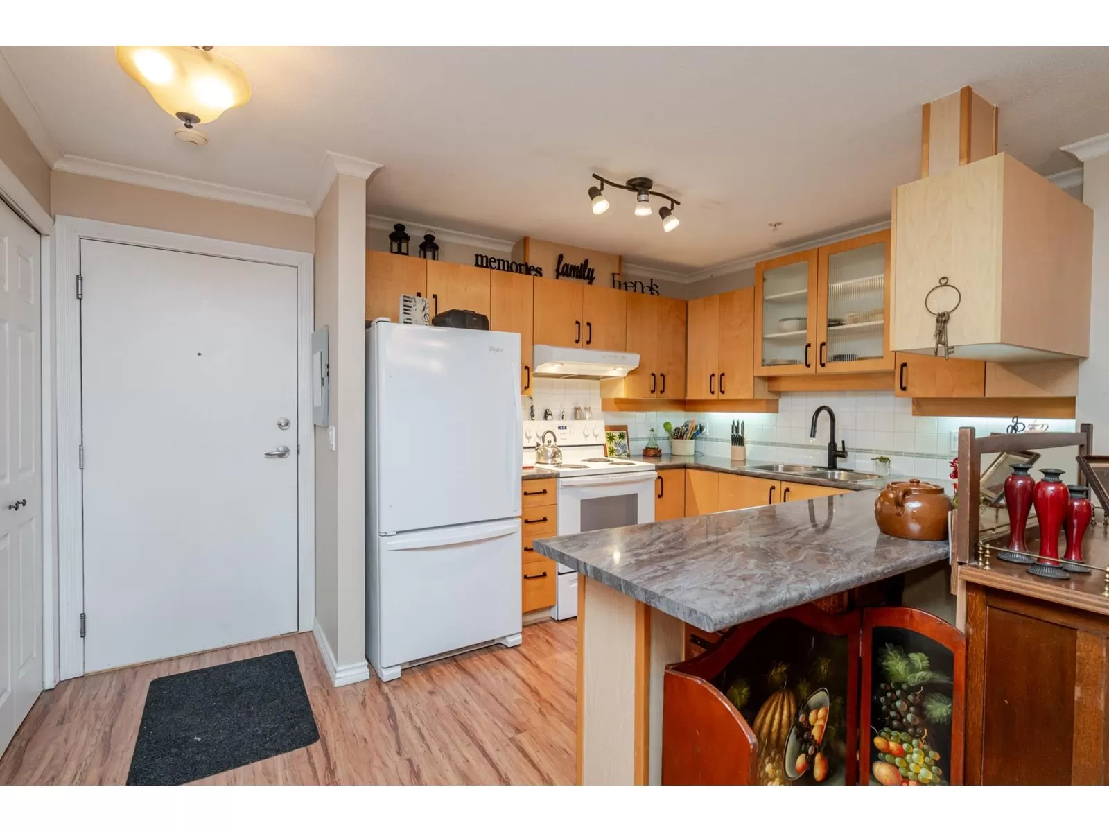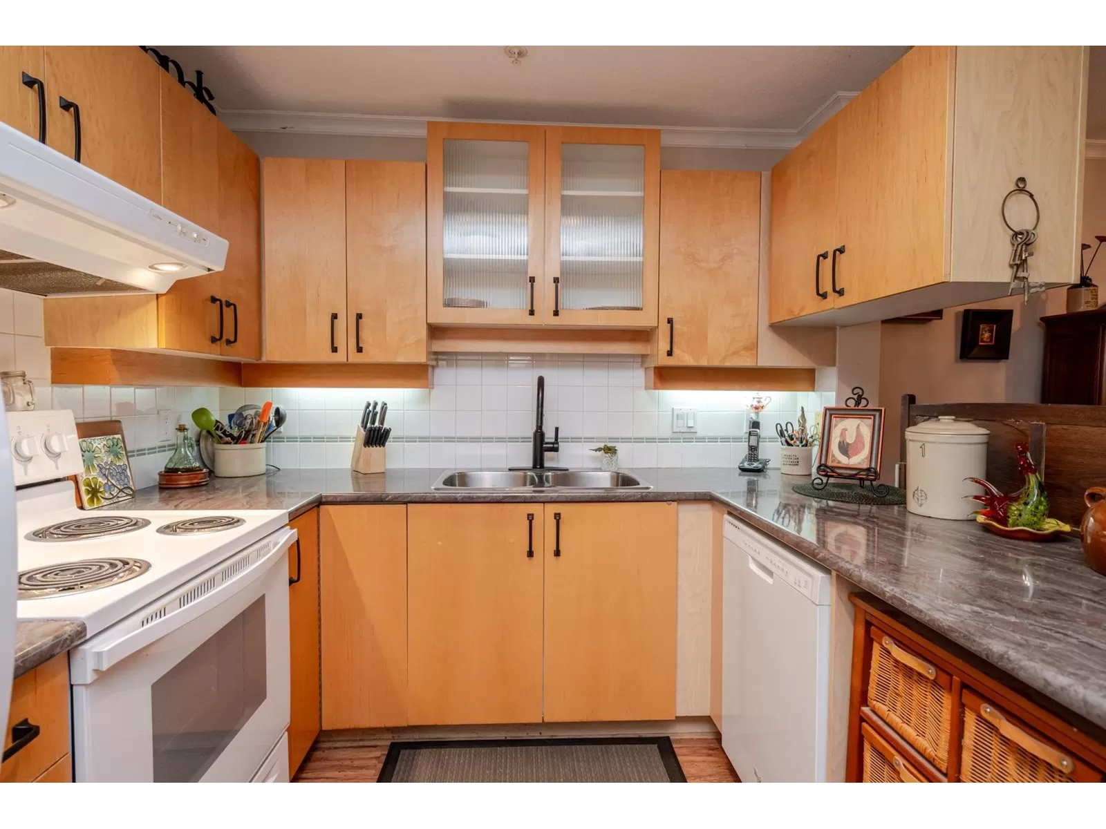 Welcome to The Davenport - a beautifully updated 1 bed + den home with secure ground-level parking! This suite features LED track lighting, crown moulding, laminate flooring with tile floor in the bathroom. Updated kitchen counters, wrought iron hardware, fridge, stove, d/w, washer/dryer, bthrm updates include sink, toilet, counters & faucets. Enjoy your cozy gas fireplace (yearly serviced), & in-suite laundry. Above ground unit with large private patio with green space with newly installed retaining wall. Walk to Mall, SkyTrain, transit, restaurants, & more! Gas & hot water included. Amenities: bike room, gym, storage, party room. 1 dog (max 14" shoulder) or 1 cat allowed (EXTRA BONUS is a fully fenced dog area off parking for Fido). New plumbing in building. Early possession possible! (id:27476)