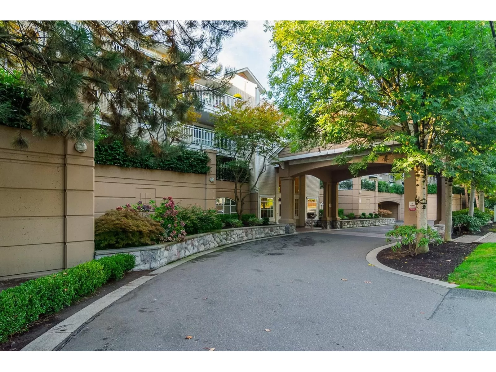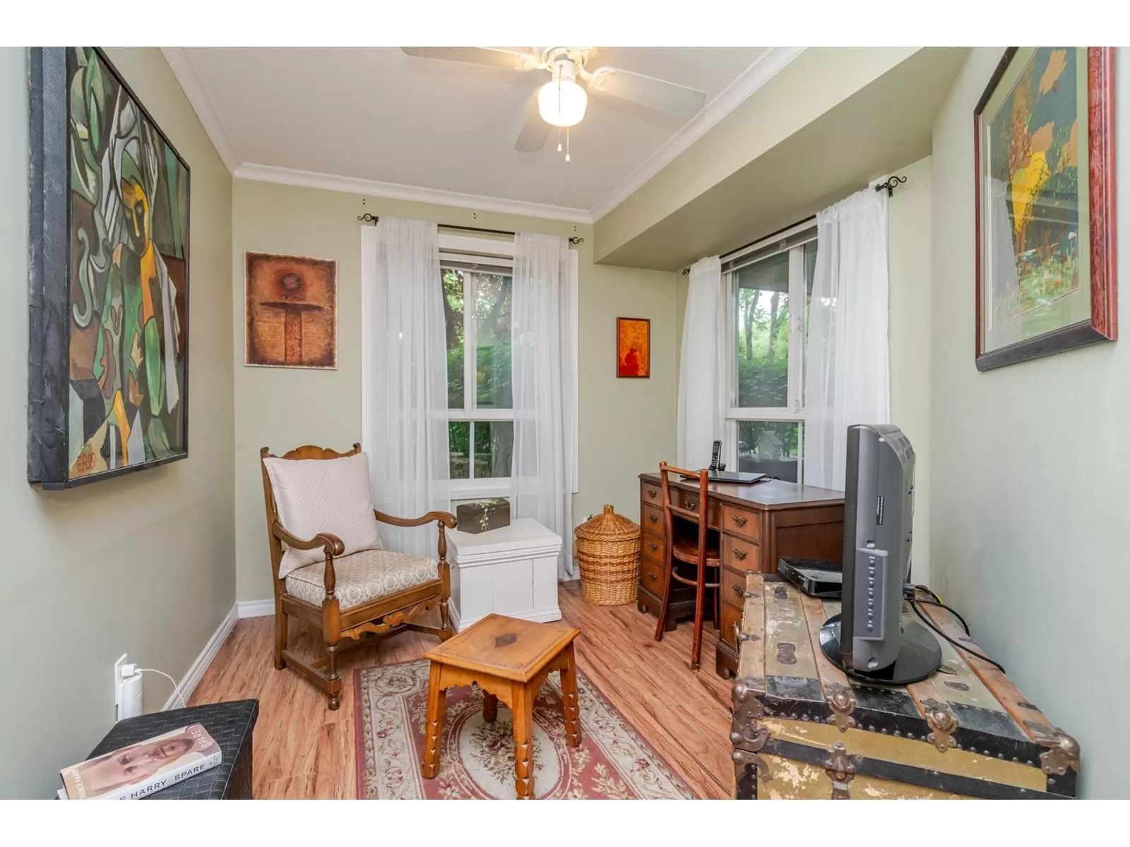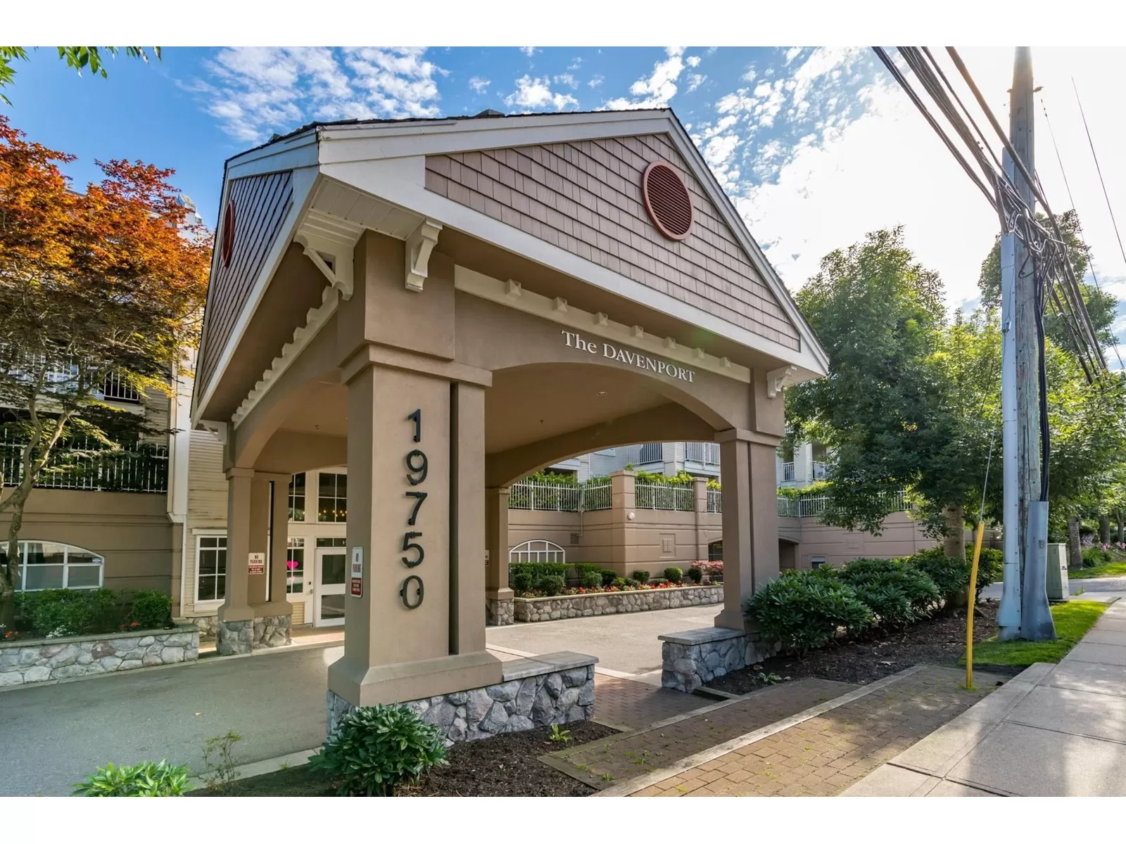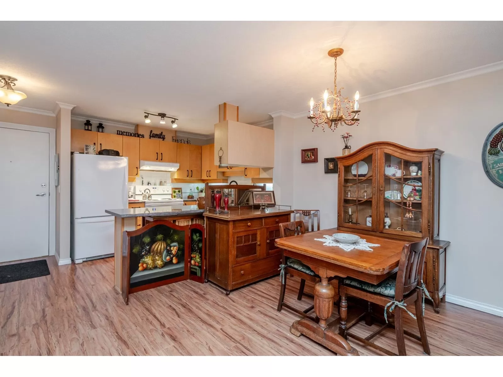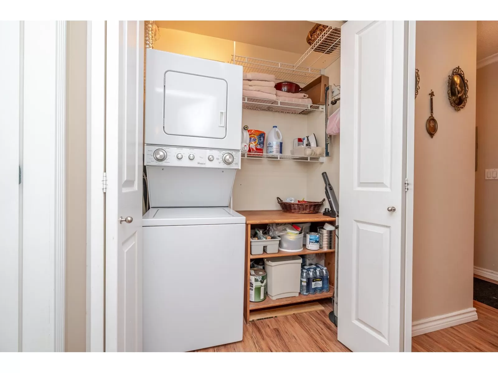 Welcome to The Davenport - a beautifully updated 1 bed + den home with secure ground-level parking! This suite features LED track lighting, crown moulding, laminate flooring with tile floor in the bathroom. Updated kitchen counters, wrought iron hardware, fridge, stove, d/w, washer/dryer, bthrm updates include sink, toilet, counters & faucets. Enjoy your cozy gas fireplace (yearly serviced), & in-suite laundry. Above ground unit with large private patio with green space with newly installed retaining wall. Walk to Mall, SkyTrain, transit, restaurants, & more! Gas & hot water included. Amenities: bike room, gym, storage, party room. 1 dog (max 14" shoulder) or 1 cat allowed (EXTRA BONUS is a fully fenced dog area off parking for Fido). New plumbing in building. Early possession possible! (id:27476)