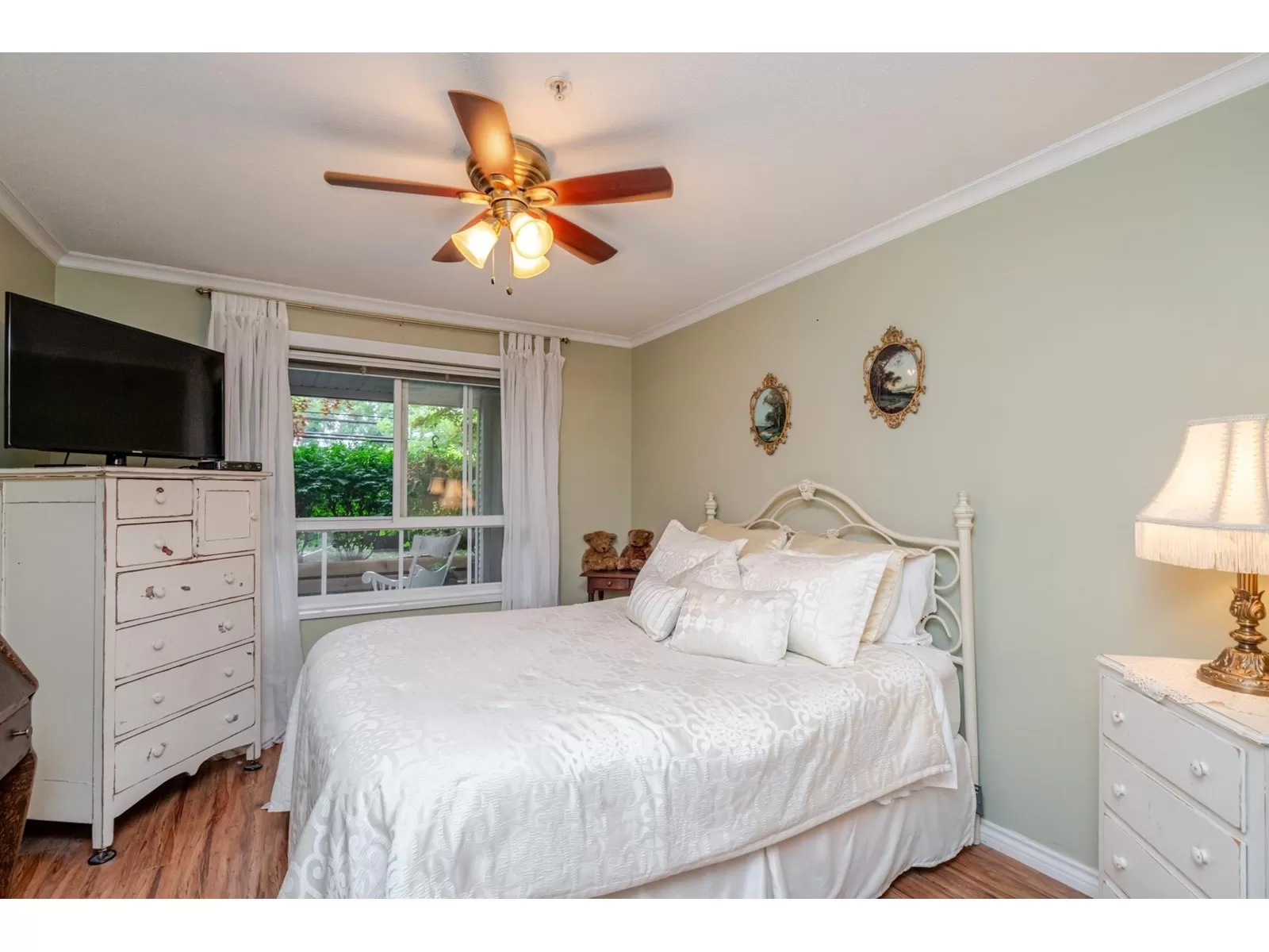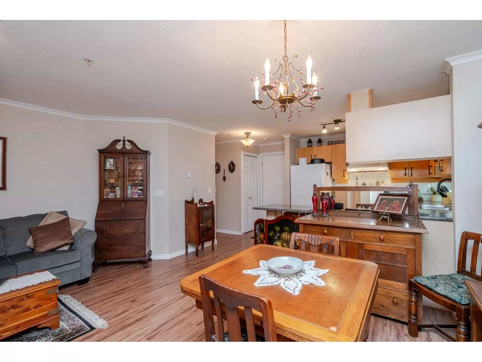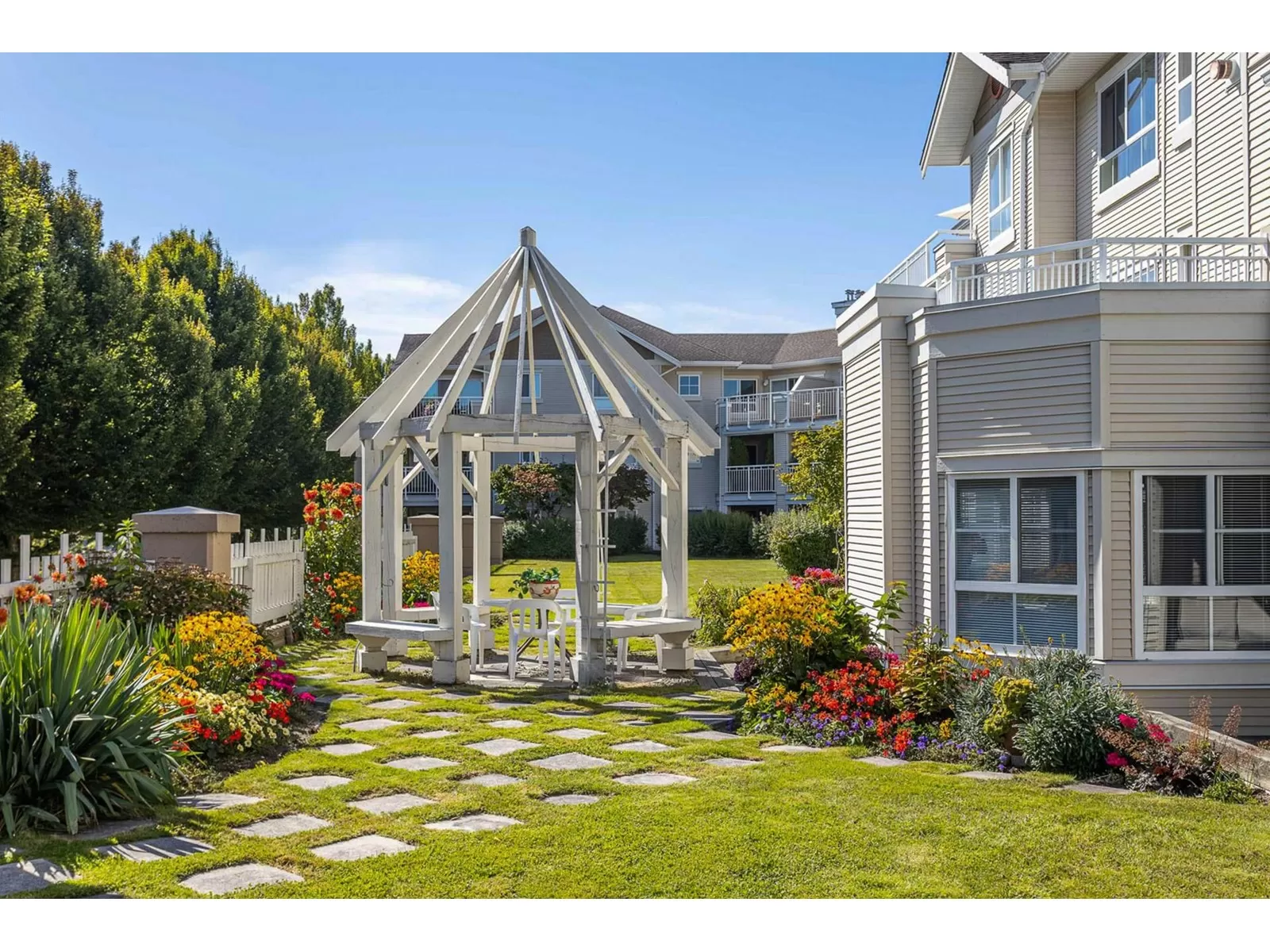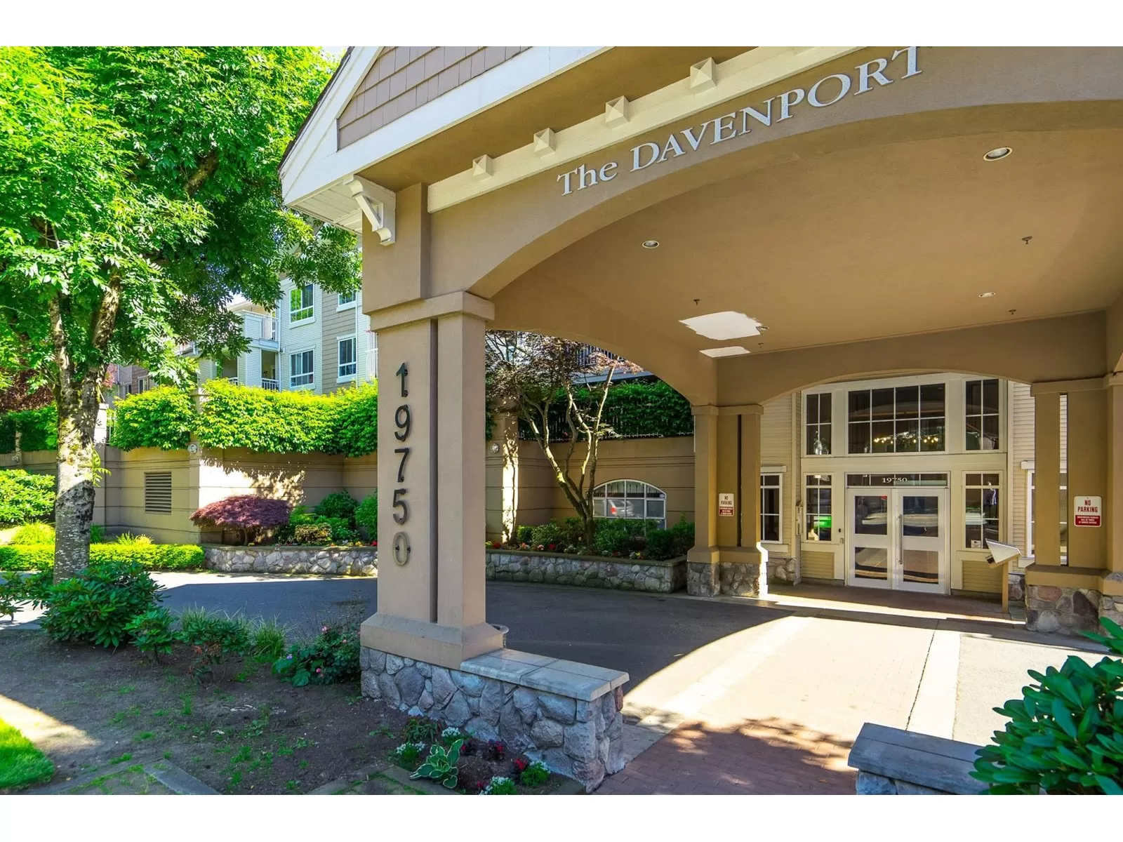 Welcome to The Davenport - a beautifully updated 1 bed + den home with secure ground-level parking! This suite features LED track lighting, crown moulding, laminate flooring with tile floor in the bathroom. Updated kitchen counters, wrought iron hardware, fridge, stove, d/w, washer/dryer, bthrm updates include sink, toilet, counters & faucets. Enjoy your cozy gas fireplace (yearly serviced), & in-suite laundry. Above ground unit with large private patio with green space with newly installed retaining wall. Walk to Mall, SkyTrain, transit, restaurants, & more! Gas & hot water included. Amenities: bike room, gym, storage, party room. 1 dog (max 14" shoulder) or 1 cat allowed (EXTRA BONUS is a fully fenced dog area off parking for Fido). New plumbing in building. Early possession possible! (id:27476)