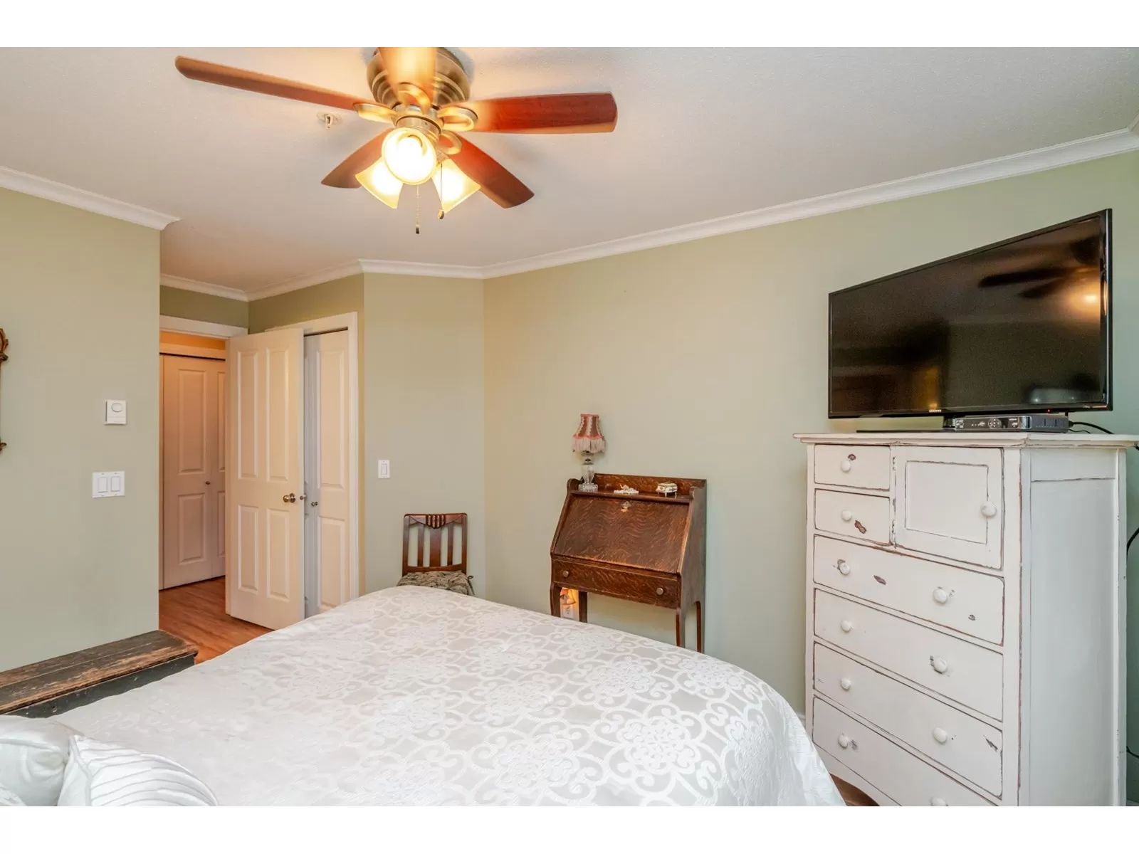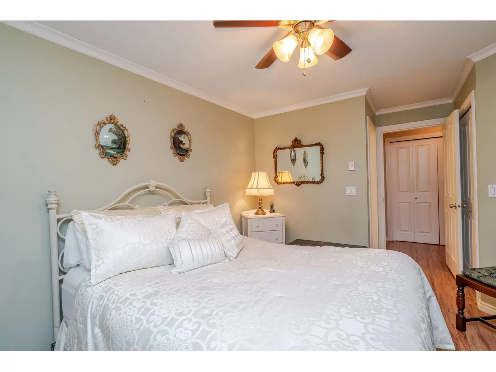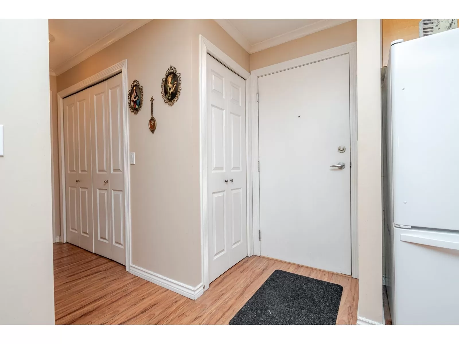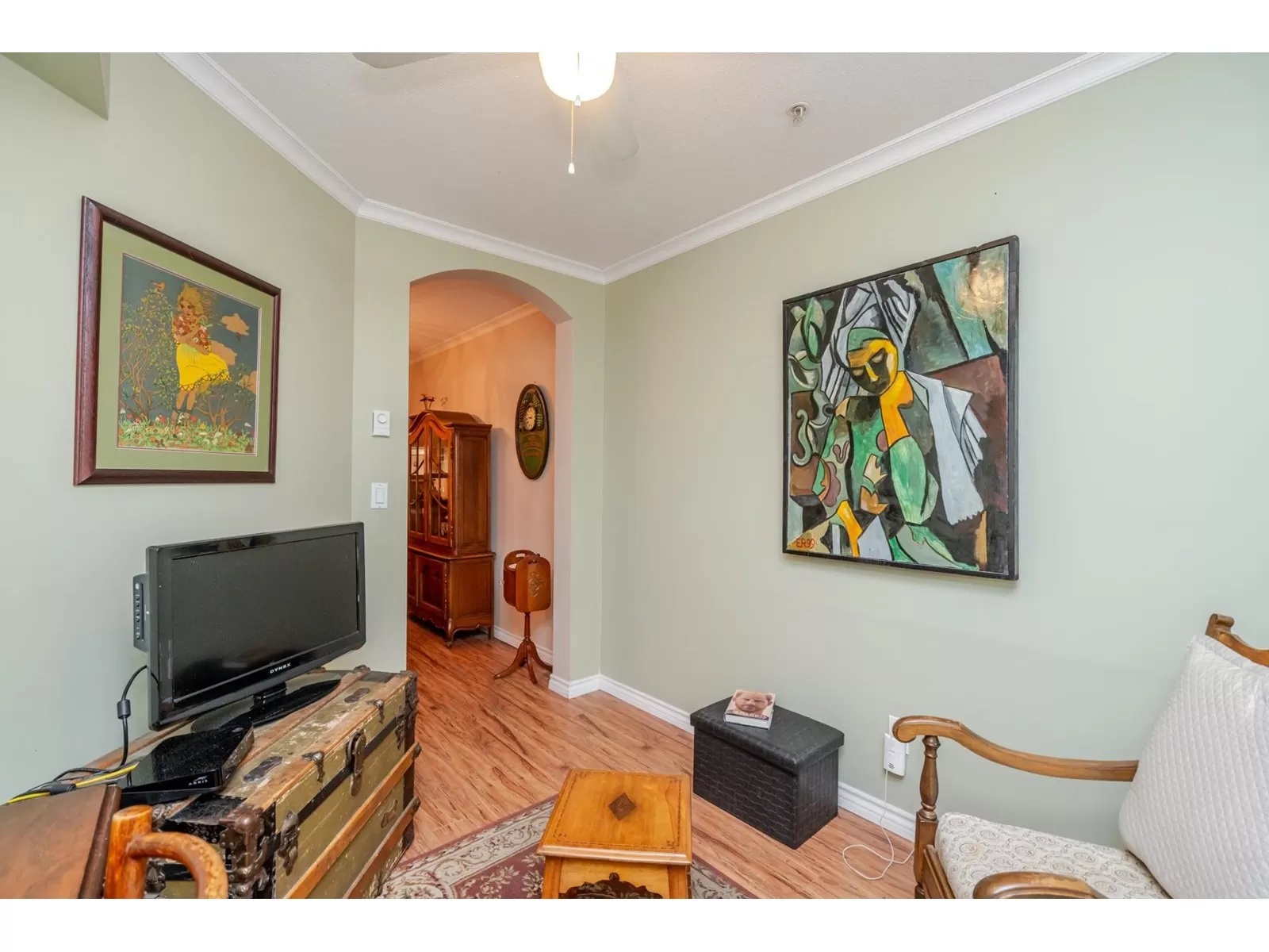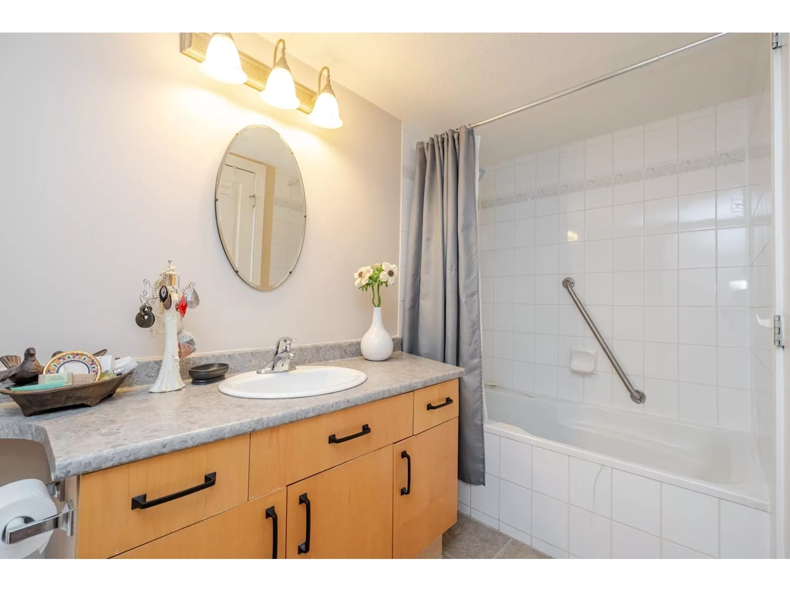 Welcome to The Davenport - a beautifully updated 1 bed + den home with secure ground-level parking! This suite features LED track lighting, crown moulding, laminate flooring with tile floor in the bathroom. Updated kitchen counters, wrought iron hardware, fridge, stove, d/w, washer/dryer, bthrm updates include sink, toilet, counters & faucets. Enjoy your cozy gas fireplace (yearly serviced), & in-suite laundry. Above ground unit with large private patio with green space with newly installed retaining wall. Walk to Mall, SkyTrain, transit, restaurants, & more! Gas & hot water included. Amenities: bike room, gym, storage, party room. 1 dog (max 14" shoulder) or 1 cat allowed (EXTRA BONUS is a fully fenced dog area off parking for Fido). New plumbing in building. Early possession possible! (id:27476)