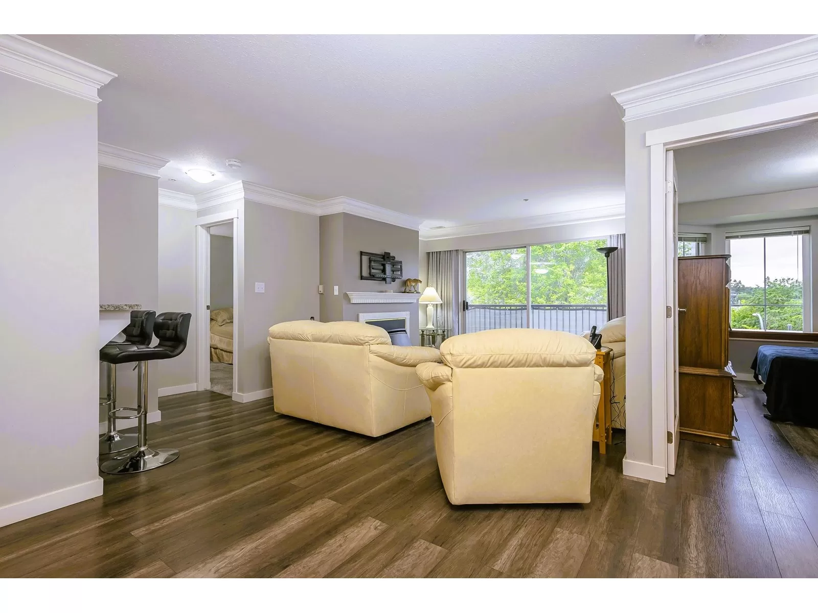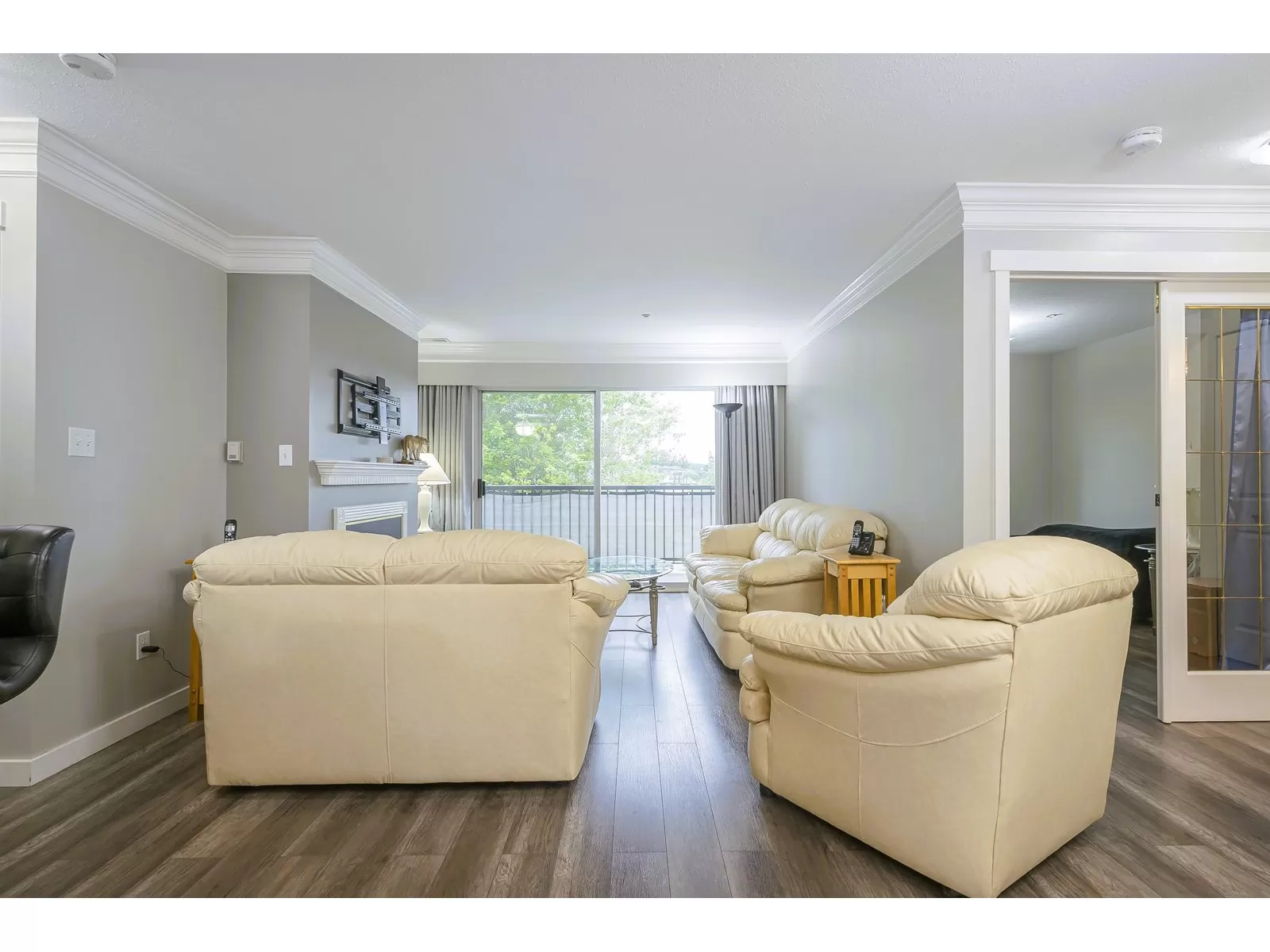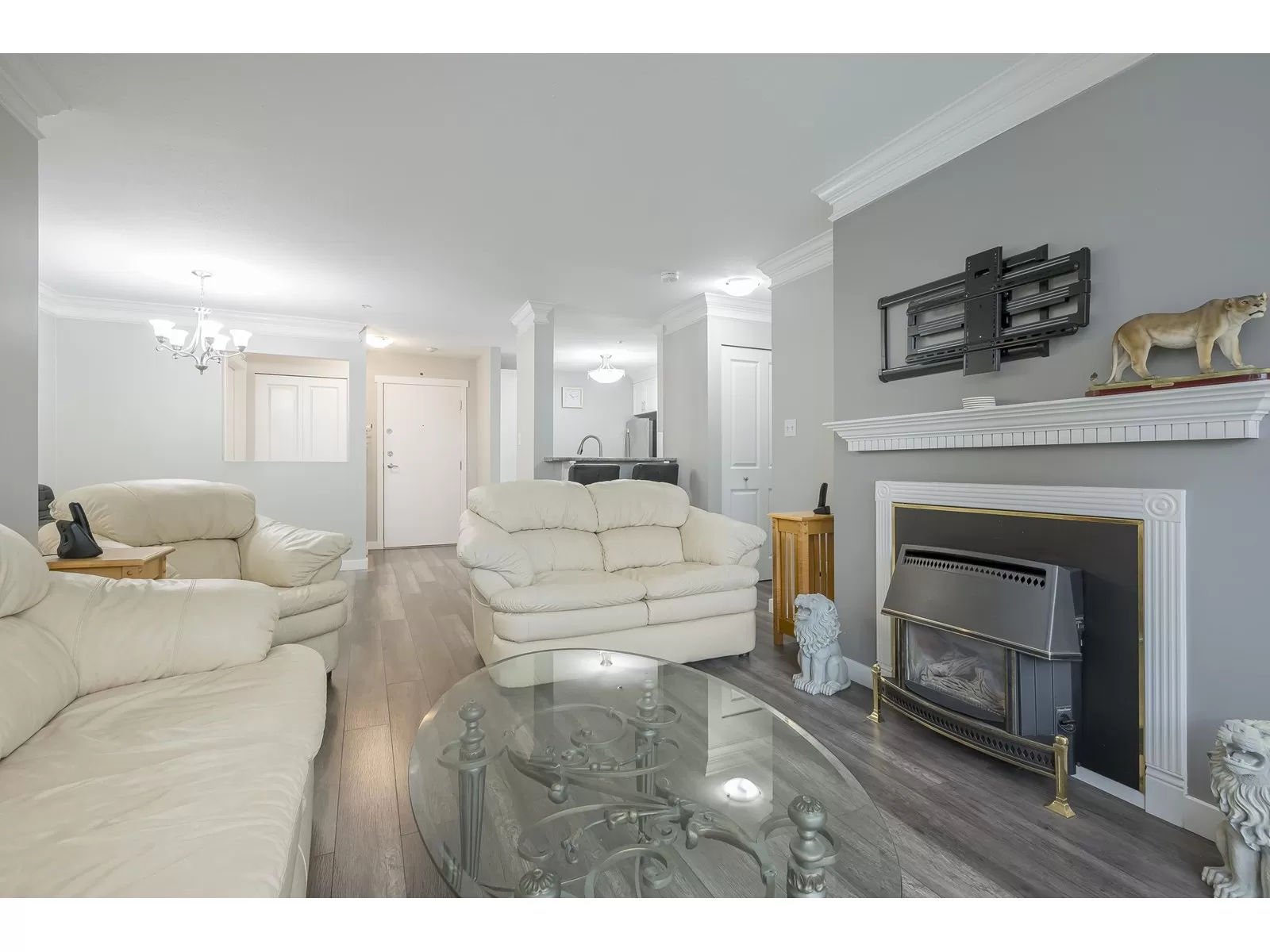 Welcome to Robert's Court! This bright, top-floor, south-facing 2-bed, 2-bath condo offers 1,026 sq. ft. of well-designed living space. Enjoy an open layout, updated kitchen with stainless steel appliances, white cabinets, and subway tile backsplash. Bedrooms are on opposite sides for added privacy, with a 4-piece ensuite in the primary: Crown moulding, a large laundry room, and extra storage complete the home. Building amenities include a gym and a social lounge. Steps to Fraser Hwy, transit, shopping, parks, schools, and Kwantlen University. Pet-friendly - 1 dog (max 18kg at maturity) and one cat, or two cats. A great start for first-time buyers! (id:27476)