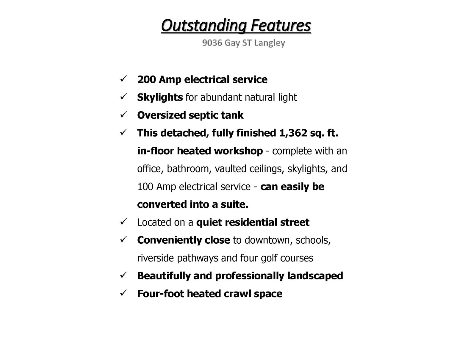 Beautiful high quality-built home with detached fully finished 1362sf Workship/studio on park-like almost 1/2 acre, is an easy walk to boutique shopping, restaurants, river walk pathways & trails, plus Langley Fine Arts School. This traditional layout features 5 large bedrooms, formal living and dining room and spacious family room off kitchen. Master bedroom has vaulted ceiling, fireplace and balcony overlooking lush and private backyard. Lots of upgrades; New A/C, Furnace & Hot water tank, professionally landscaped and roof cleaned & inspected. The separate, in-floor heated Workshop/Studio w/ office, bathroom, vaulted ceilings, skylights, 100 AMP service can potentially be a MORTGAGE HELPER business or suite. (id:27476)