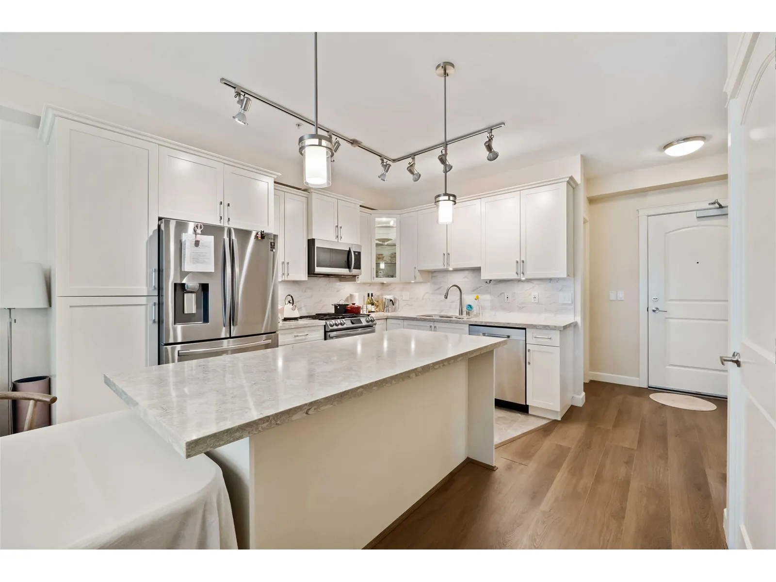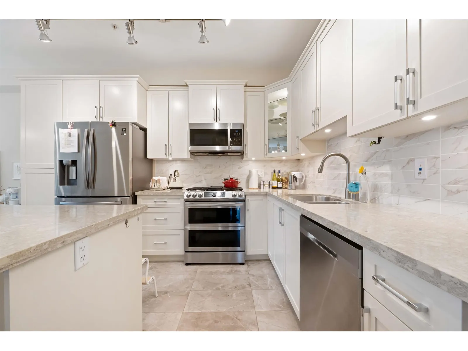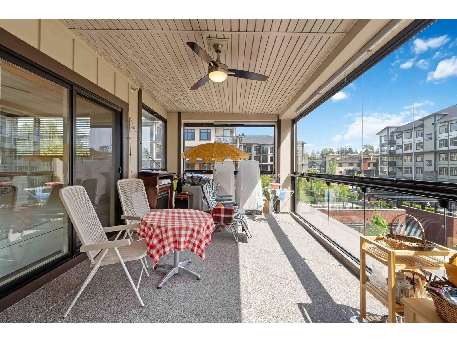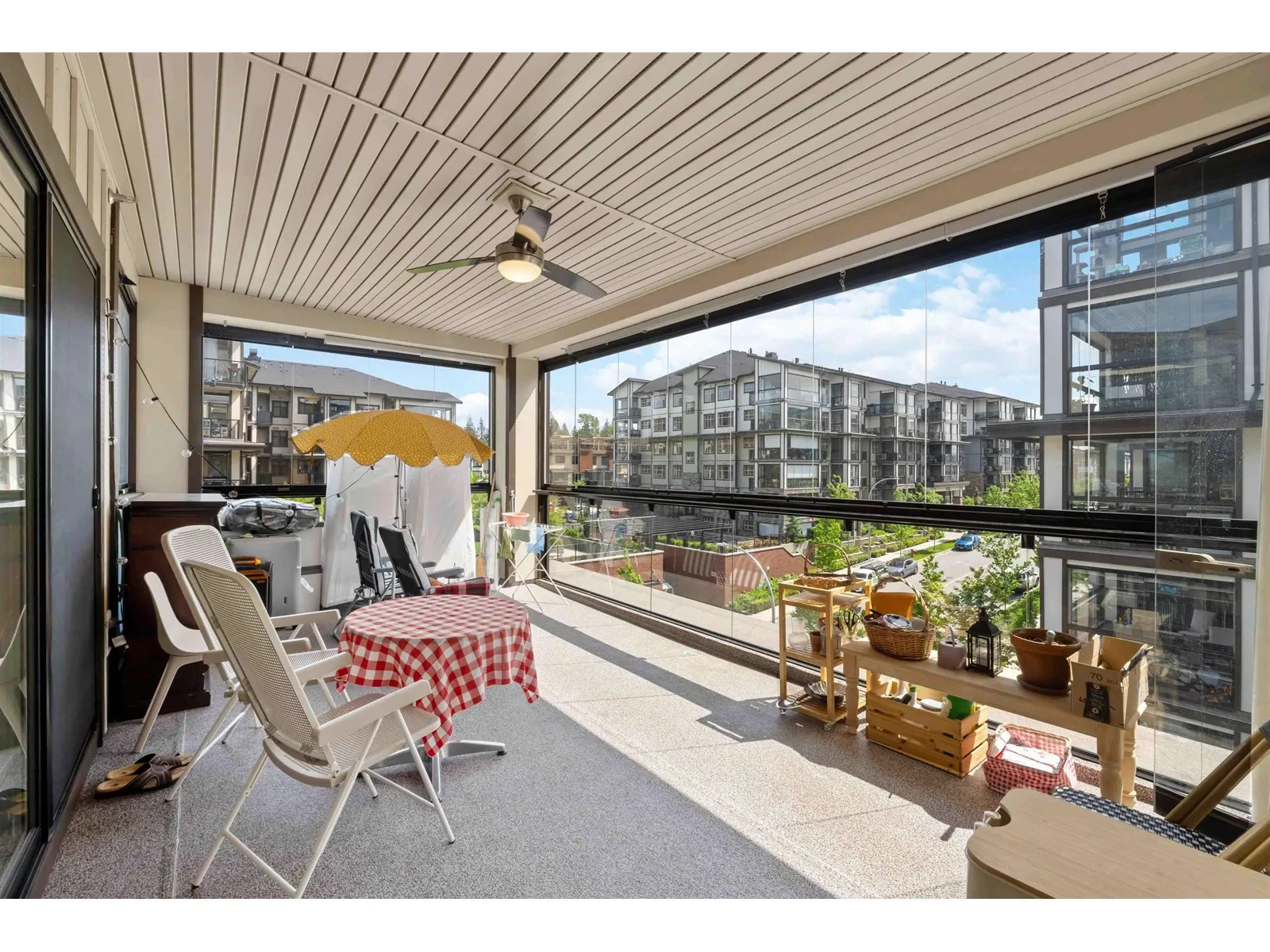 Live in style at Yorkson Park! This beautifully designed 5th-floor corner end unit 3 bed / 2 bath + solarium condo offers 1,041 sq. ft. of sophisticated living space plus a 236 sq. ft. glass-enclosed solarium, perfect for year-round enjoyment with a gas hookup for BBQ. The high-end kitchen features stainless steel appliances, a 5-burner gas cooktop, double oven, white shaker cabinets, and quartz countertops. Thoughtful upgrades include 9' ceilings, A/C & heating and heated bathroom floors. Comes with 2 underground parking stalls and a private roll-up storage locker with an EV outlet. Ideally located just steps from Carvolth Park & Ride, Hwy 1, and top-tier shopping. Low strata fees include gas, fitness room, a lounge, and a playroom. (id:27476)